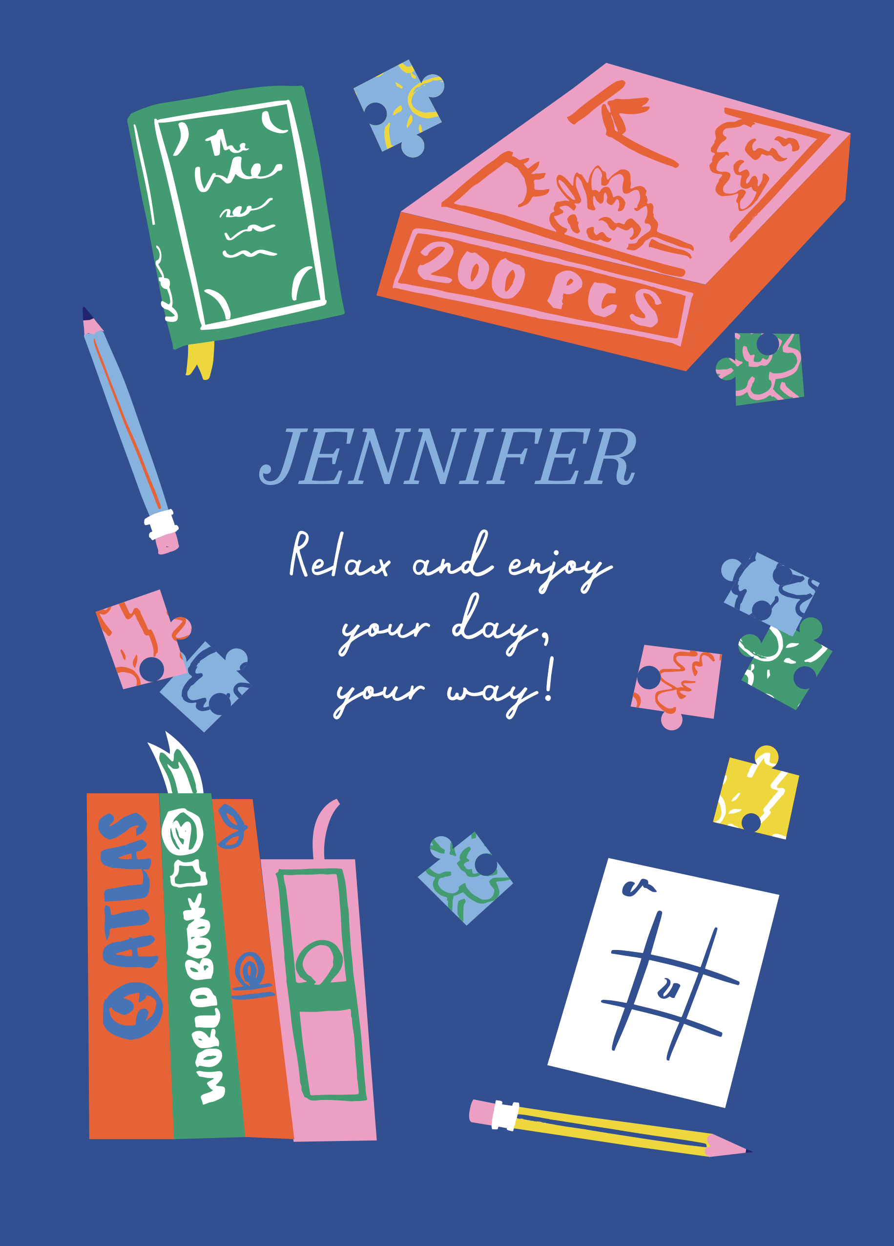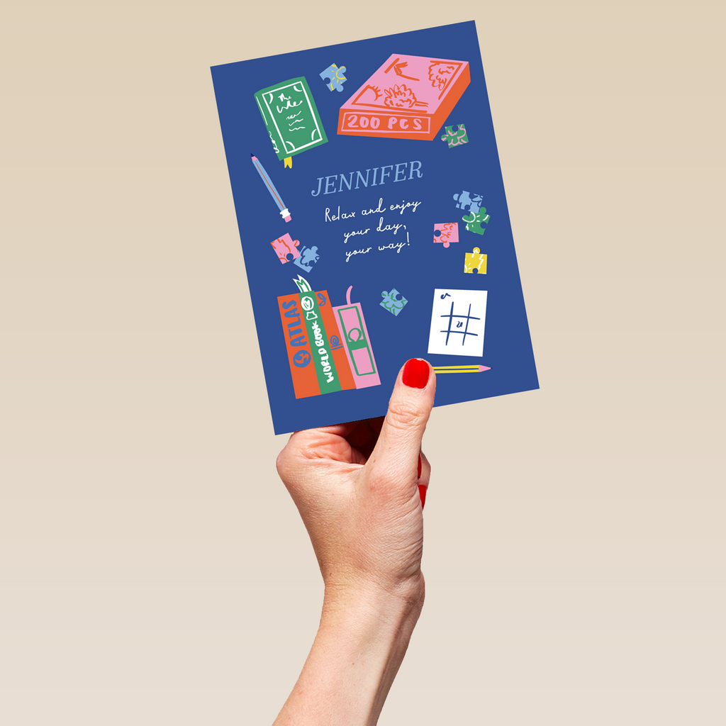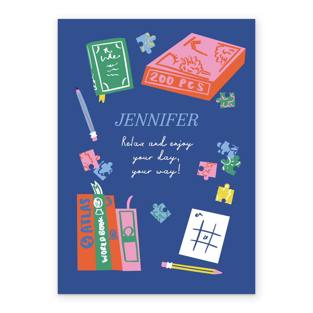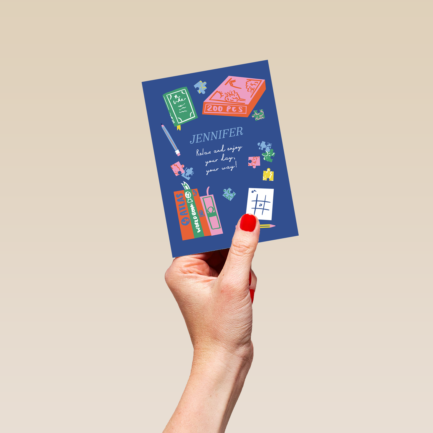 Printed on premium-quality board, this card features illustrations of books and board games, with the message 'Relax and enjoy your day, your way!', space to personalise a name, and comes complete with a co-ordinating white envelope.