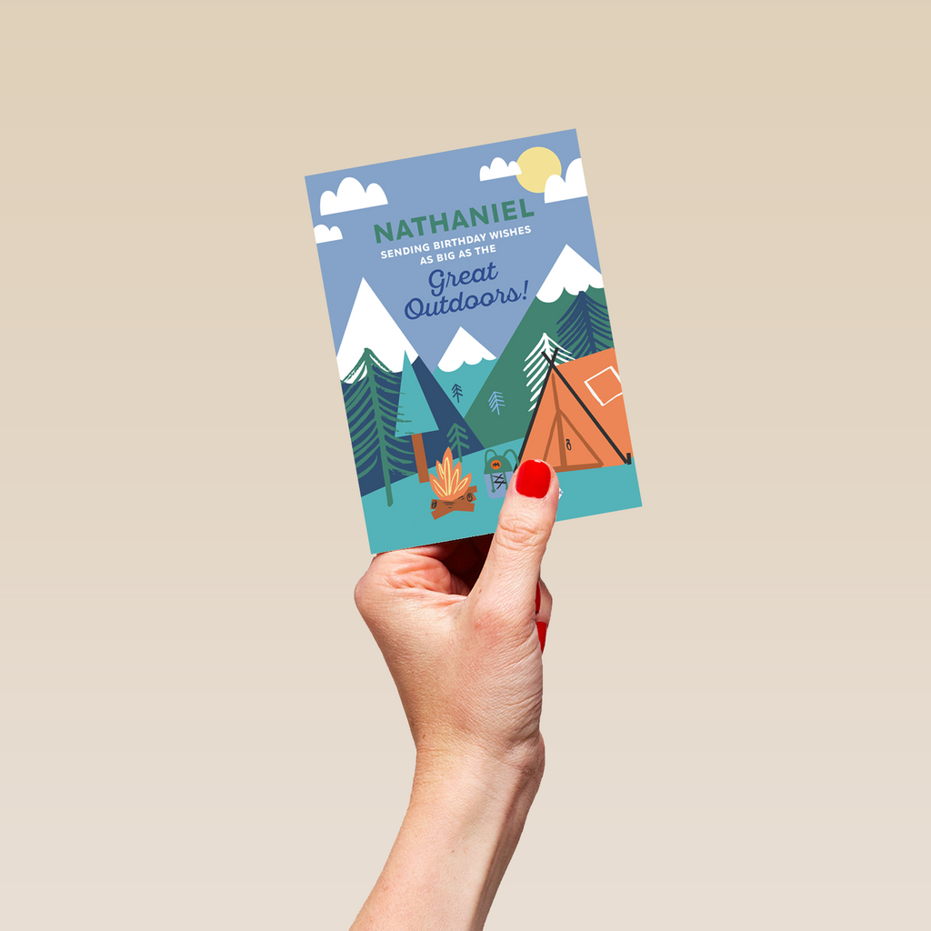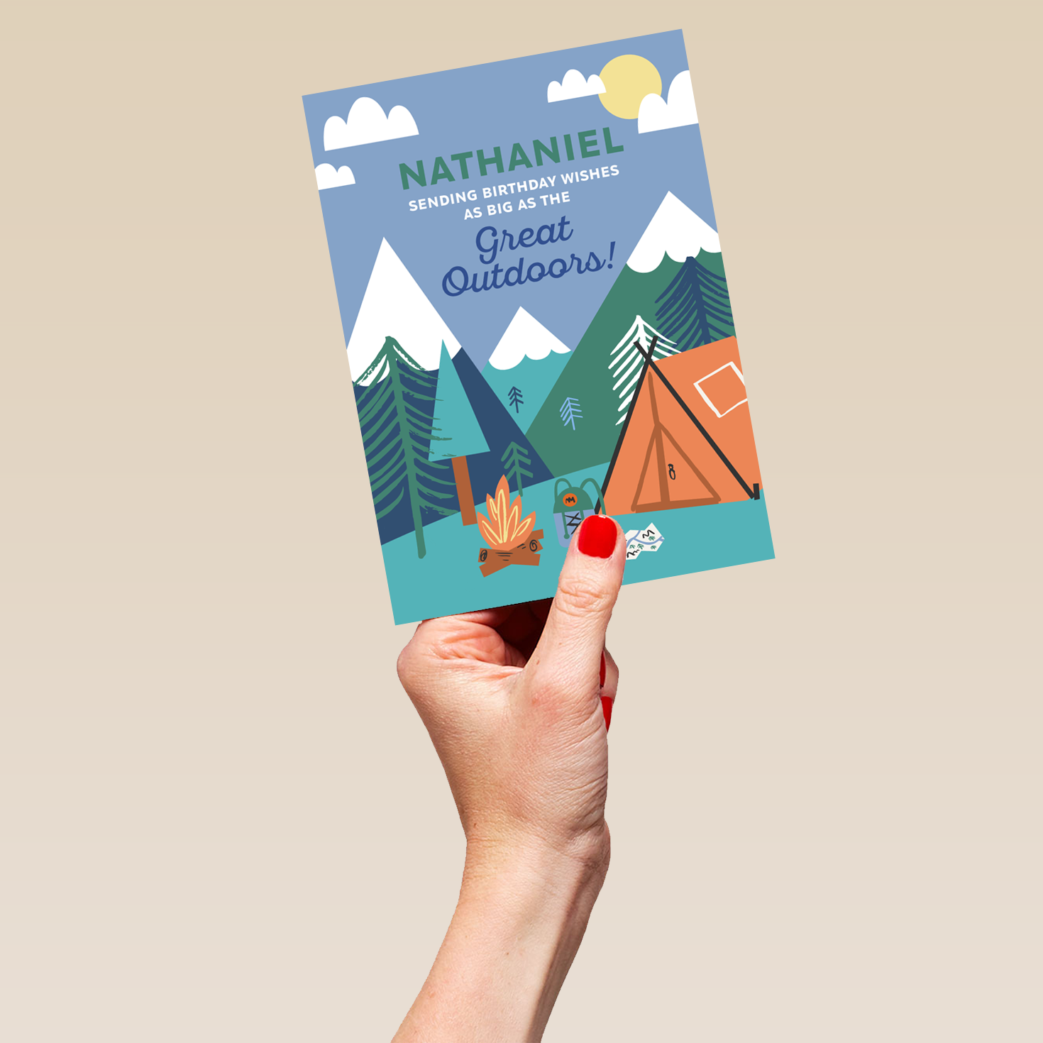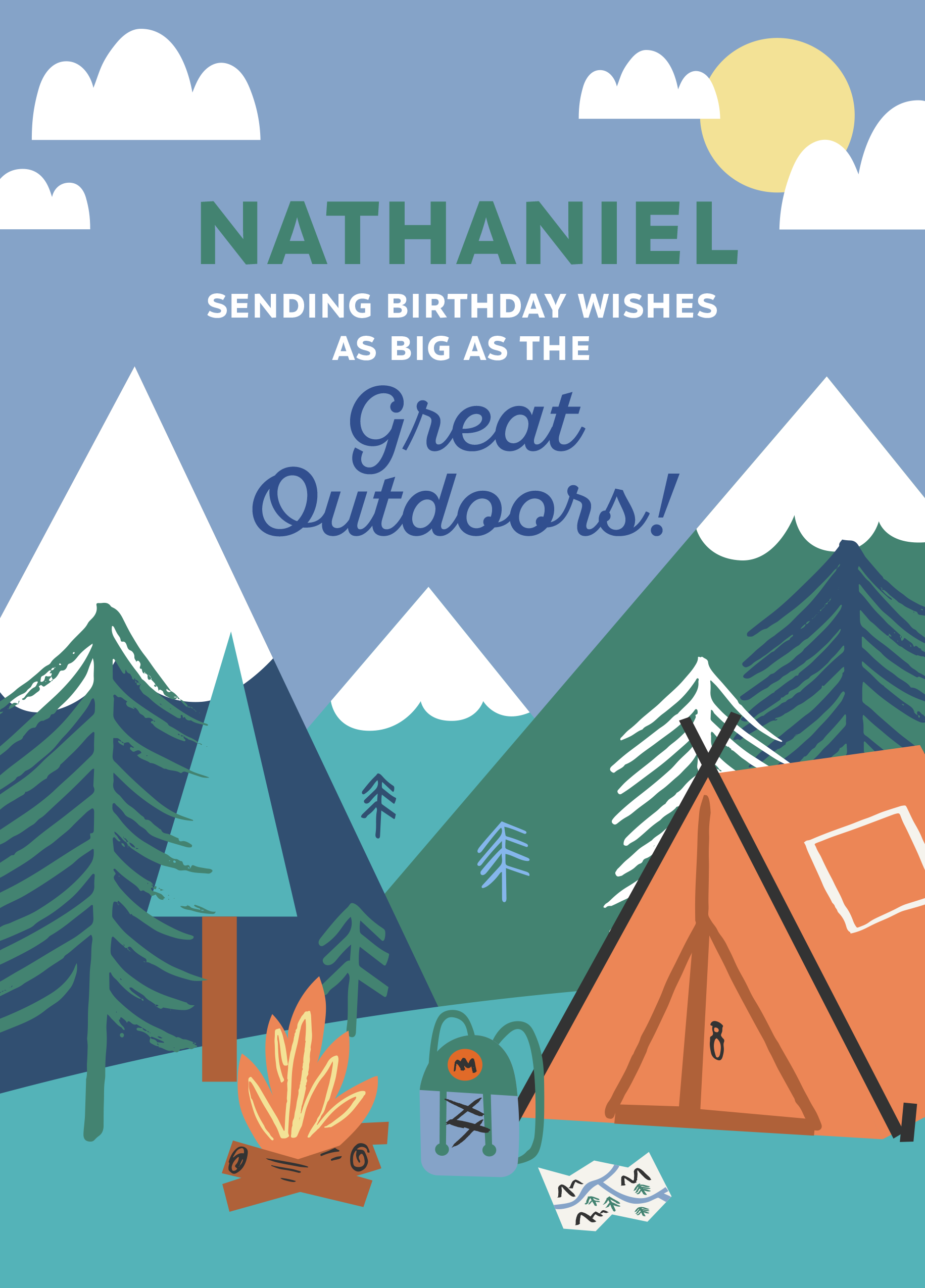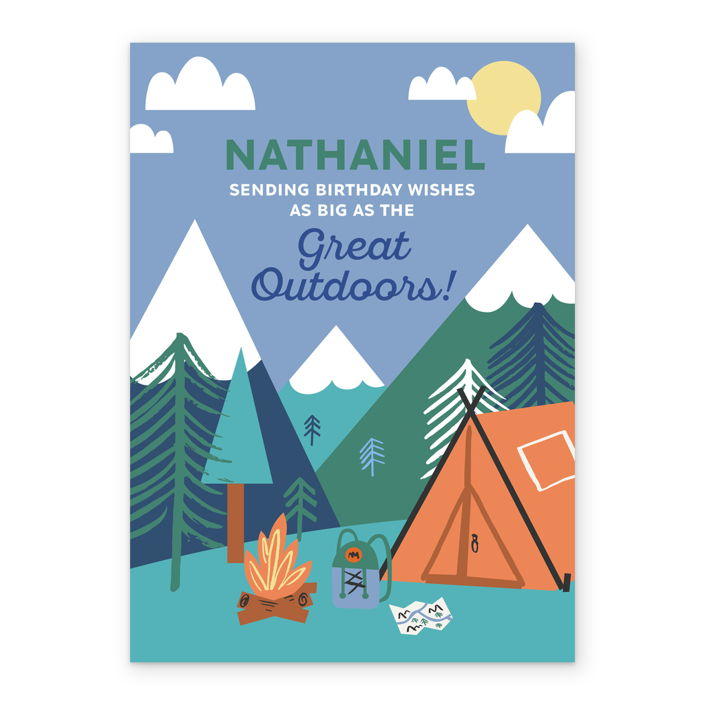Printed on premium-quality board, this card features an illustration of a campsite, with the message 'Sending Birthday Wishes As Big As The Great Outdoors!', space to personalise a name, and comes complete with a co-ordinating white envelope.