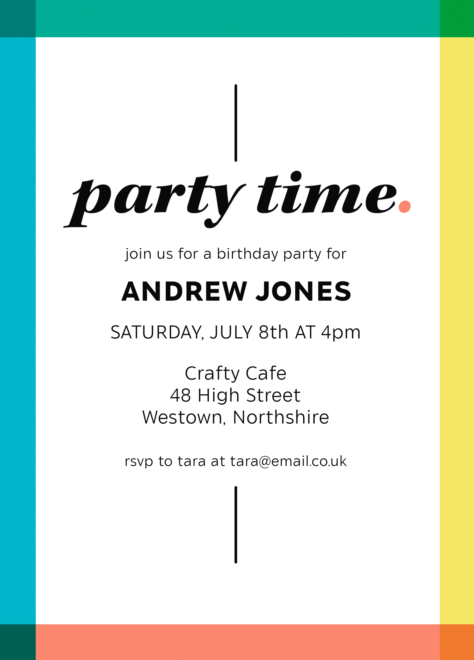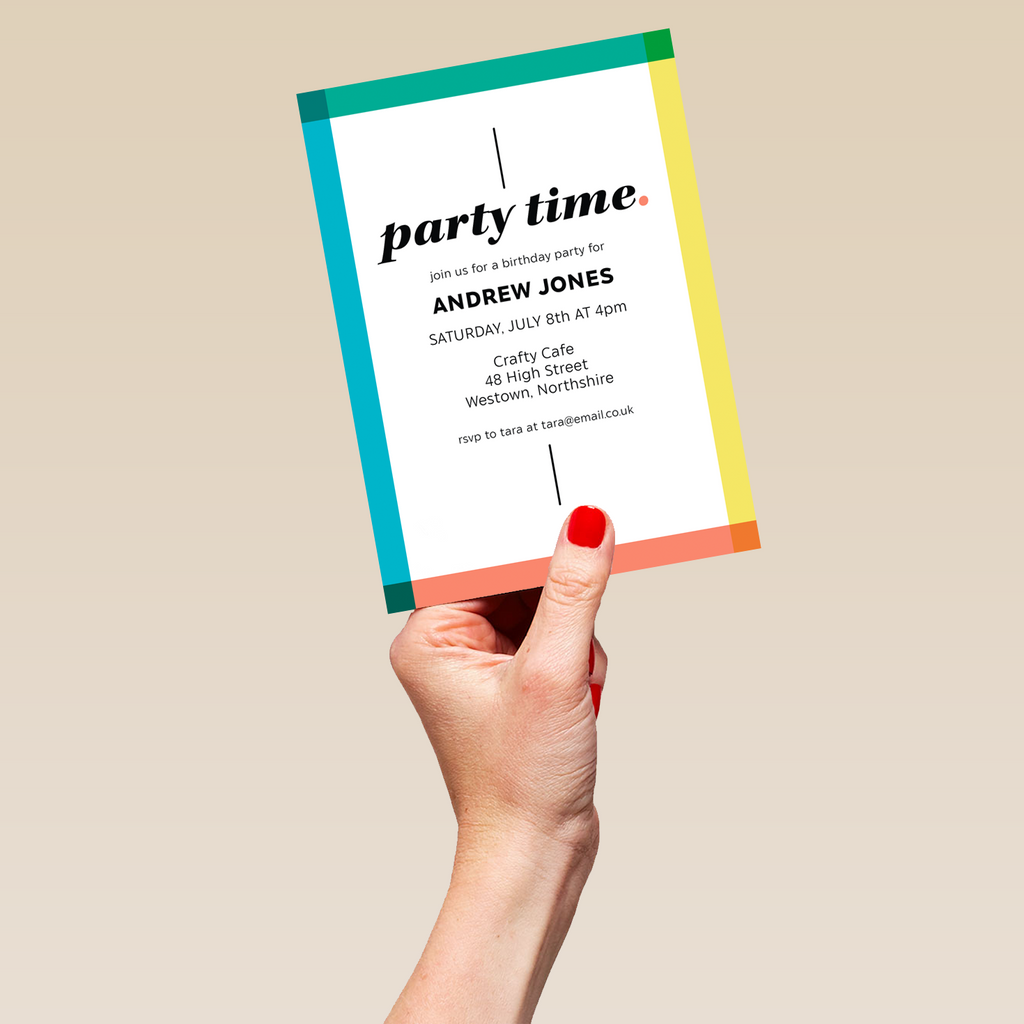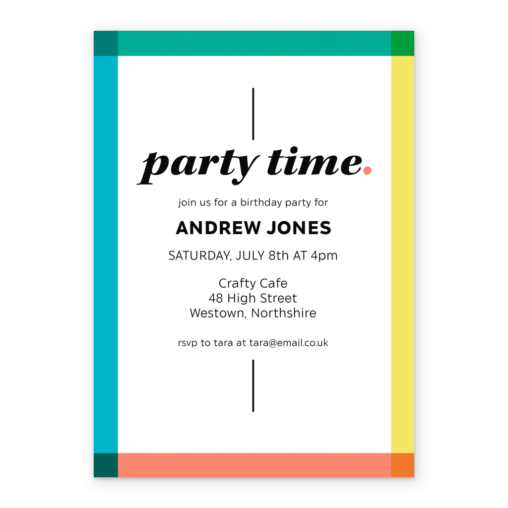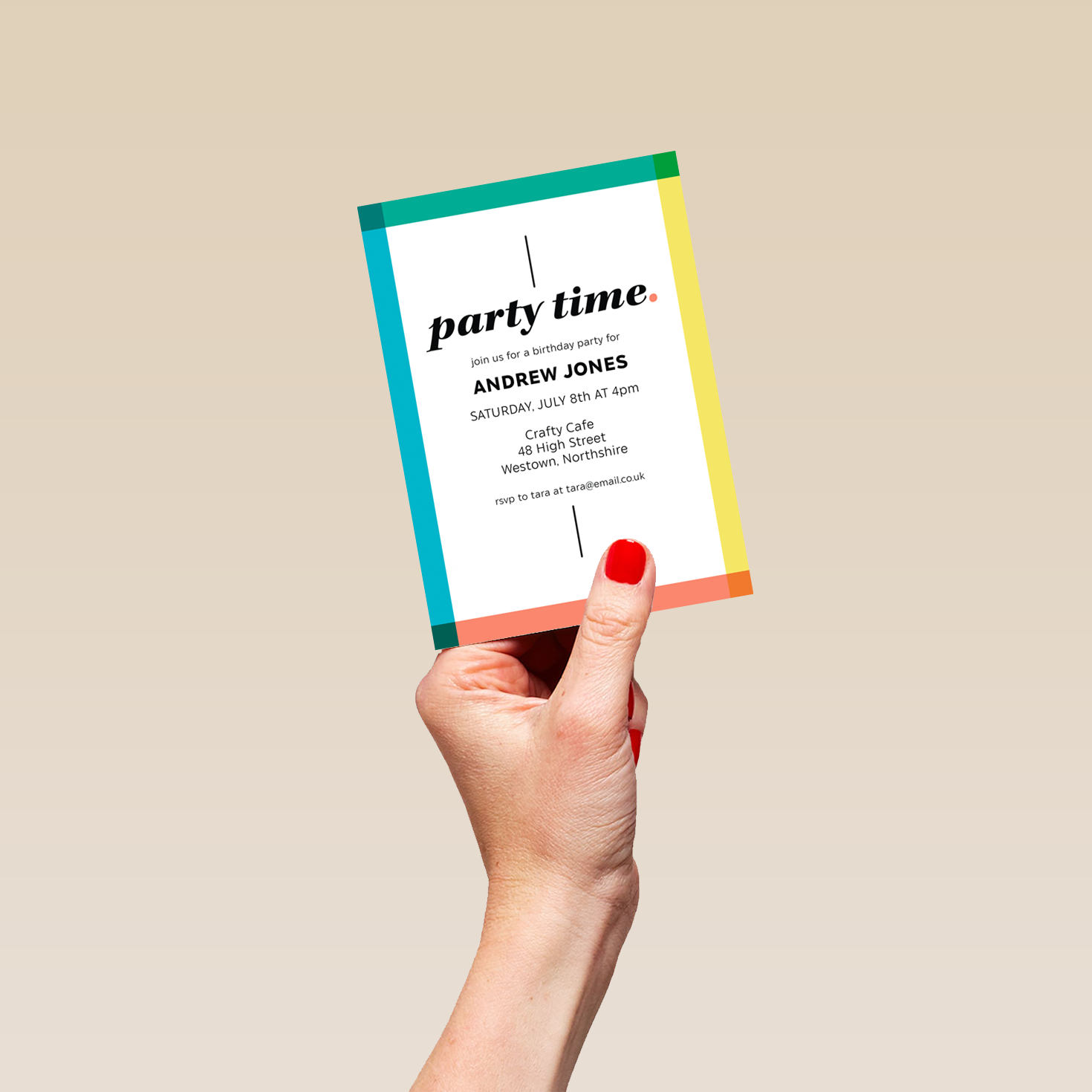 Printed on premium-quality board, this card features editable space for a date, address and contact details, a colourful border design, with the message 'Party Time. Join us for a birthday party for [Name]', space to personalise a name, and comes complete with a co-ordinating white envelope.