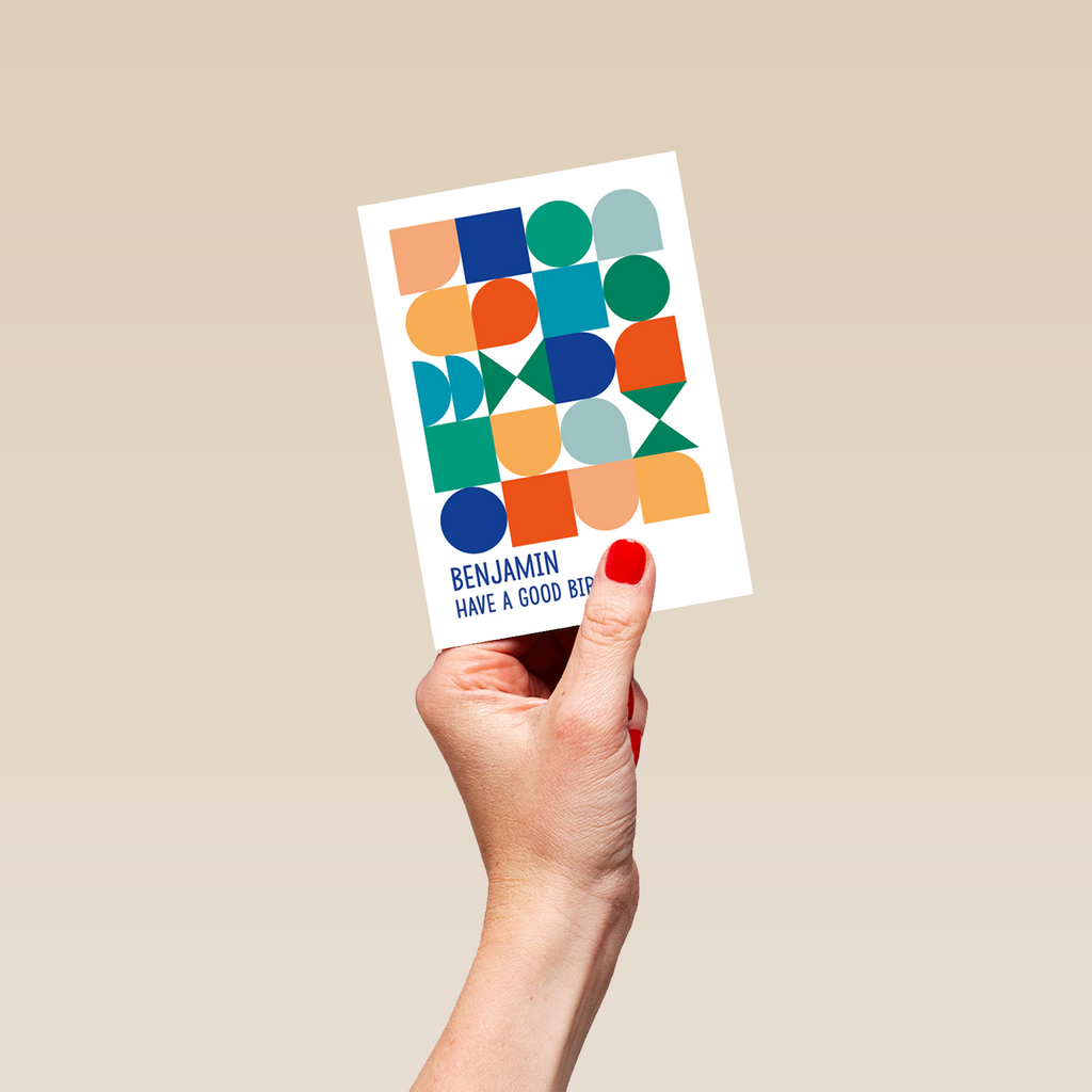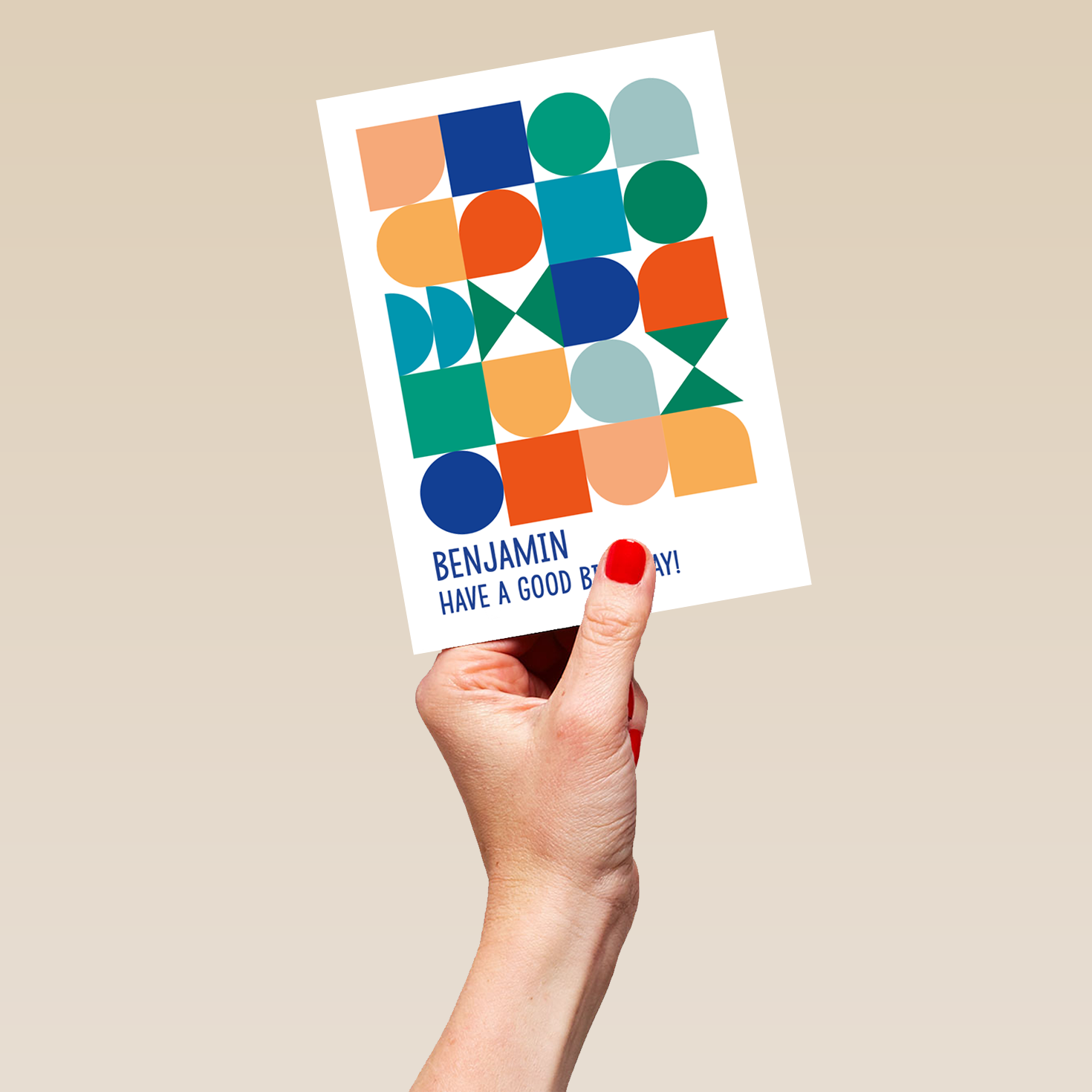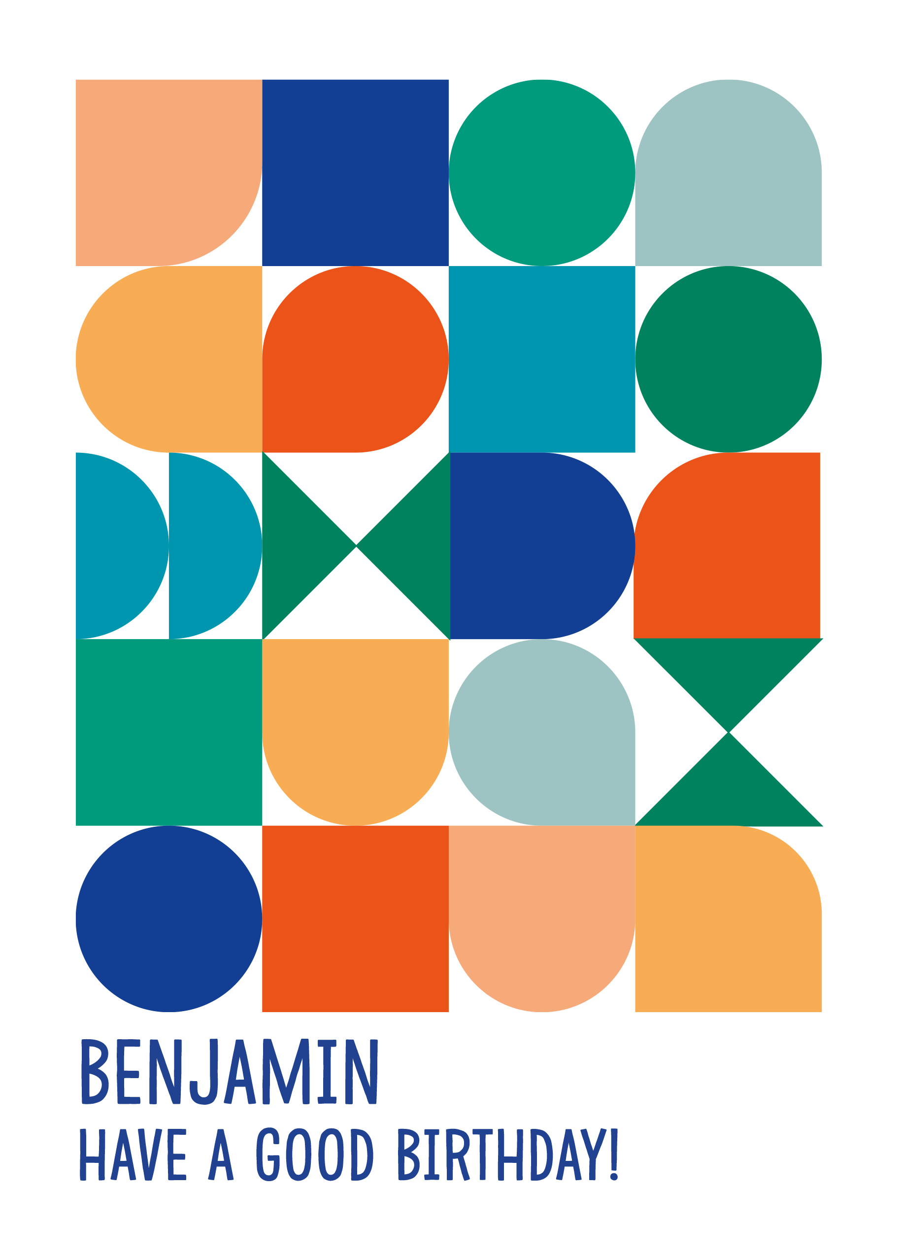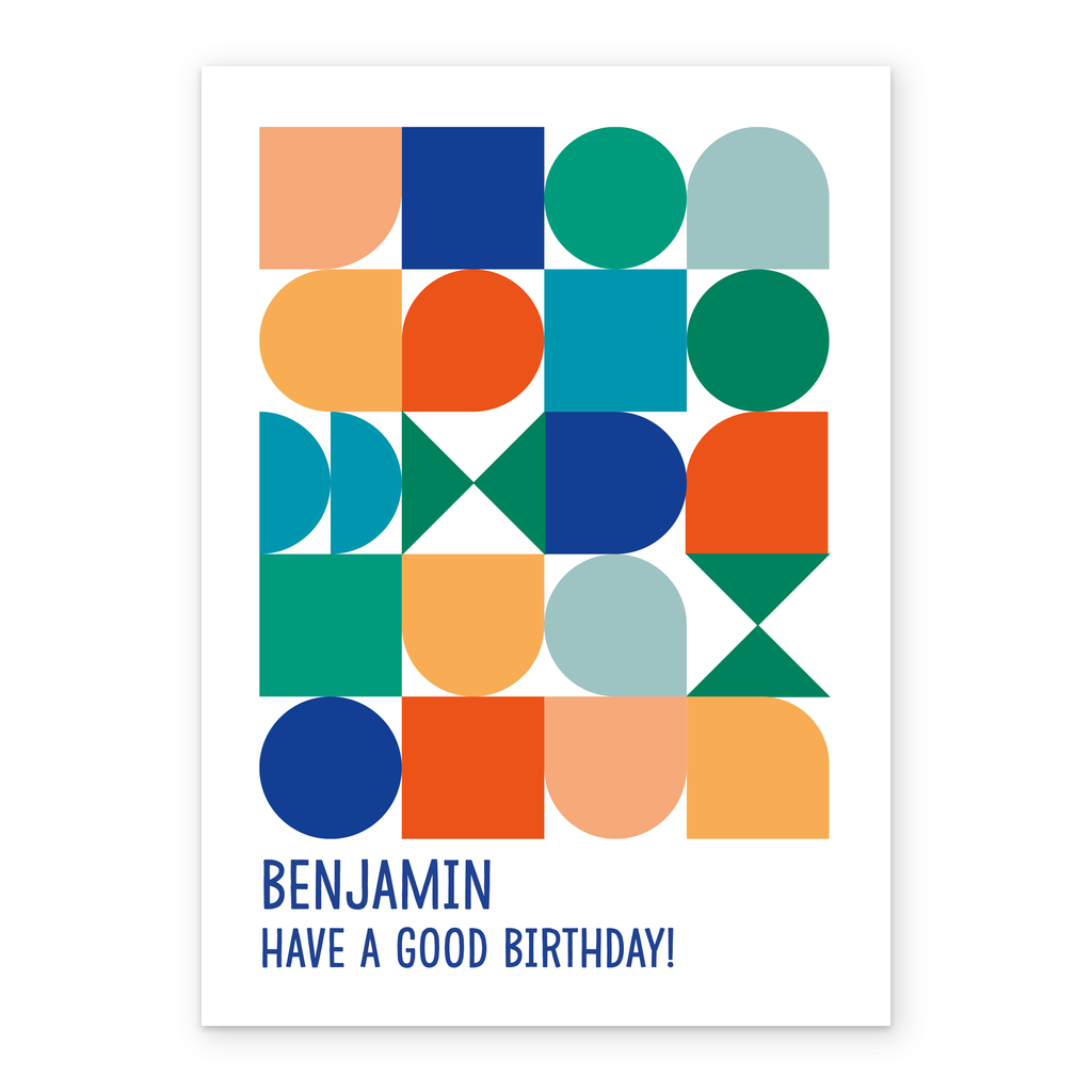 Printed on premium-quality board, this card features different shapes in different colours, with the message '[NAME] Have A Good Birthday!', and comes complete with a co-ordinating white envelope.