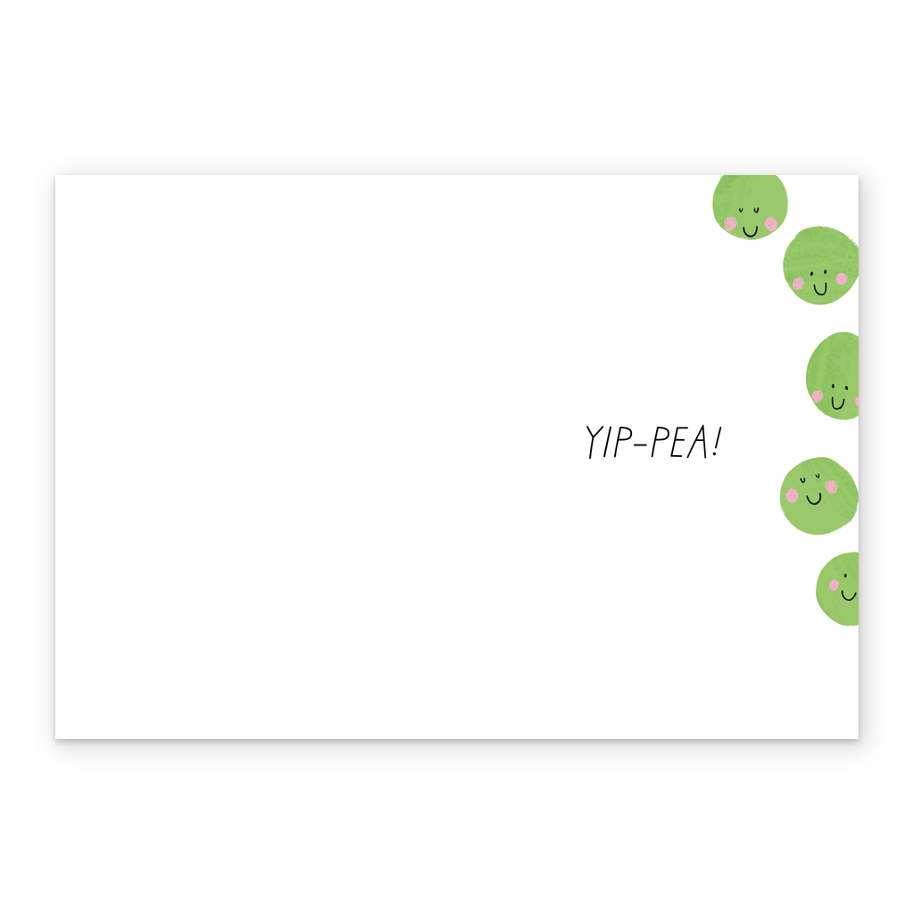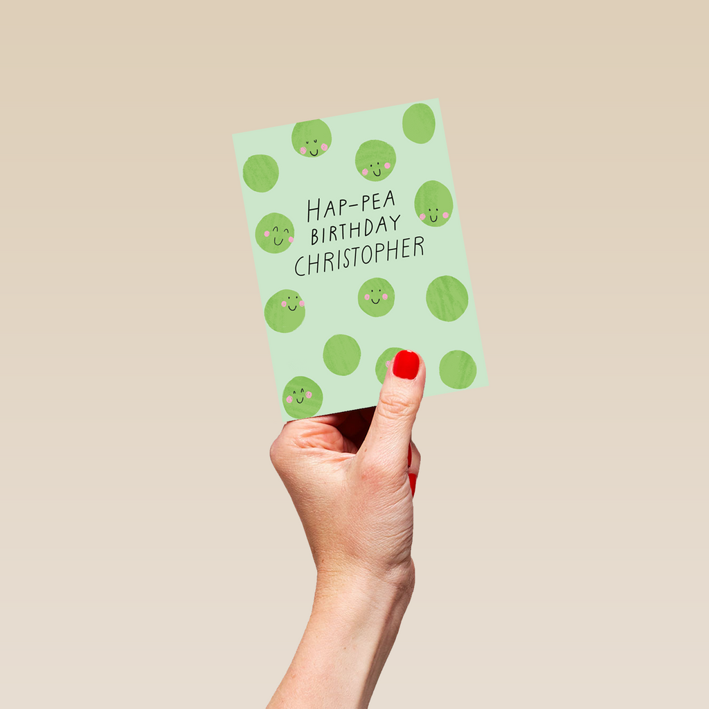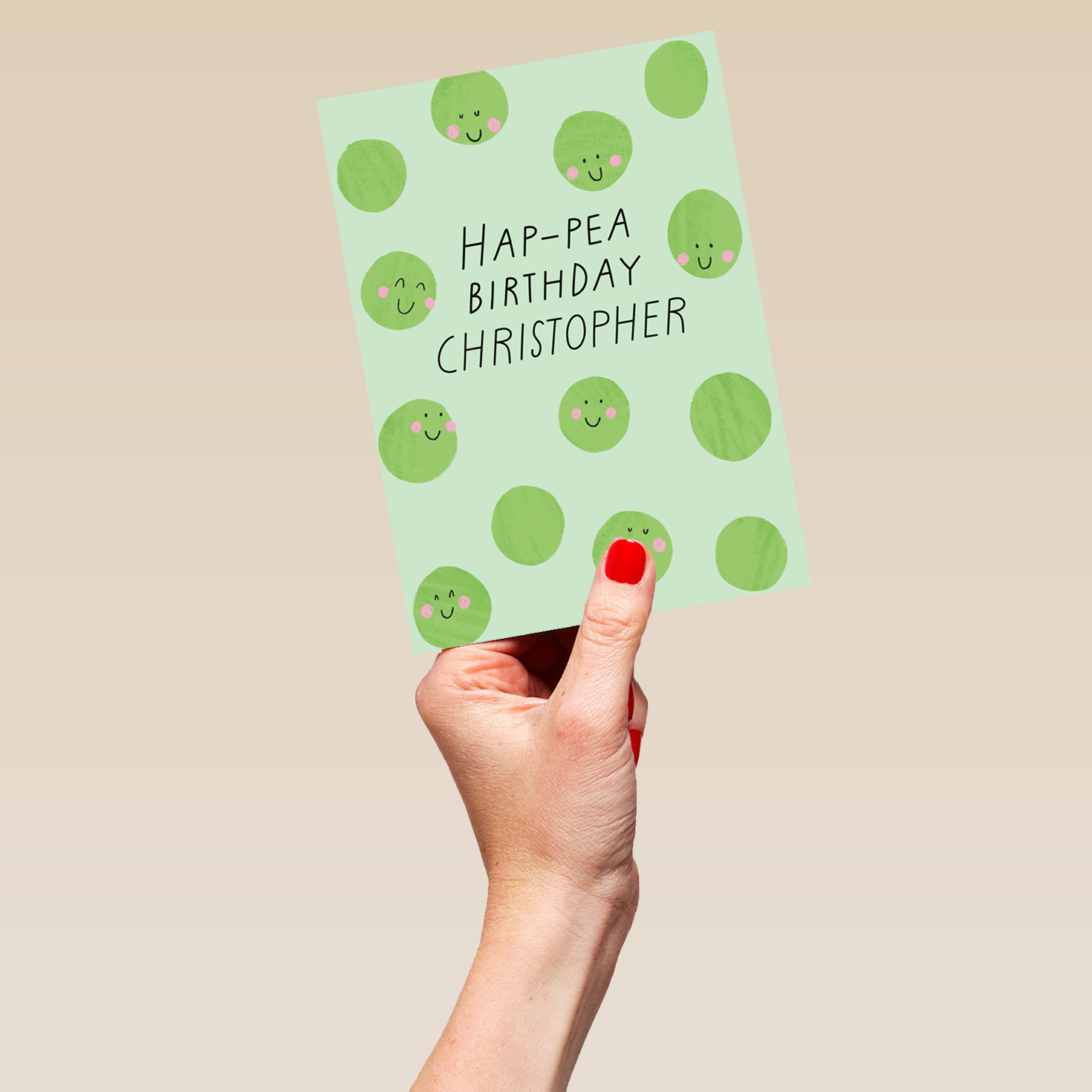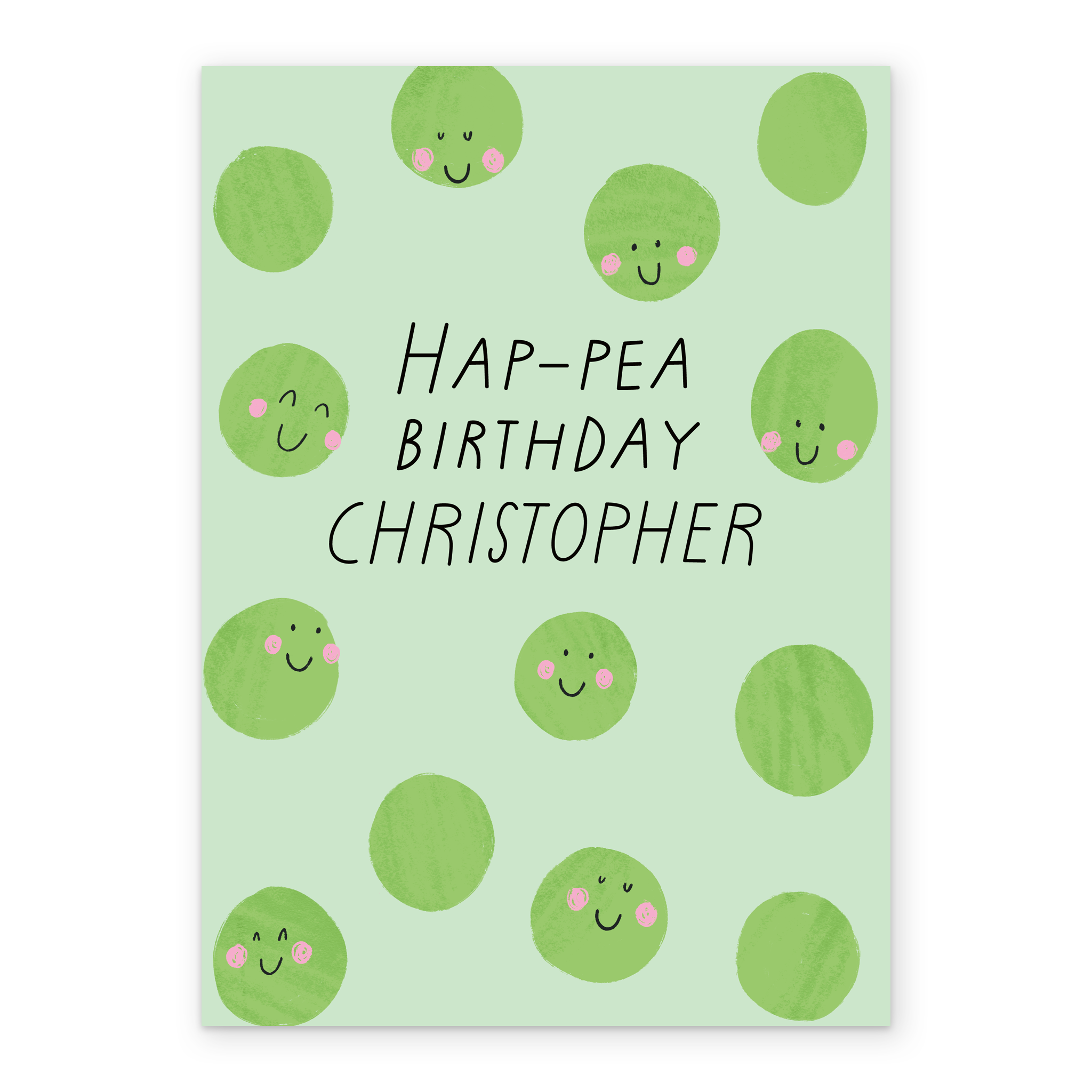 Printed on premium-quality board, this card features lots of cute, green smiling peas, with the message 'Hap-Pea Birthday [NAME]', space to personalise a name, and comes complete with a co-ordinating white envelope.