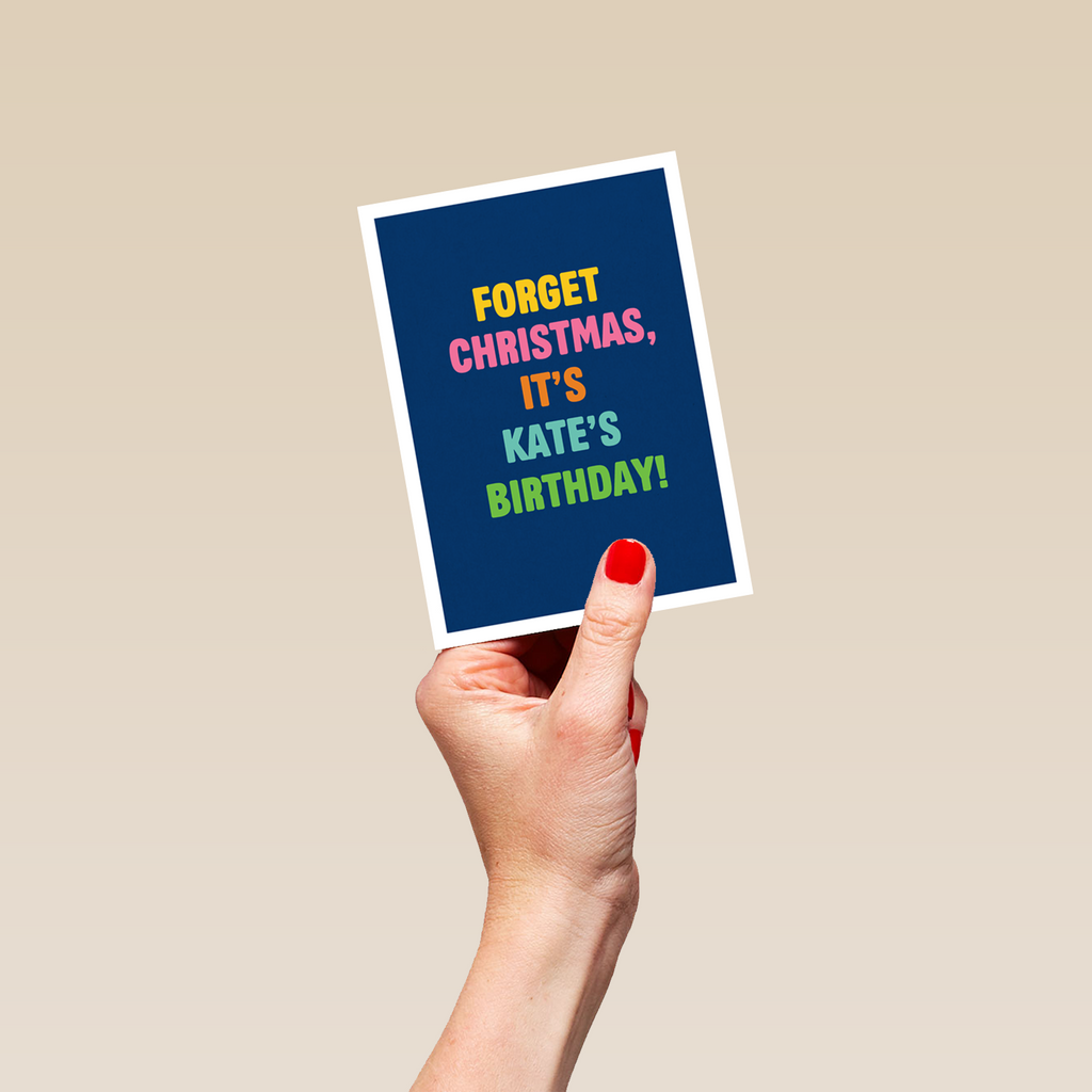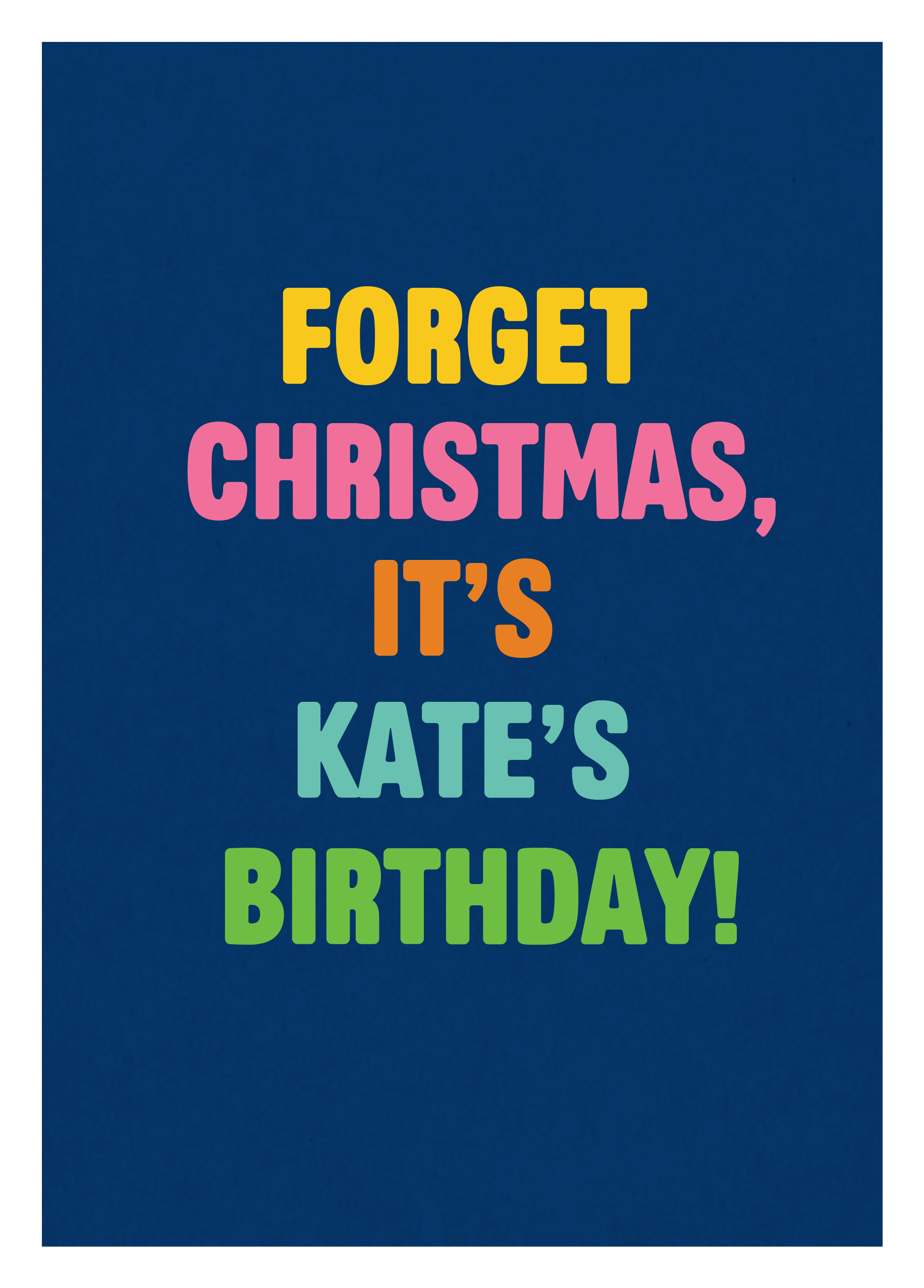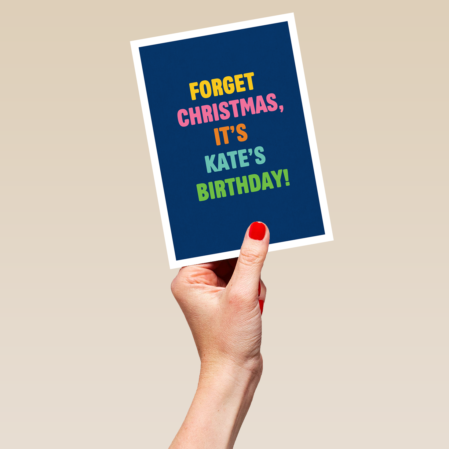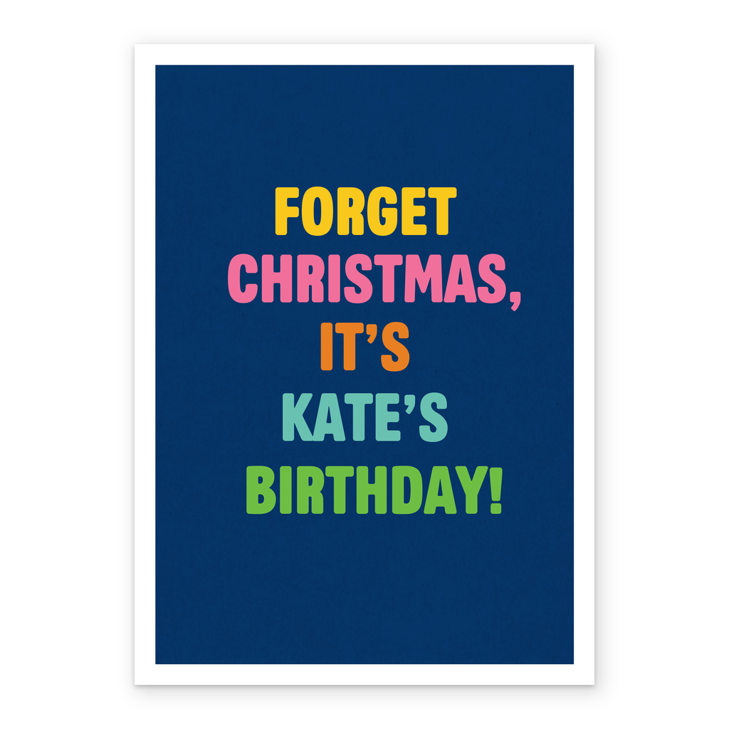 Printed on premium-quality board, this card features fun and vibrant lettering on a blue background, with the message 'Forget Christmas, It's [Name]'s Birthday!', space to personalise a name, and comes complete with a co-ordinating white envelope.