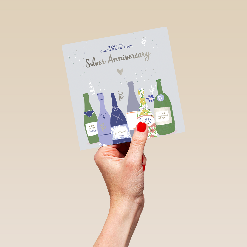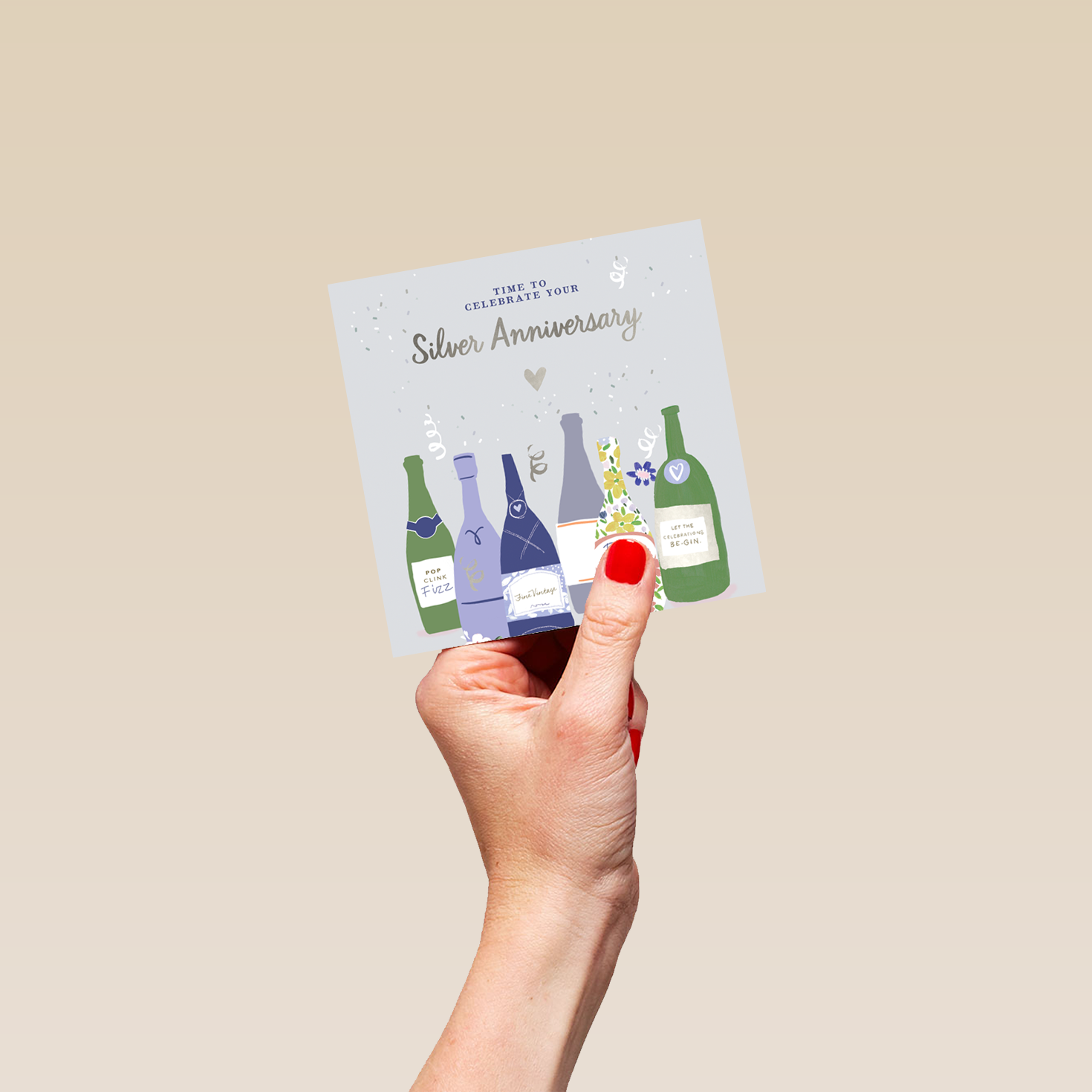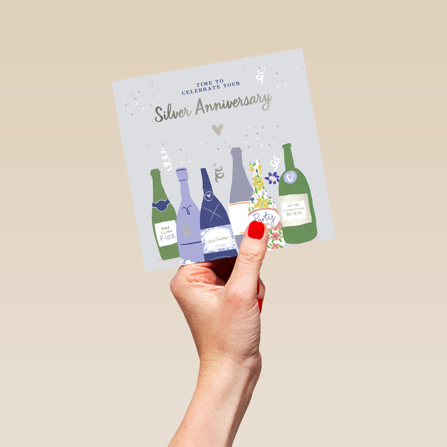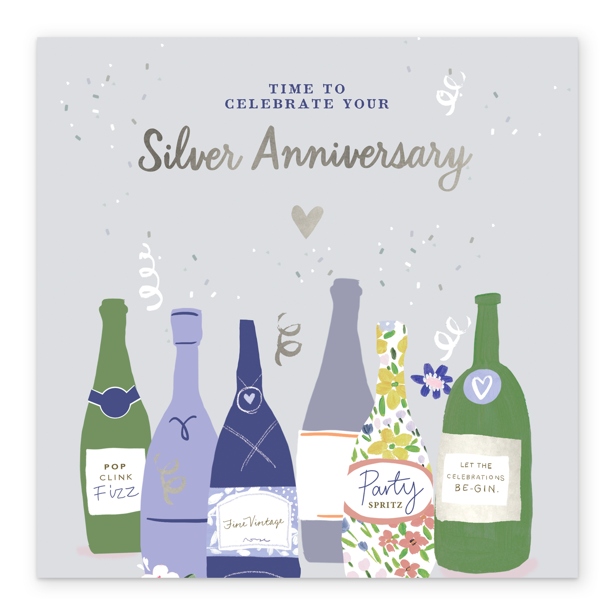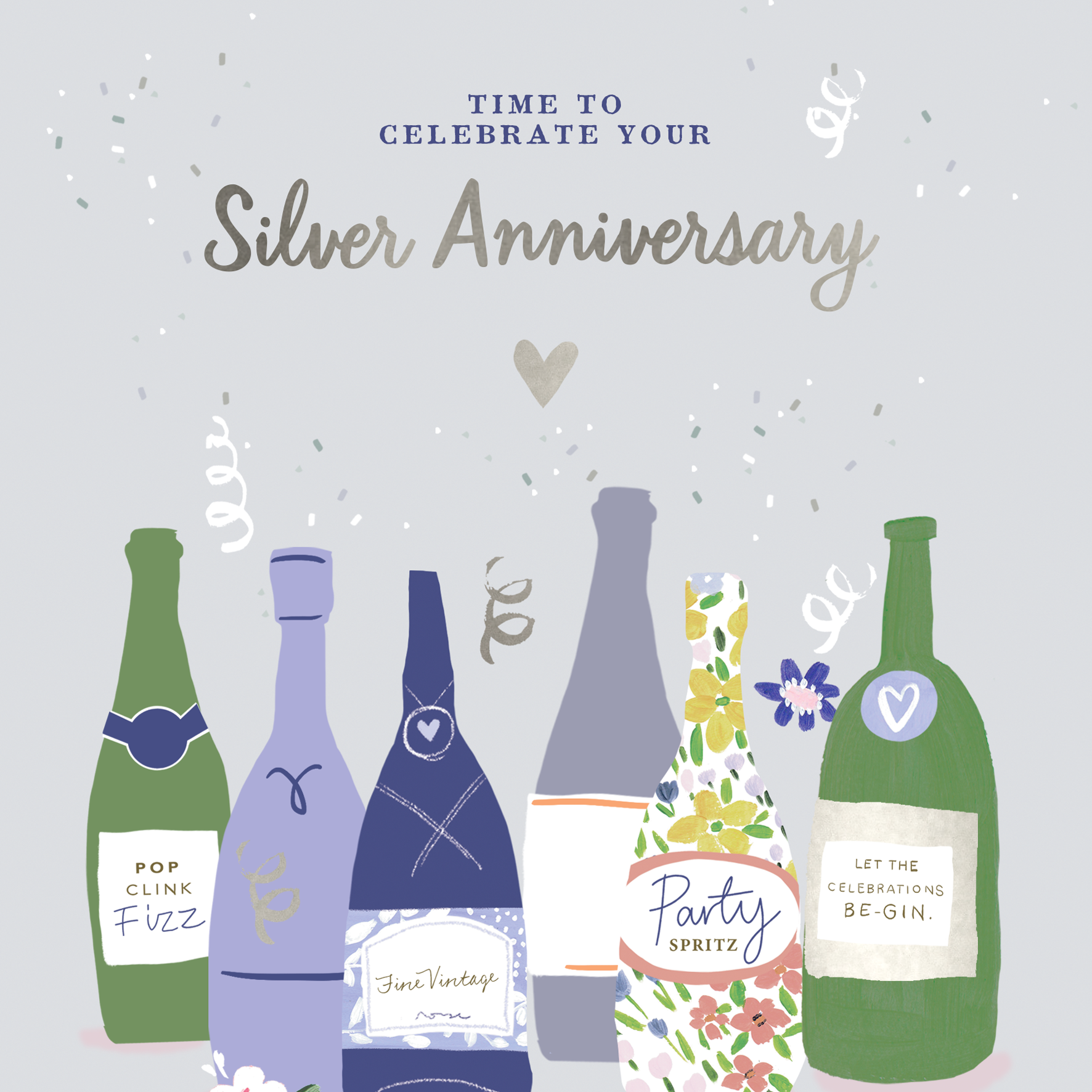 Printed on premium-quality board, this card features fun and contemporary styled illustrated bottles of champagne, with the message 'Time To Celebrate Your Silver Anniversary', and comes complete with a co-ordinating white envelope.