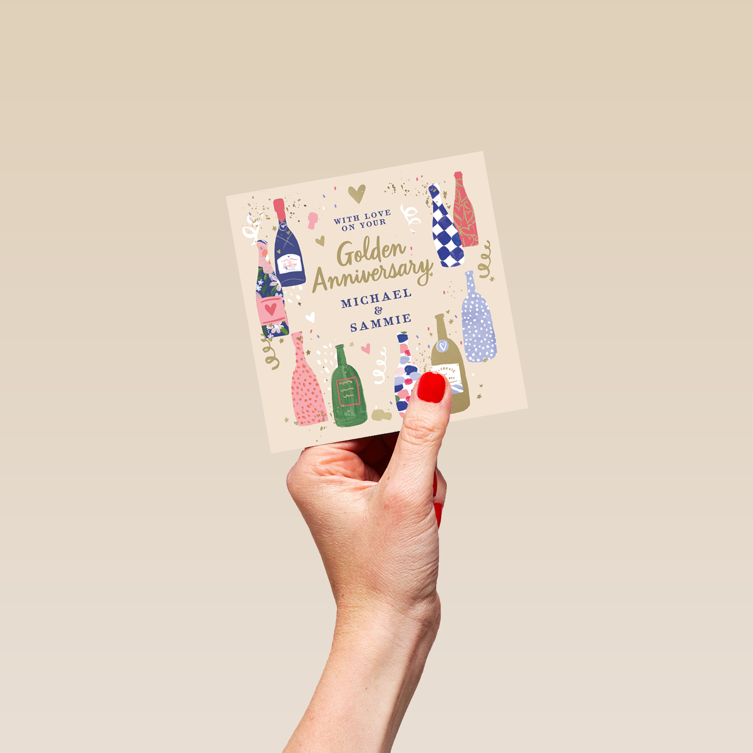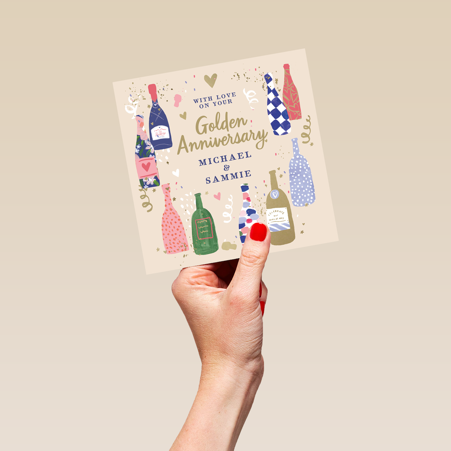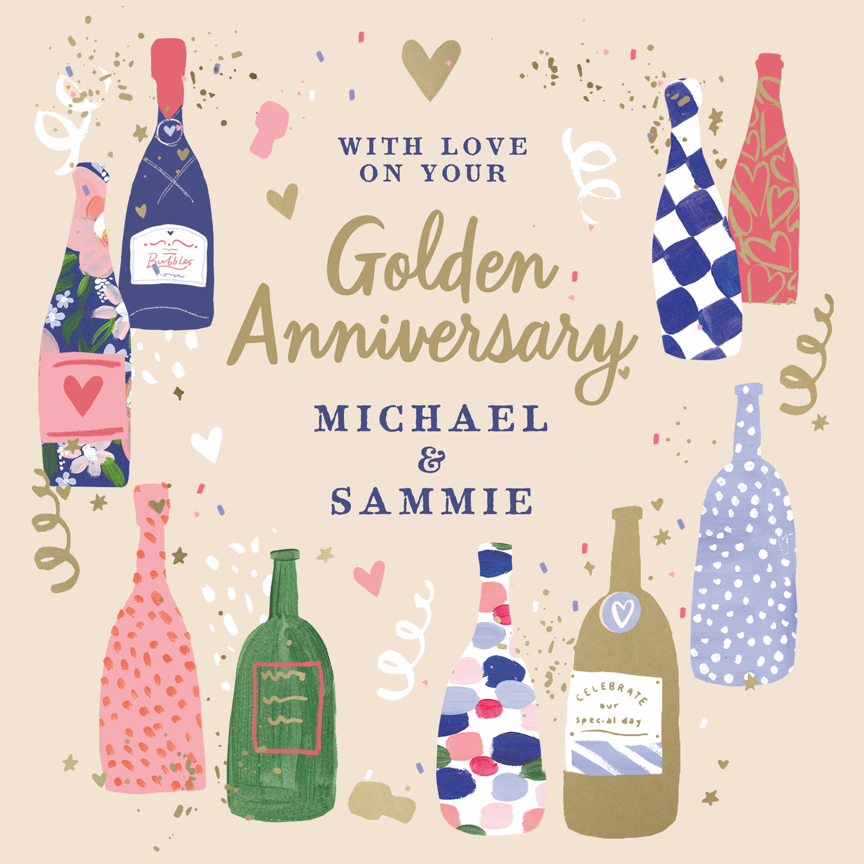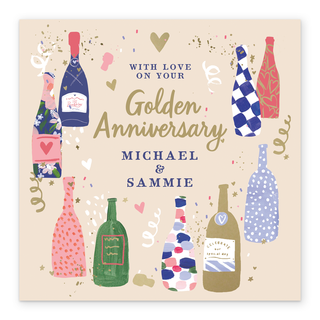 Printed on premium-quality board, this card features fun and contemporary styled illustrated bottles of champagne, with the message 'With Love On Your Golden Anniversary', space to personalise a name, and comes complete with a co-ordinating white envelope.