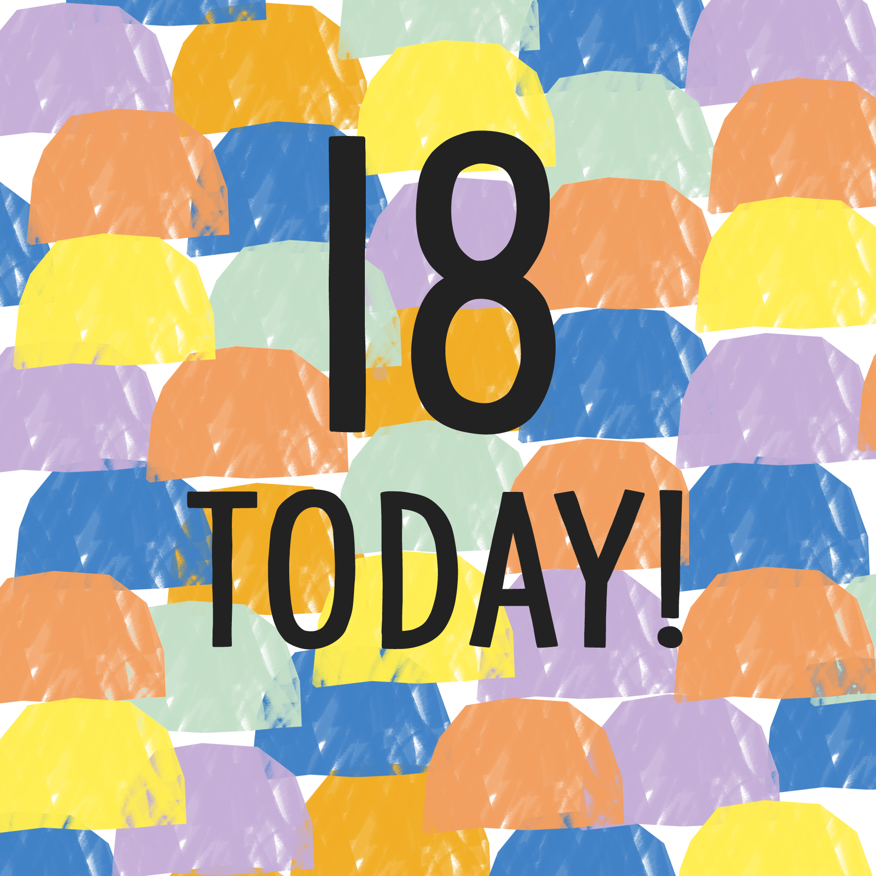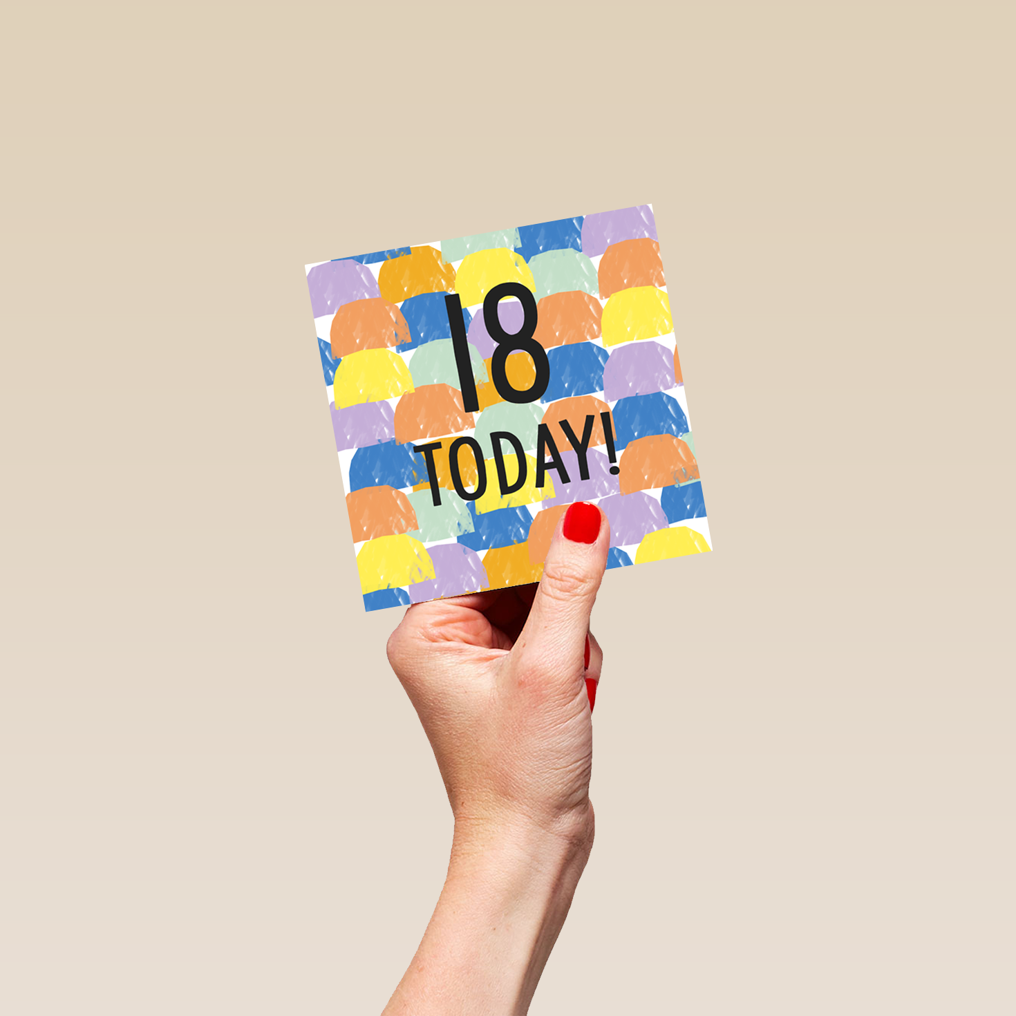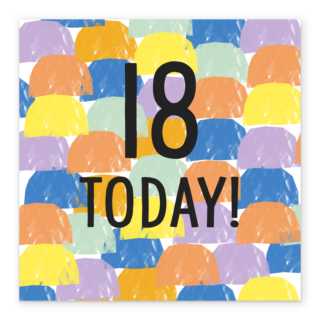 Printed on premium-quality board, this card features fun and colourful shapes, with the message '18 Today!', space to personalise the age, and comes complete with a co-ordinating white envelope.