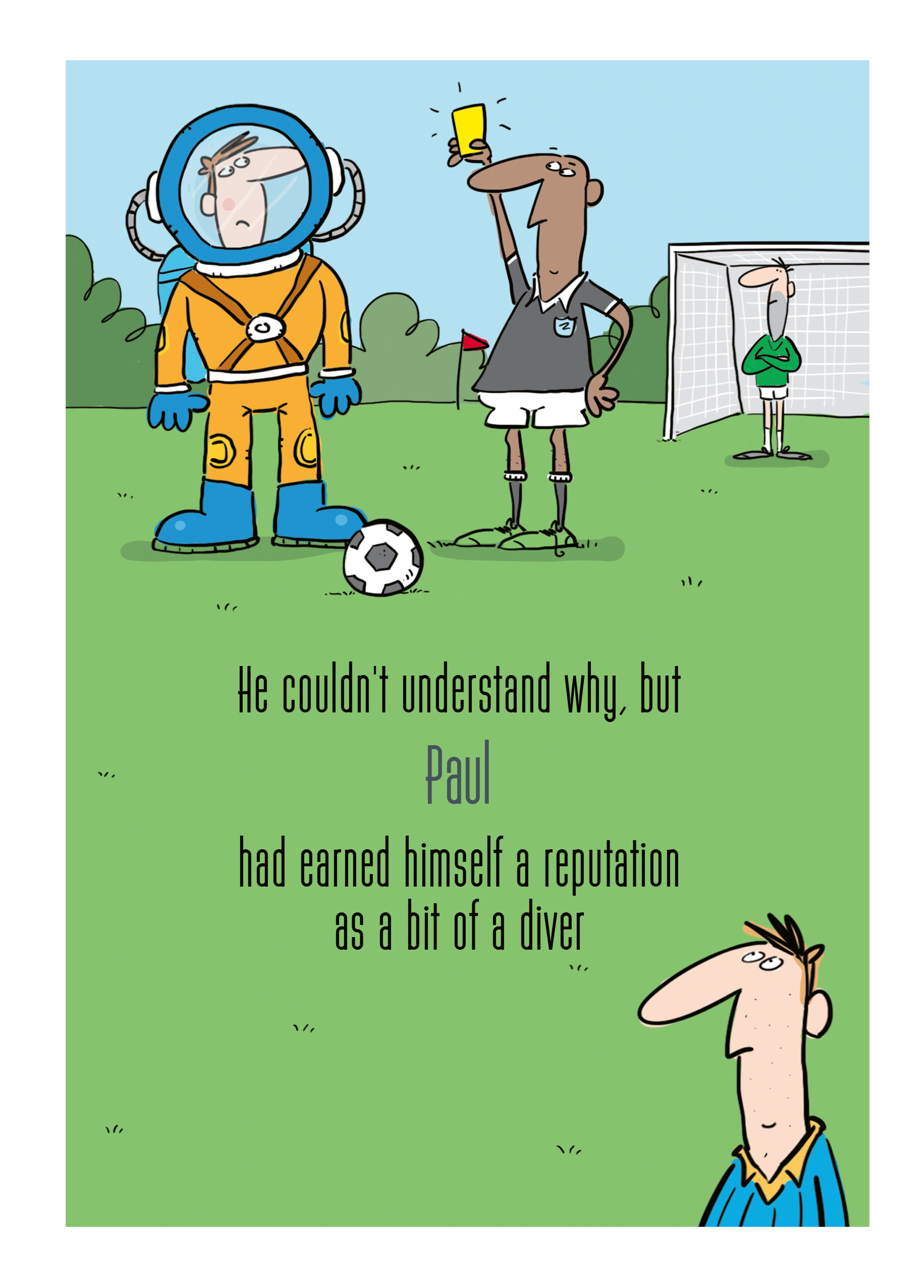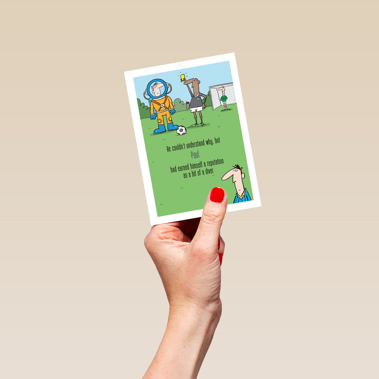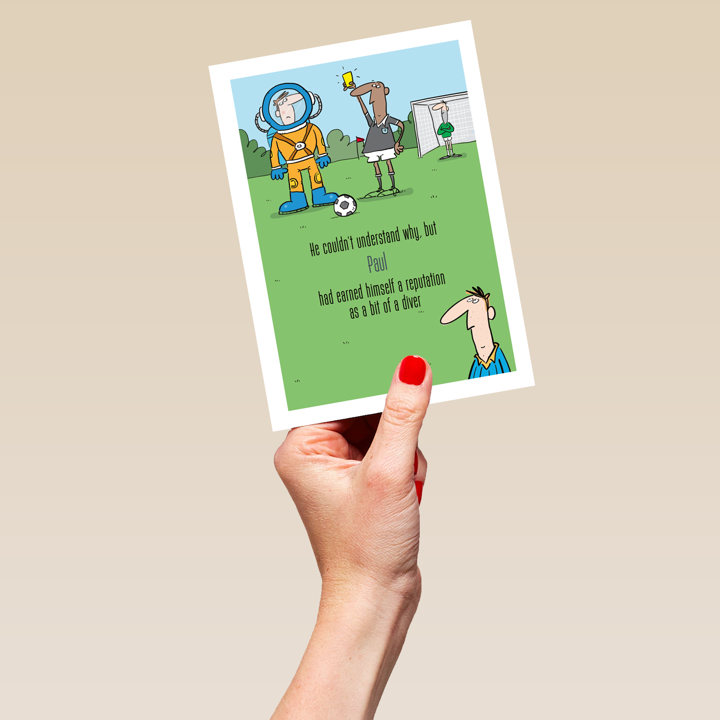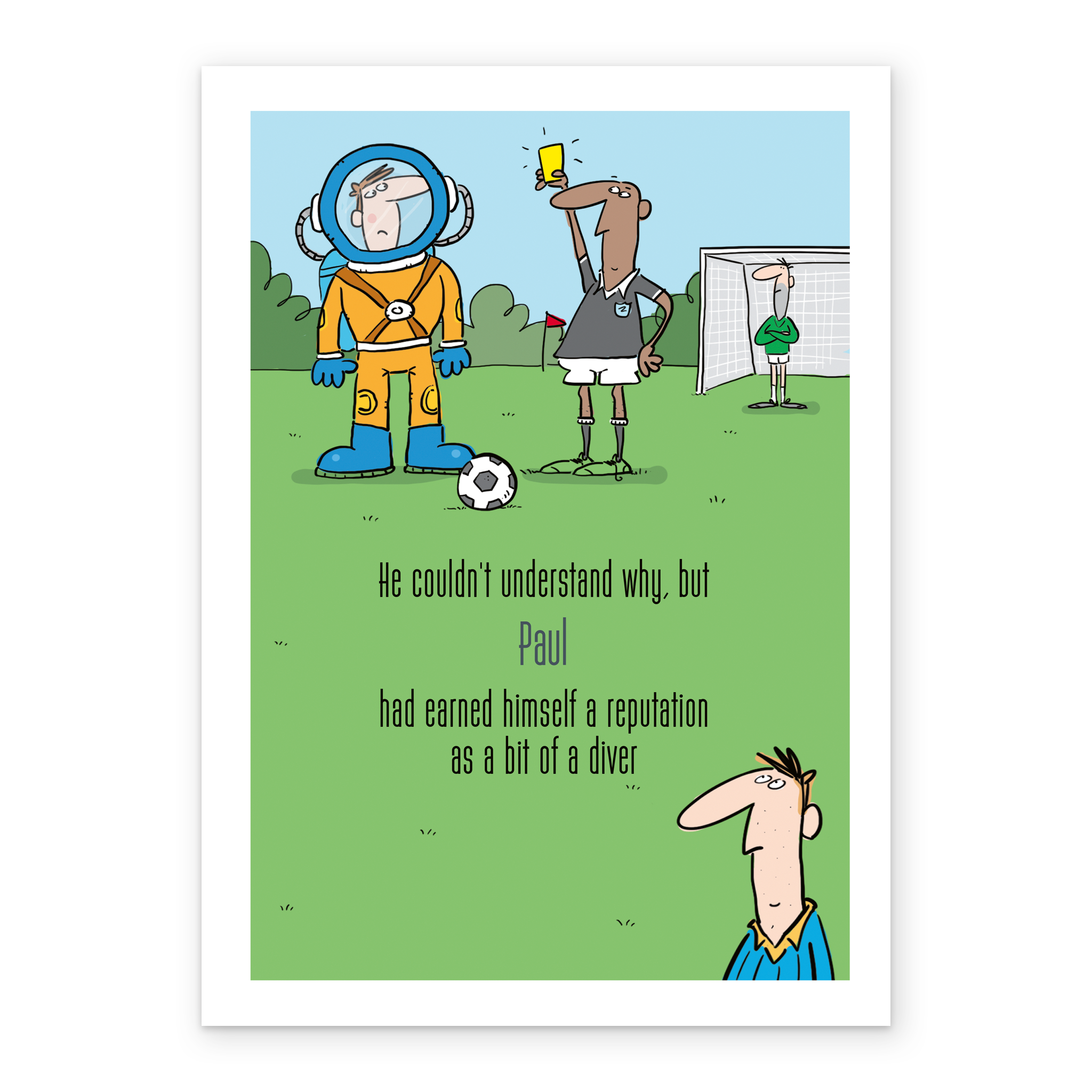 Printed on premium-quality board, this card features an illustration a man wearing diving gear receiving a yellow card, with the message 'He couldn't understand why, but [Name] had earned himself a reputation as a bit of a diver', space to personalise a name, and comes complete with a co-ordinating white envelope.