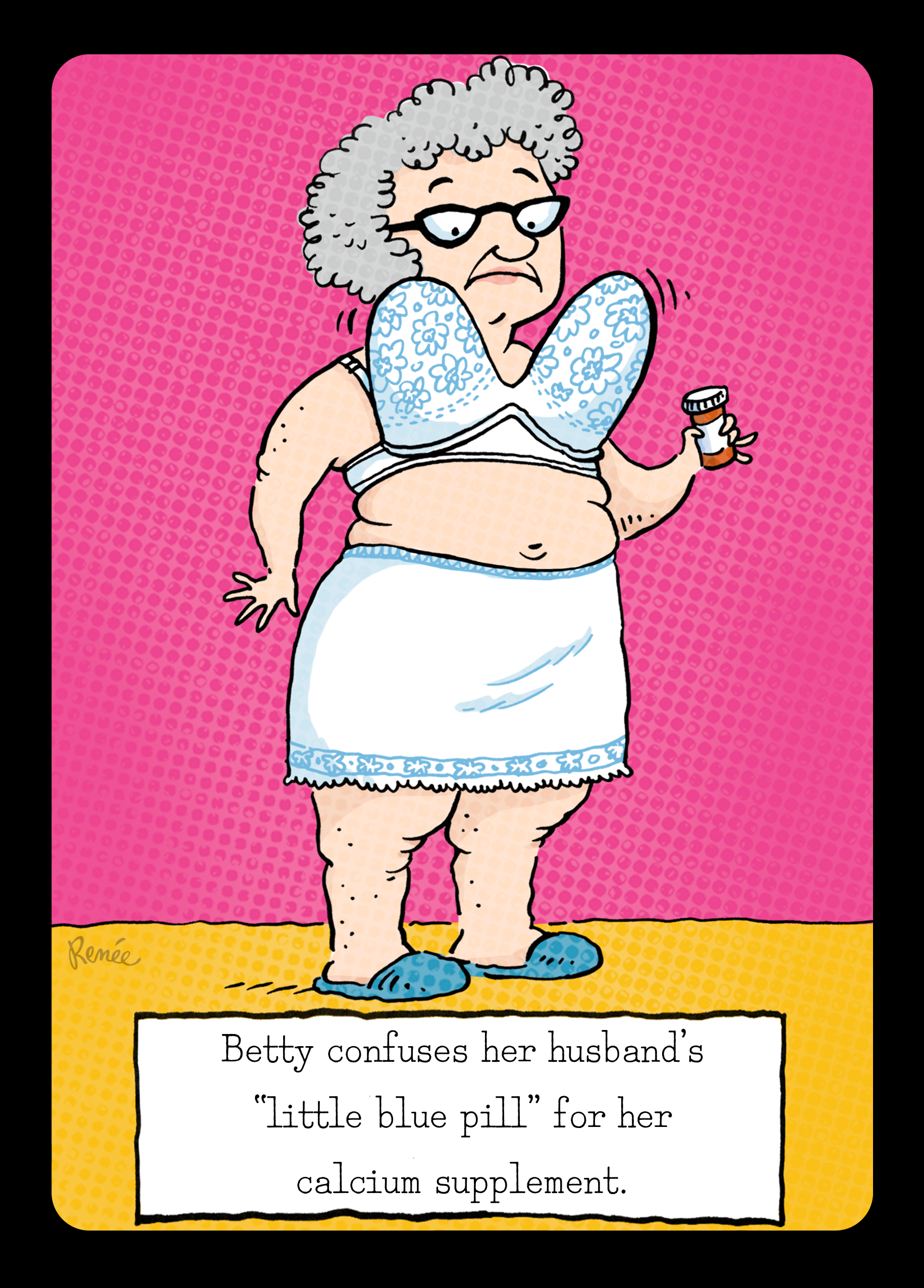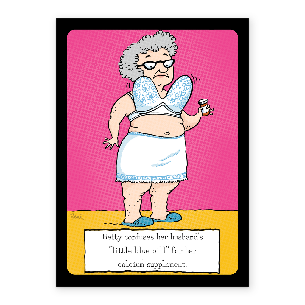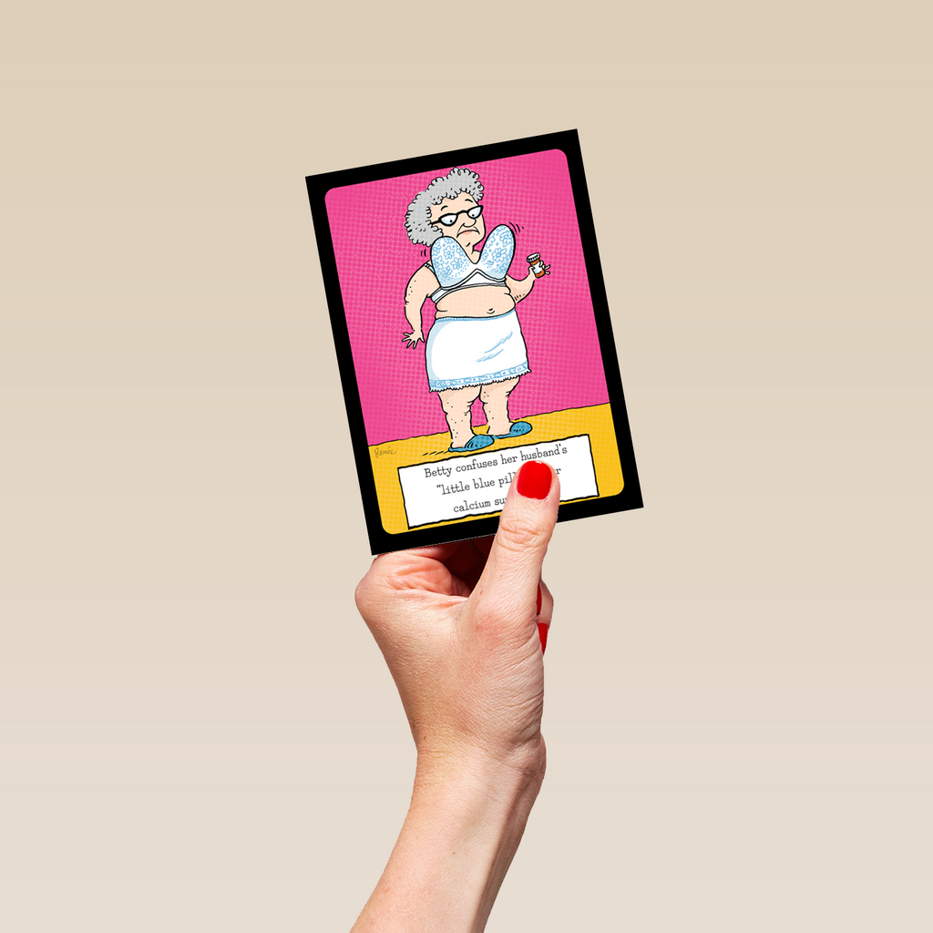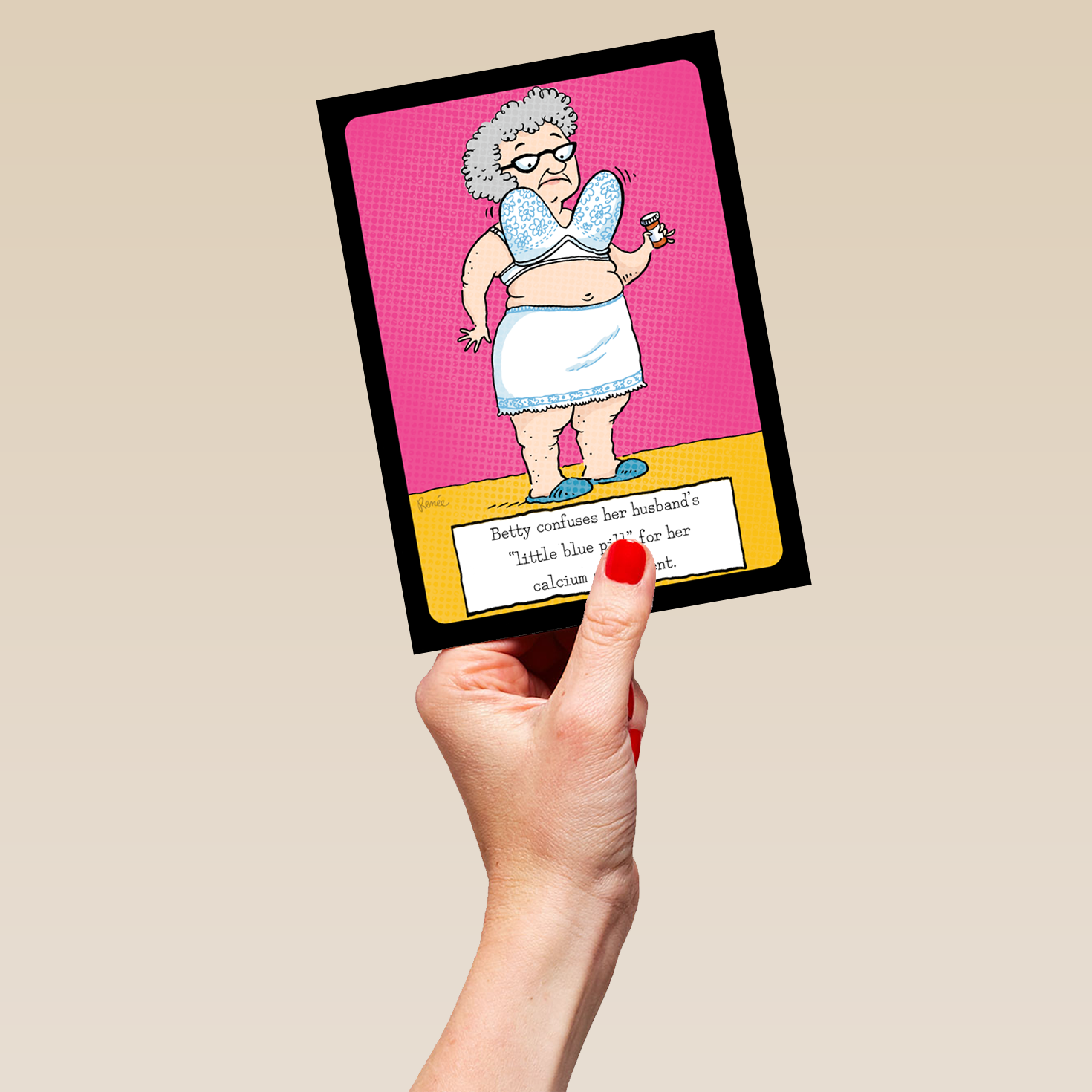 Printed on premium-quality board, this card features a funny illustration of an elderly woman in her underwear, with the message '[NAME] confuses her husband's "little blue pill" for her calcium supplement.', space to personalise your message, and comes complete with a co-ordinating white envelope.