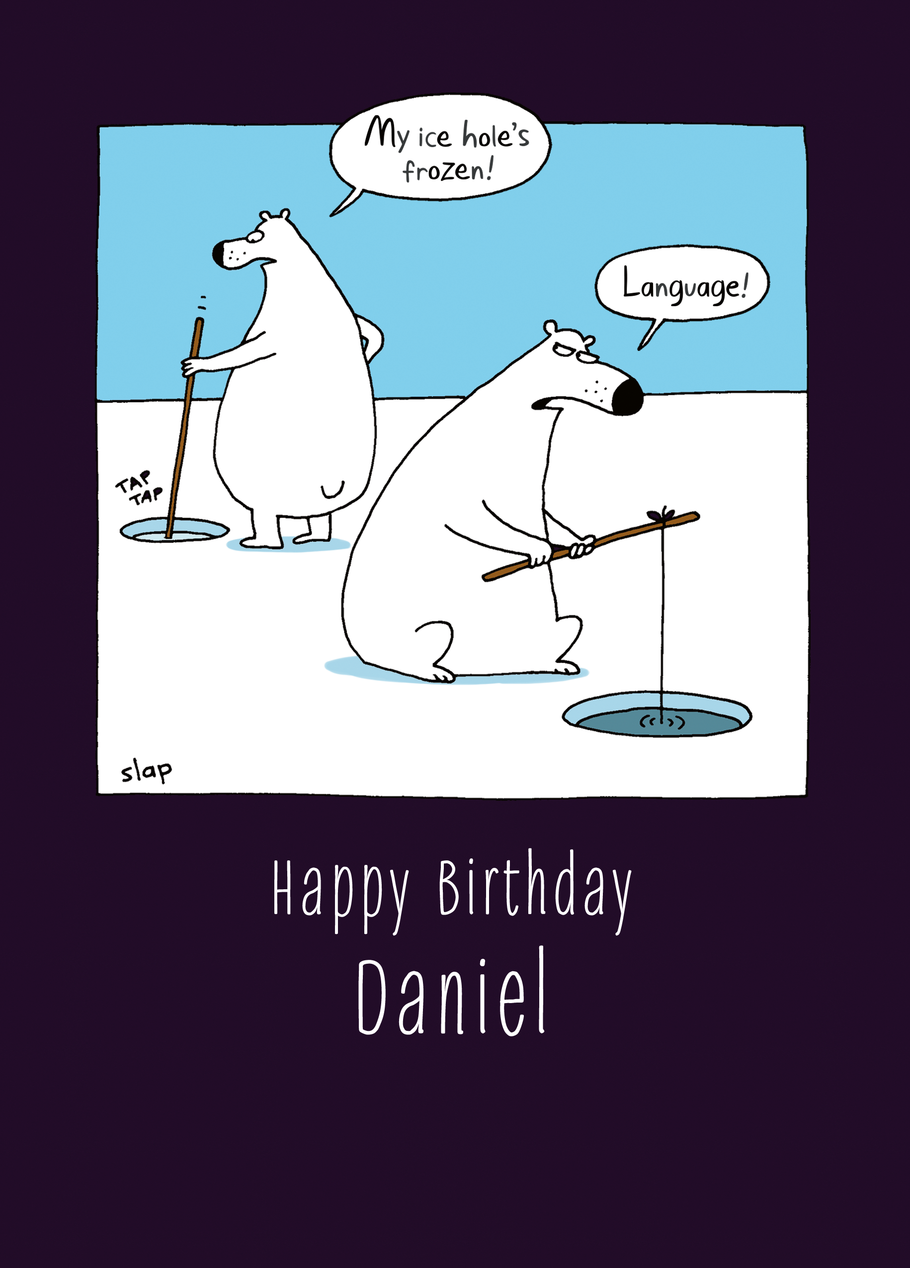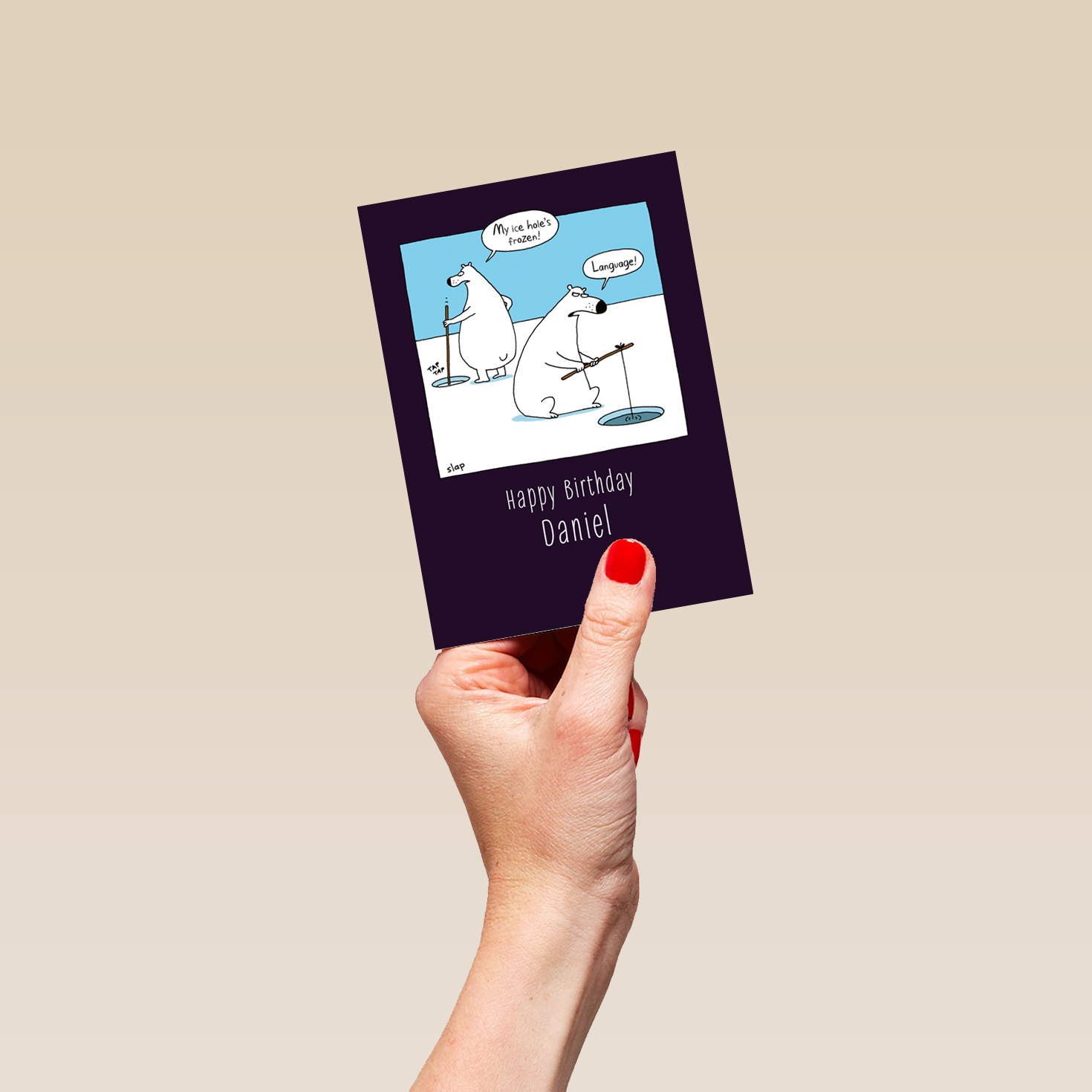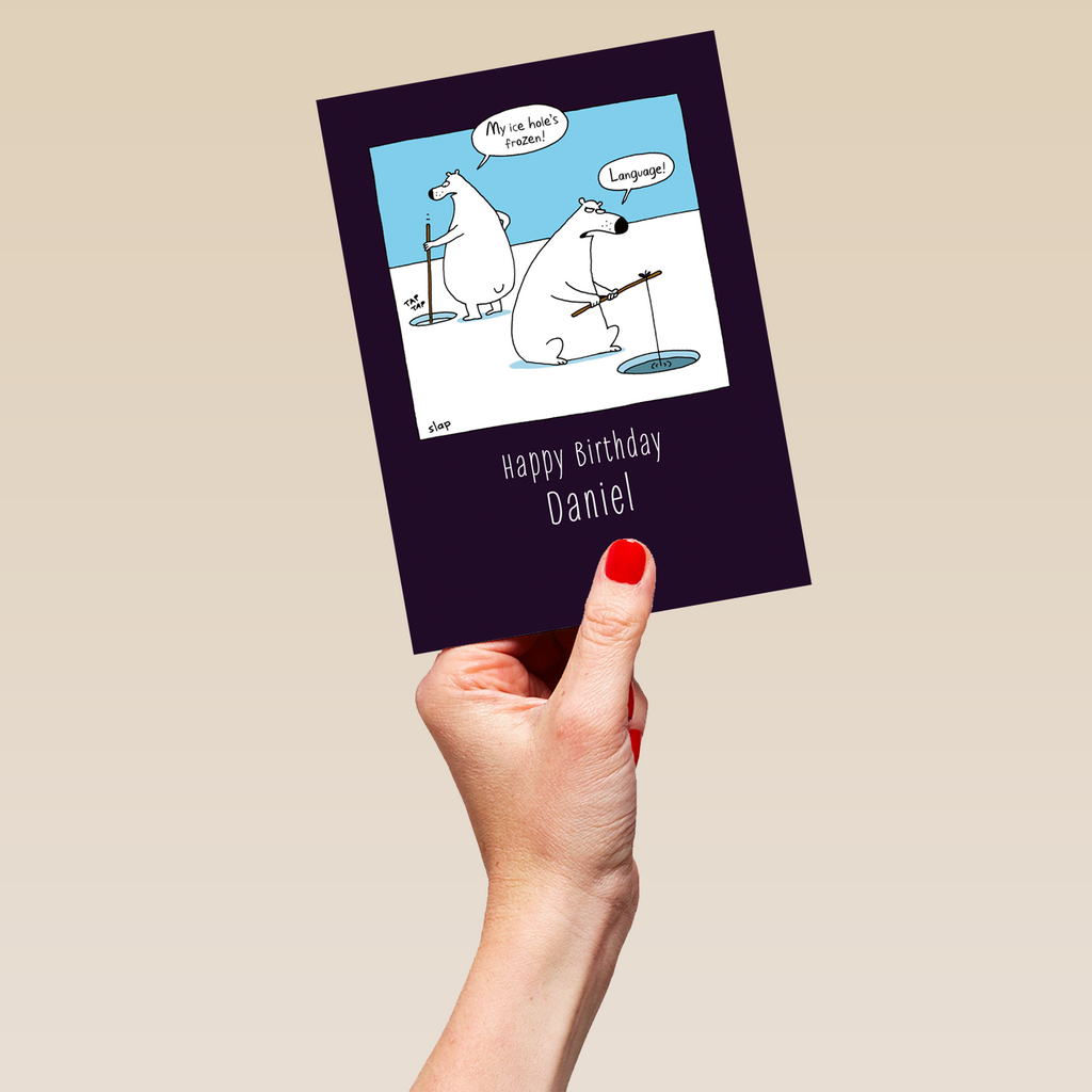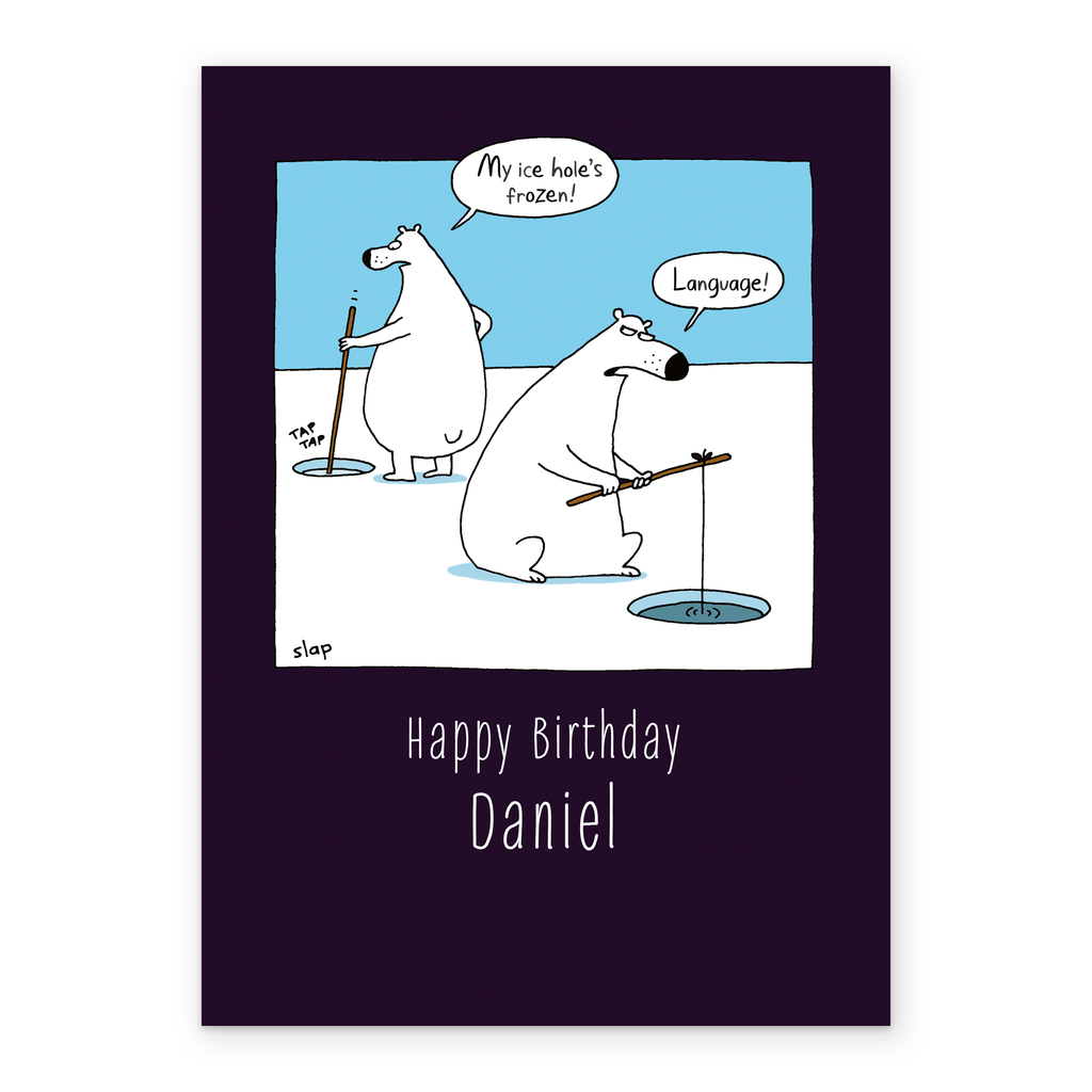 Printed on premium-quality board, this card features a funny illustration of two polar bears fishing, with the message 'Happy Birthday [Name]', space to personalise a name, and comes complete with a co-ordinating white envelope.