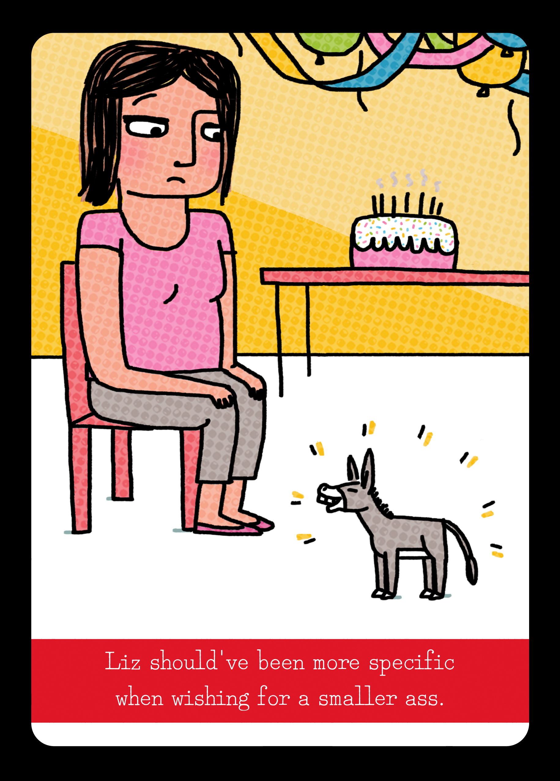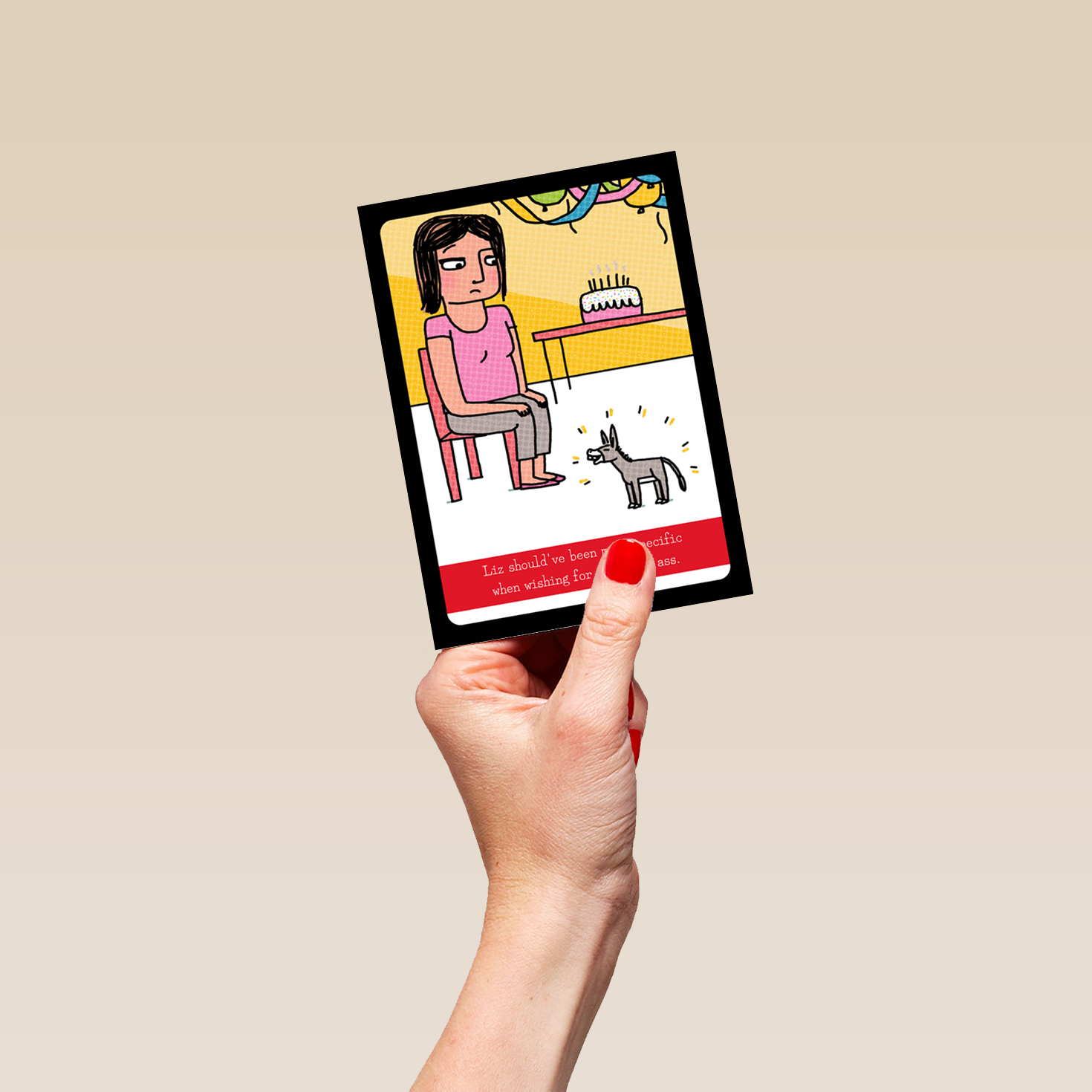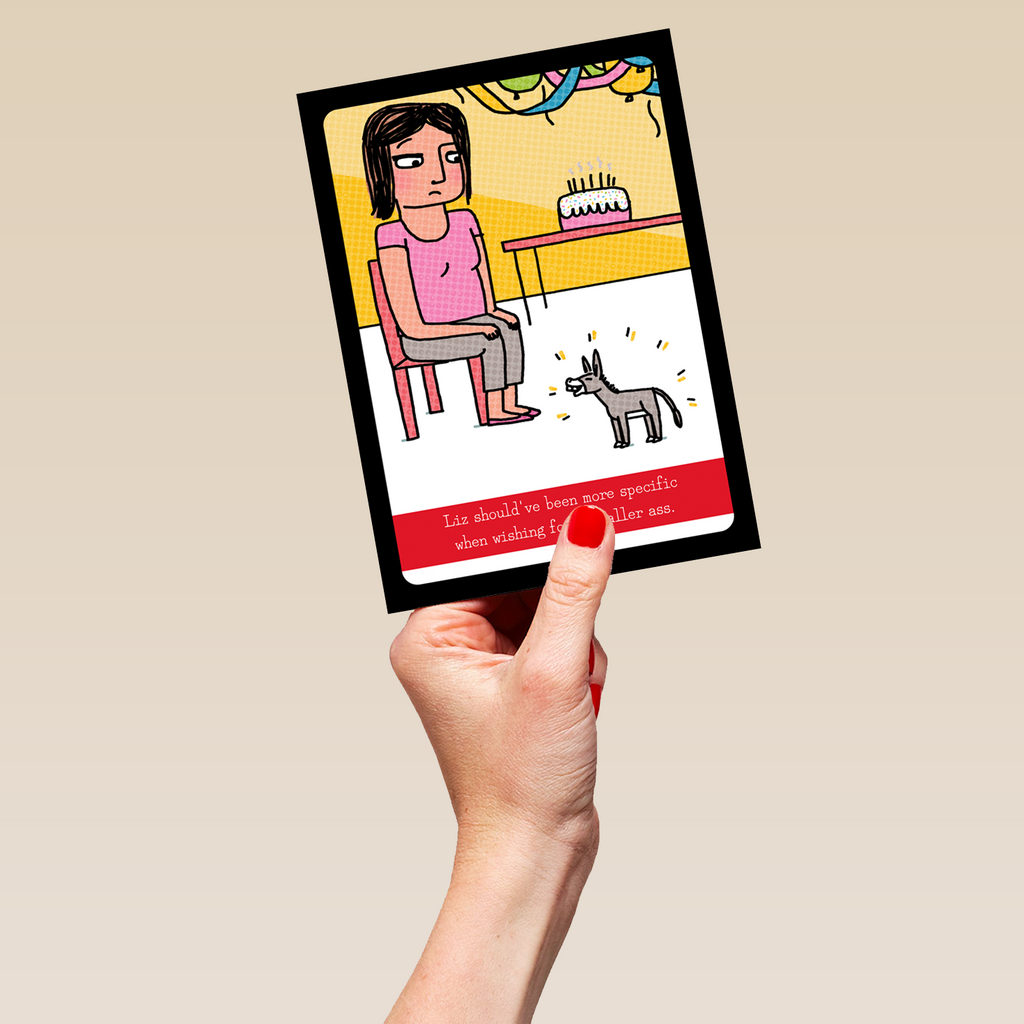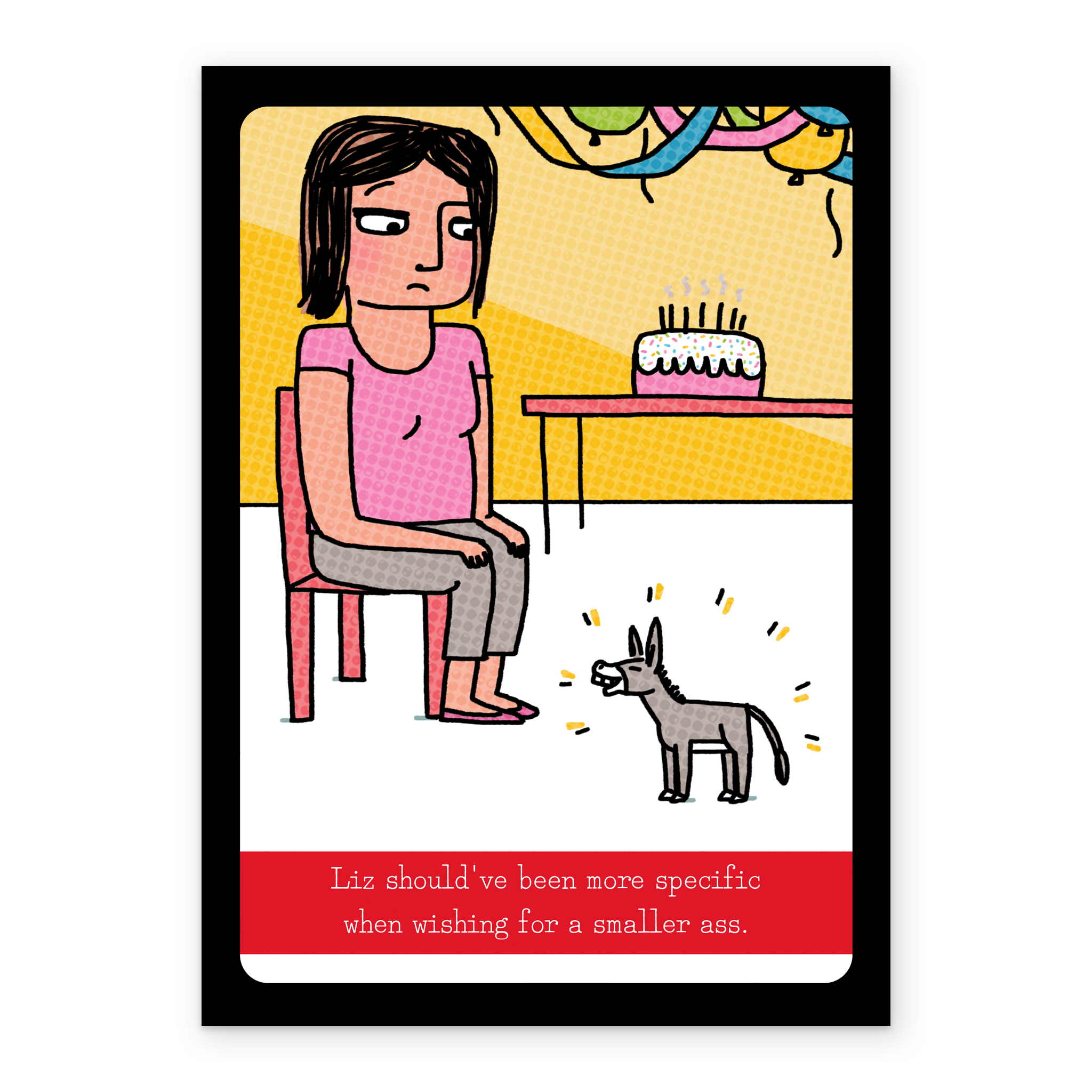 Printed on premium-quality board, this card features a funny illustration of a woman sitting in front of a small donkey, with the message '[NAME] should've been more specific when wishing for a smaller ass.', space to personalise your message, and comes complete with a co-ordinating white envelope.