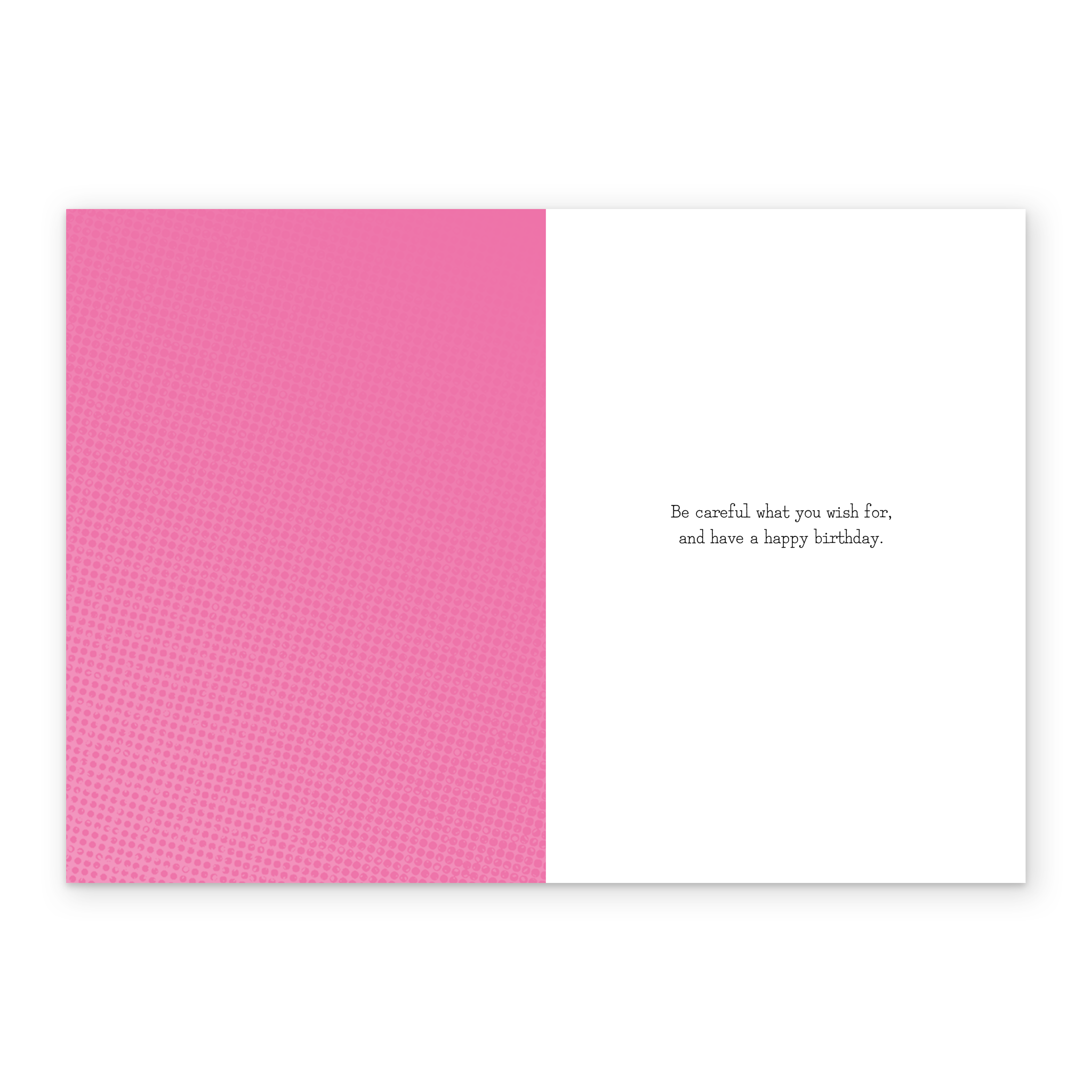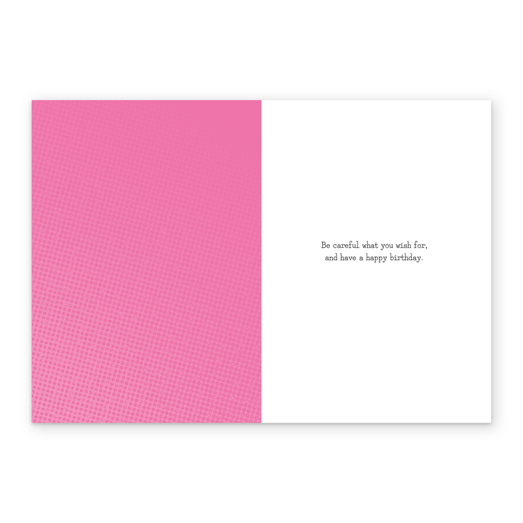 Message inside reads: Be careful what you wish for, and have a happy birthday