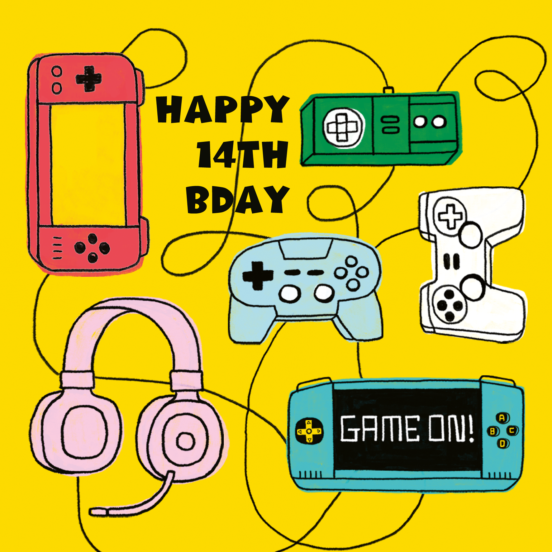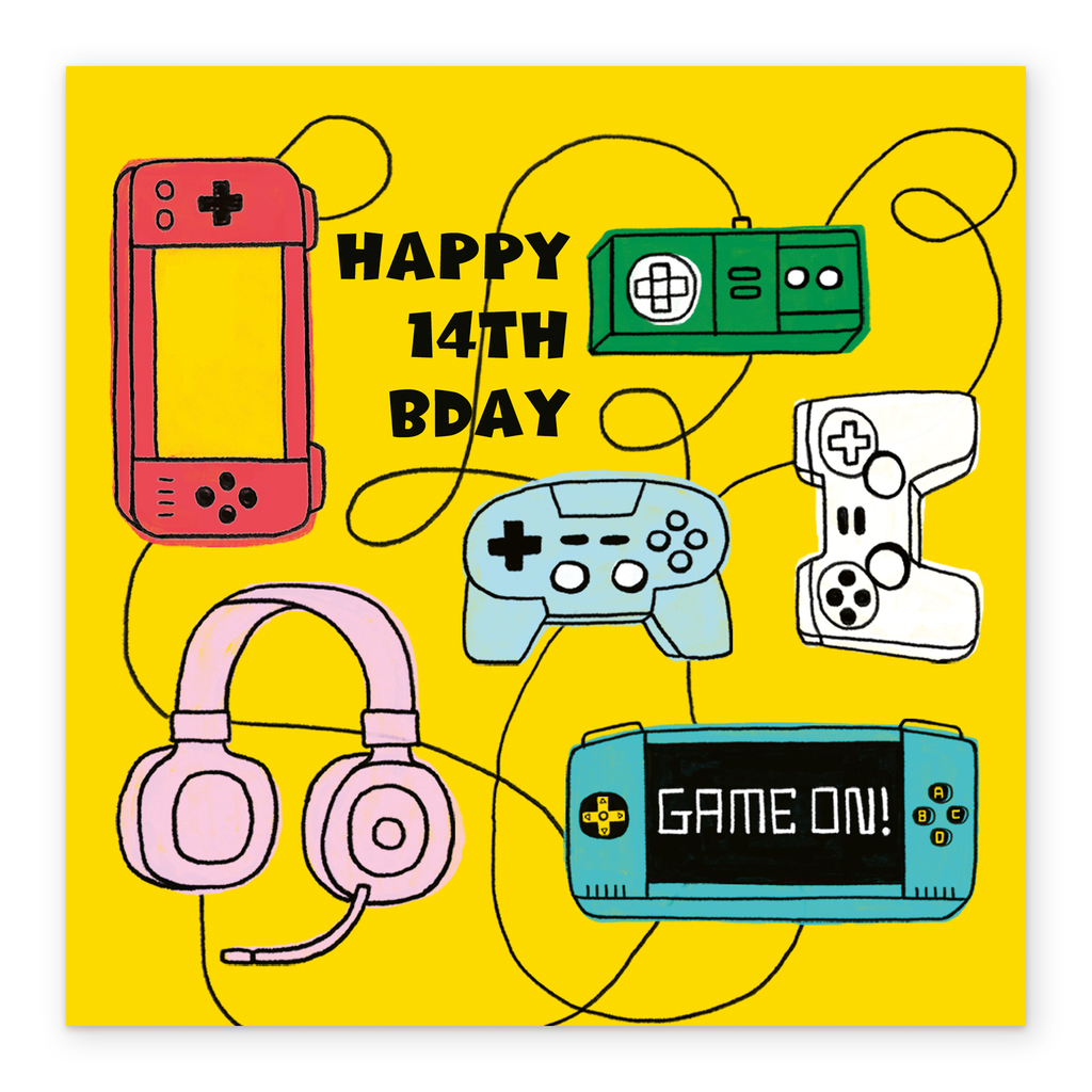 Printed on premium-quality board, this card features different types of gaming controllers, headset and consoles, with the message 'Happy bday', space to personalise the age, and comes complete with a co-ordinating white envelope.