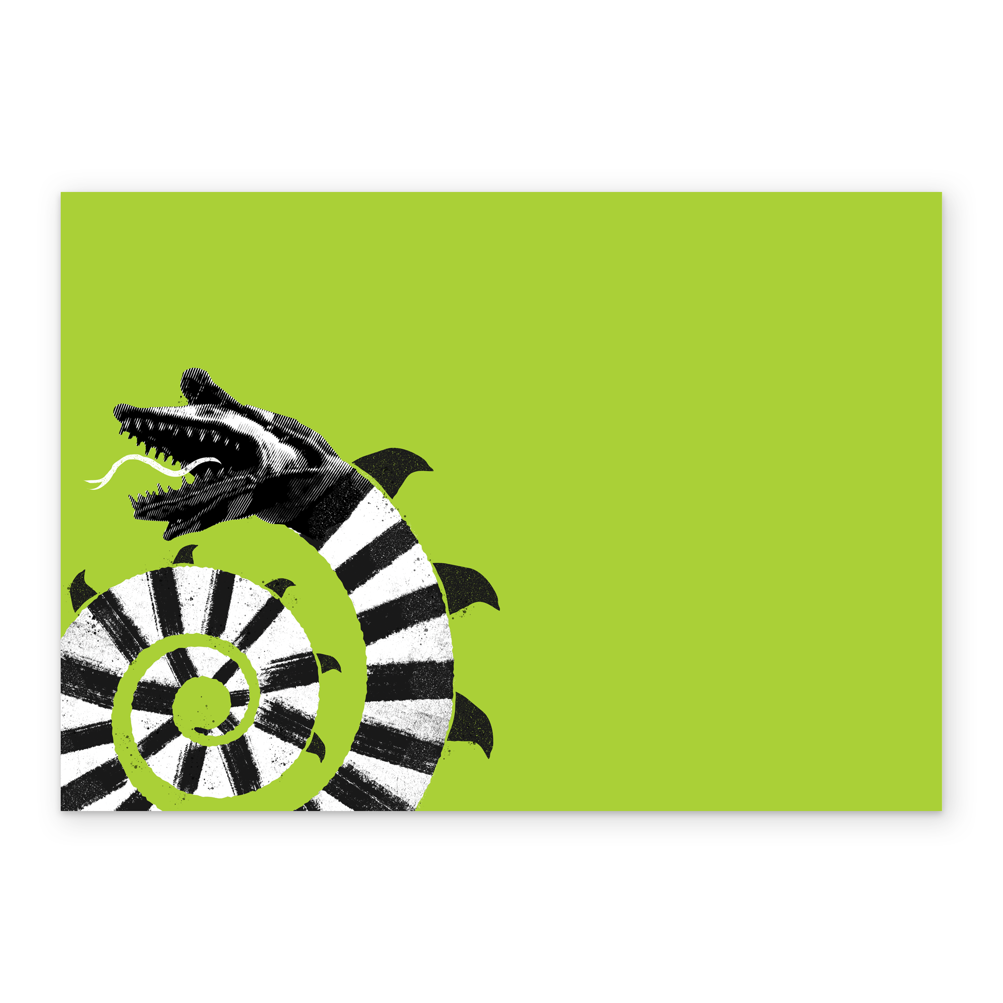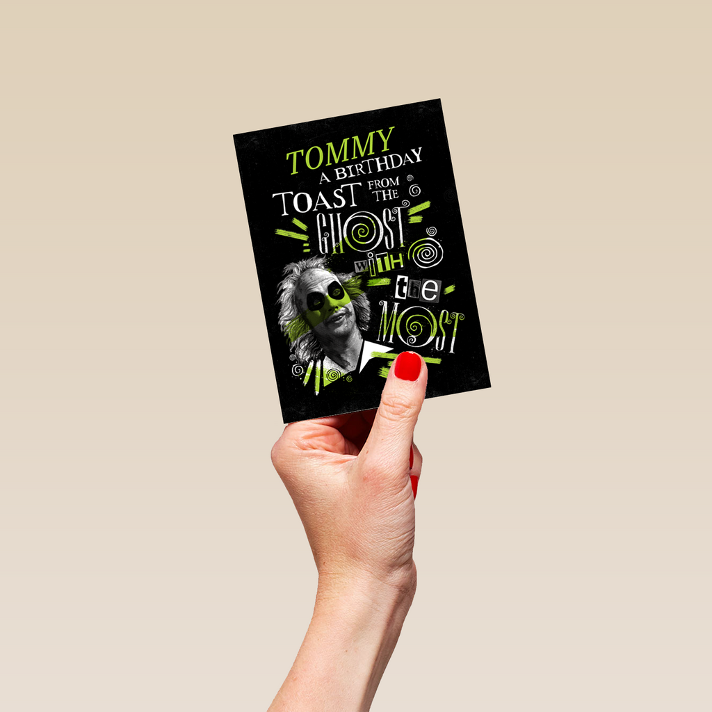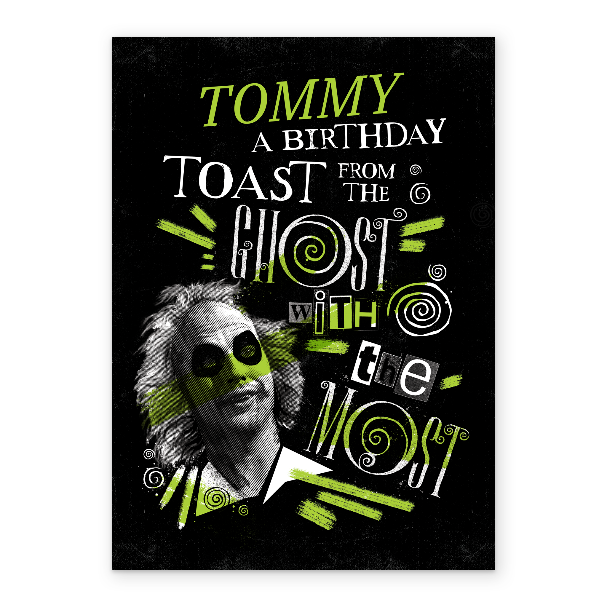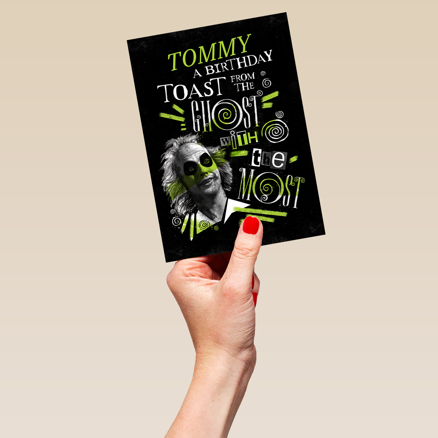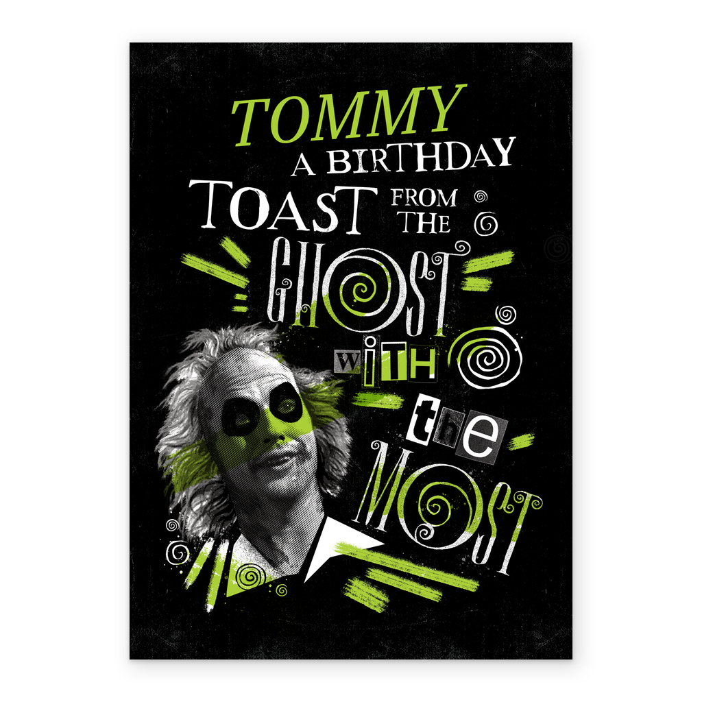 Printed on premium-quality board, this card features Beetlejuice Beetlejuice with bright green highlights, with the message '[Name] A Birthday Toast From The Ghost With The Most', space to personalise a name, and comes complete with a co-ordinating white envelope.
