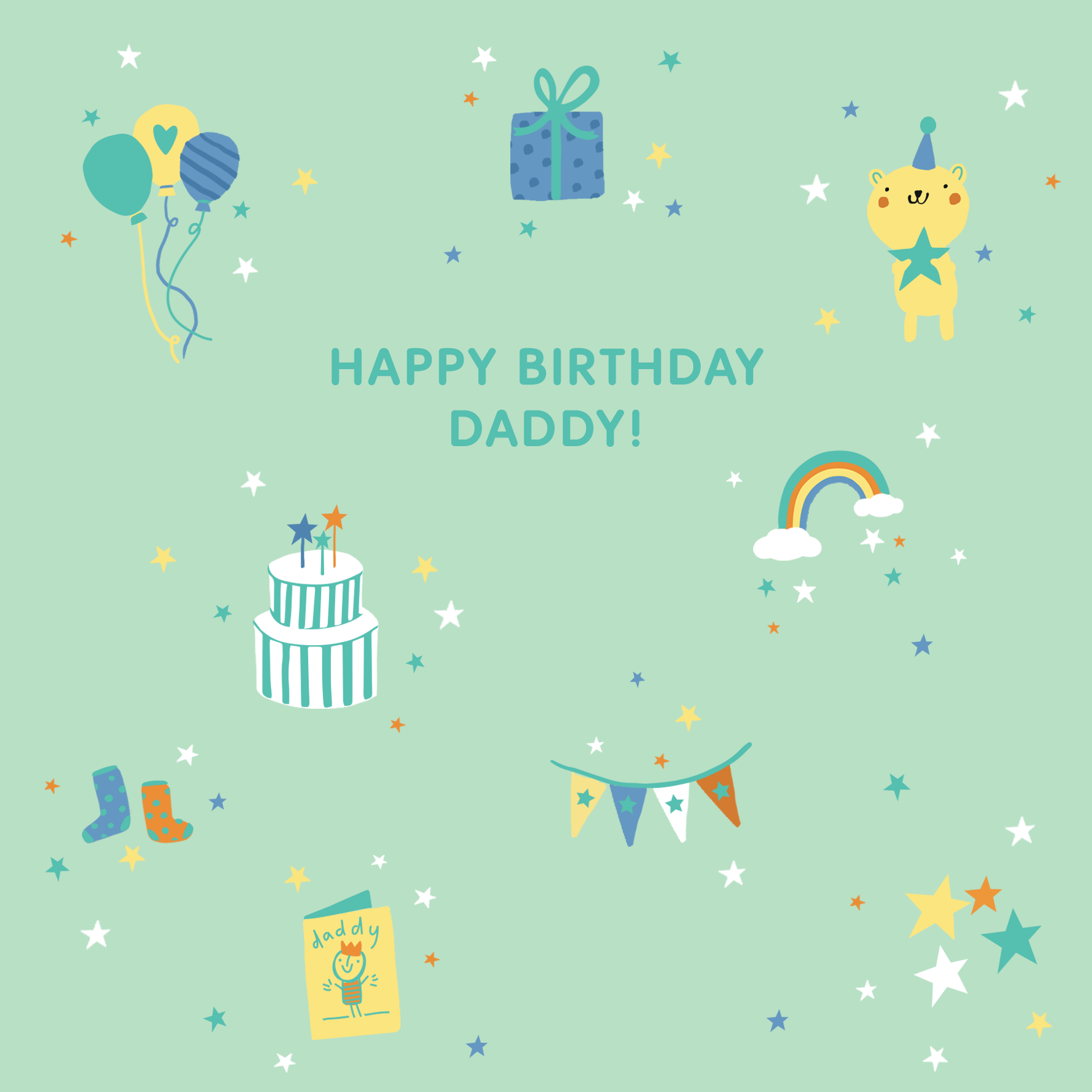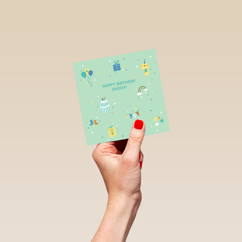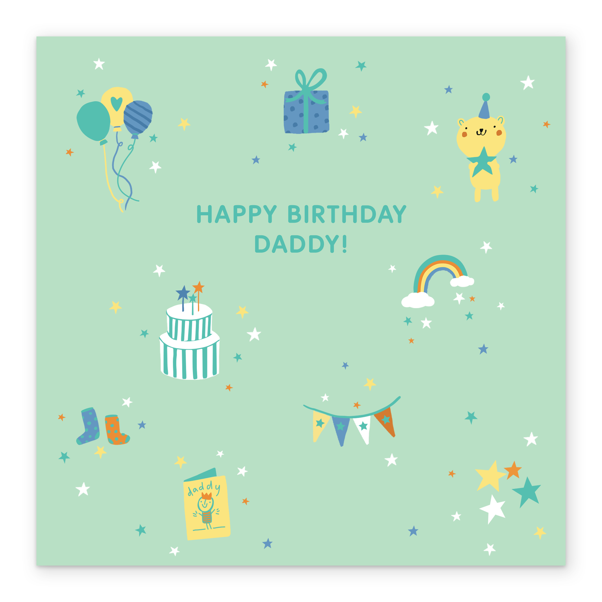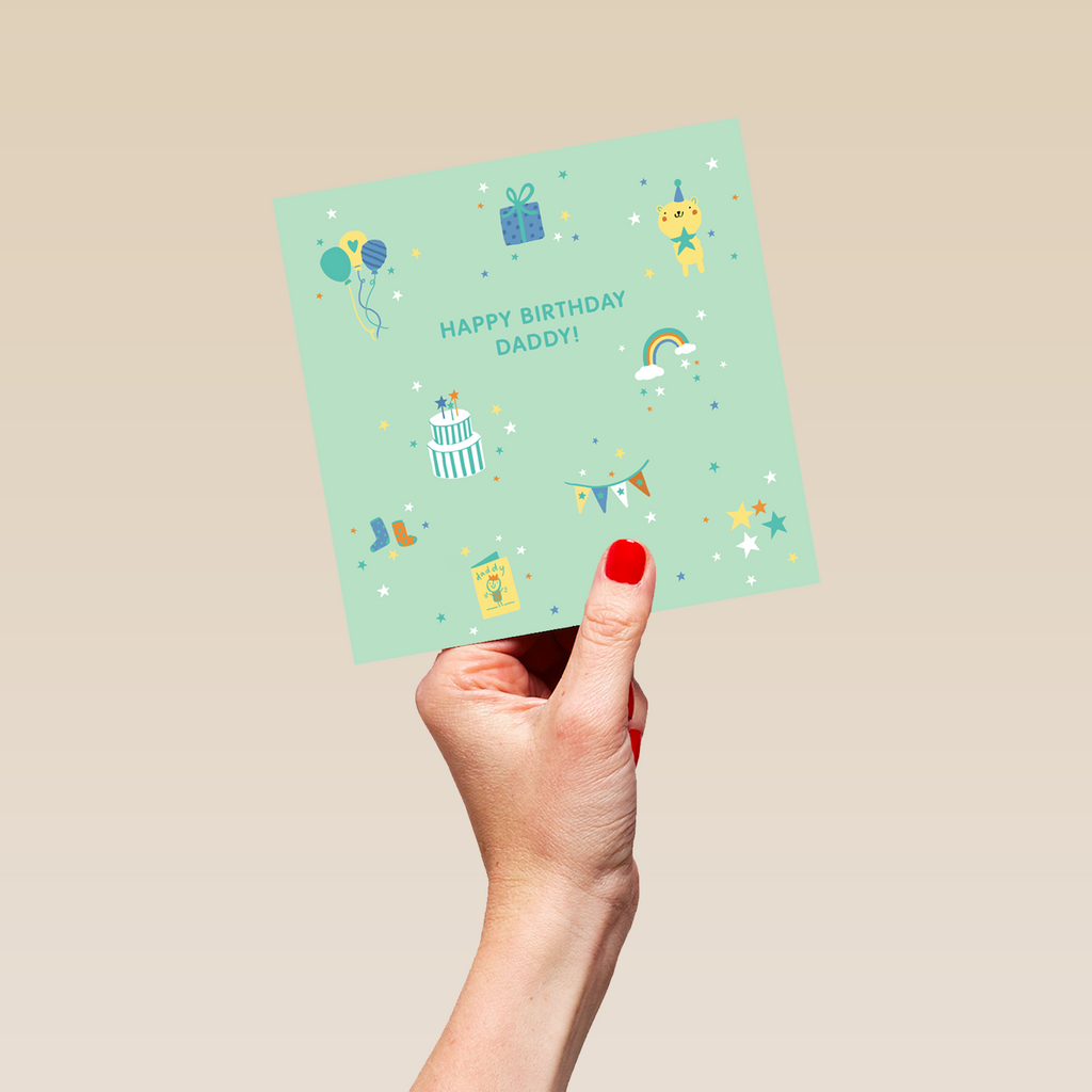 Printed on premium-quality board, this card features cute icons on a green background, including balloons, gift box, teddy, cake, rainbow, stars, banner and more, with the message 'Happy Birthday, Daddy!', space to personalise your message, and comes complete with a co-ordinating white envelope.