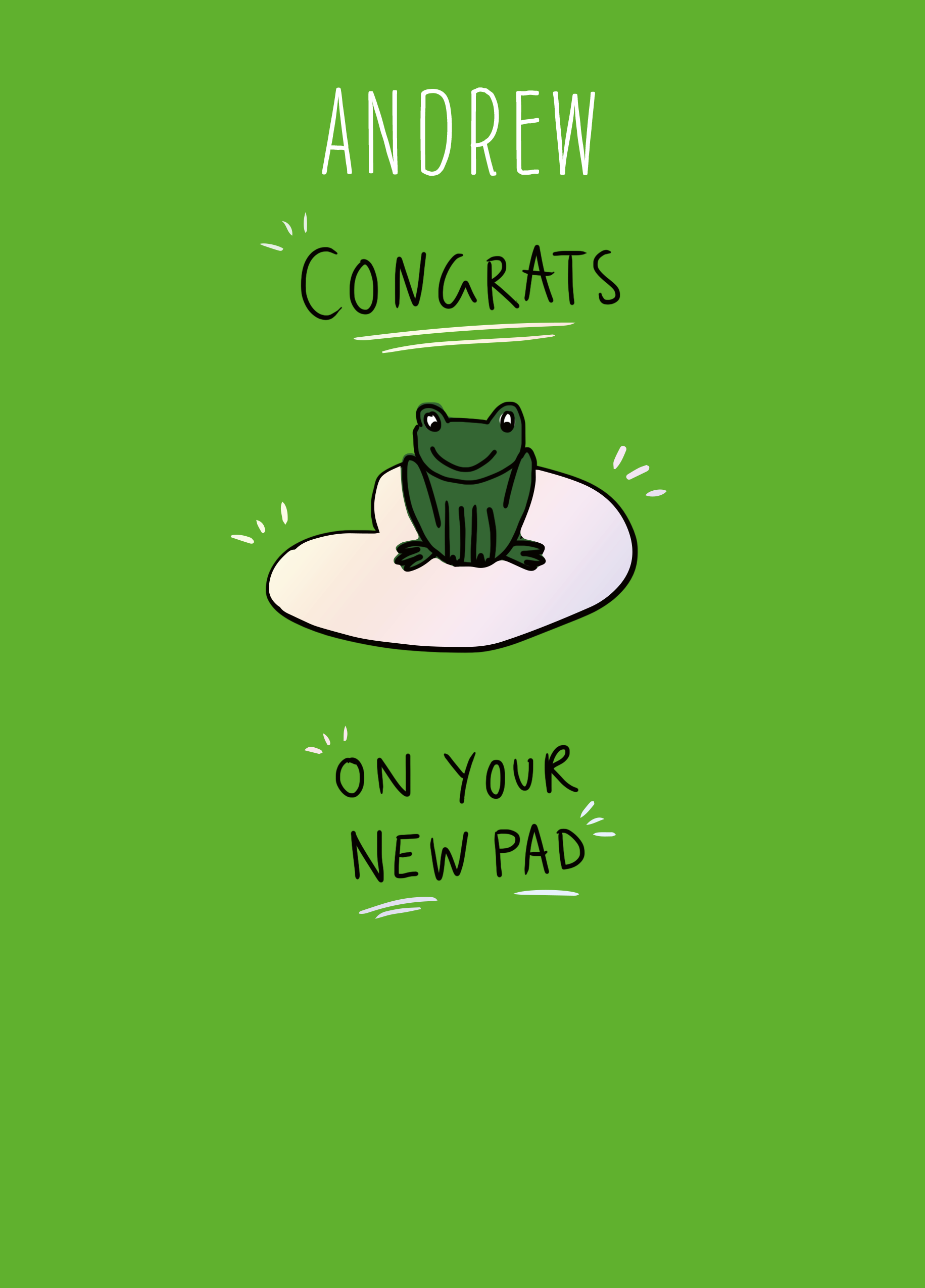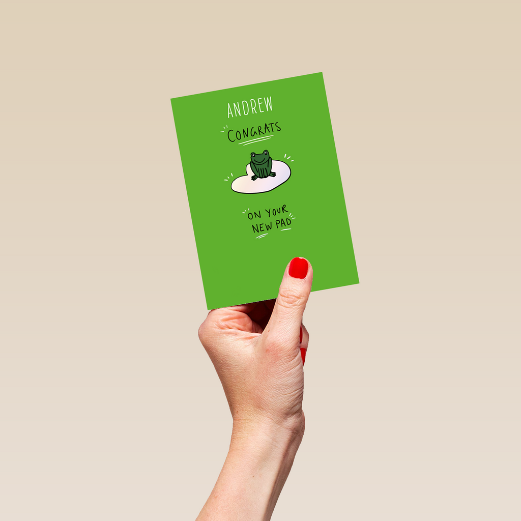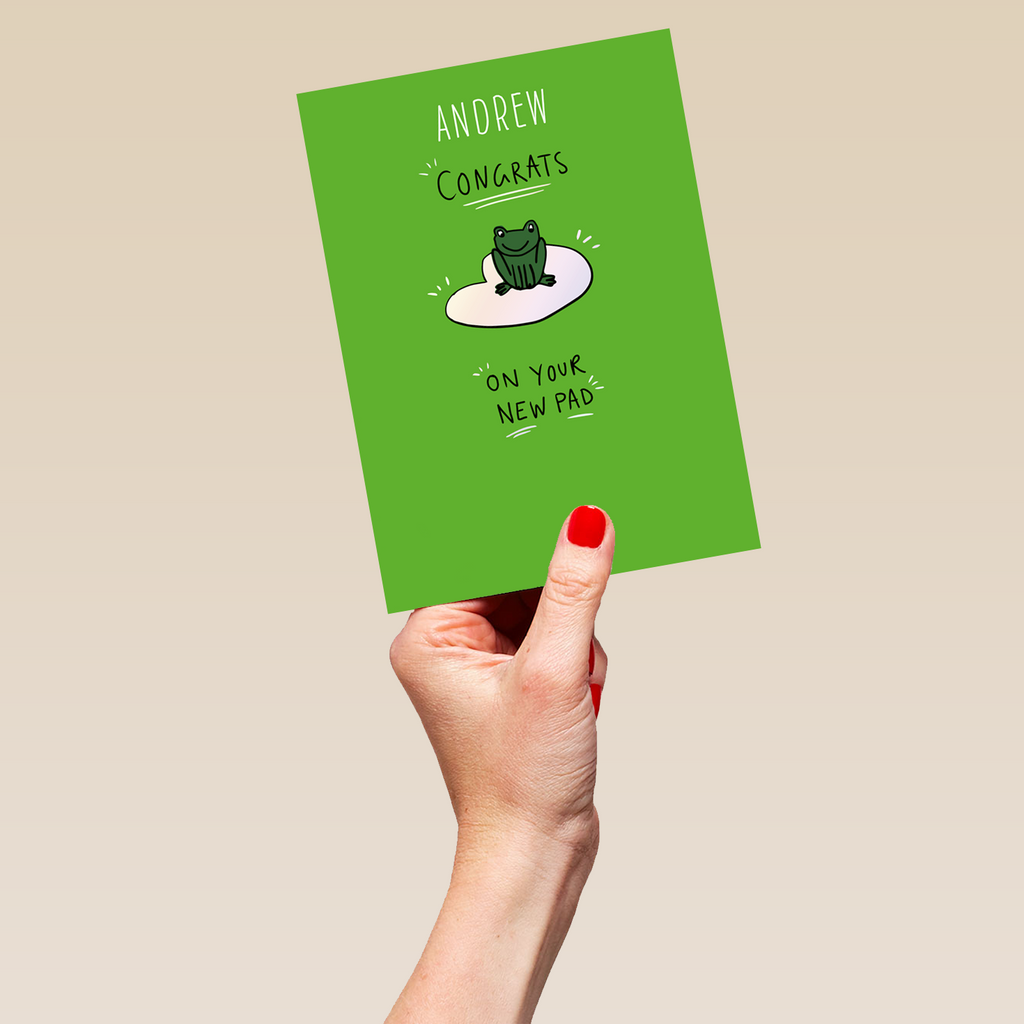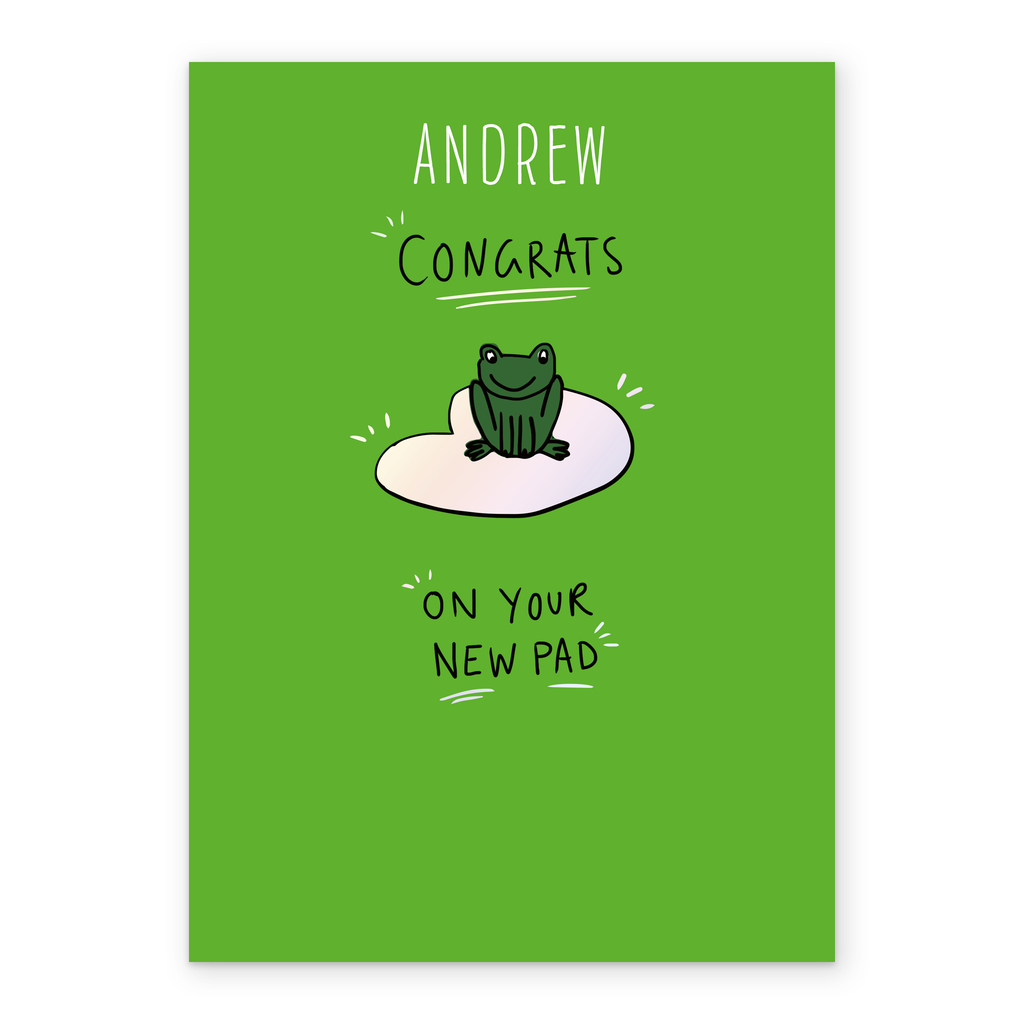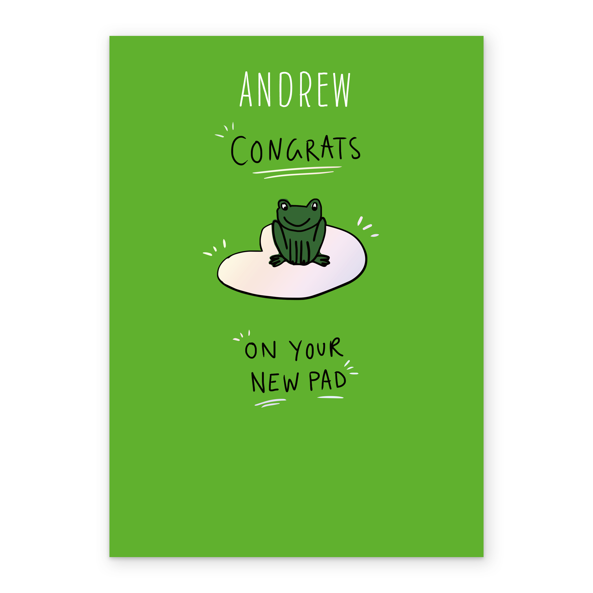 Printed on premium-quality board, this card features a green background with a frog on a Lilypad, with the message '[NAME] Congrats On Your New Pad', space to personalise a name, and comes complete with a co-ordinating white envelope.