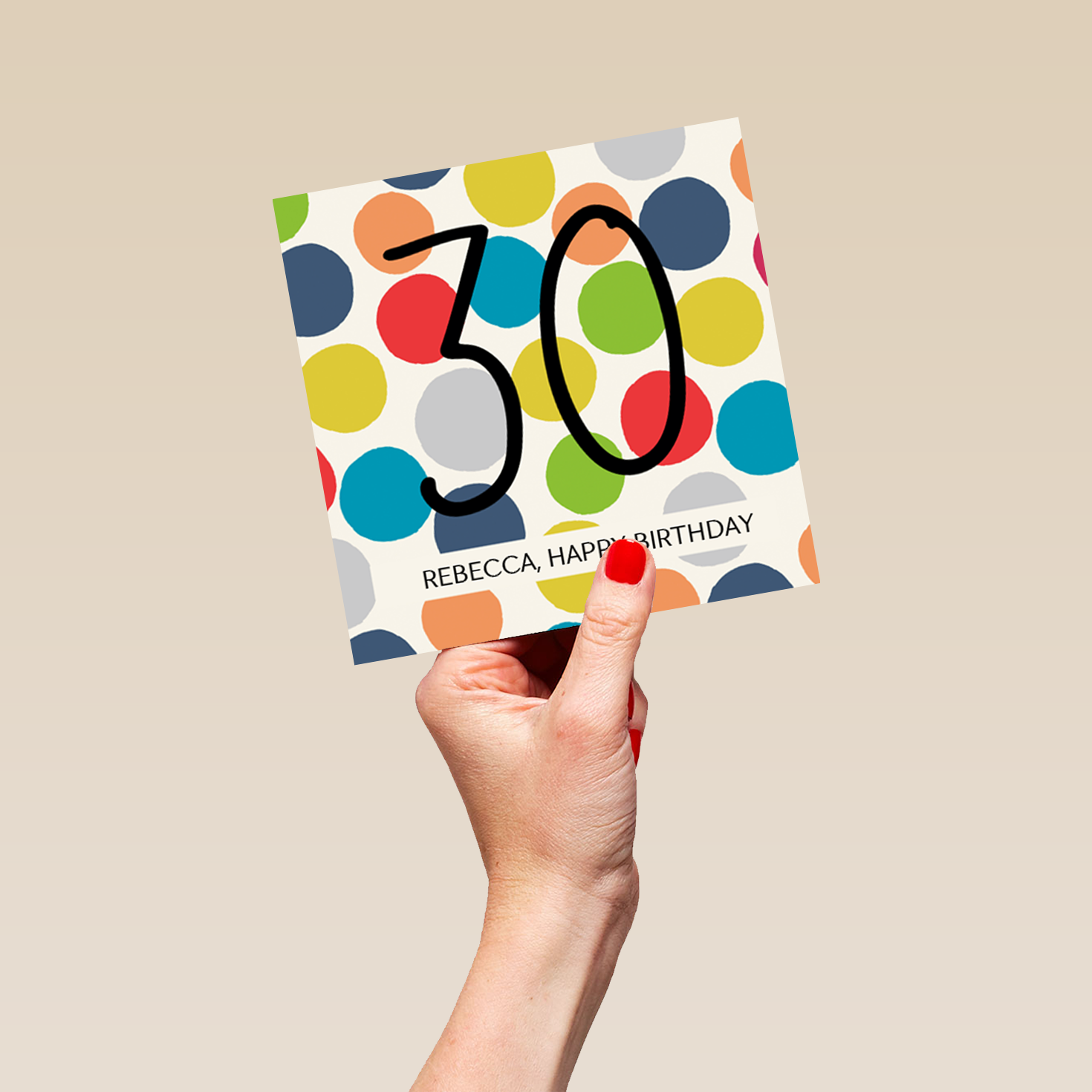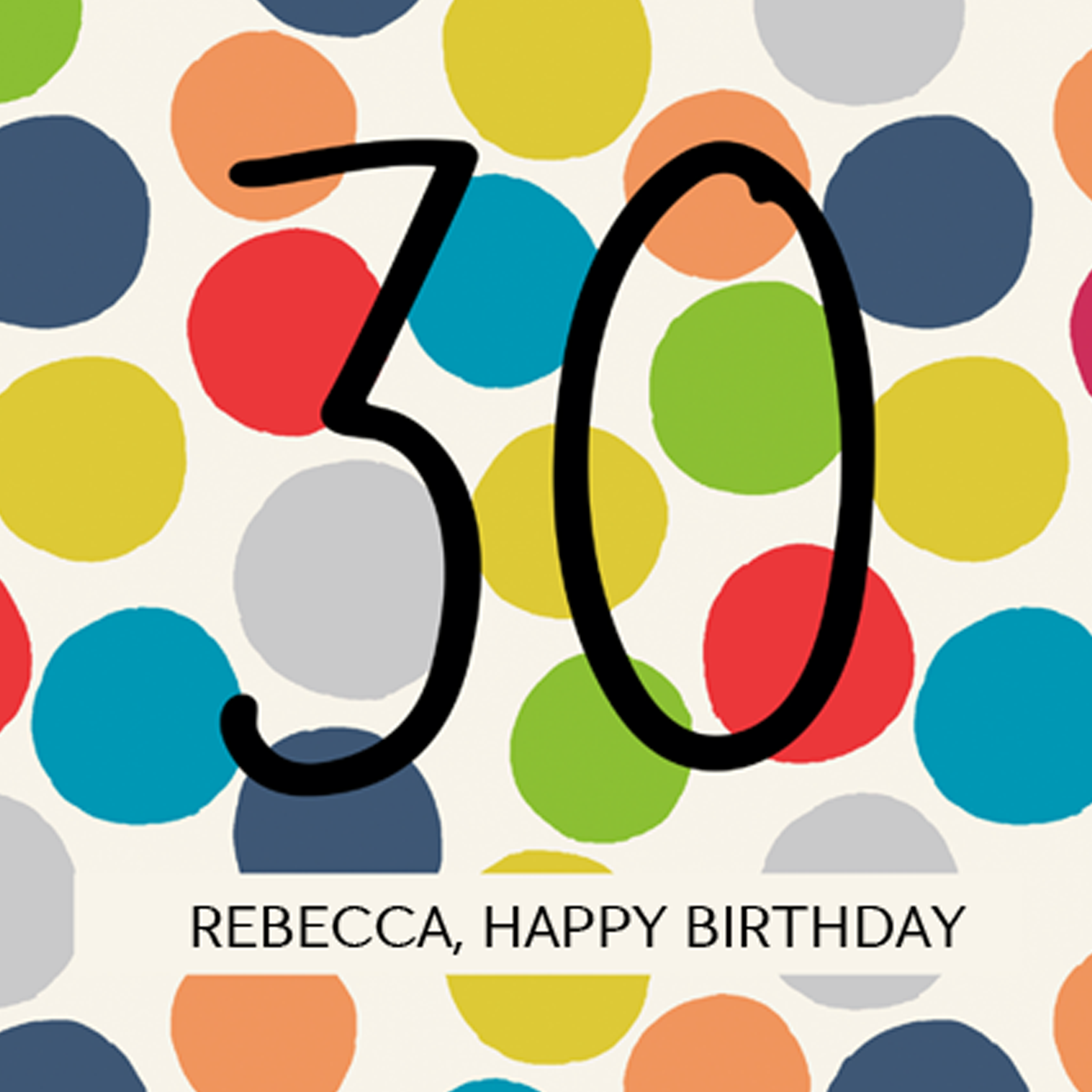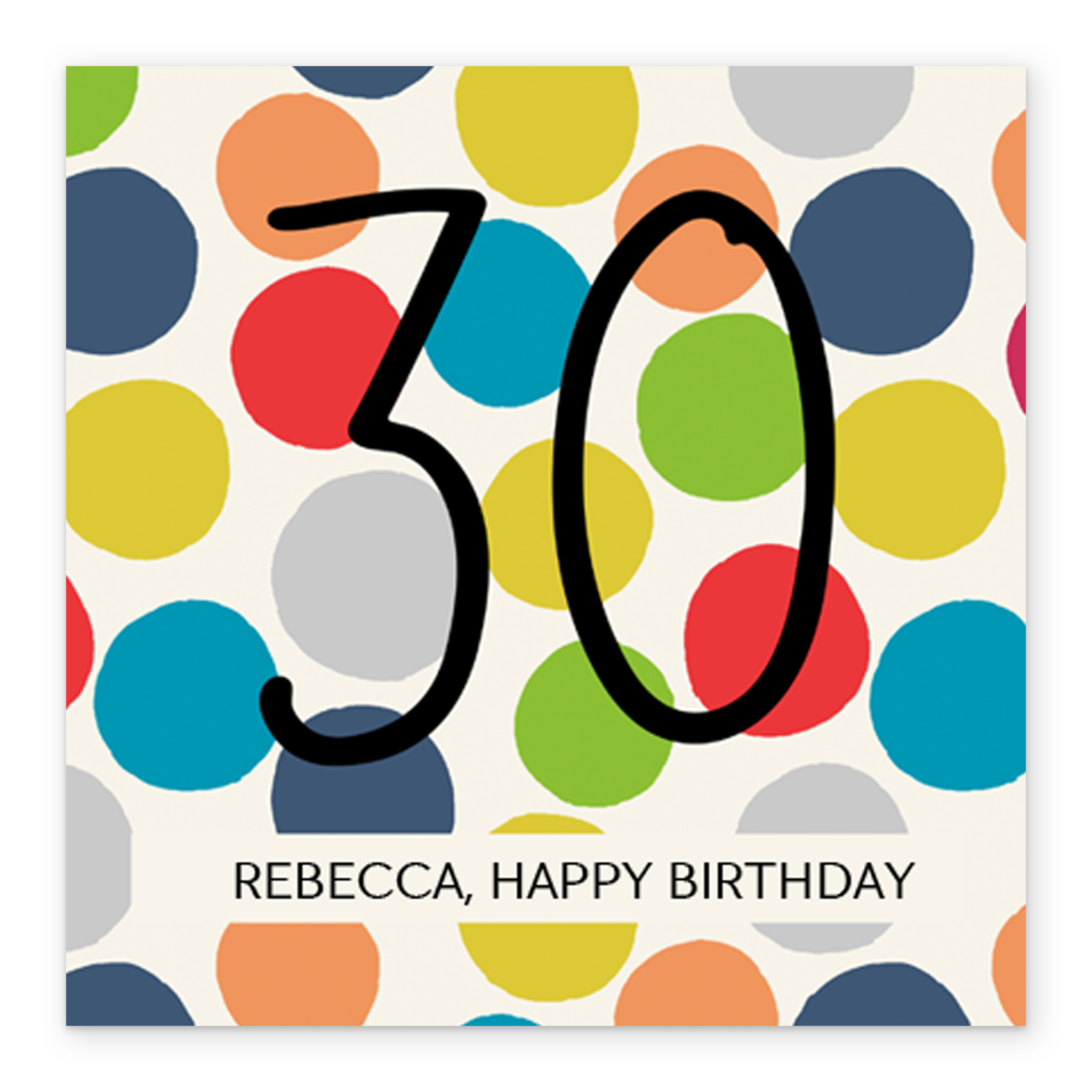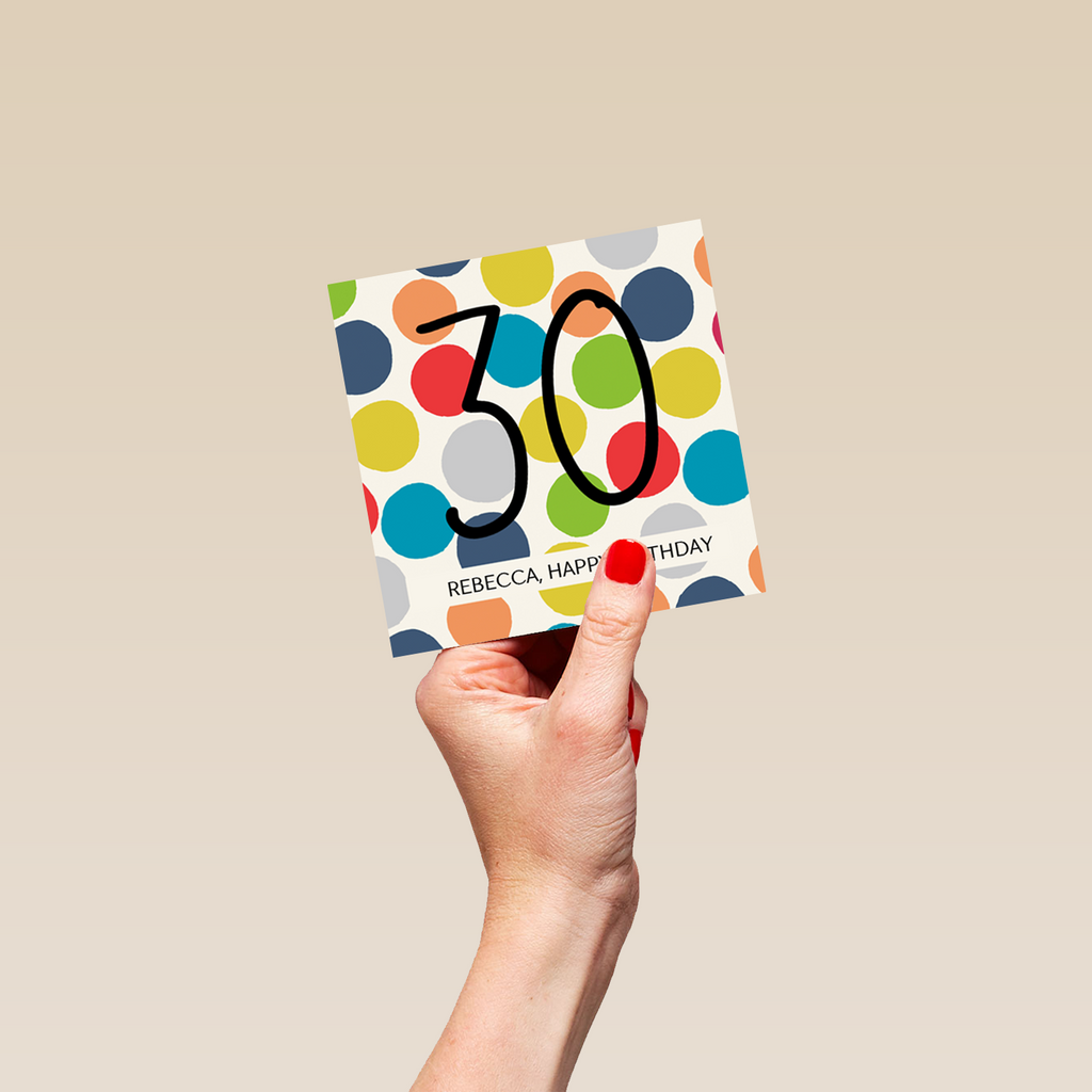 Printed on premium-quality board, this card features a large number thirty in contemporary black text, and multicoloured polka dots on a white background, with the message 'Happy Birthday', space to personalise your message, and comes complete with a co-ordinating white envelope.