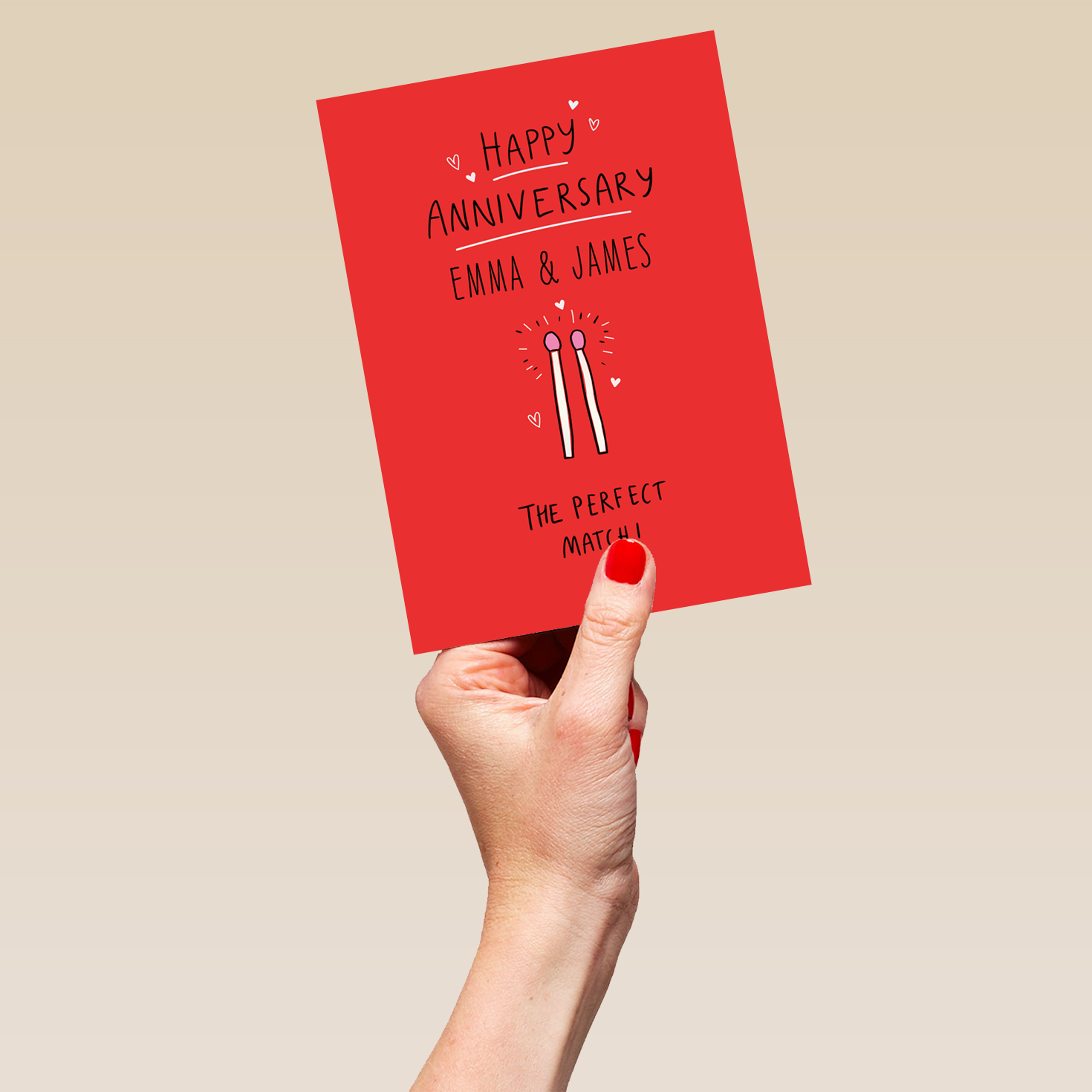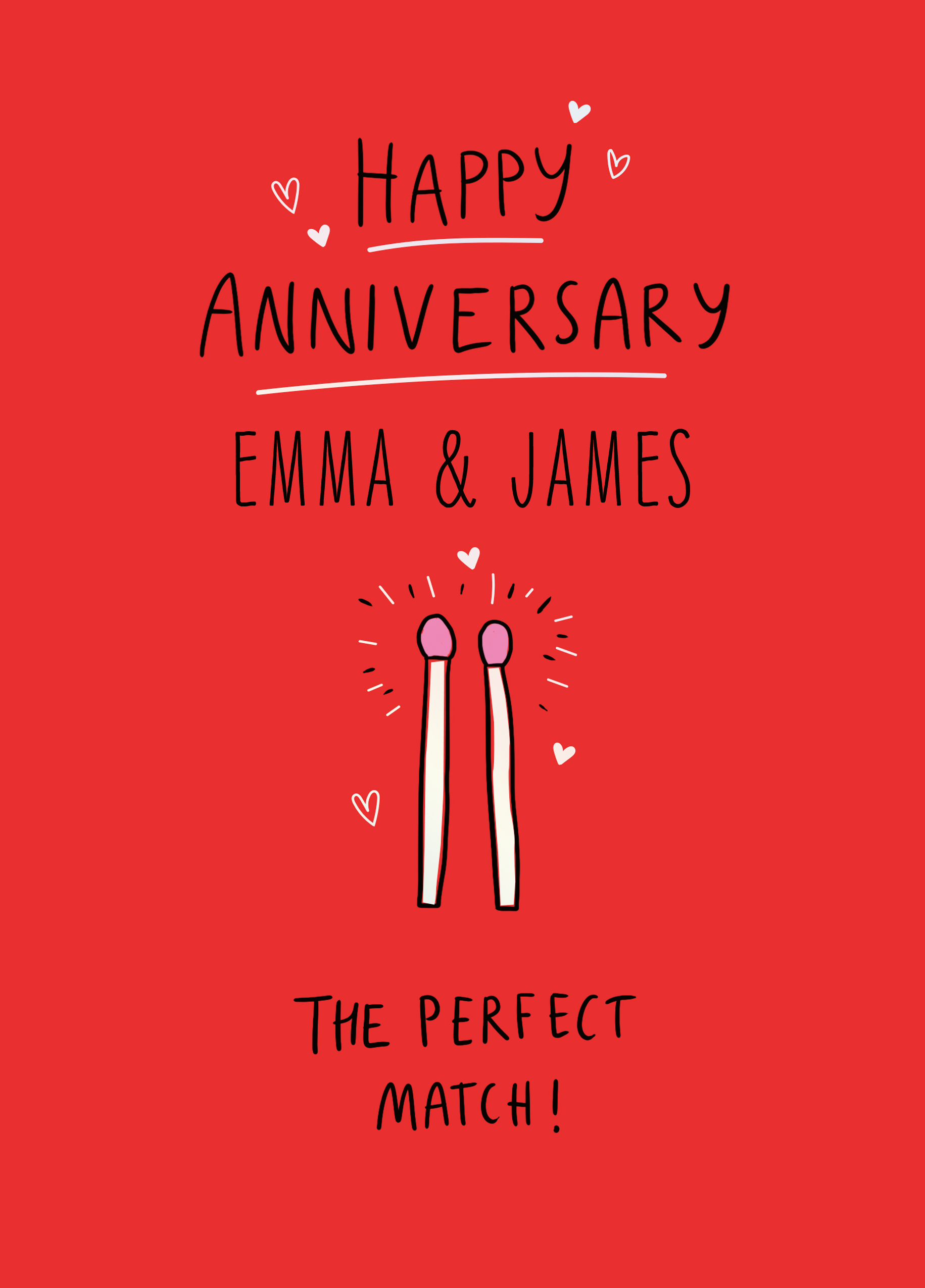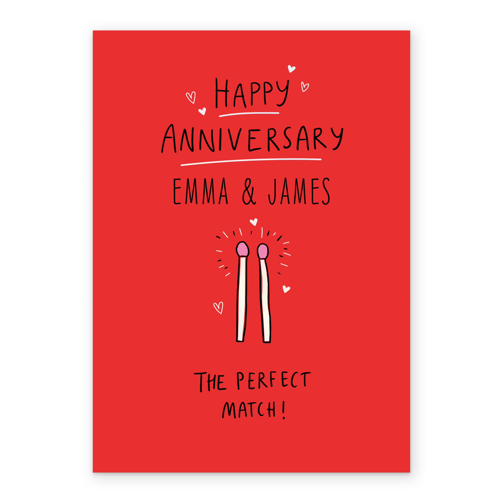 Printed on premium-quality board, this card features two matchsticks together with hearts, with the message 'Happy anniversary, the perfect match!', space to personalise a name, and comes complete with a co-ordinating white envelope.