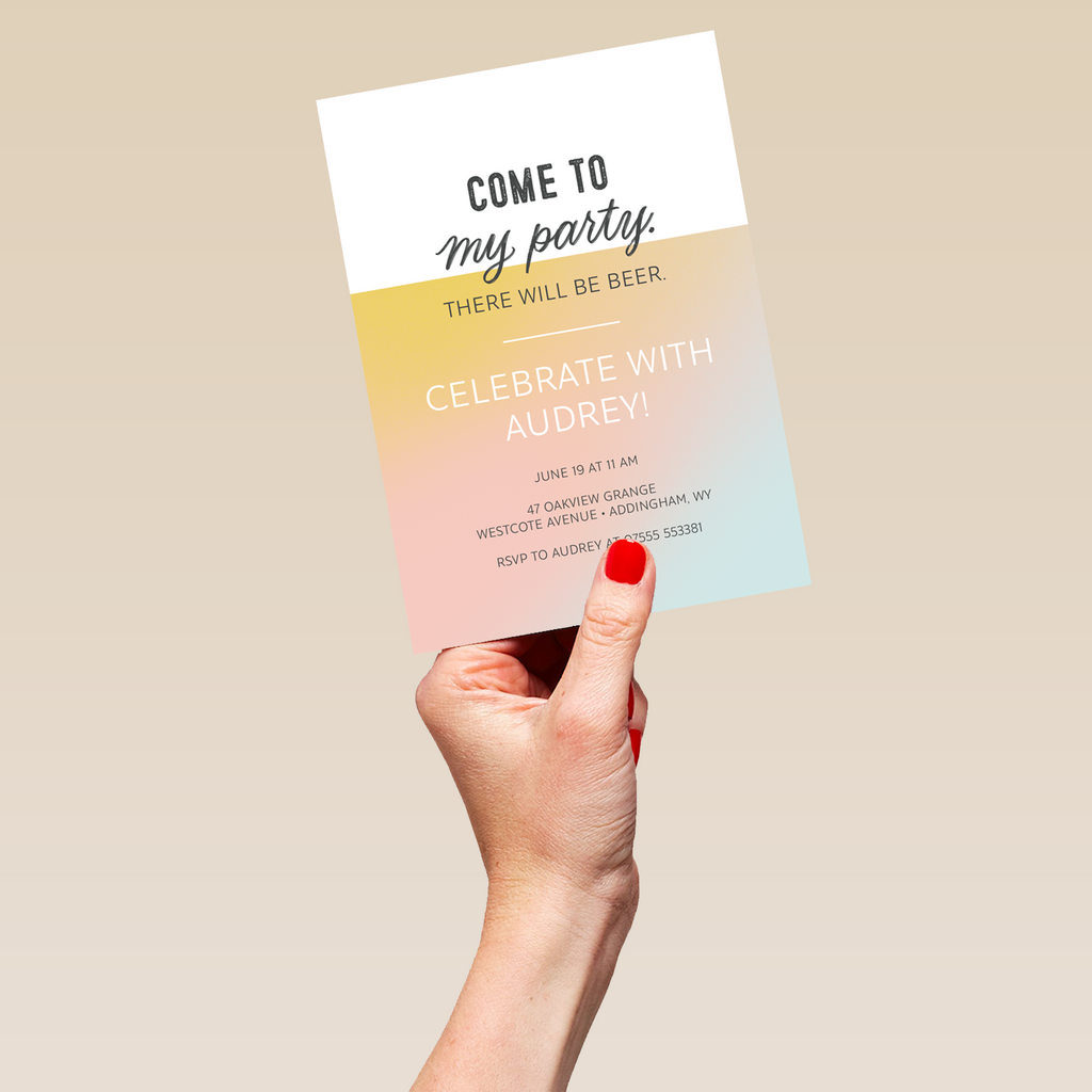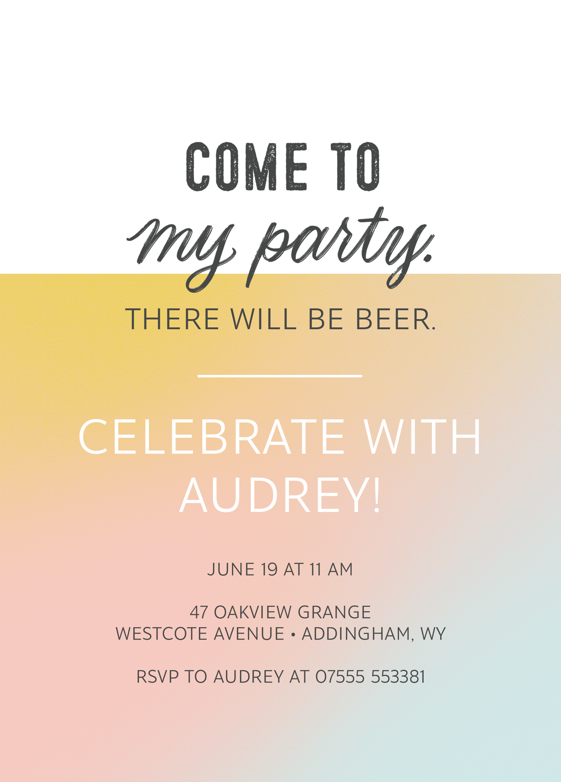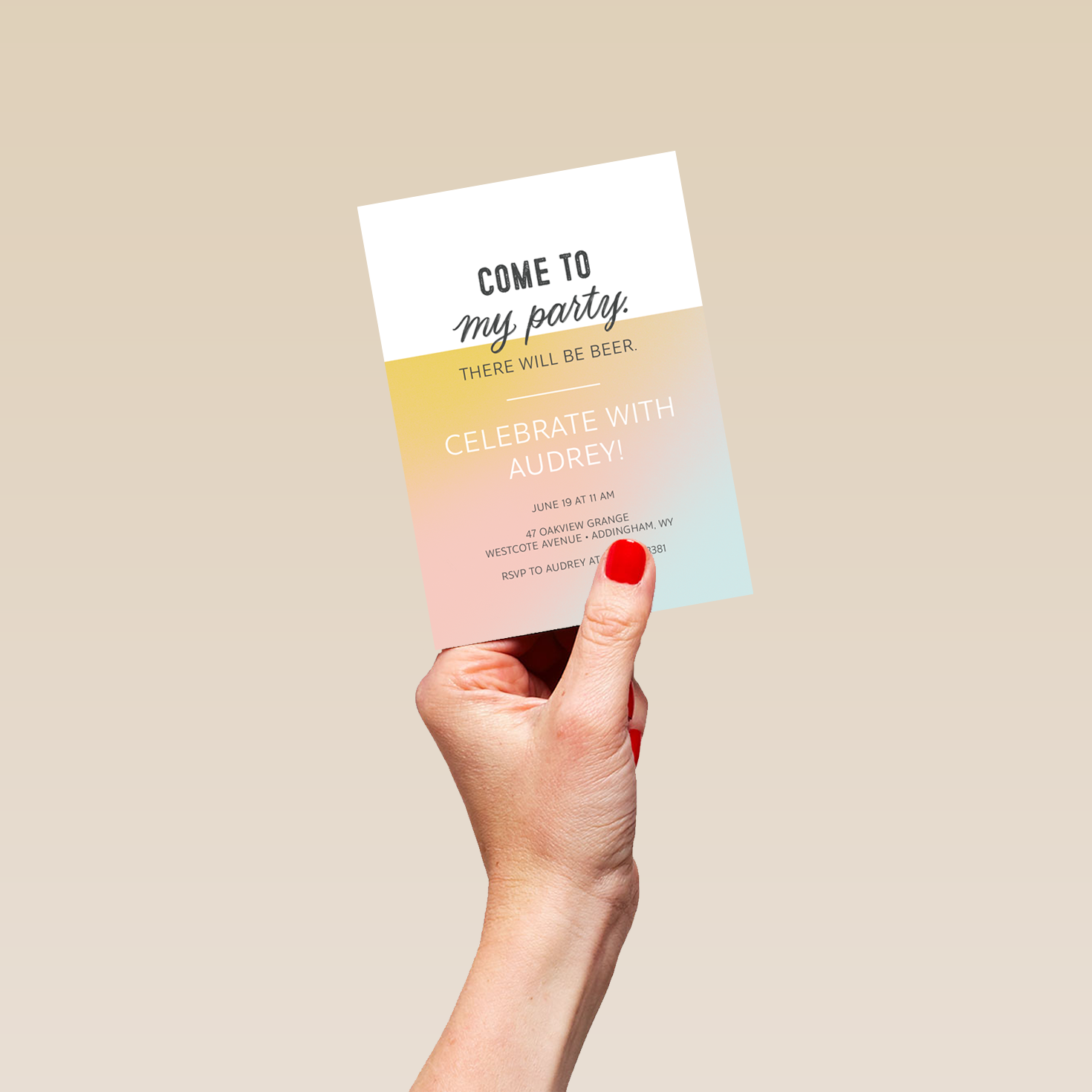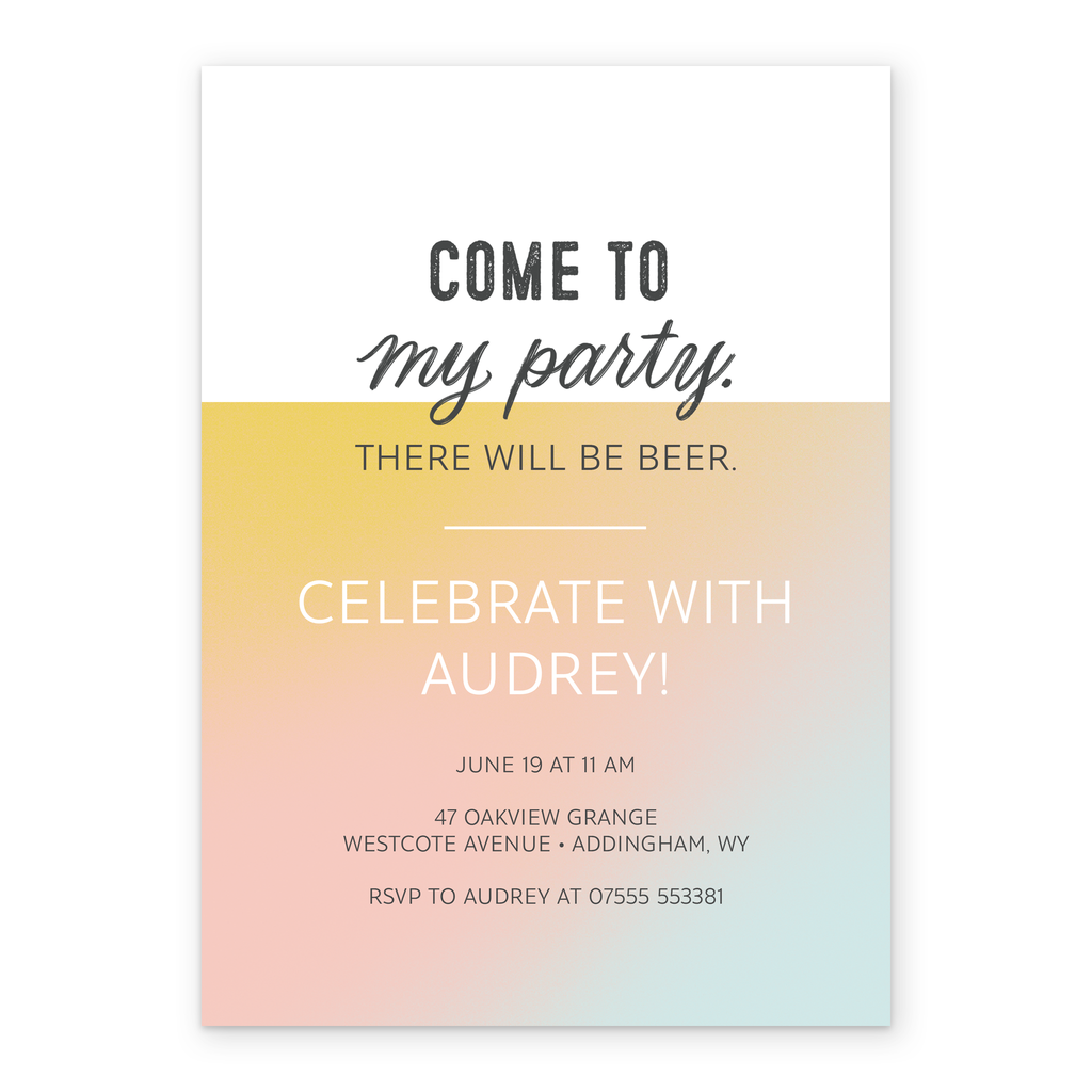 Printed on premium-quality board, this card features editable space for a date, address and contact details, a colourful Ombre box, with the message 'Come to my party. There will be beer. Celebrate with [Name]!', space to personalise a name, and comes complete with a co-ordinating white envelope.