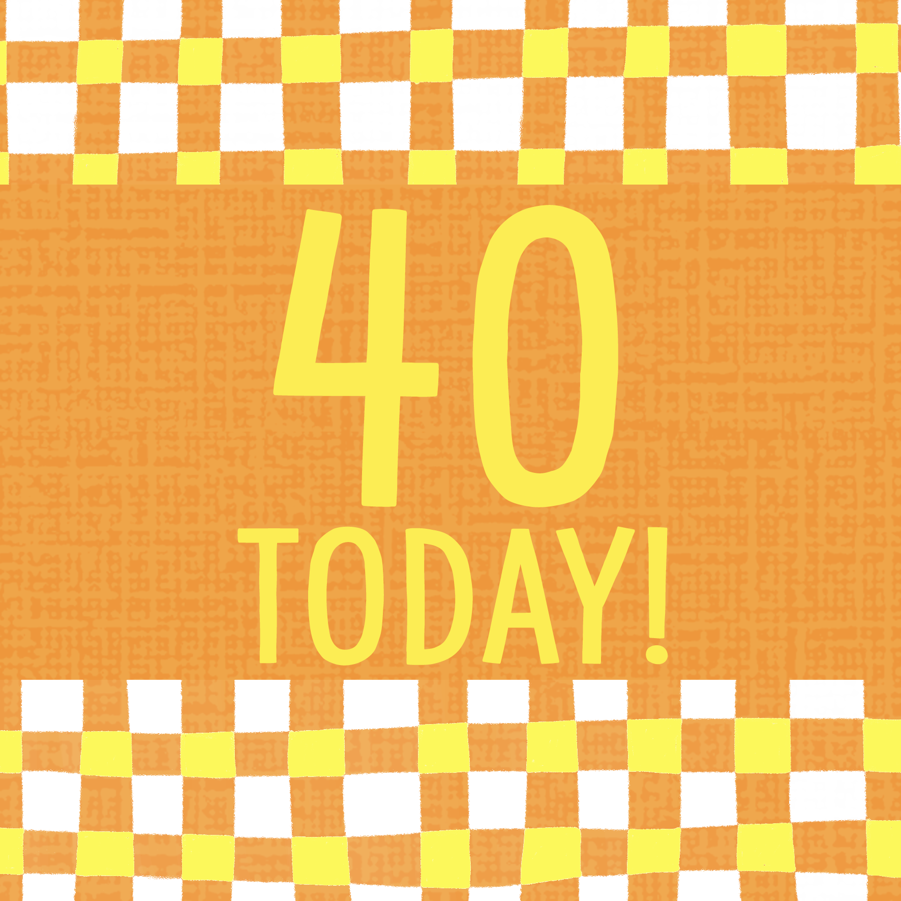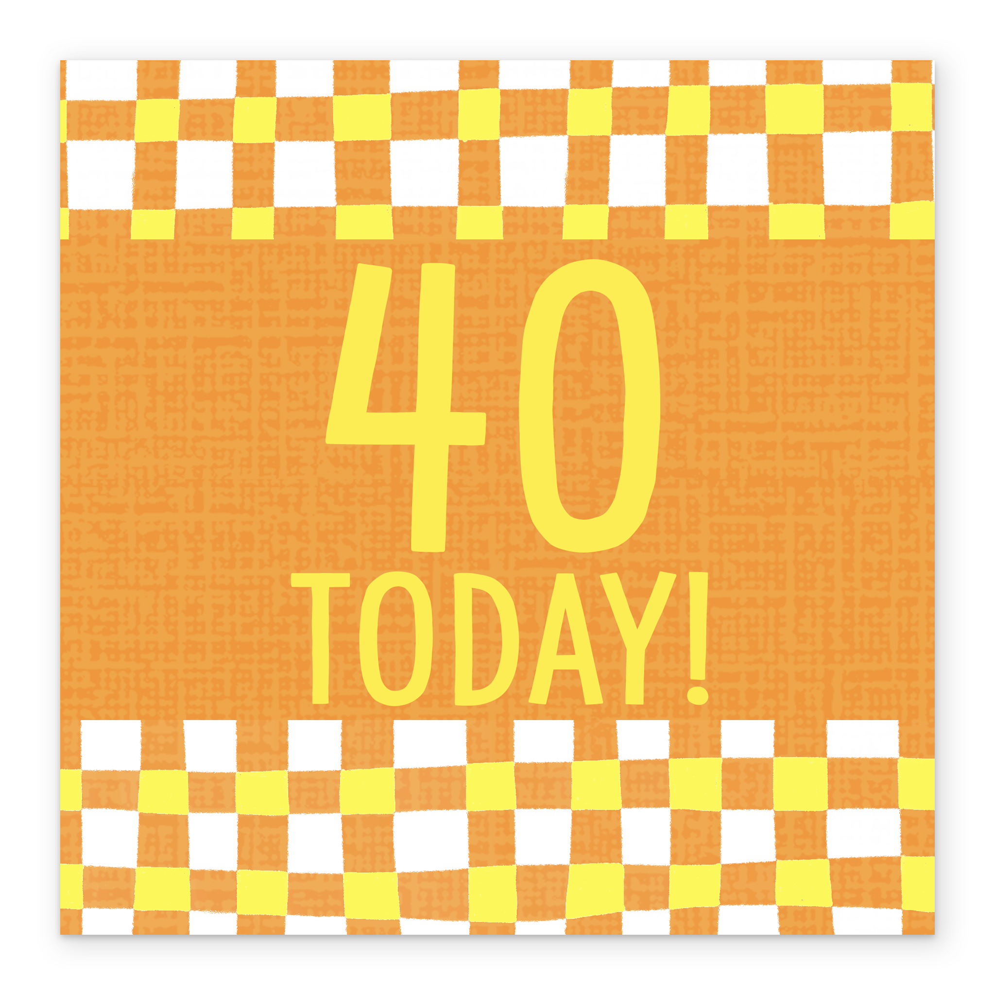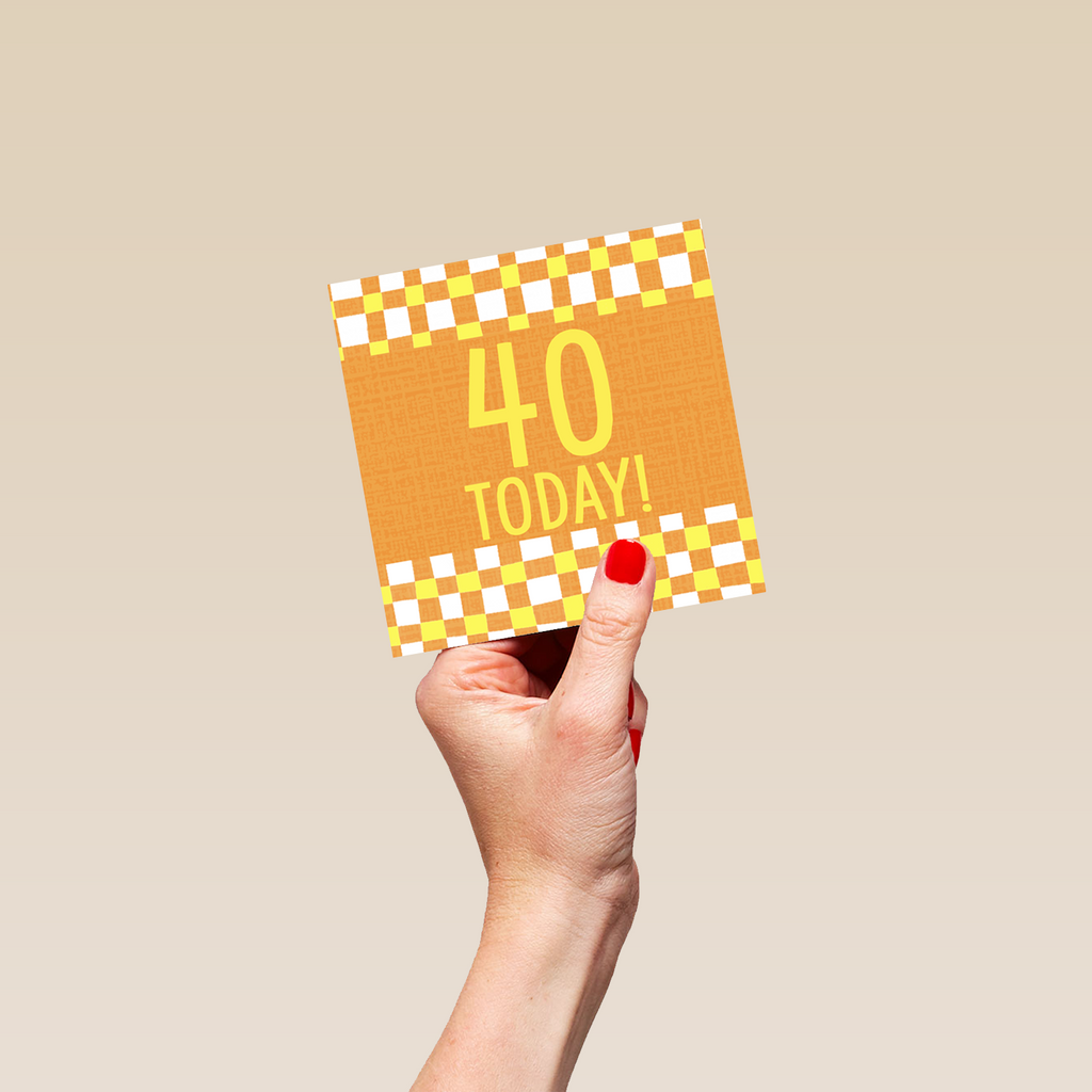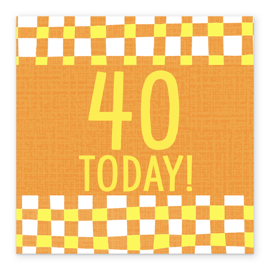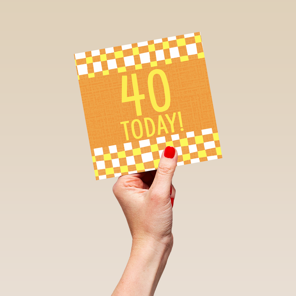 Printed on premium-quality board, this card features orange and yellow checks with an orange block, with the message '40 Today!', space to personalise the age, and comes complete with a co-ordinating white envelope.
