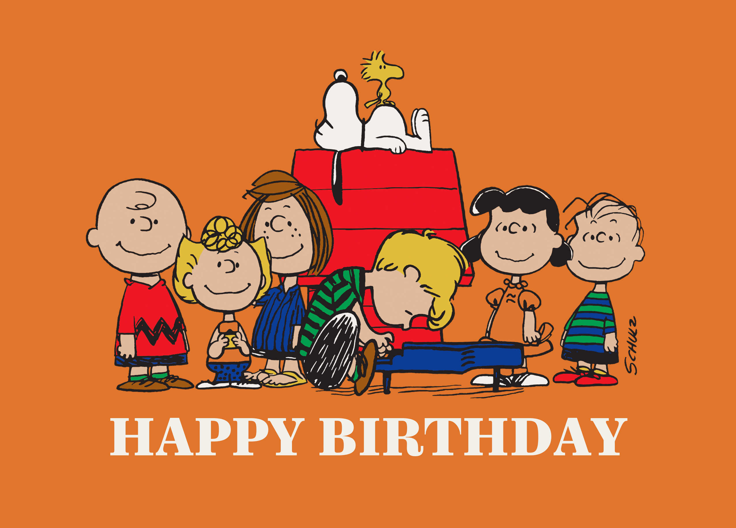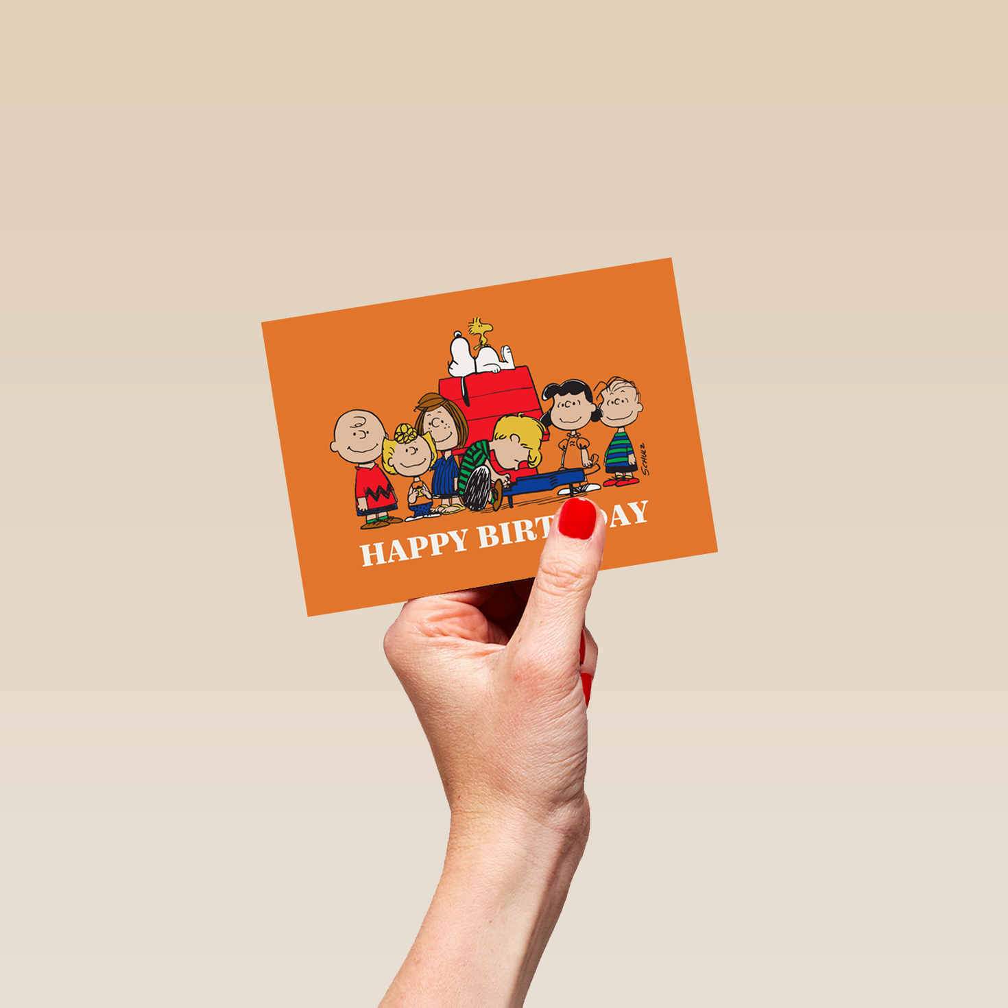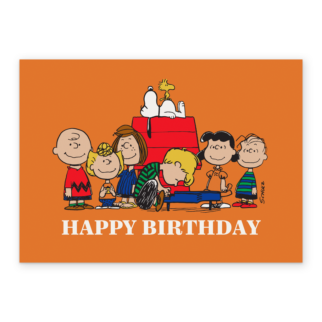 Printed on premium-quality board, this card features the PEANUTS™ Gang smiling with SNOOPY and WOOODSTOCK on top of the dog house. Characters include Charlie Brown, Sally Brown, Peppermint Patty, Schroeder, Lucy van Pelt and Linus van Pelt., with the message 'Happy Birthday', space to personalise your message, and comes complete with a co-ordinating white envelope.