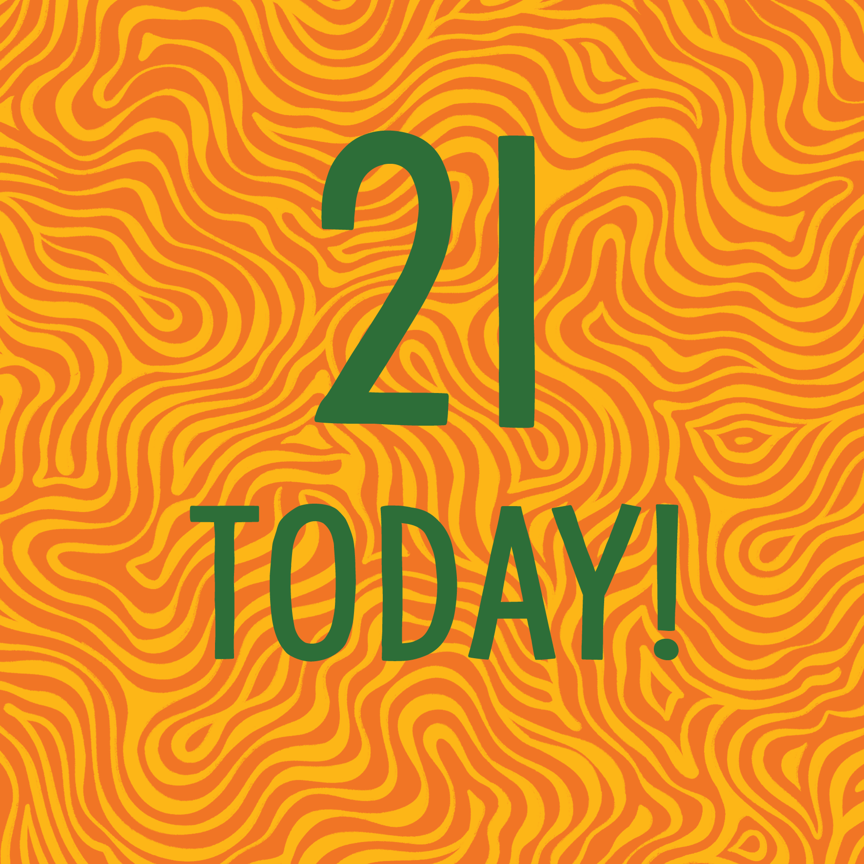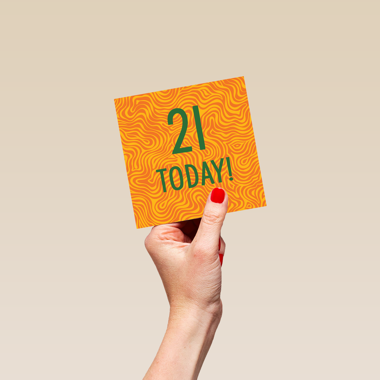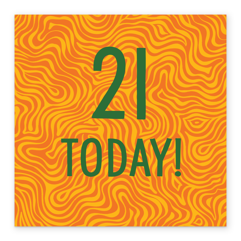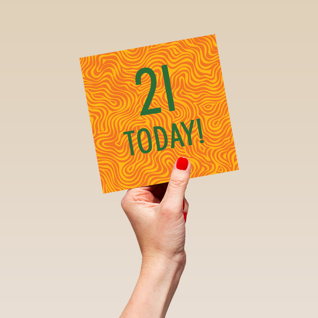 Printed on premium-quality board, this card features an orange background with squiggles, with the message '21 Today!', space to personalise the age, and comes complete with a co-ordinating white envelope.