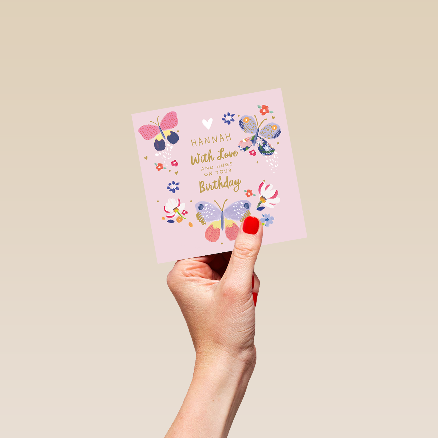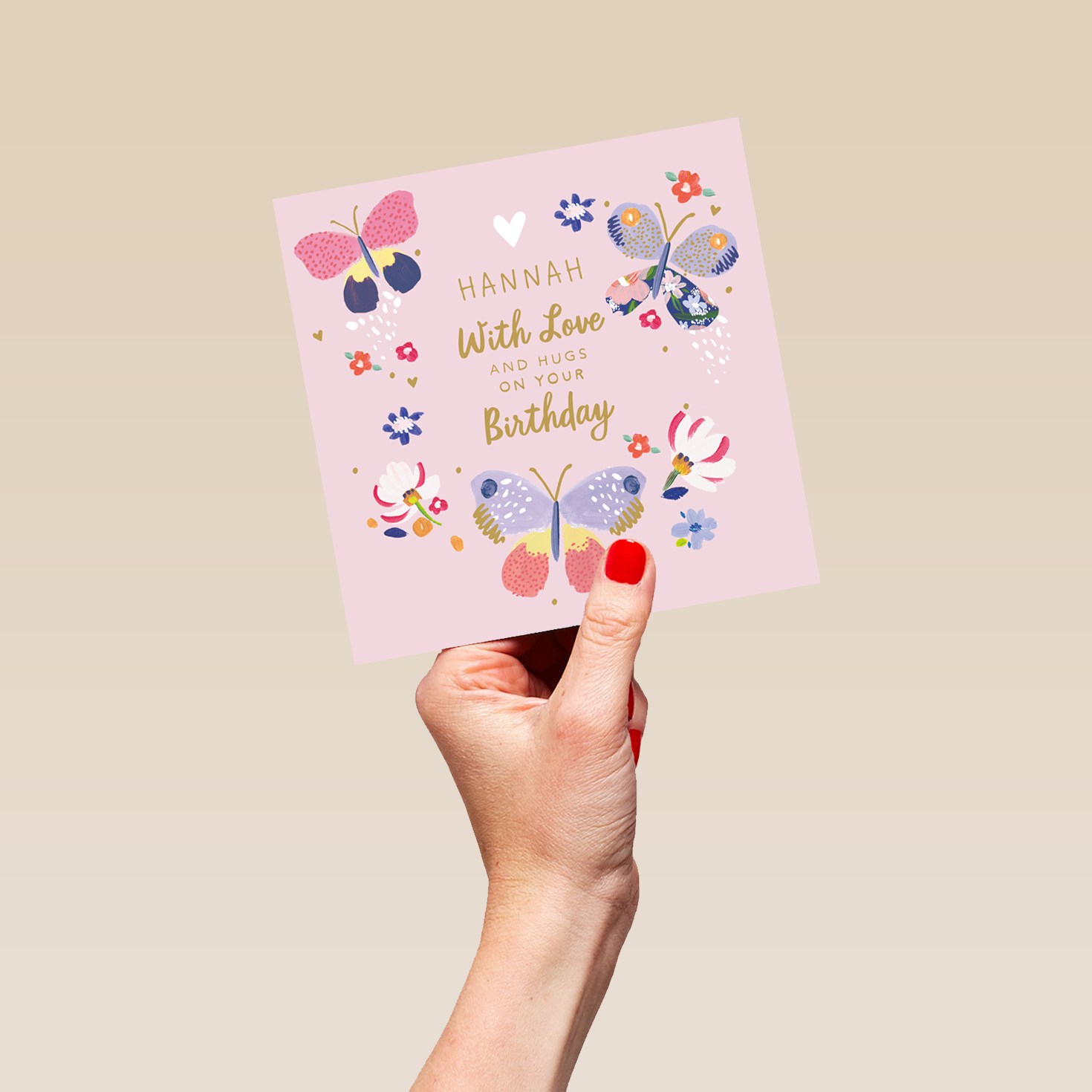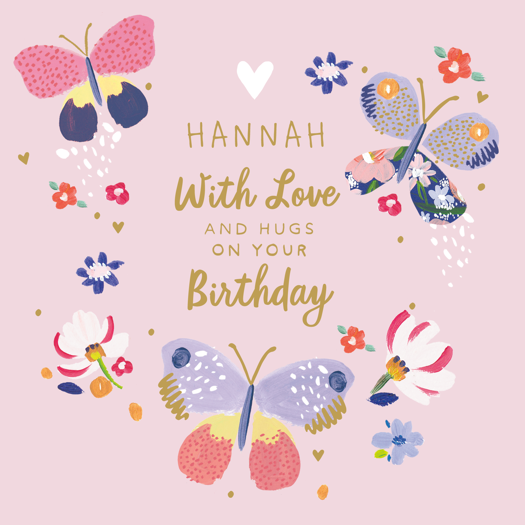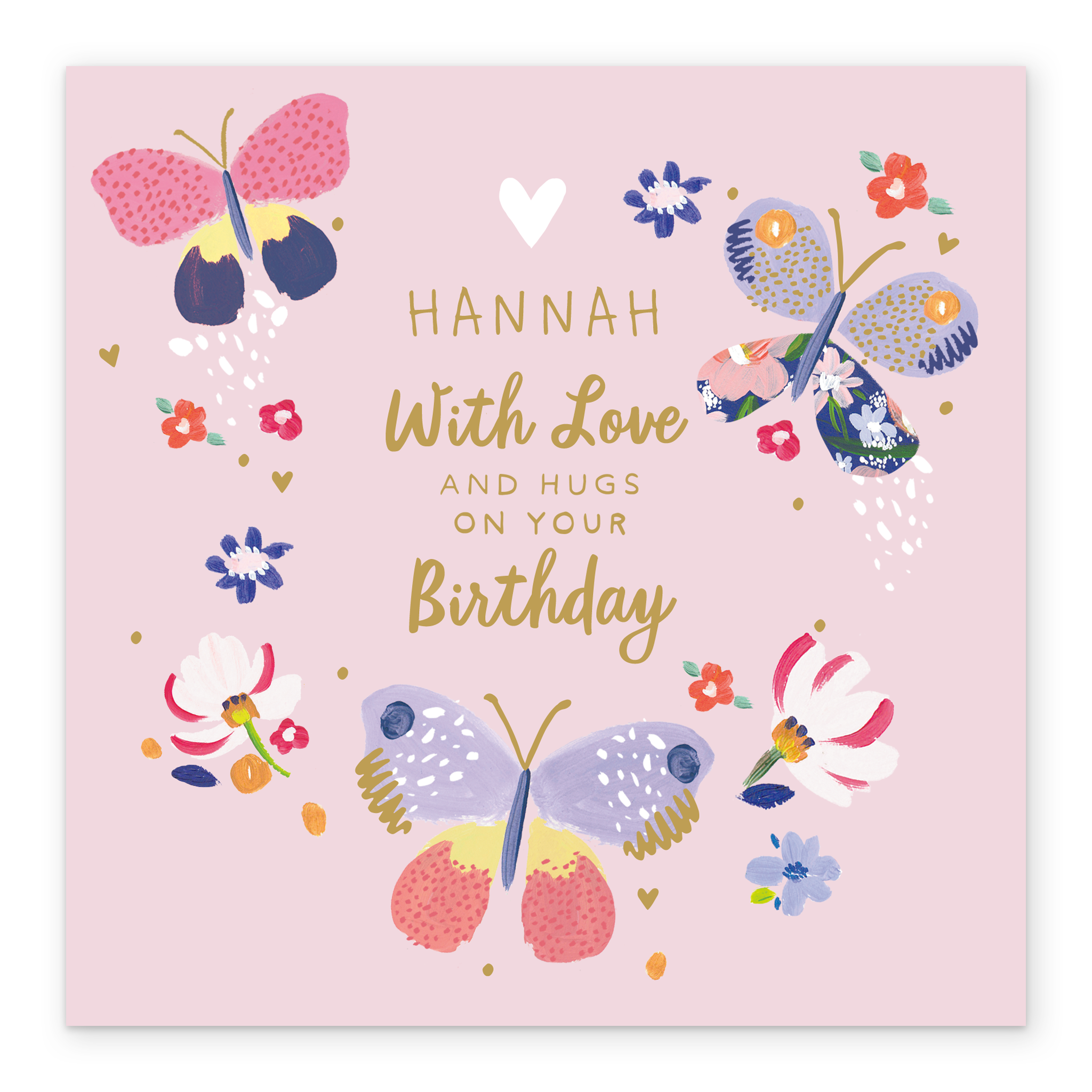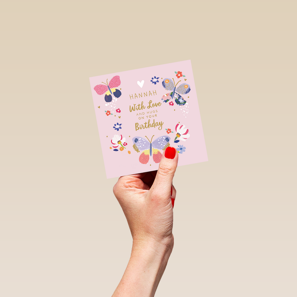 Printed on premium-quality board, this card features an illustration of 3 butterflies with different patterns and designs, with the message '[NAME] With Love and Hugs on Your Birthday', space to personalise a name, and comes complete with a co-ordinating white envelope.