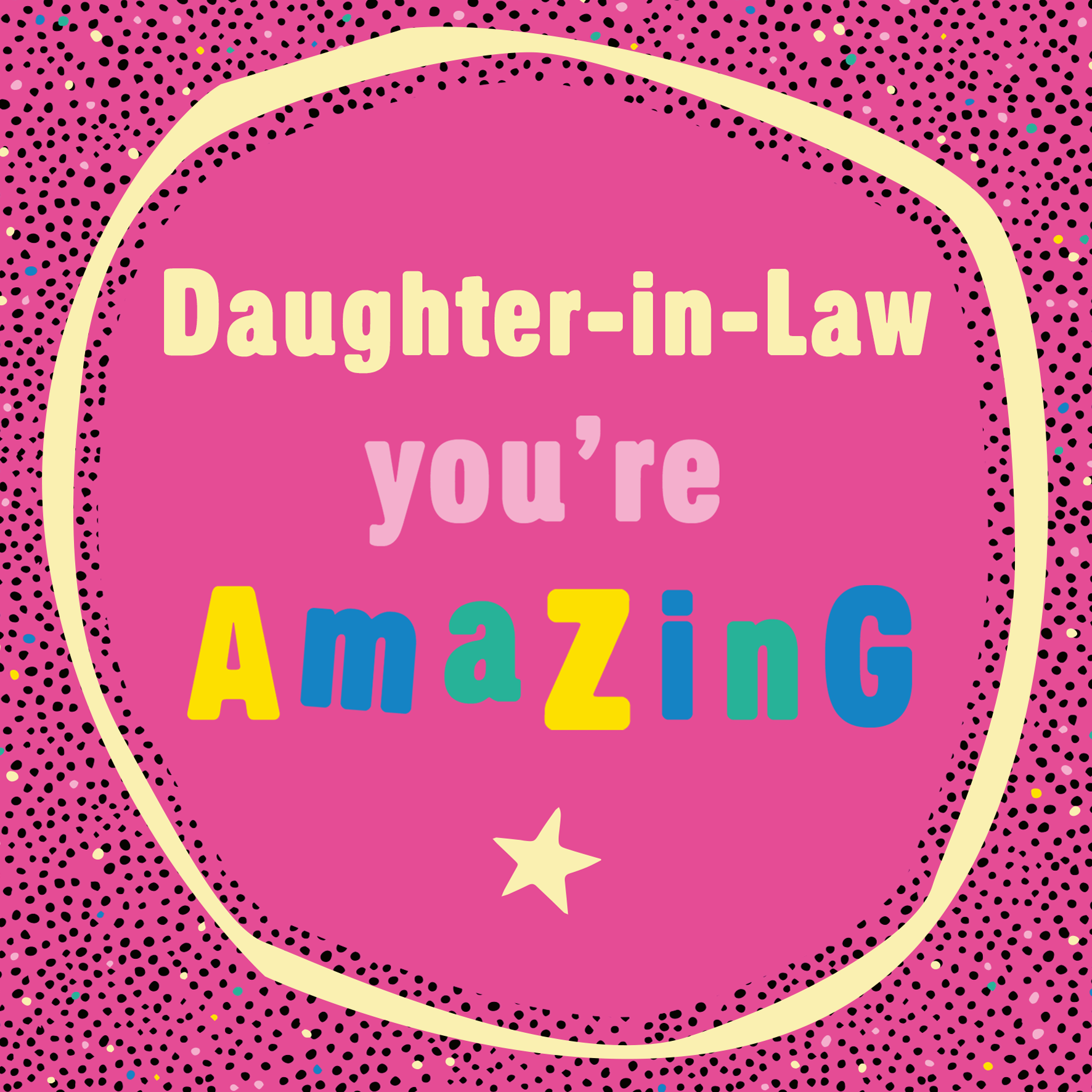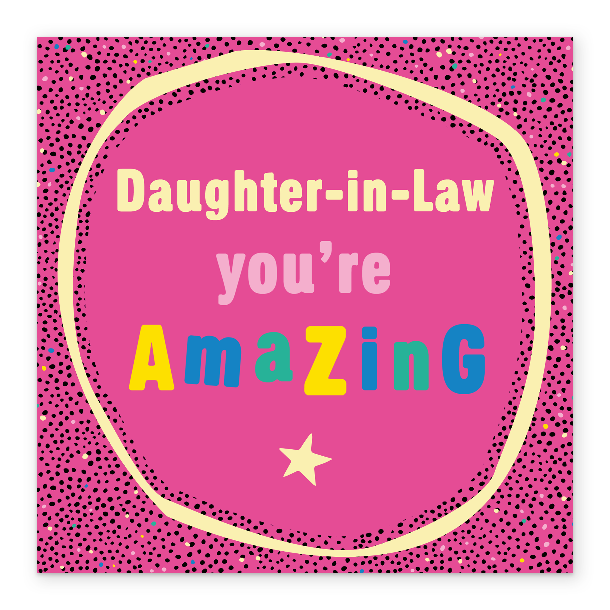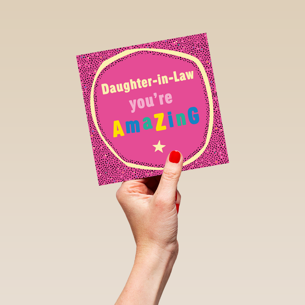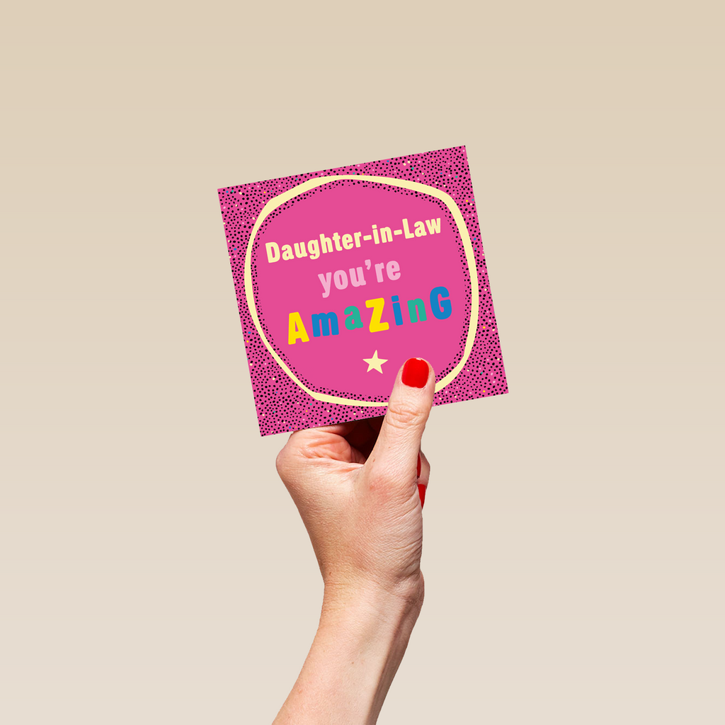 Printed on premium-quality board, this card features a bright pink glitter effect, with the message 'Daughter-in-Law you're amazing', space to personalise your message, and comes complete with a co-ordinating white envelope.