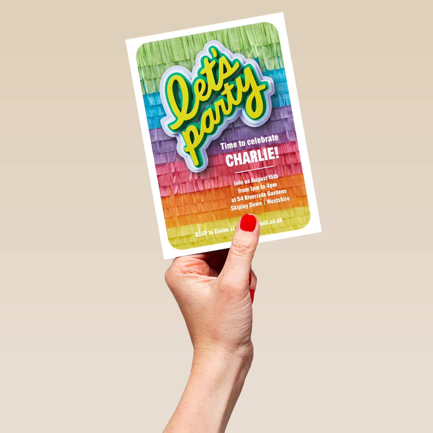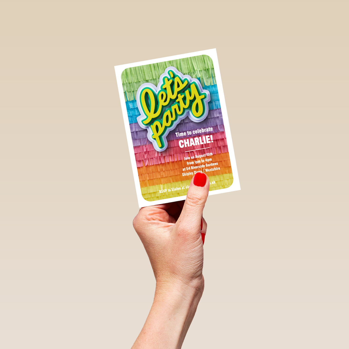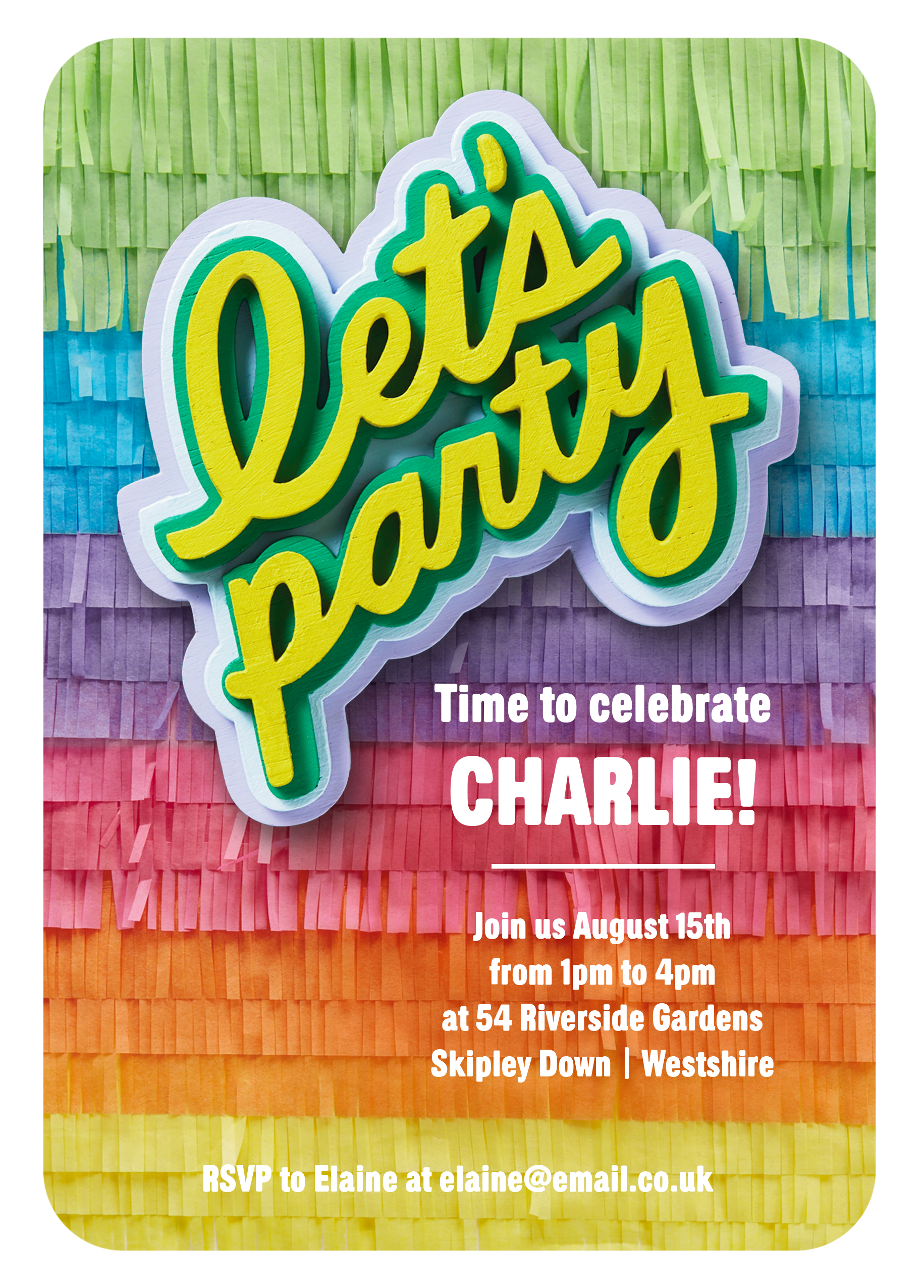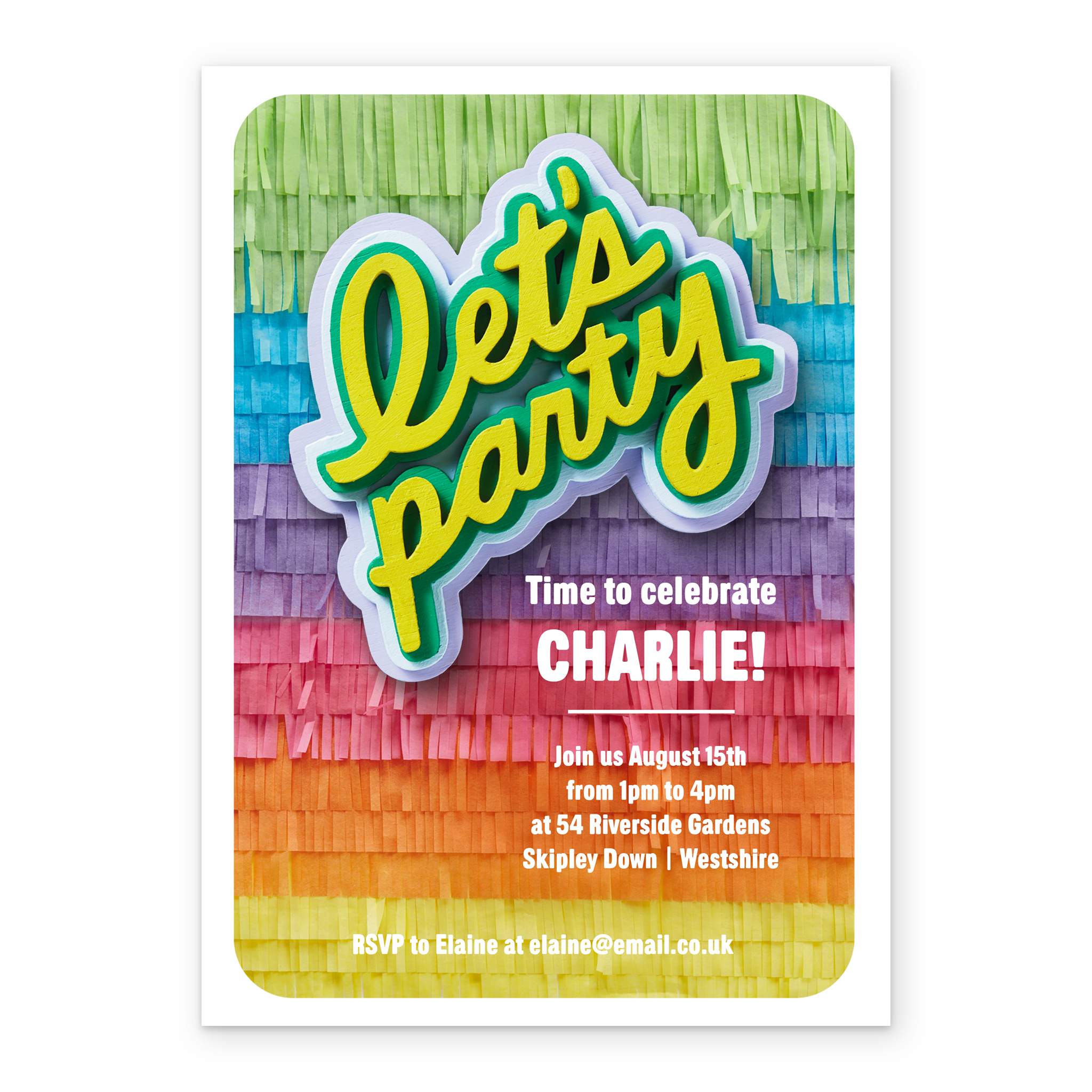 Printed on premium-quality board, this card features editable space for a date, address and contact details, colourful crepe paper design, with the message 'Lets Party. Time to celebrate [Name]!', space to personalise a name, and comes complete with a co-ordinating white envelope.