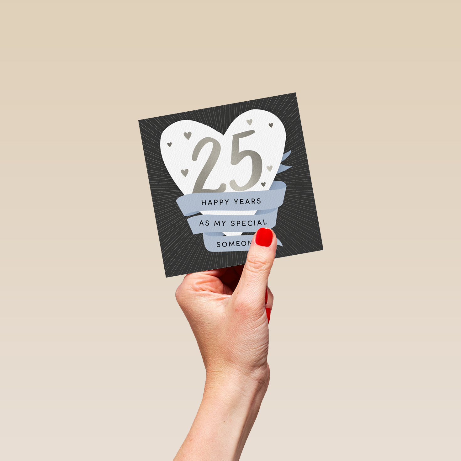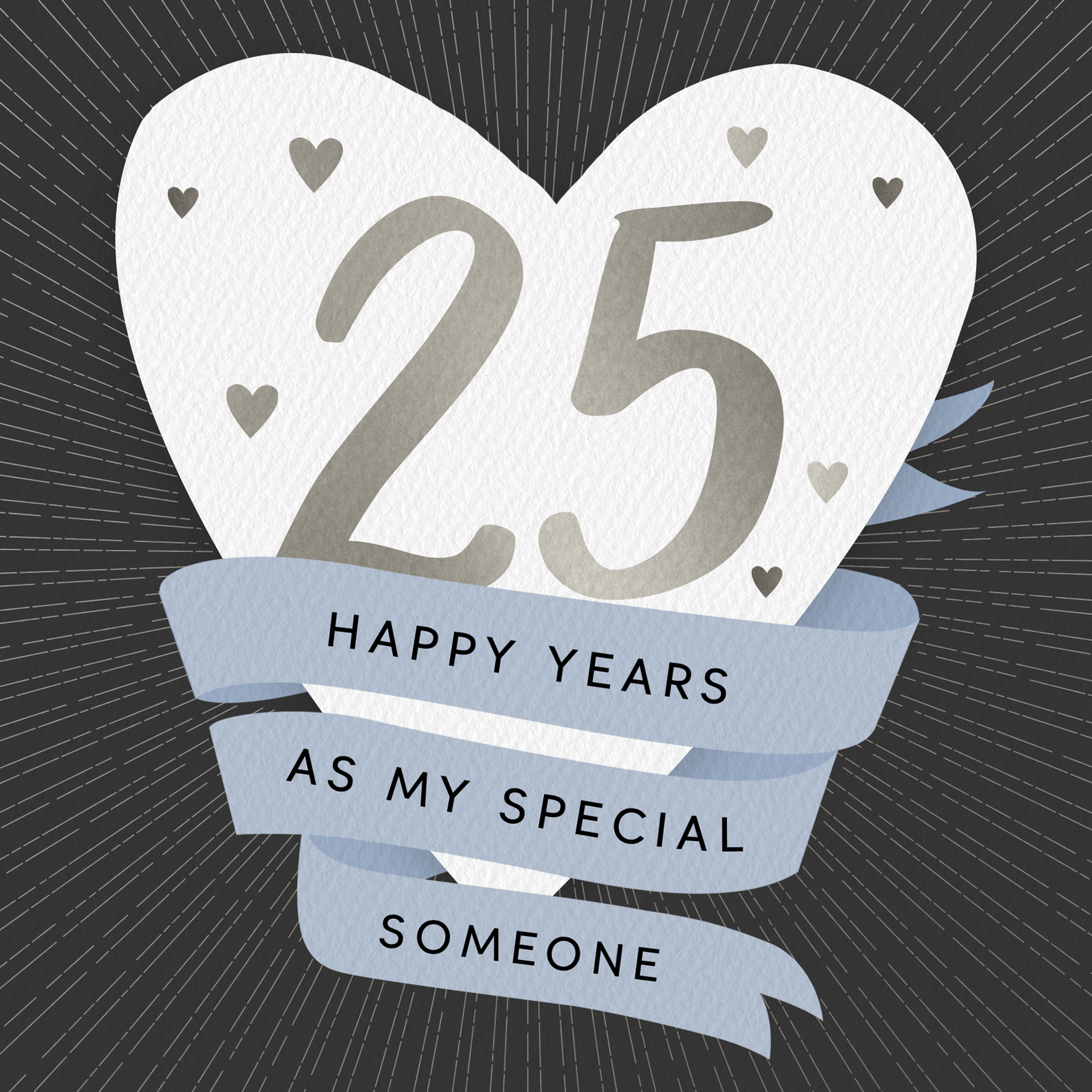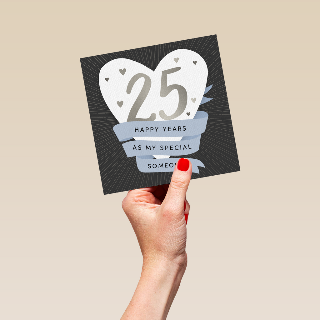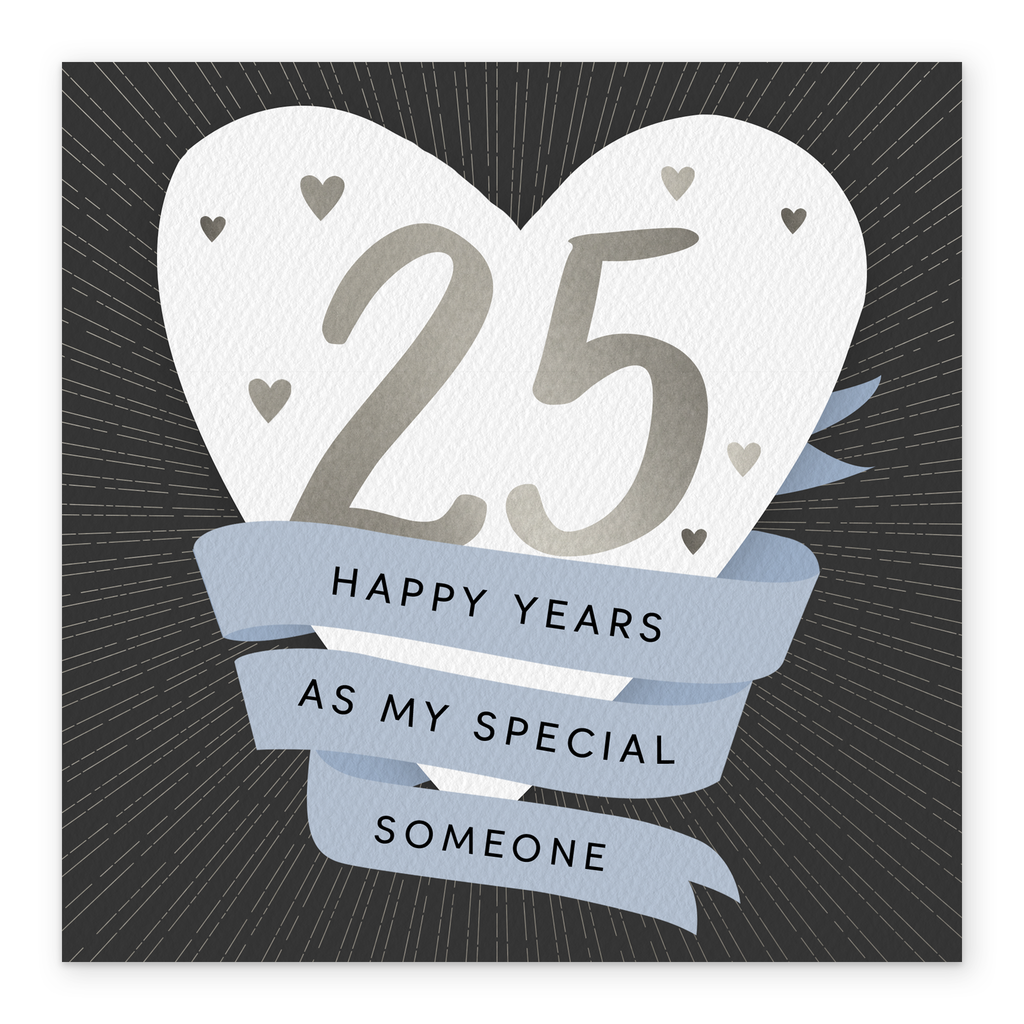 Printed on premium-quality board, this card features a white love heart with banner flag design, with the message '25 Happy Years As My Special Someone', space to personalise a name, and comes complete with a co-ordinating white envelope.