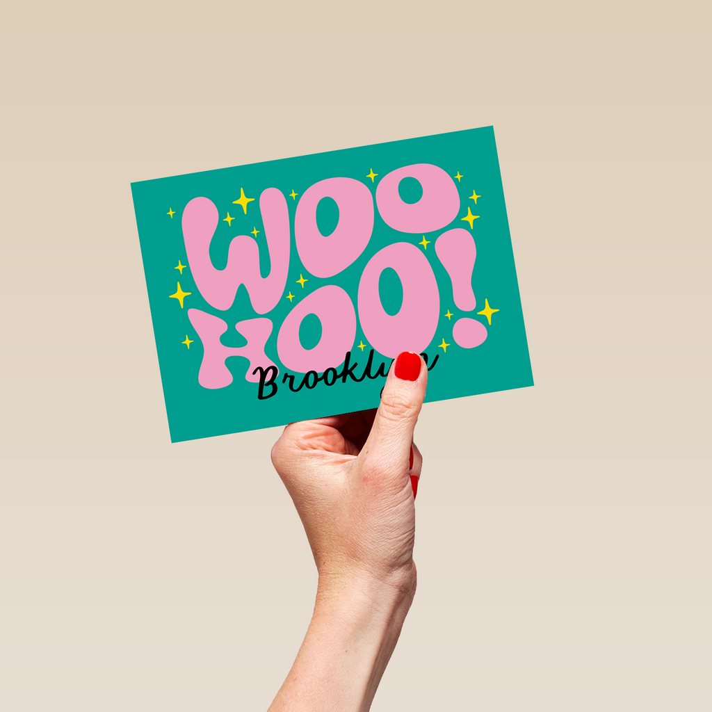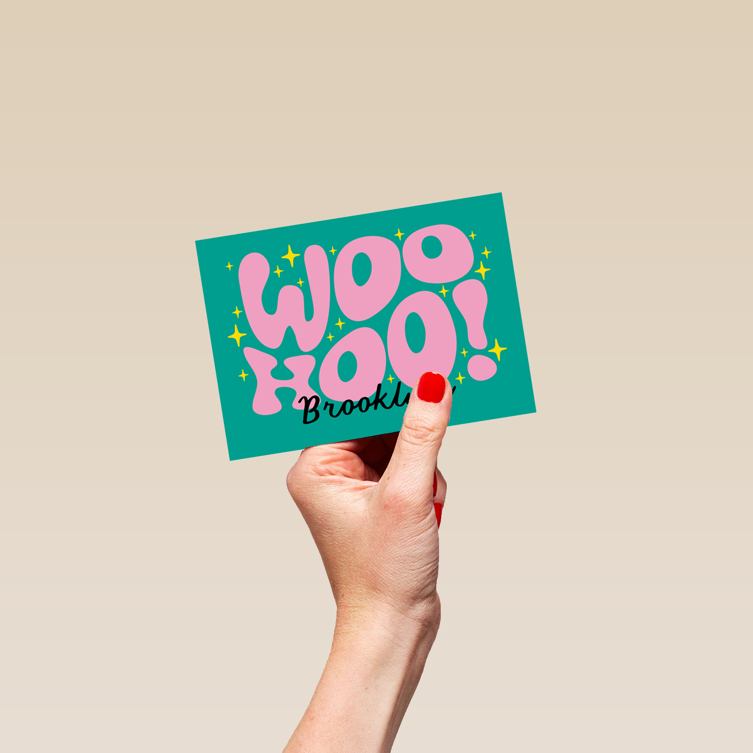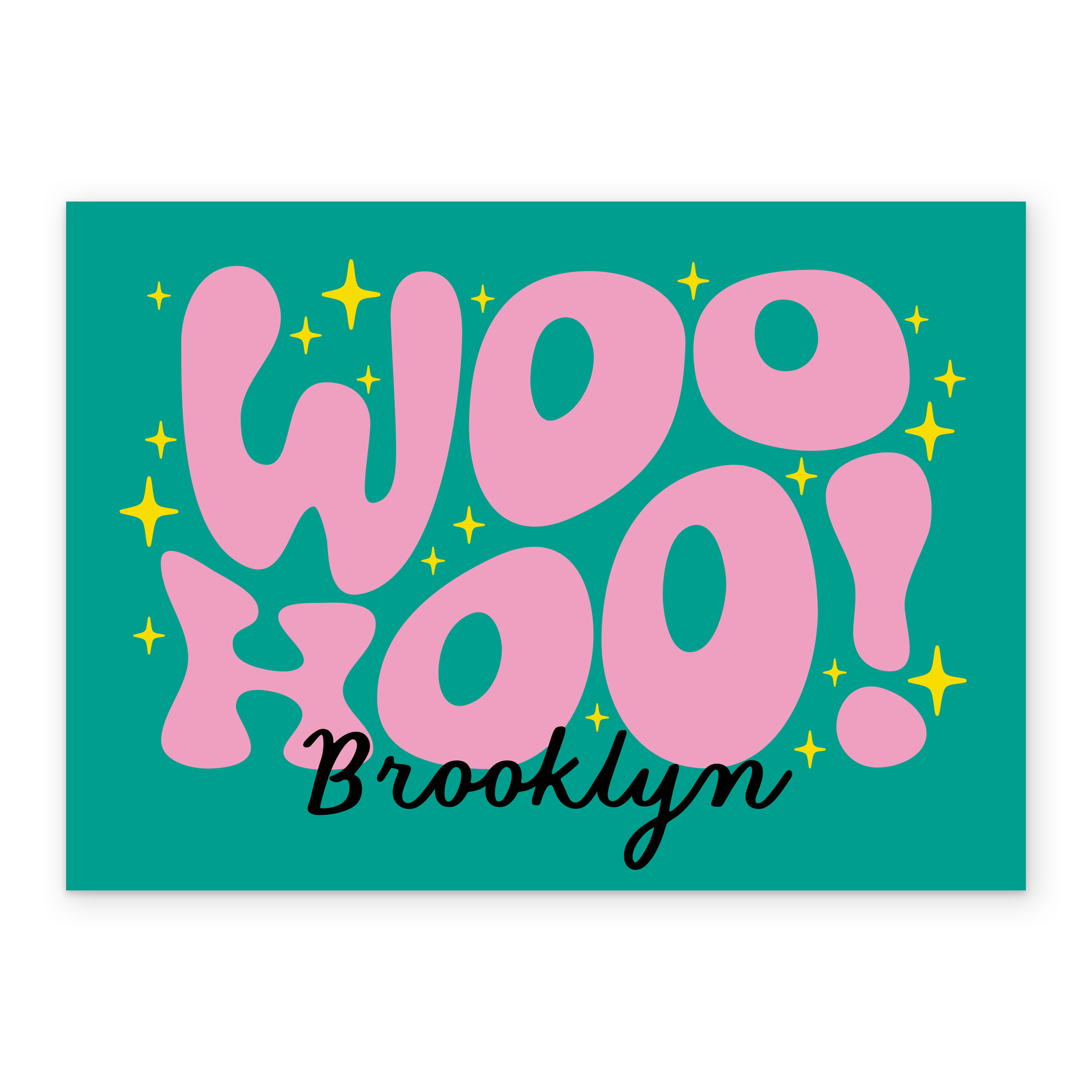 Printed on premium-quality board, this card features fun and colourful typography with stars, with the message 'WOO HOO! [NAME]', and comes complete with a co-ordinating white envelope.
