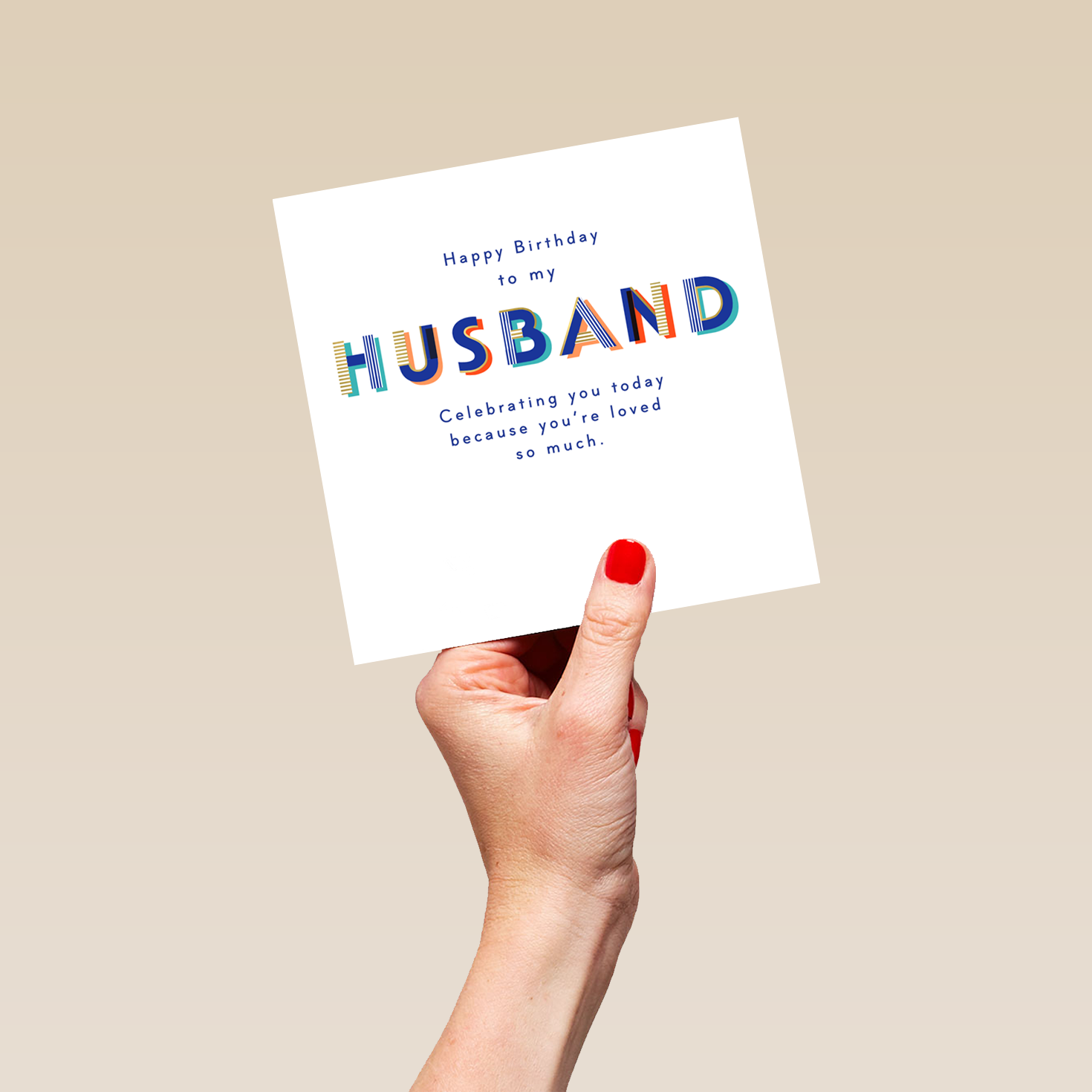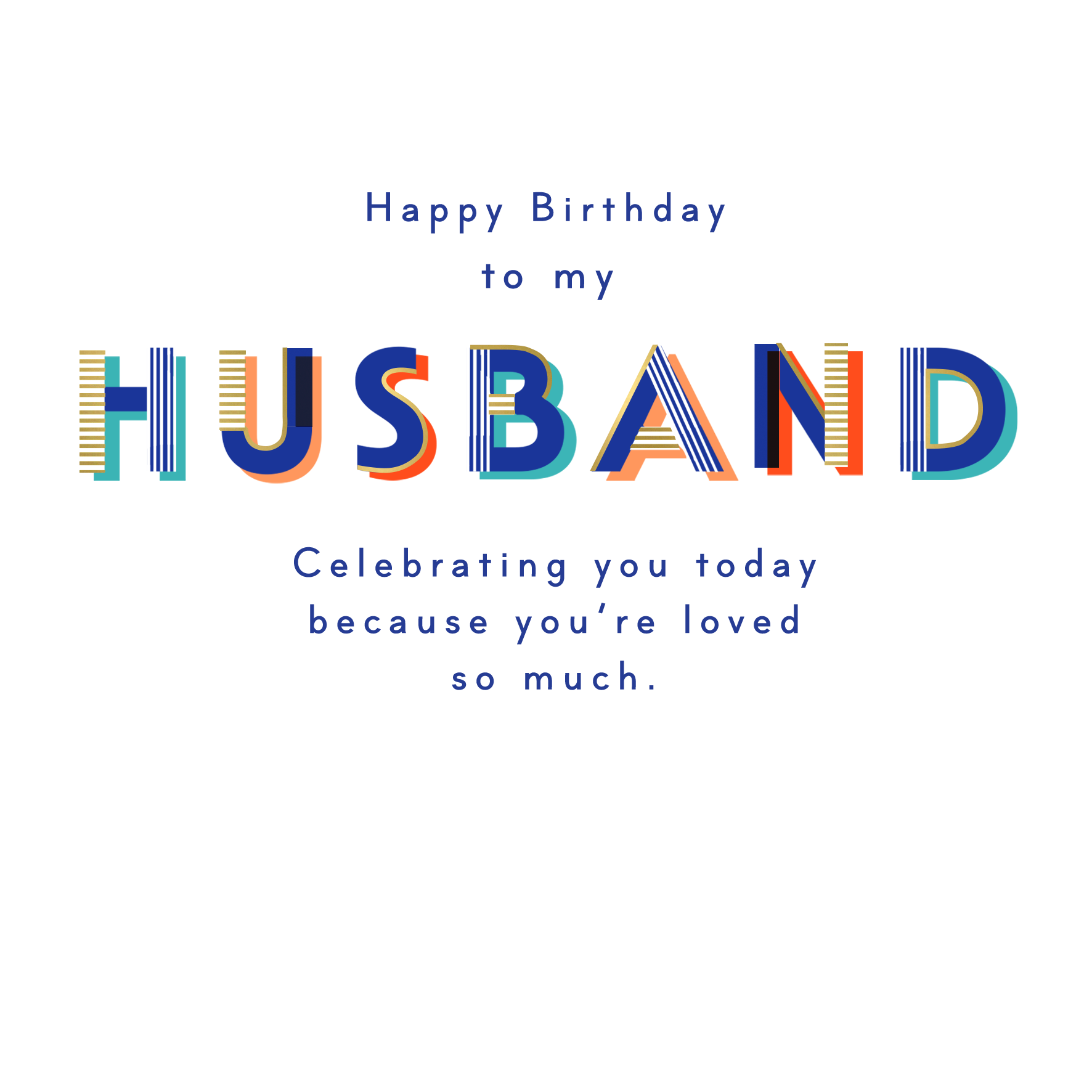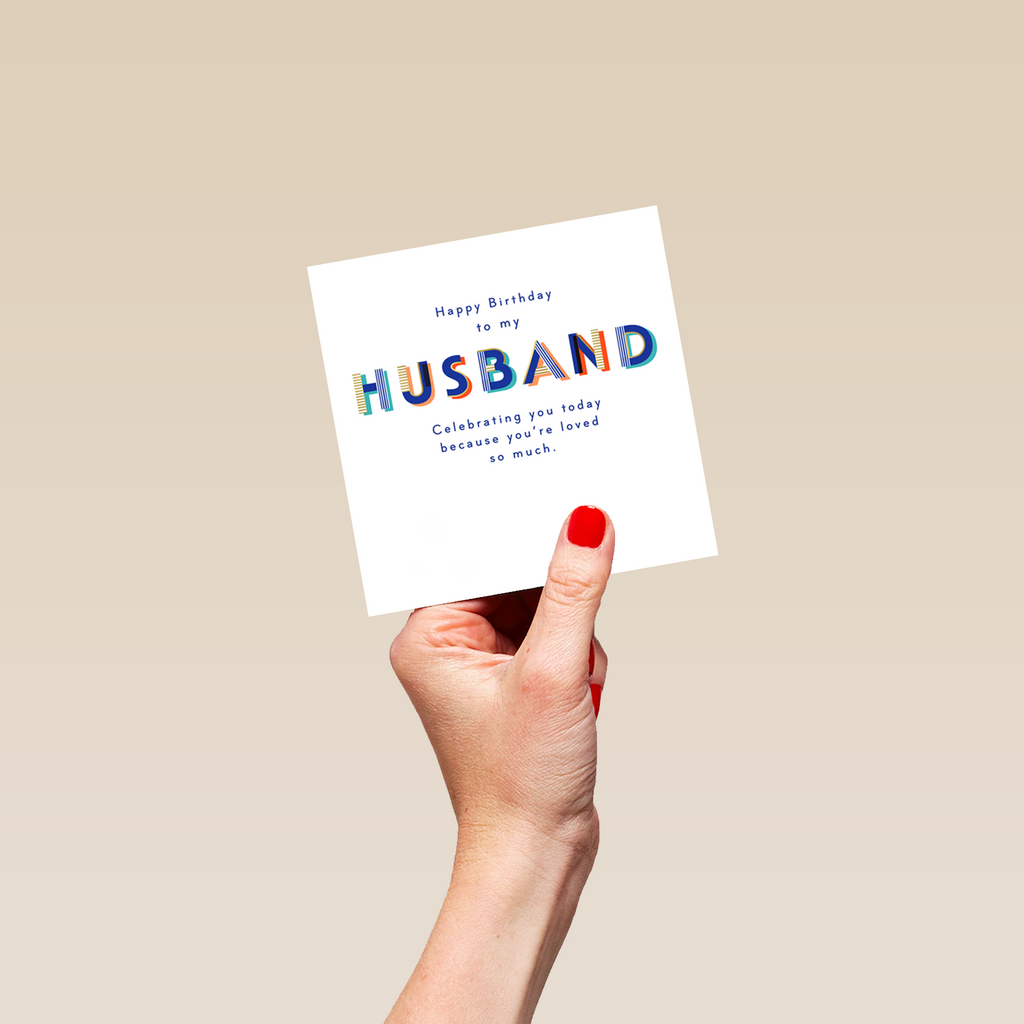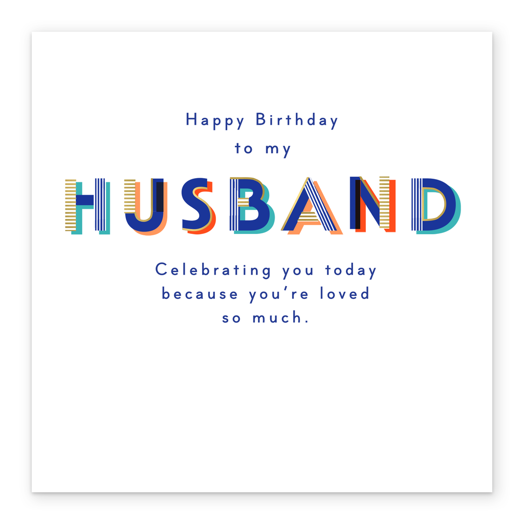 Printed on premium-quality board, this card features fun typography design, with the message 'Happy Birthday To My Husband Celebrating You Today Because You're Loved So Much.', space to personalise your message, and comes complete with a co-ordinating white envelope.