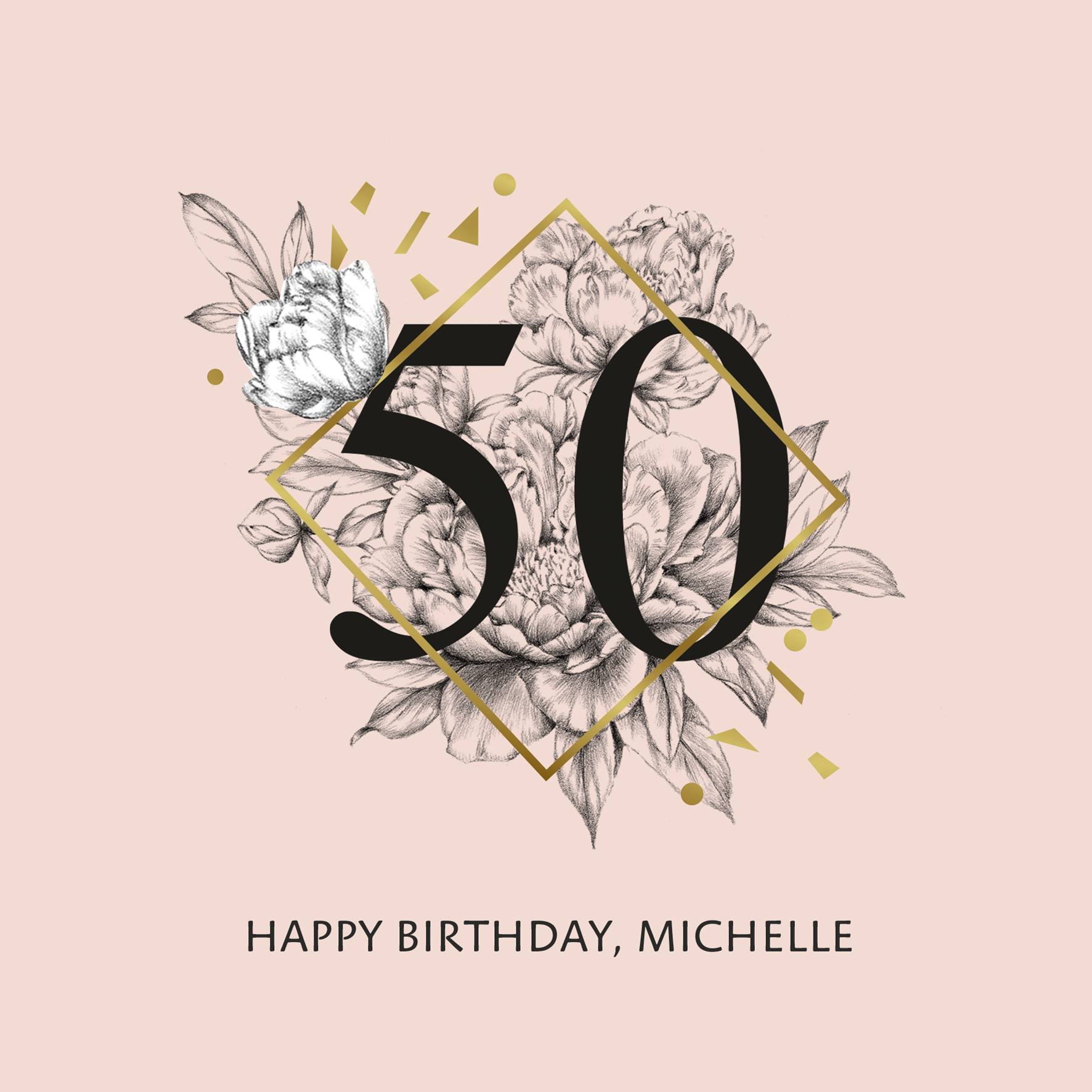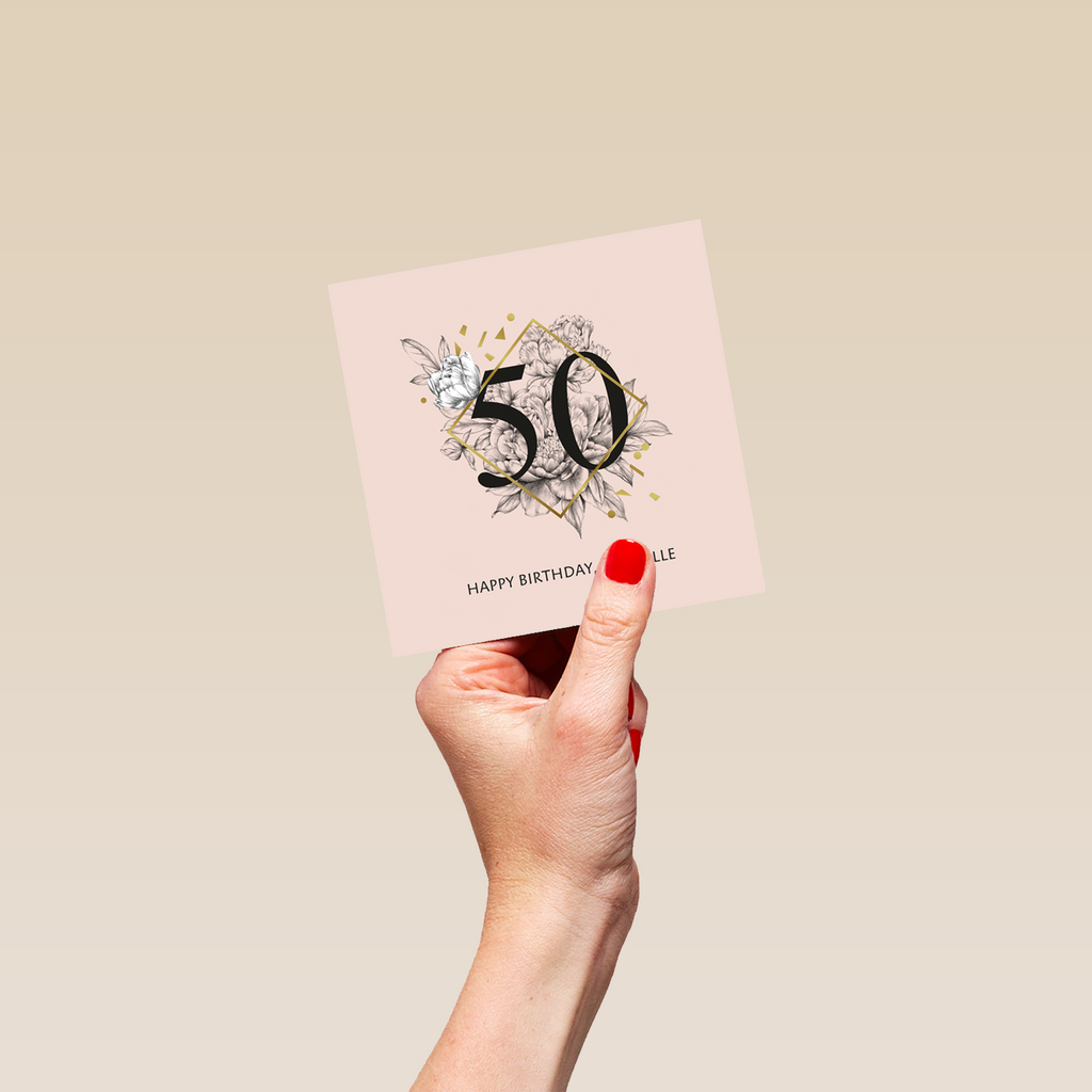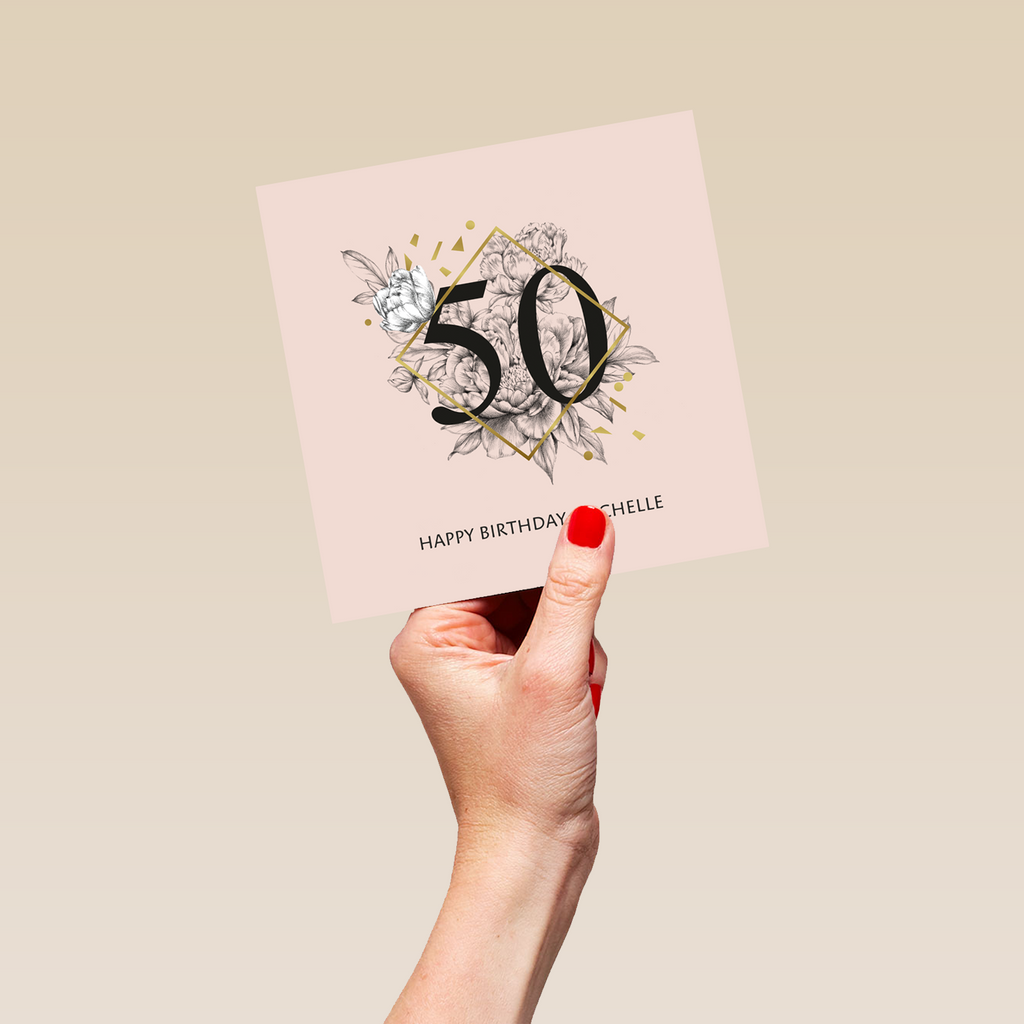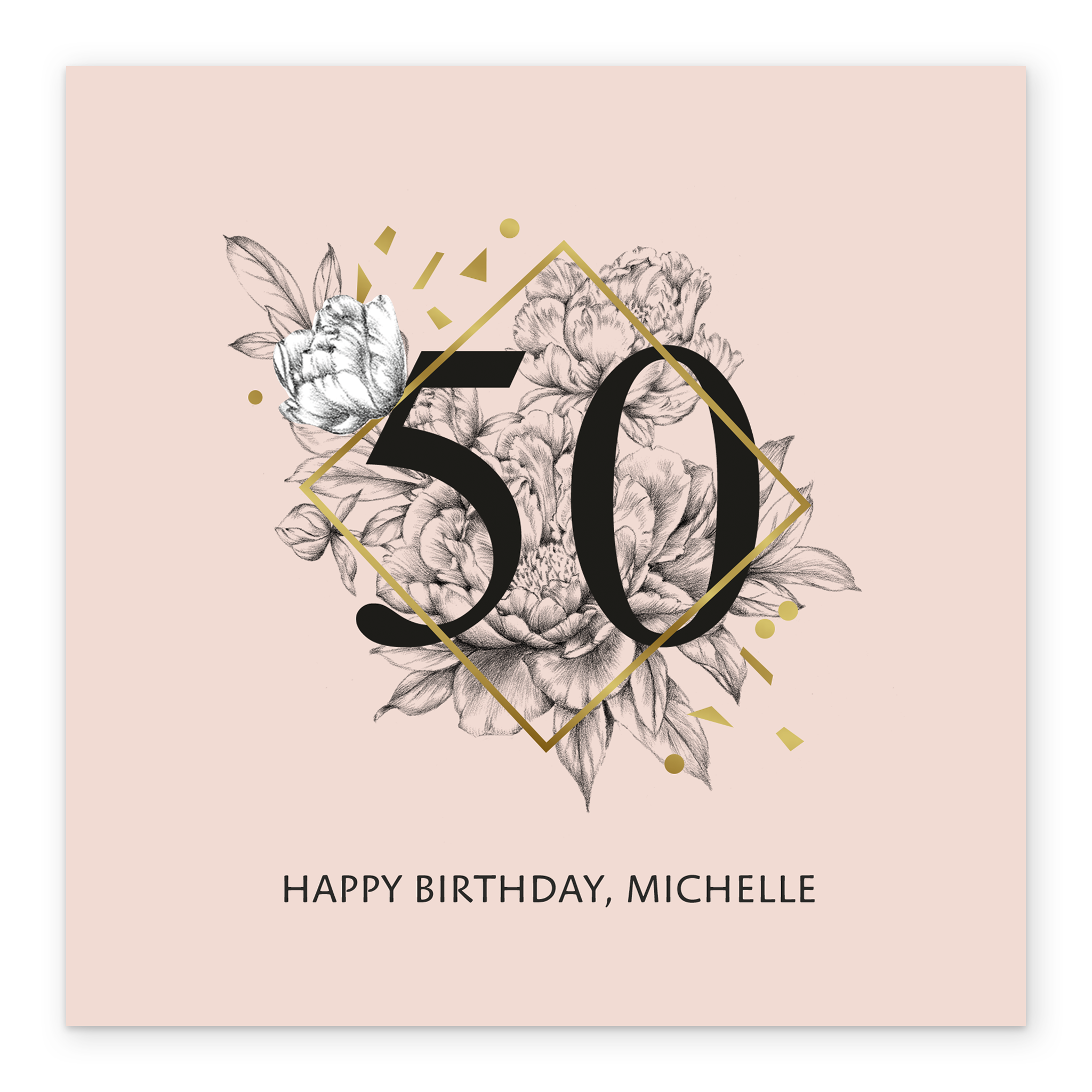 Printed on premium-quality board, this card features a bold black number fifty inside a gold diamond shape, floral illustration and gold confetti shapes on a peach background, with the message 'Happy Birthday', space to personalise your message, and comes complete with a co-ordinating white envelope.