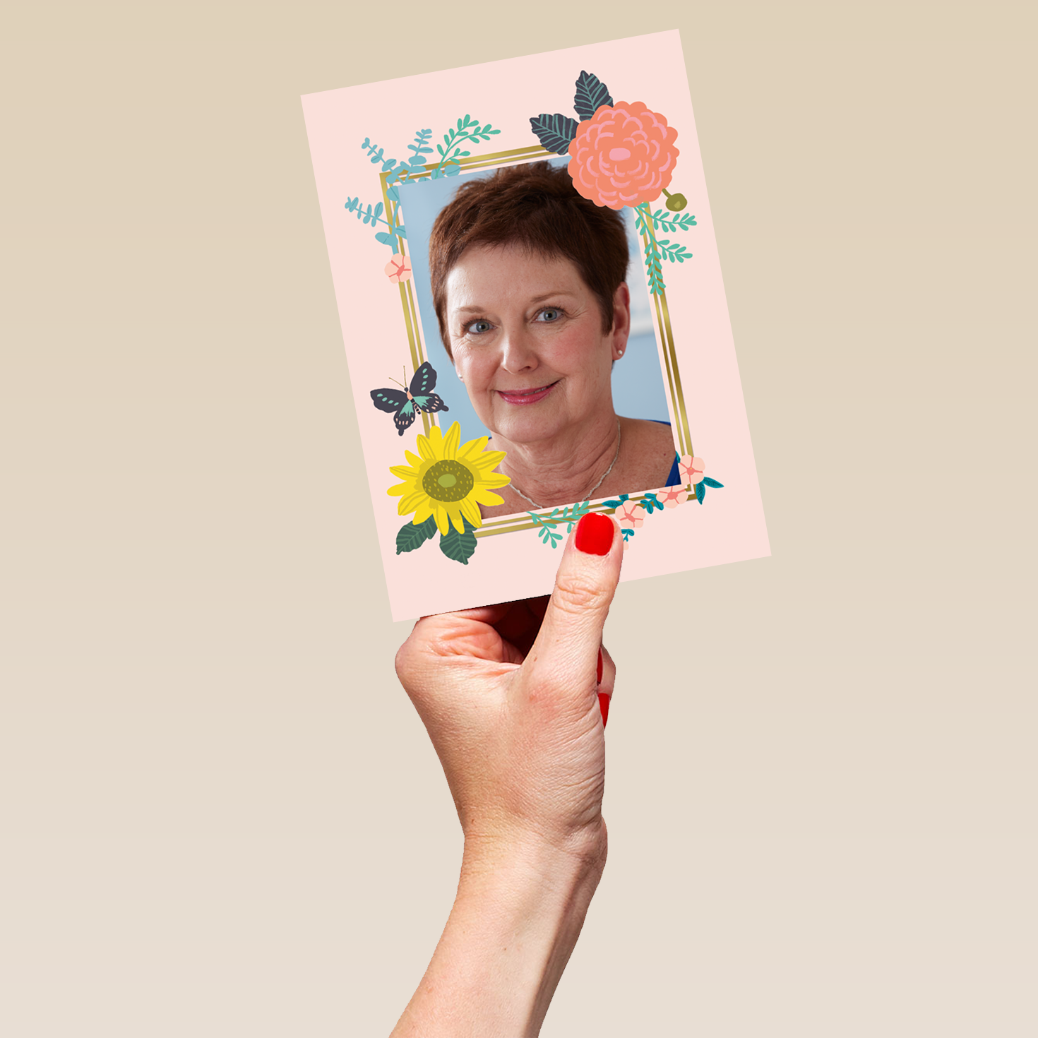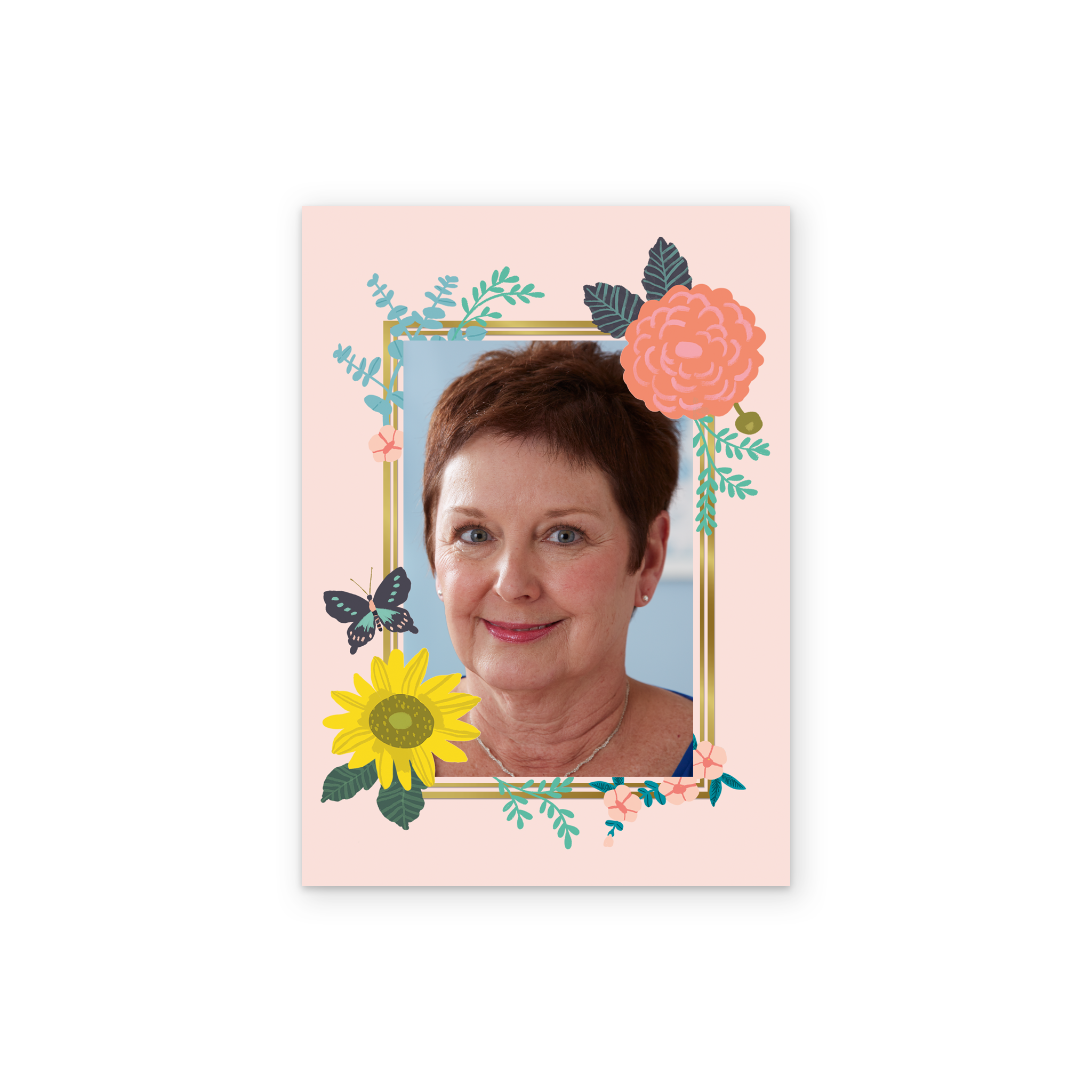 Printed on premium-quality board, this card features a soft pink background with flower and foliage decorated gold-coloured frame around a photo upload aperture, space to upload a photo, and comes complete with a co-ordinating white envelope.
