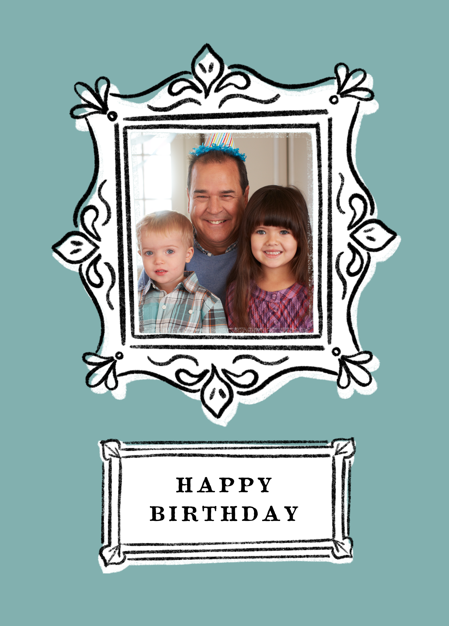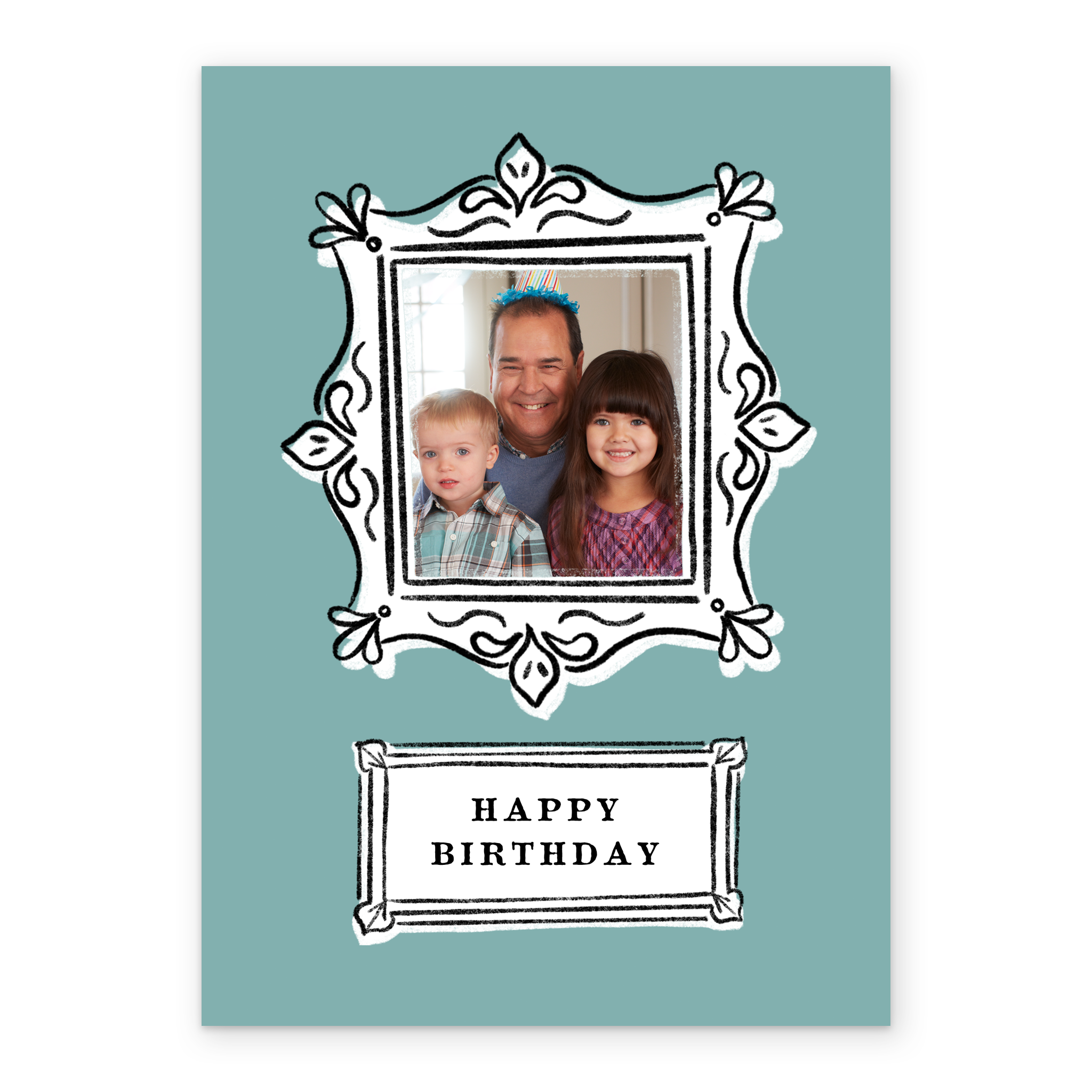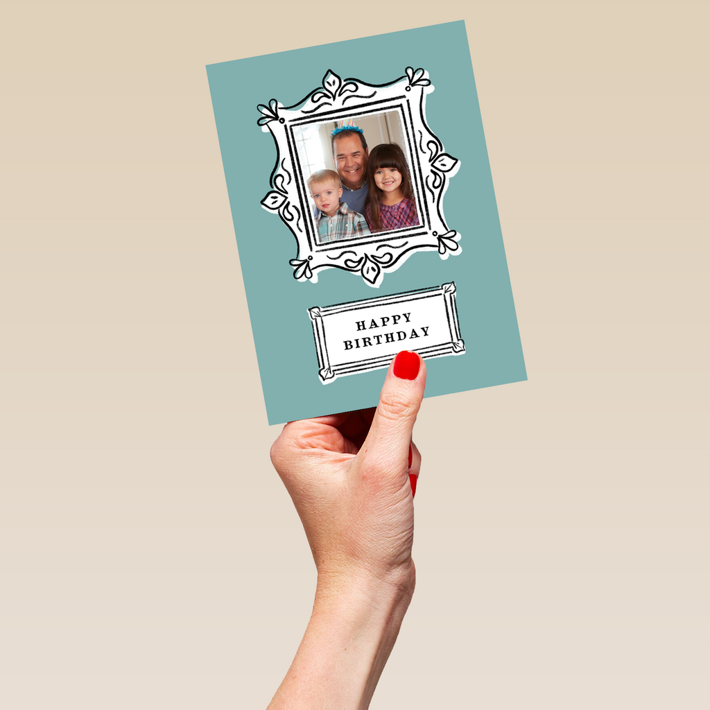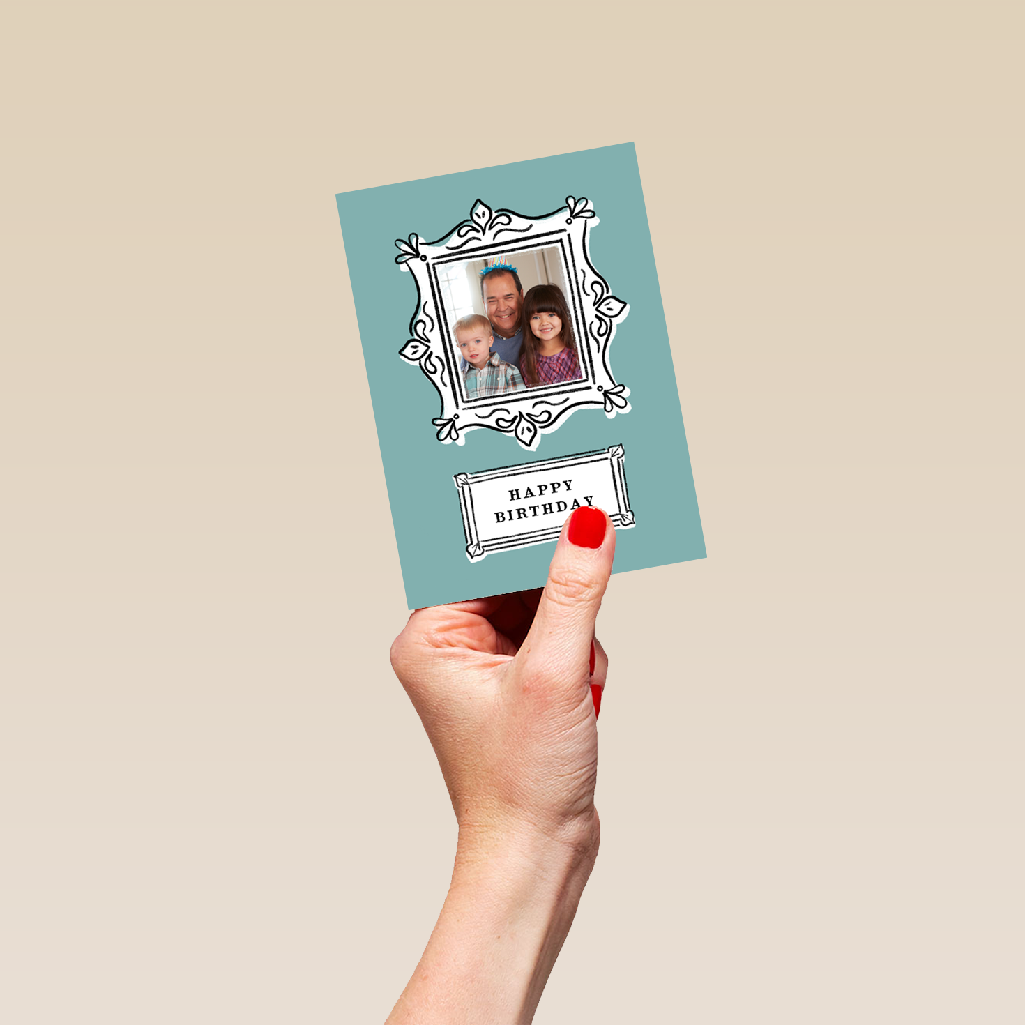 Printed on premium-quality board, this card features a photo frame design with a blue background, with the message 'Happy Birthday', space to upload a photo and personalise your message, and comes complete with a co-ordinating white envelope.