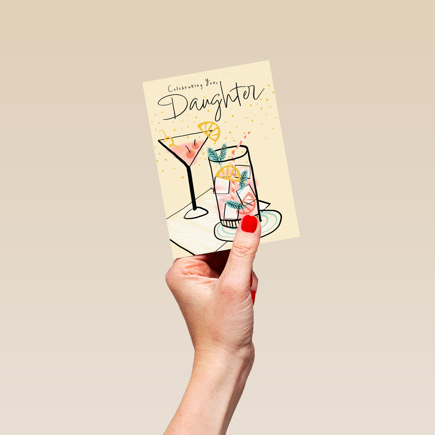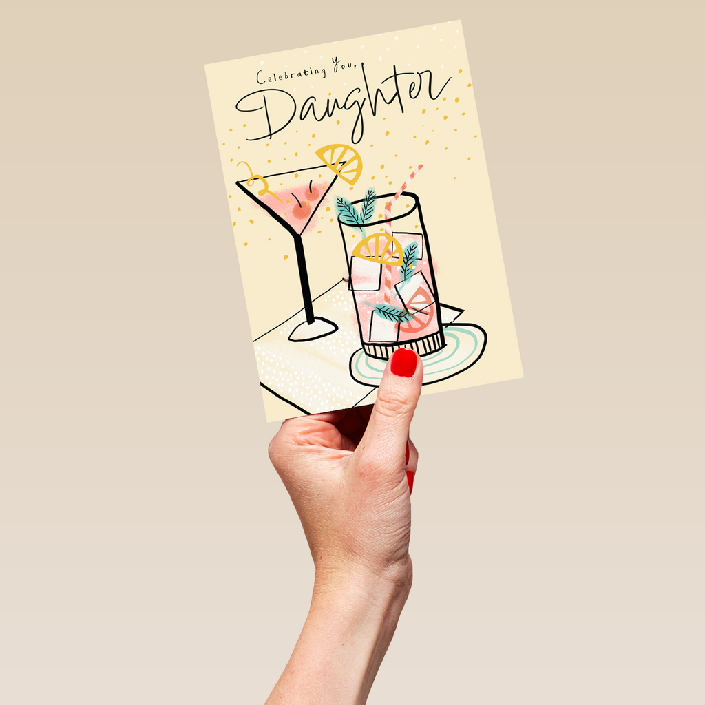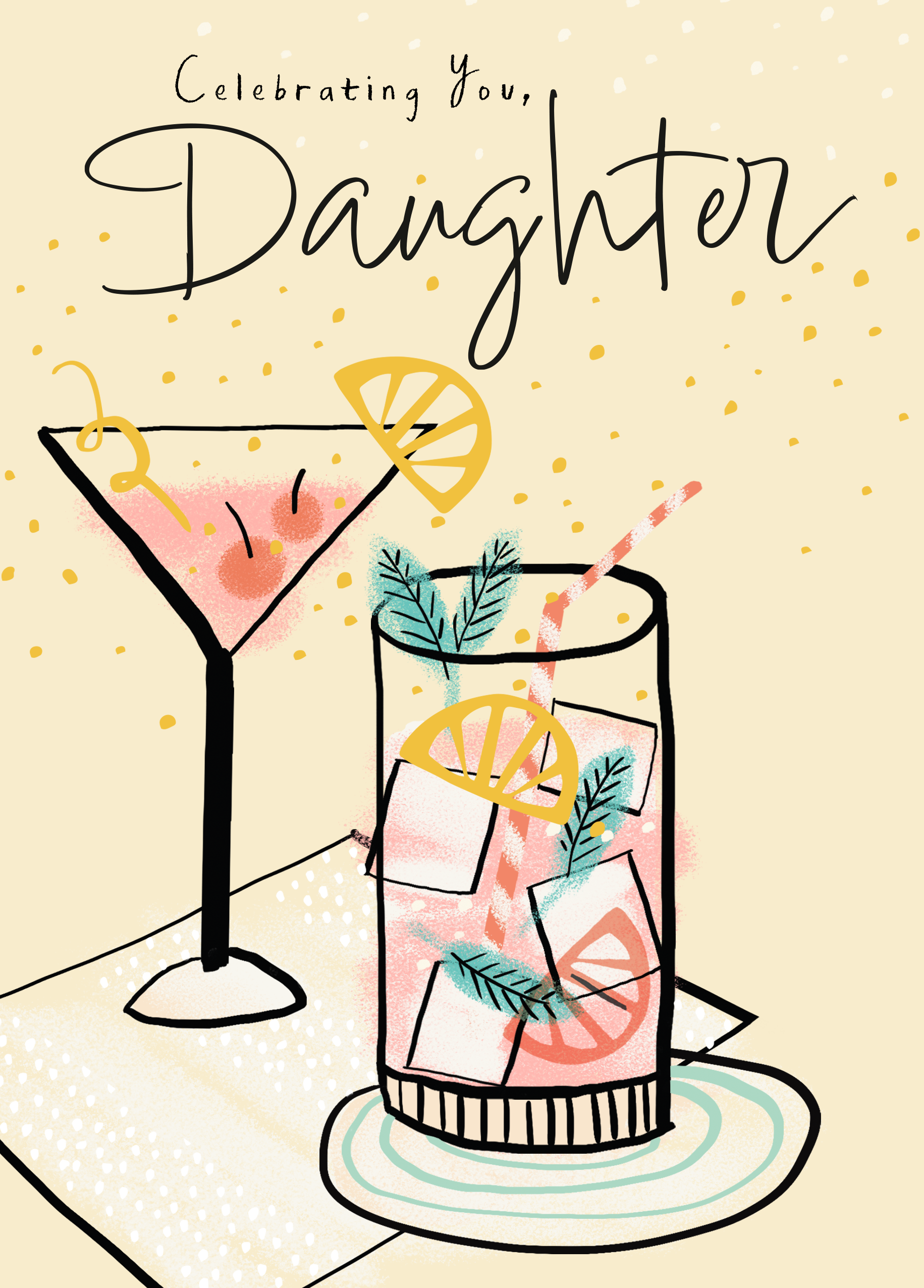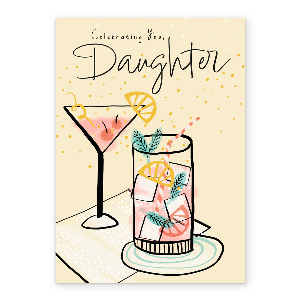 Printed on premium-quality board, this card features 2 fun cocktail drinks with fruit, with the message 'Celebrating You, Daughter', and comes complete with a co-ordinating white envelope.