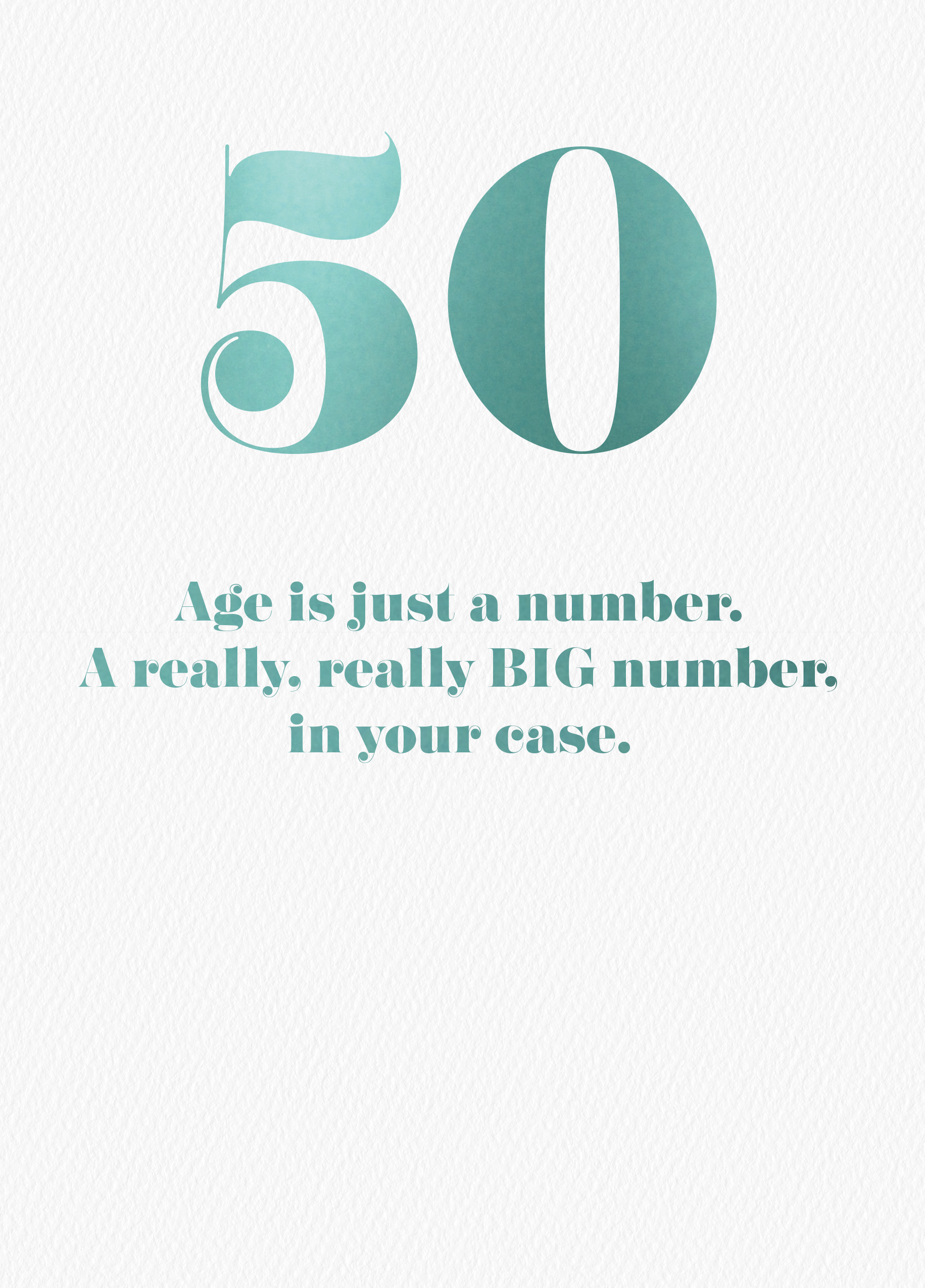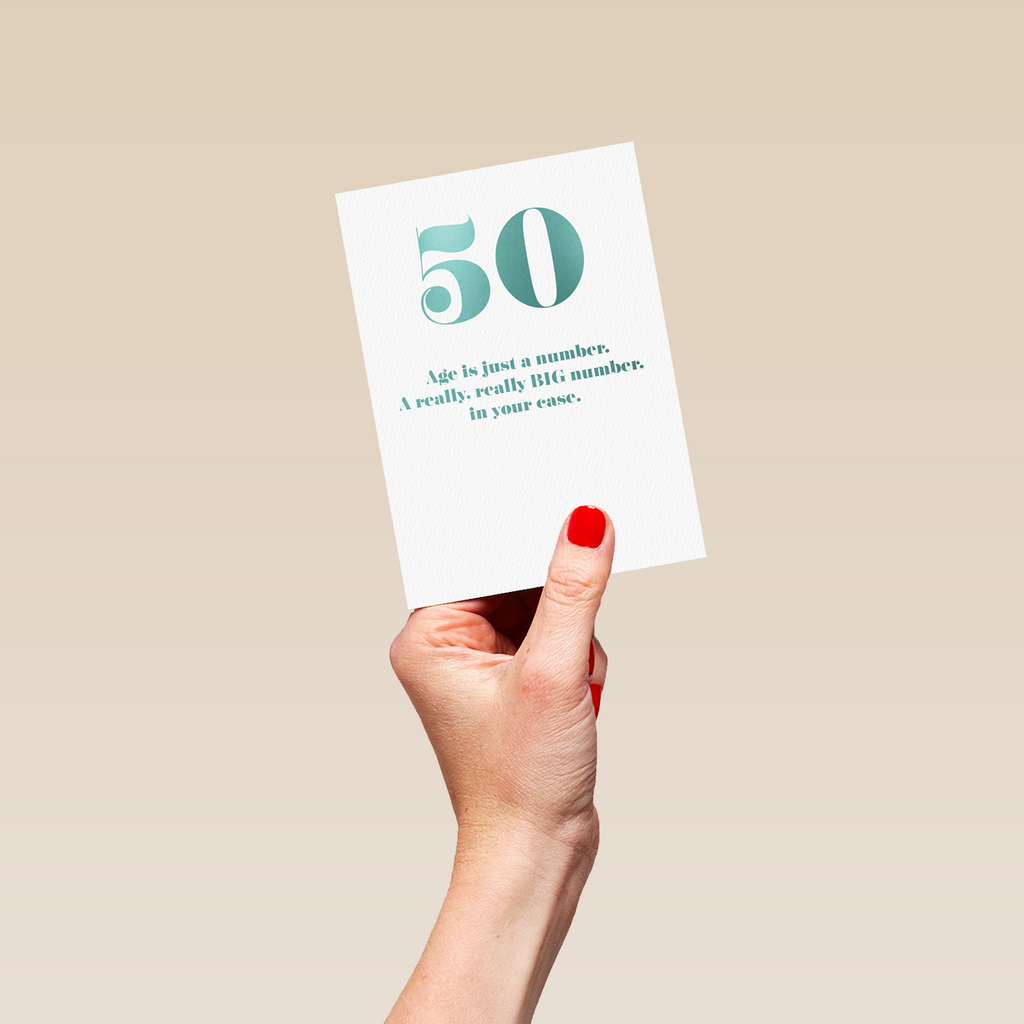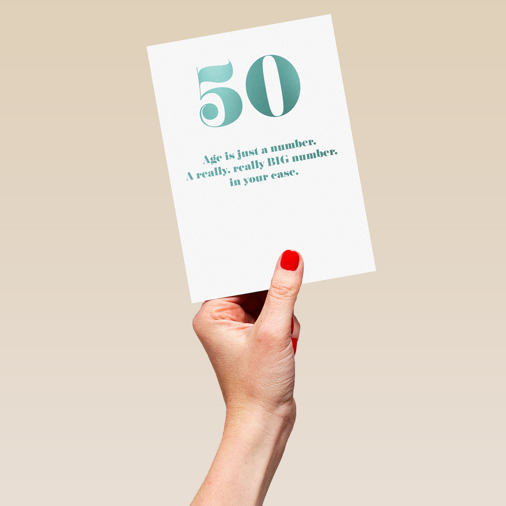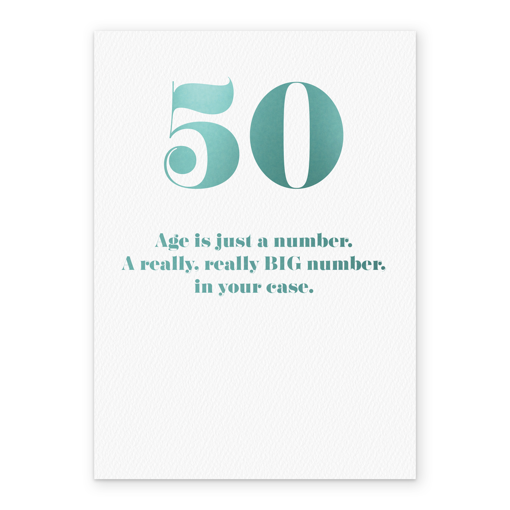 Printed on premium-quality board, this card features a large number fifty and contemporary turquoise text on a white background, with the message 'Age is just a number. A really BIG number, in your case.', and comes complete with a co-ordinating white envelope.