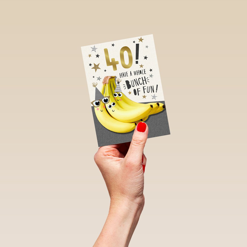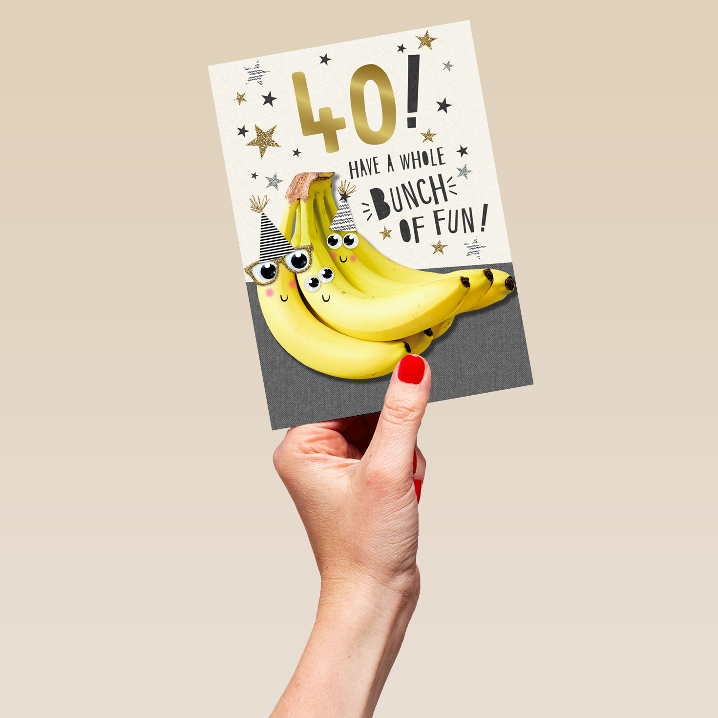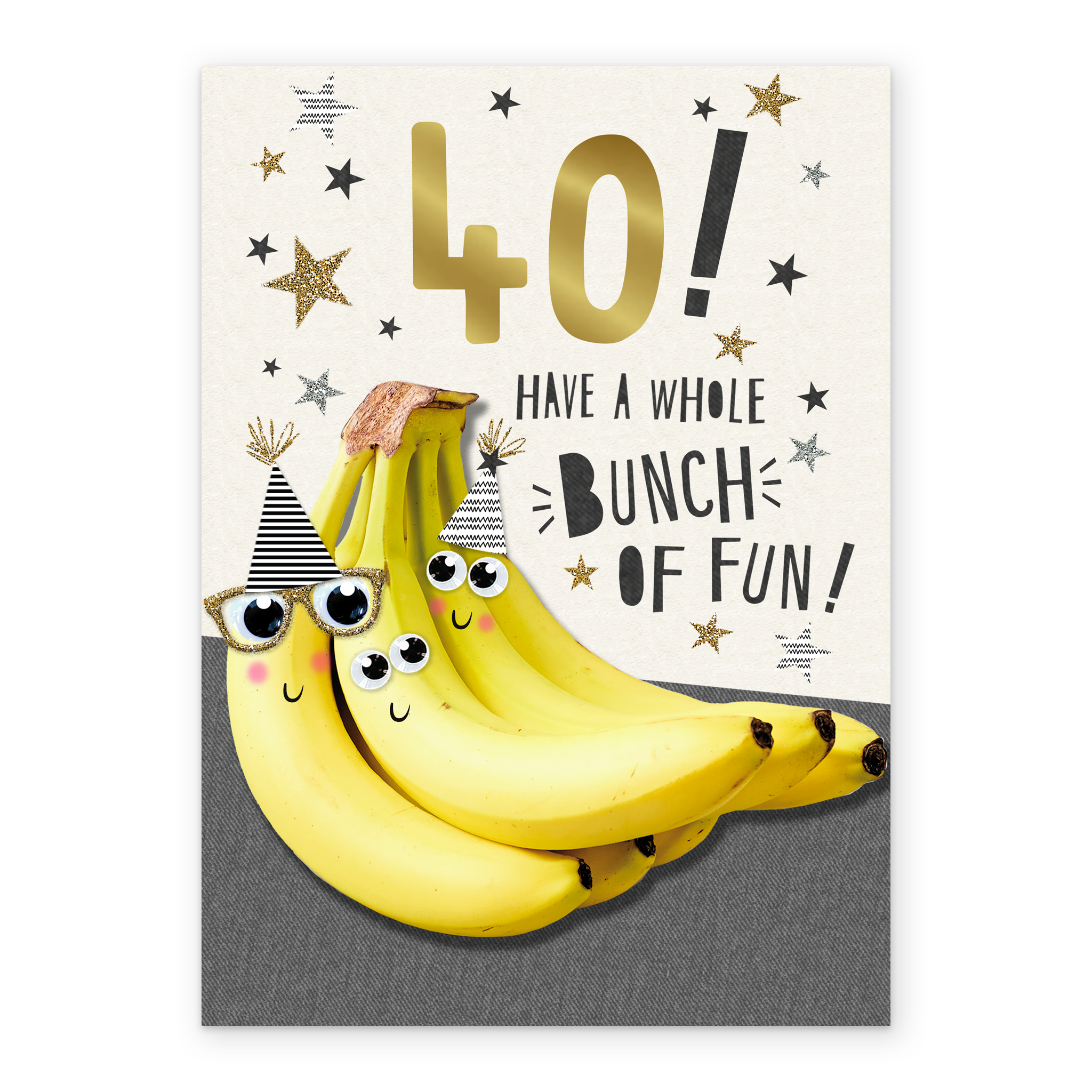 Printed on premium-quality board, this card features a bunch of yellow bananas with happy smiley faces and party hats, on a cream and grey background adorned with gold, silver and grey stars, with the message '40! Have a whole bunch of fun!', and comes complete with a co-ordinating white envelope.