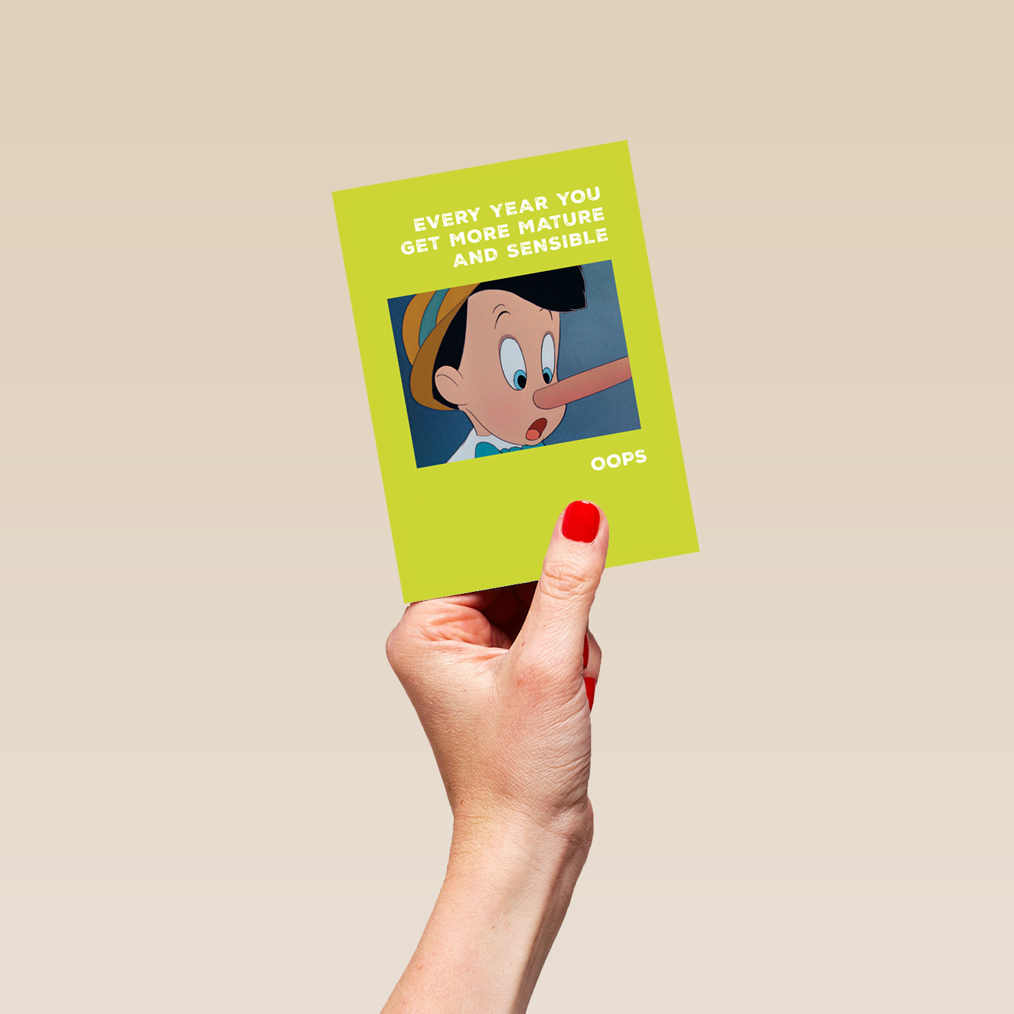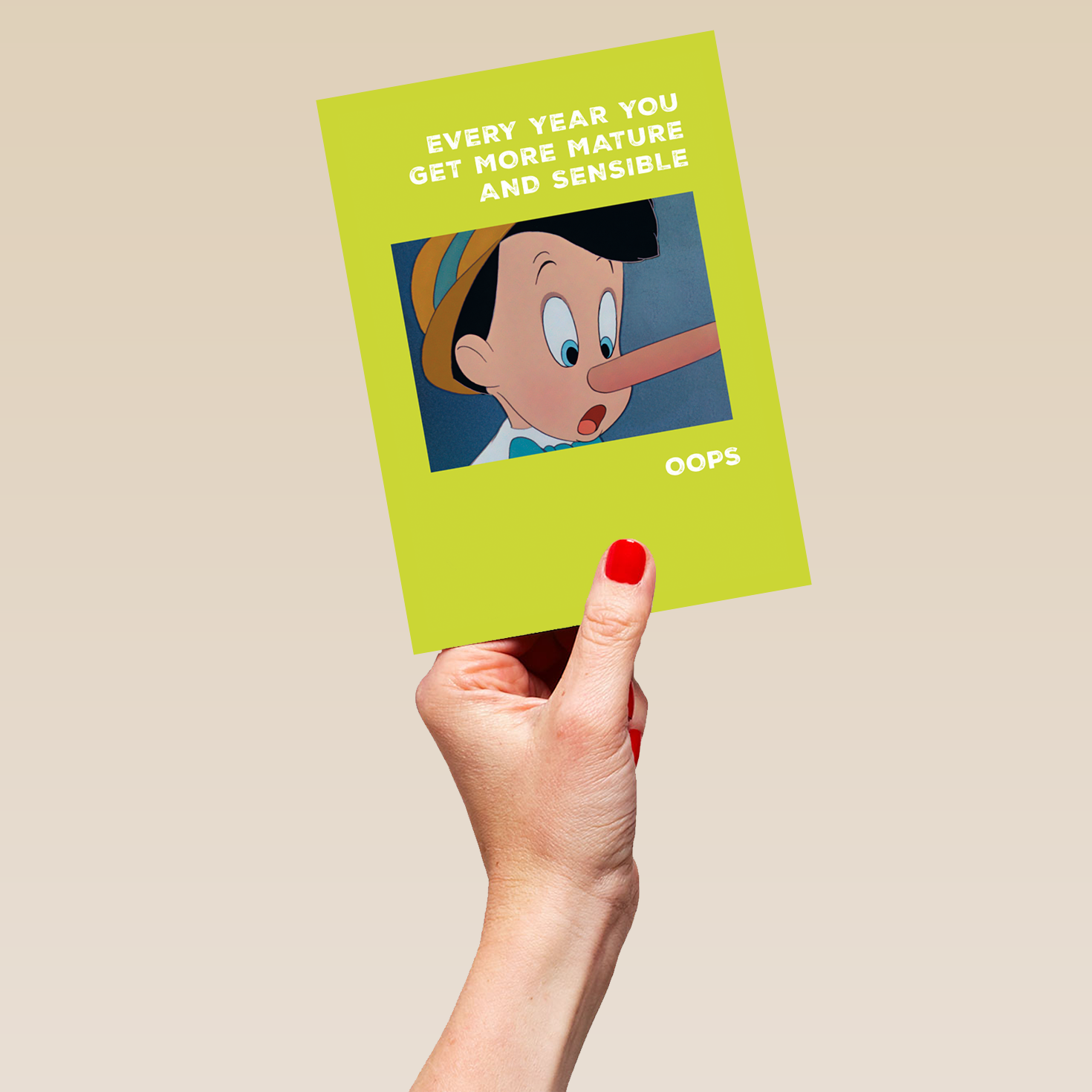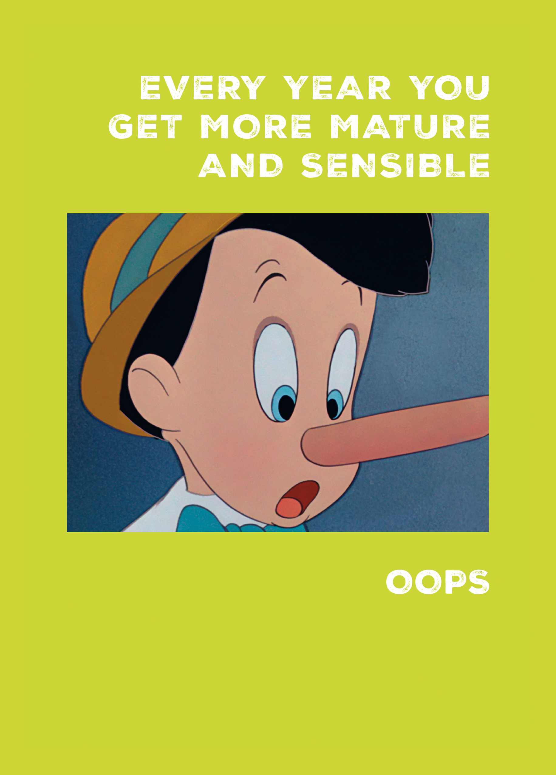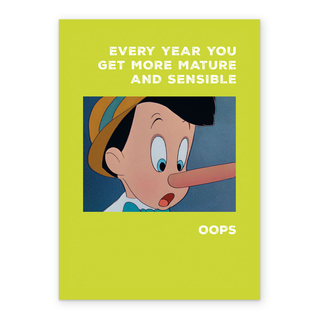 Printed on premium-quality board, this card features Disney's Pinocchio with his super long nose, with the message 'Every Year You Get More Mature And Sensible. Oops', and comes complete with a co-ordinating white envelope.