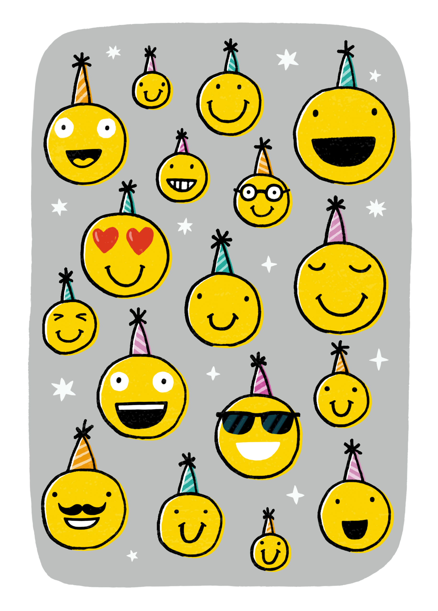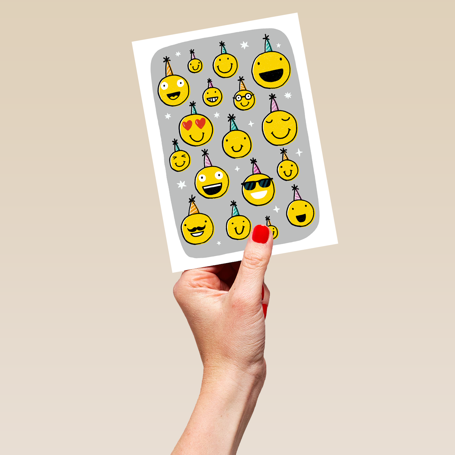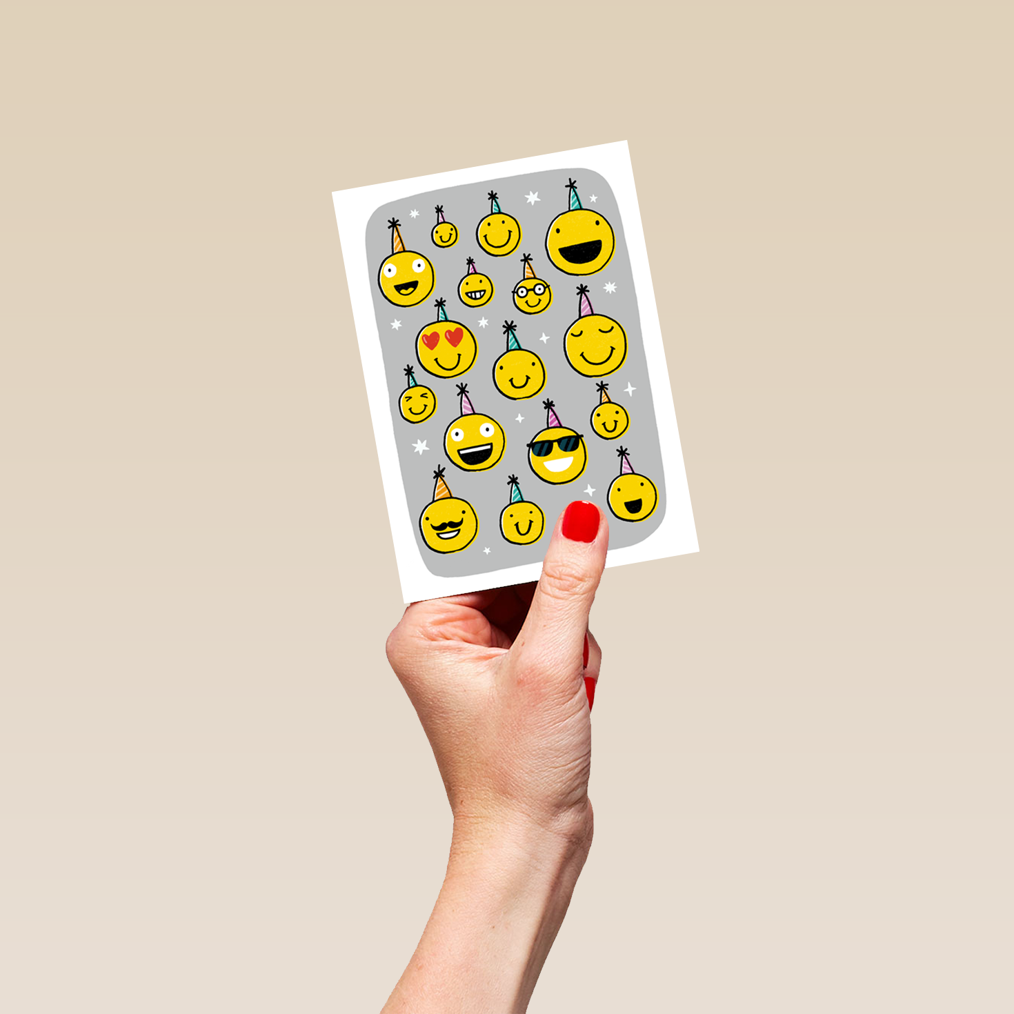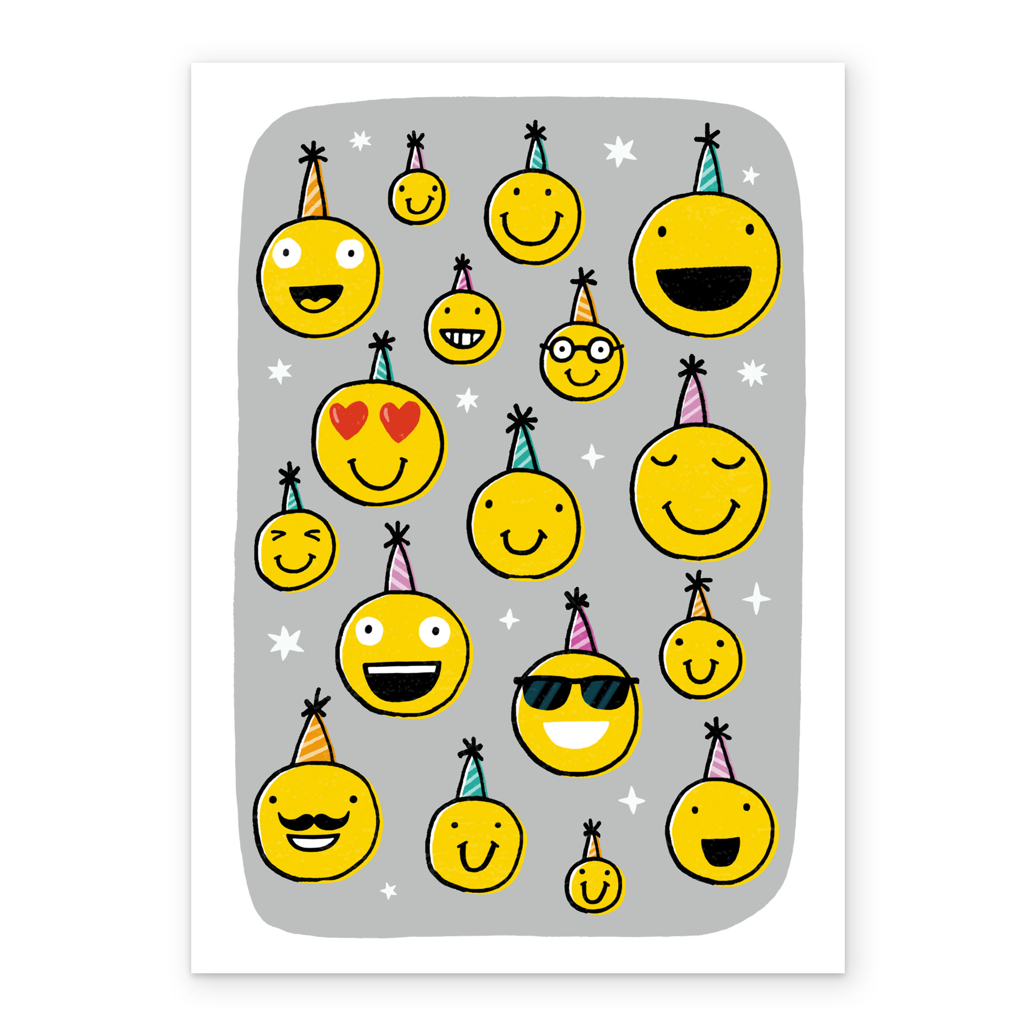Printed on premium-quality board, this card features a bunch of fun and happy yellow smiley faces, and comes complete with a co-ordinating white envelope.