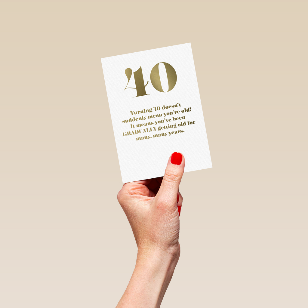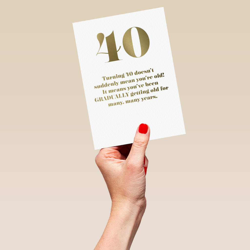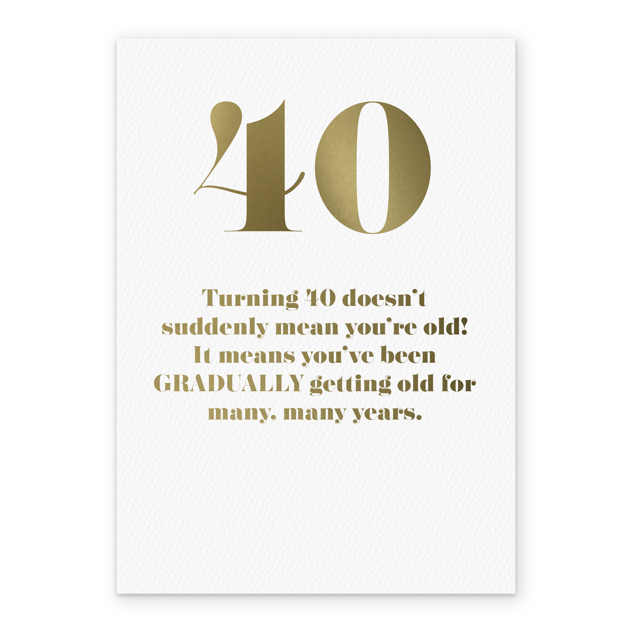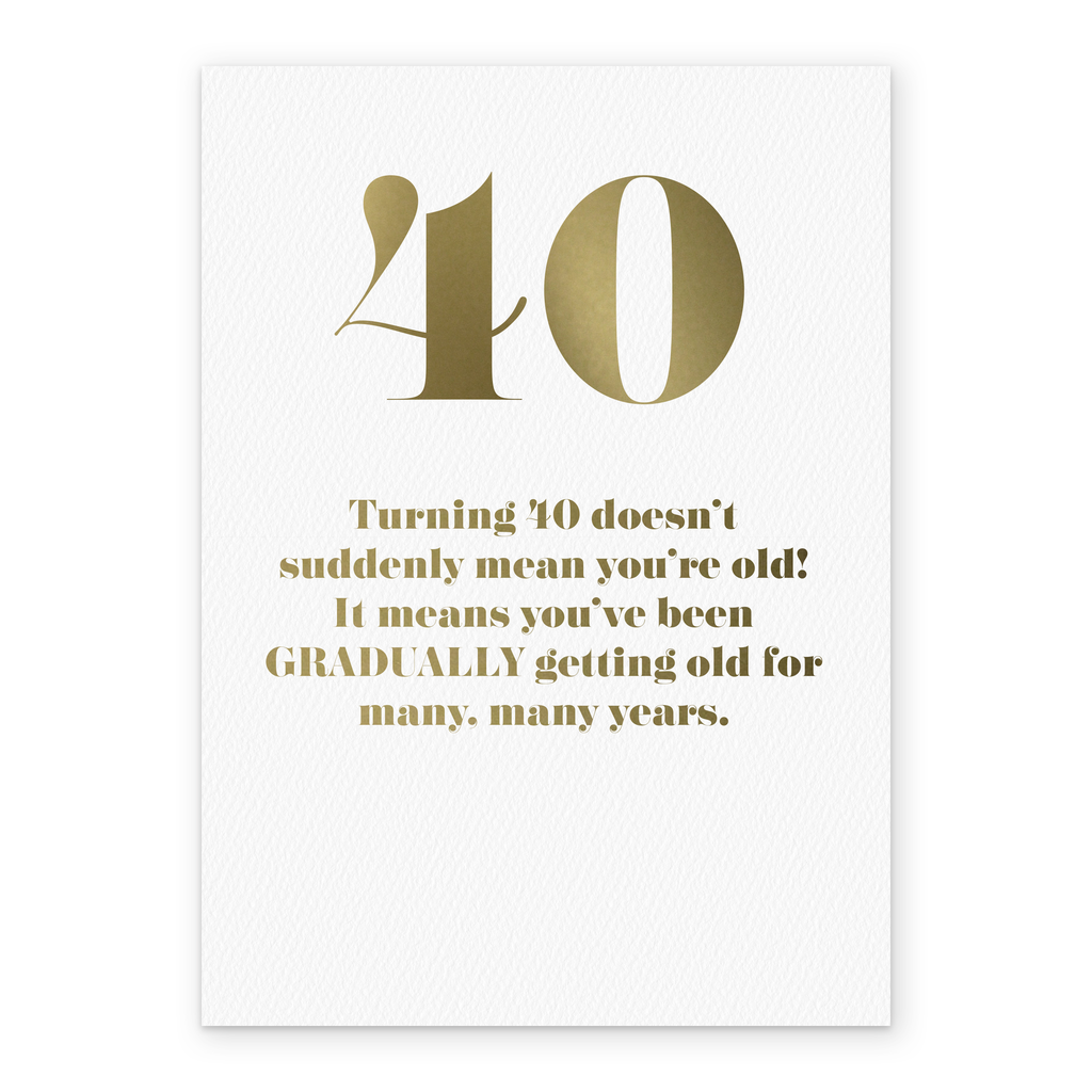 Printed on premium-quality board, this card features a large number forty and contemporary gold text on a white background, with the message 'Turning 40 doesn't suddenly mean you're old! It means you've been GRADUALLY getting old for many, many years.', and comes complete with a co-ordinating white envelope.
