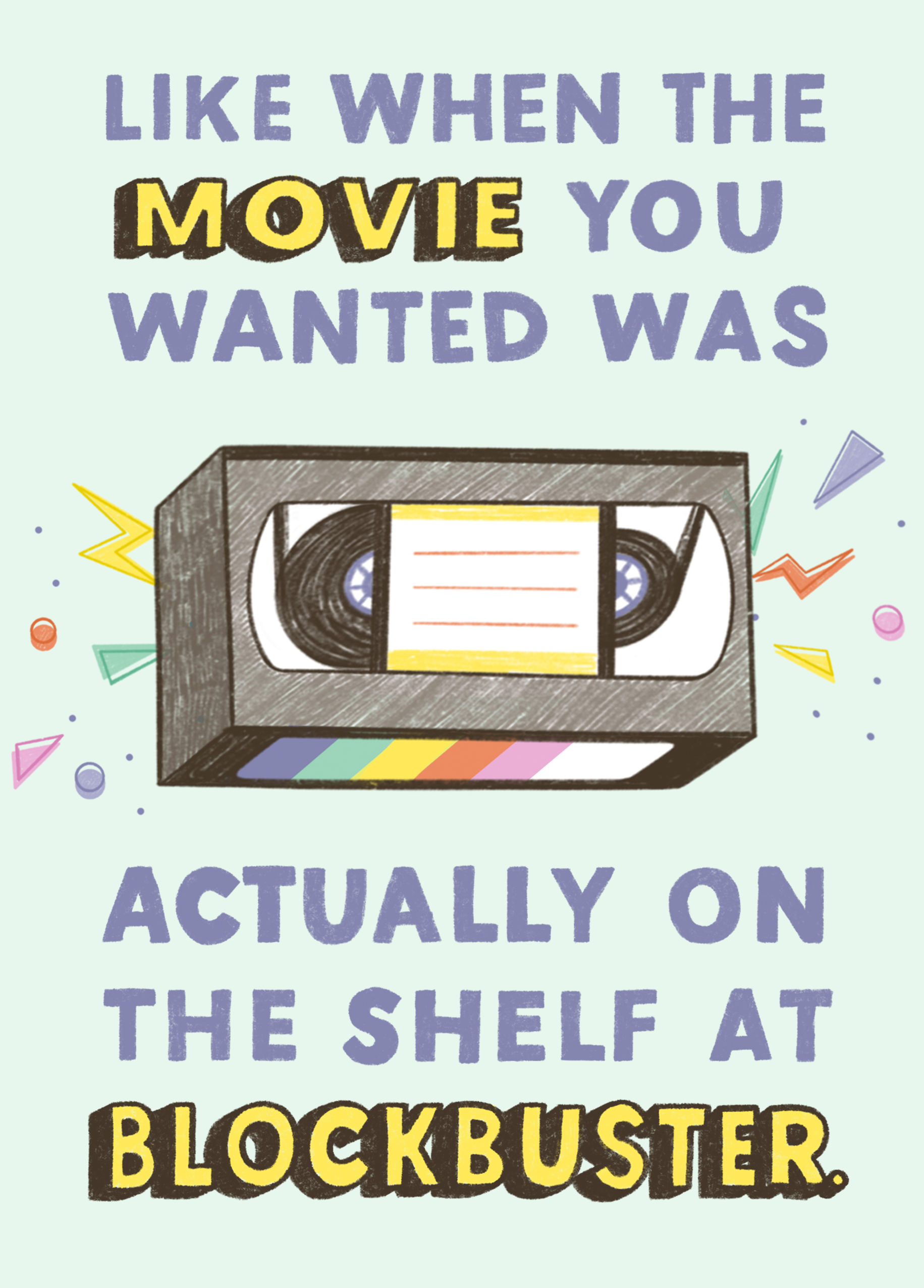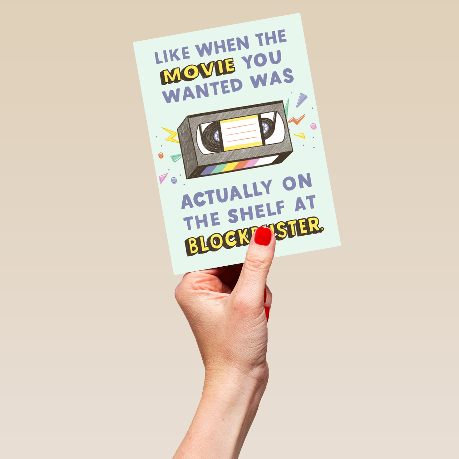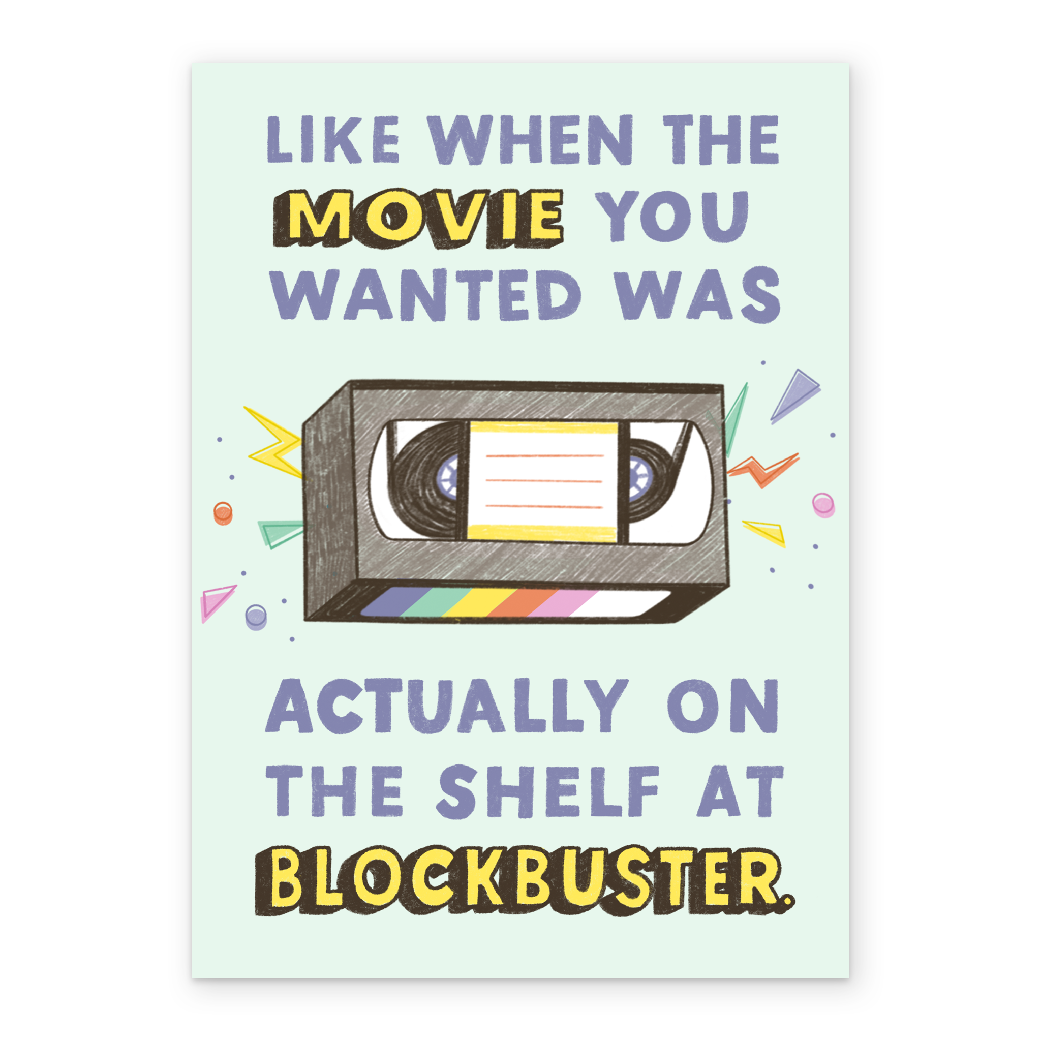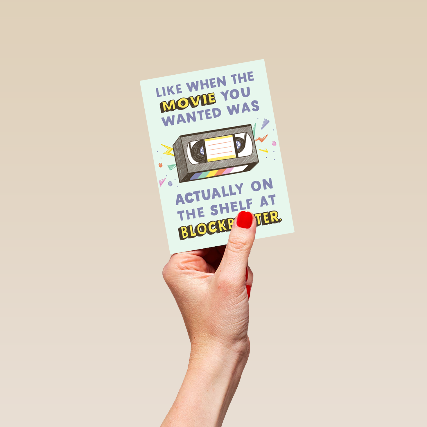 Printed on premium-quality board, this card features an illustration of a VHS tape, with the message 'Like When The Movie You Wanted Was Actually On The Shelf At Blockbuster.', and comes complete with a co-ordinating white envelope.