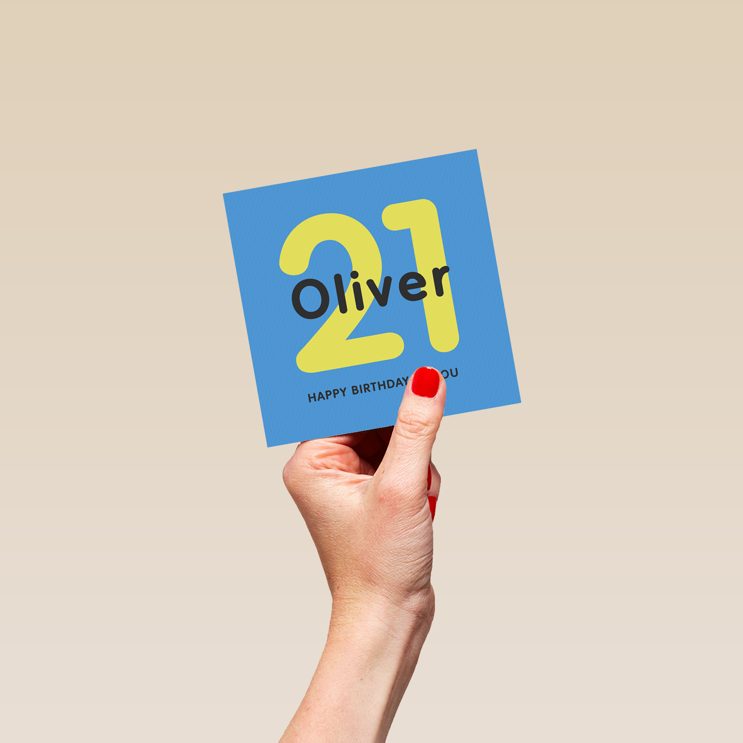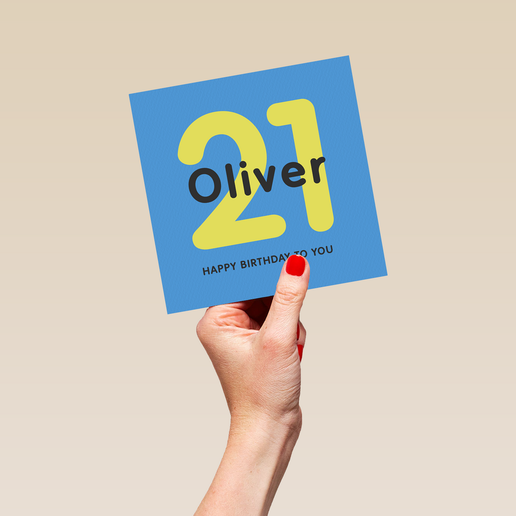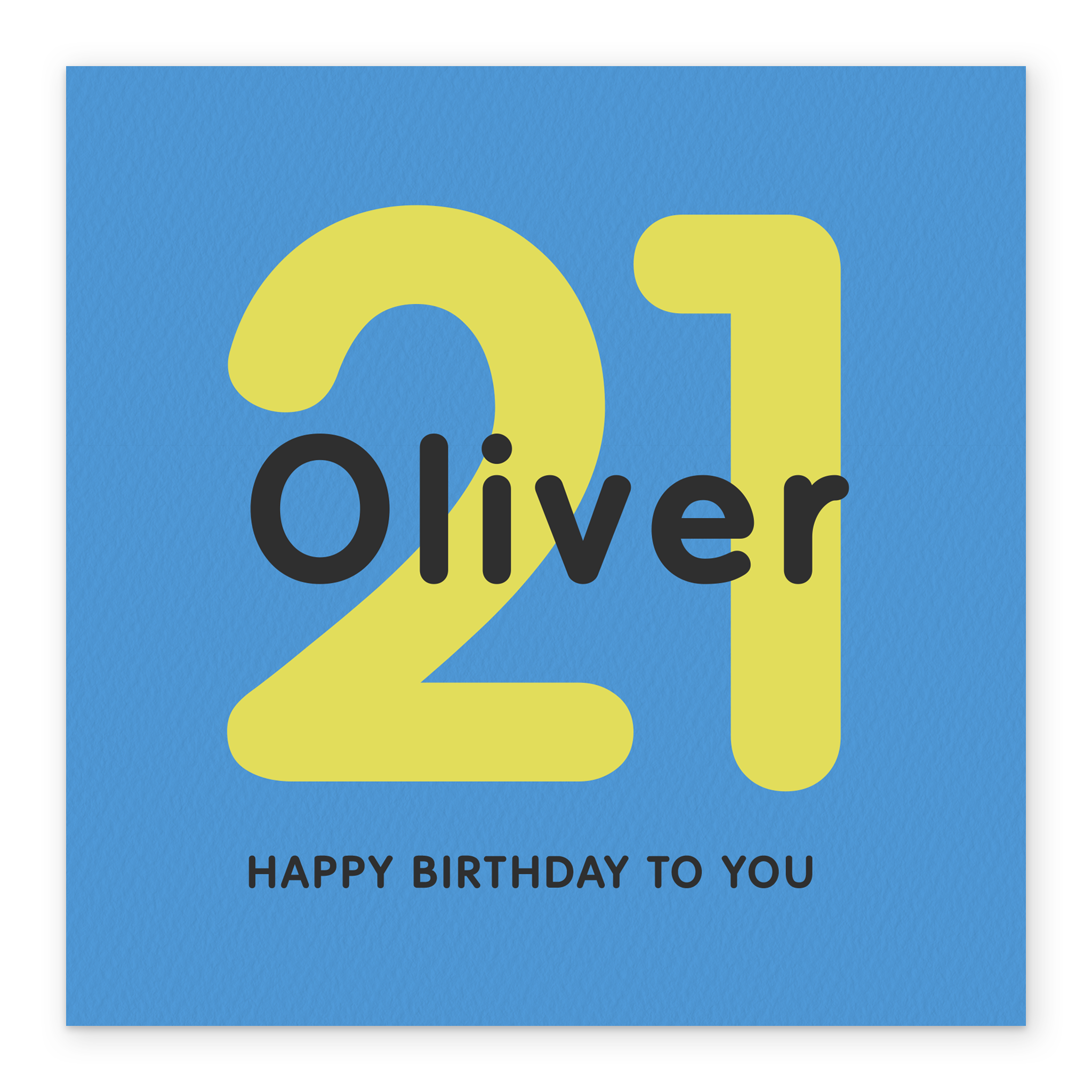Printed on premium-quality board, this card features a large yellow number twenty-one with bold black text on a blue background, with the message '21 Happy Birthday To You', space to personalise a name, and comes complete with a co-ordinating white envelope.