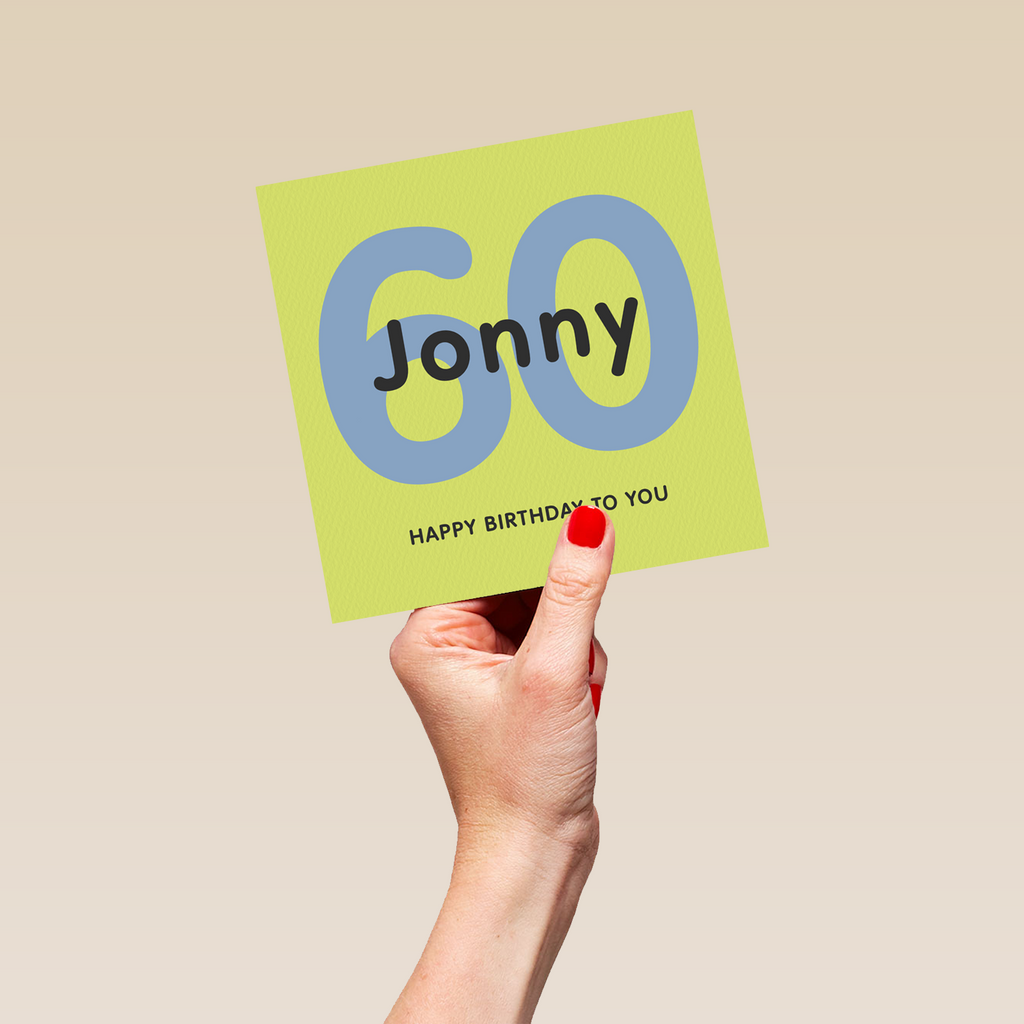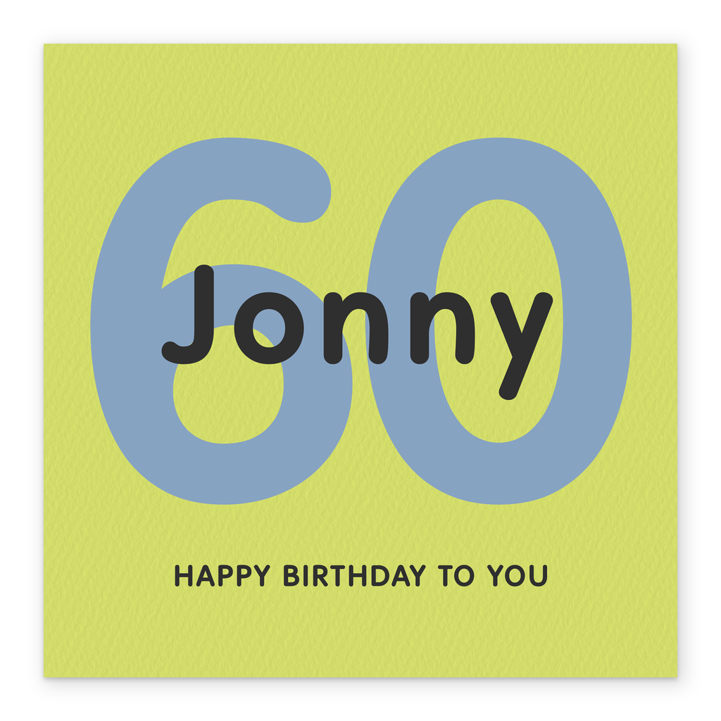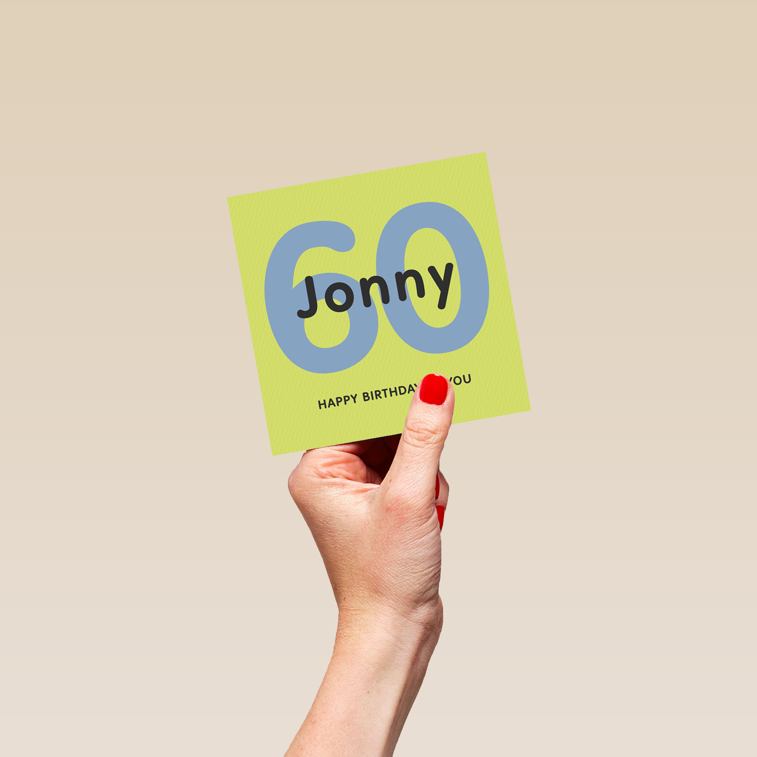 Printed on premium-quality board, this card features a large blue number sixty with bold black text on a lime green background, with the message '60 Happy Birthday To You', space to personalise a name, and comes complete with a co-ordinating white envelope.