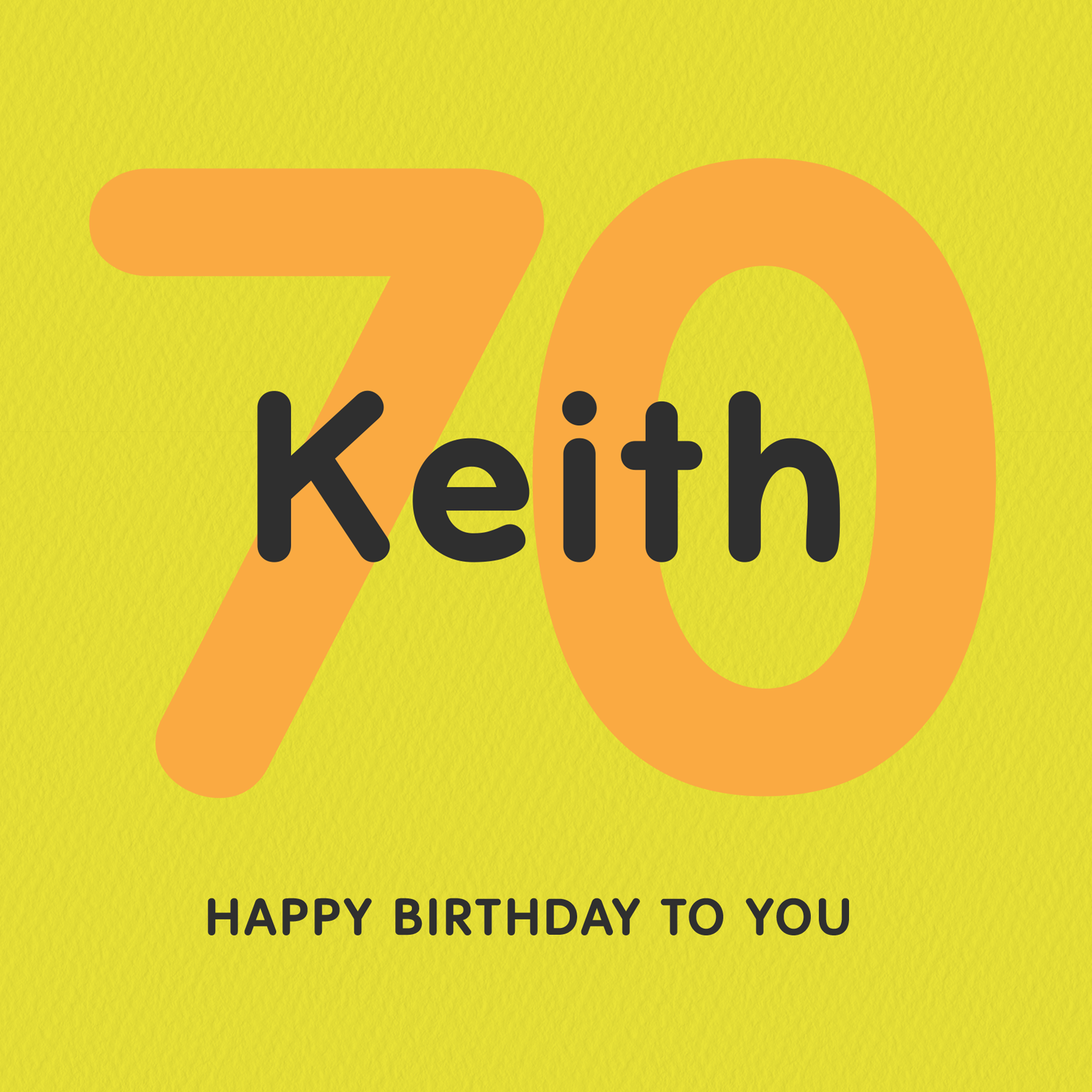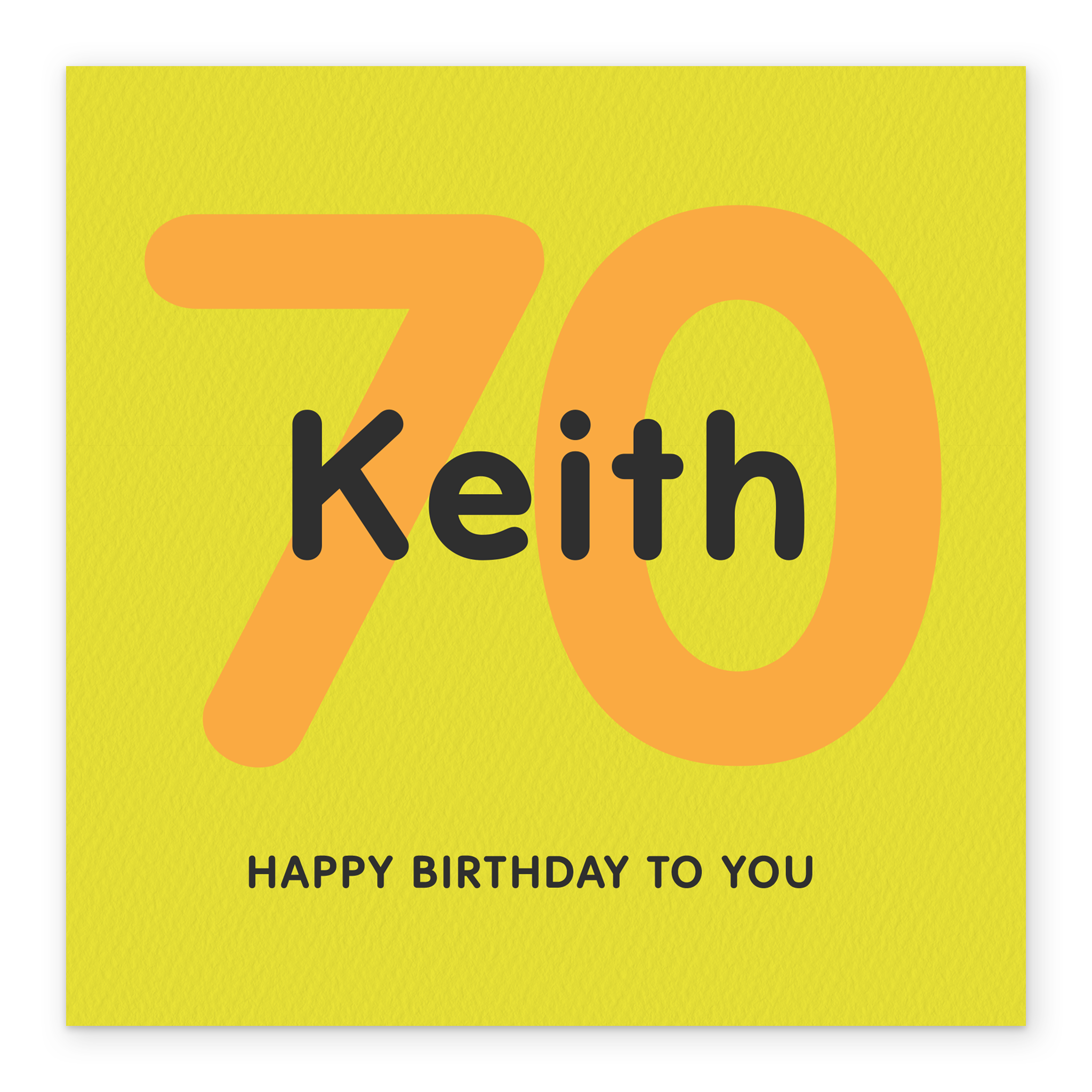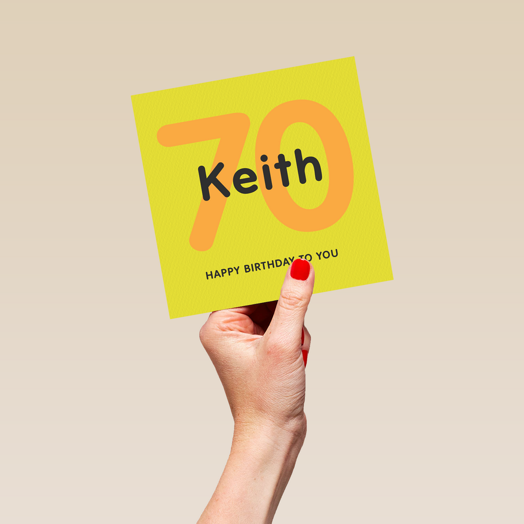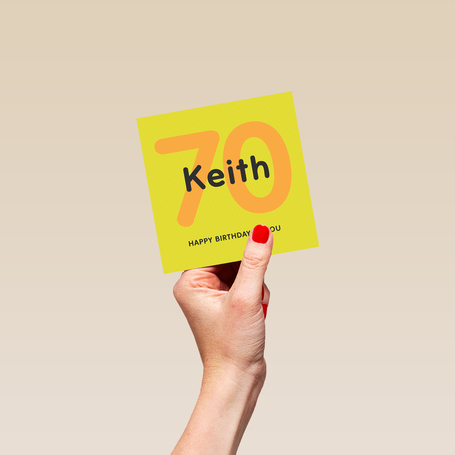 Printed on premium-quality board, this card features a large orange number seventy with bold black text on a yellow background, with the message '70 Happy Birthday To You', space to personalise a name, and comes complete with a co-ordinating white envelope.