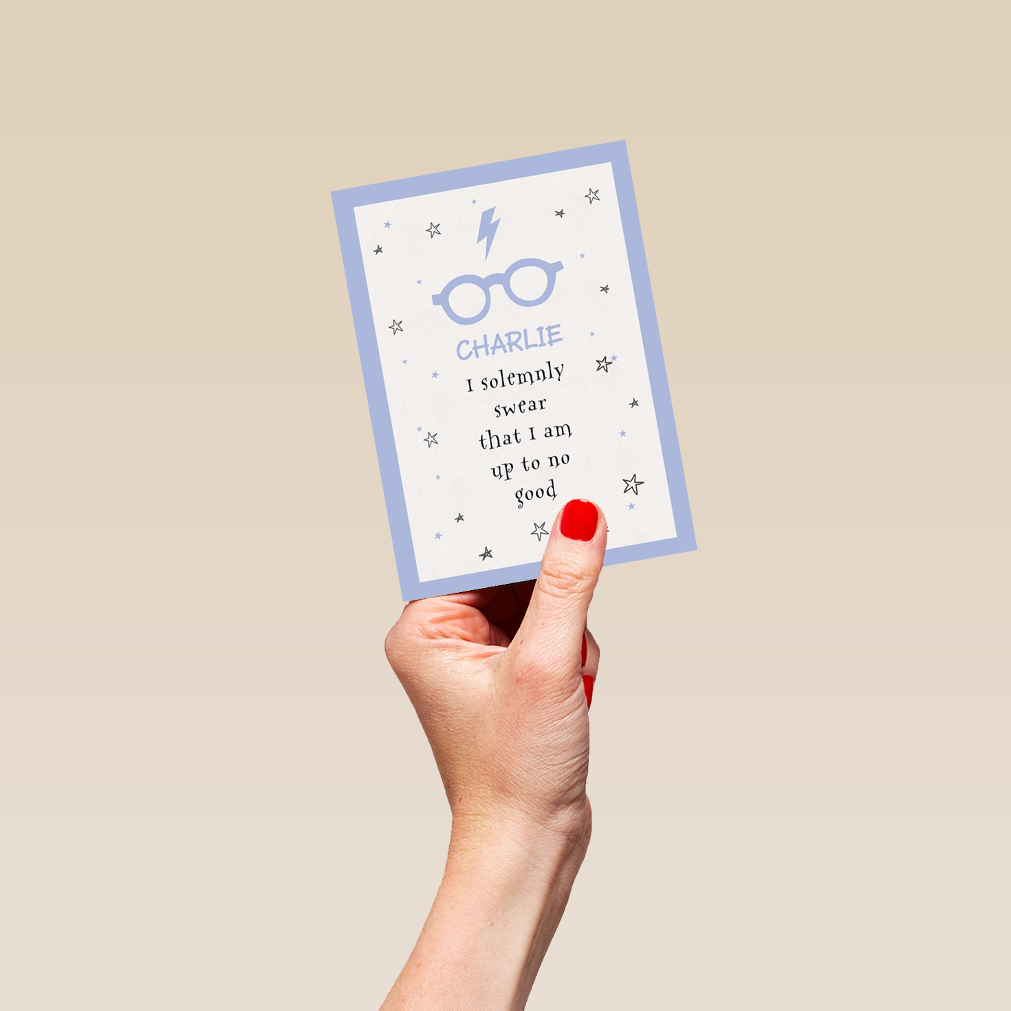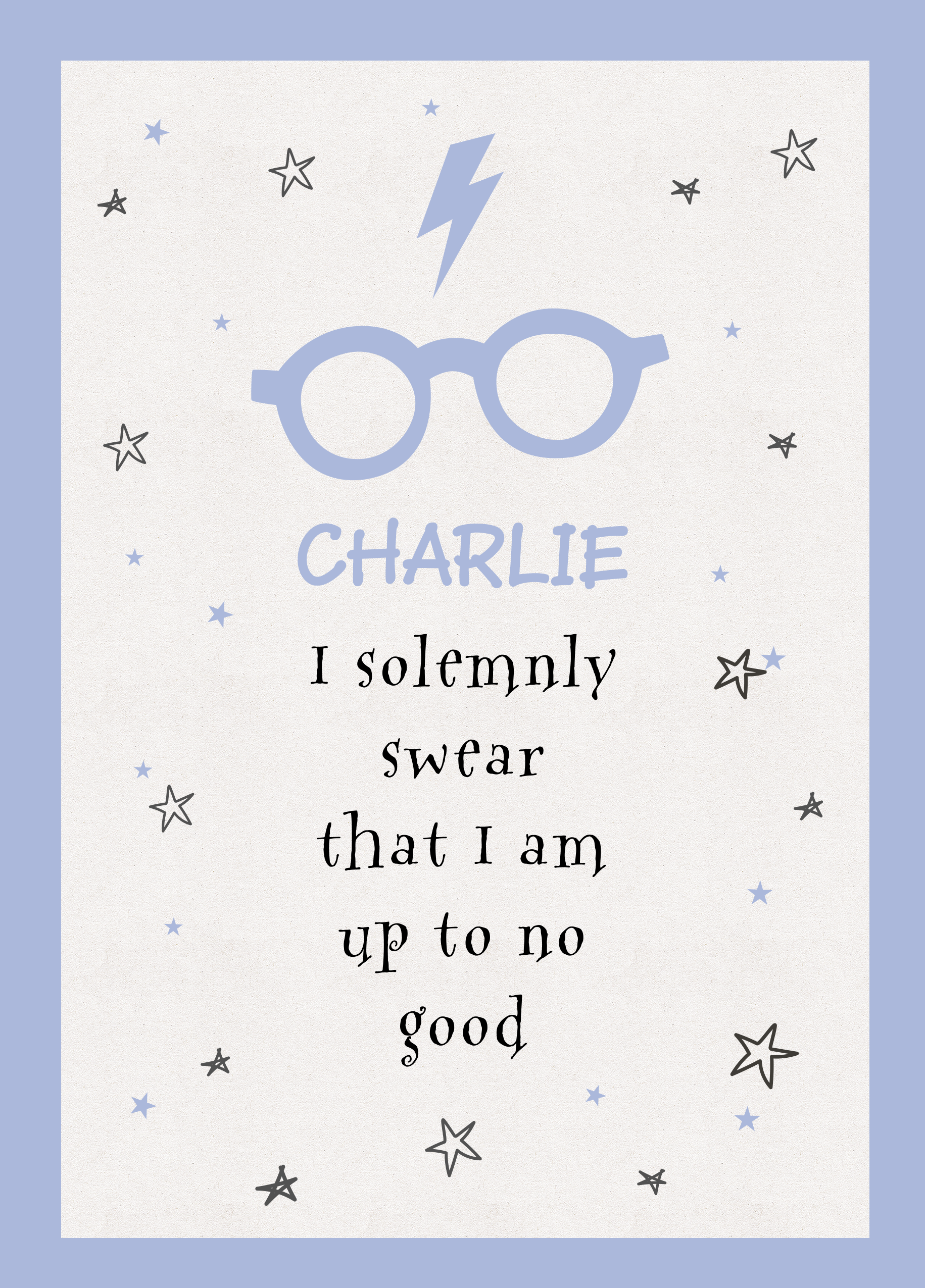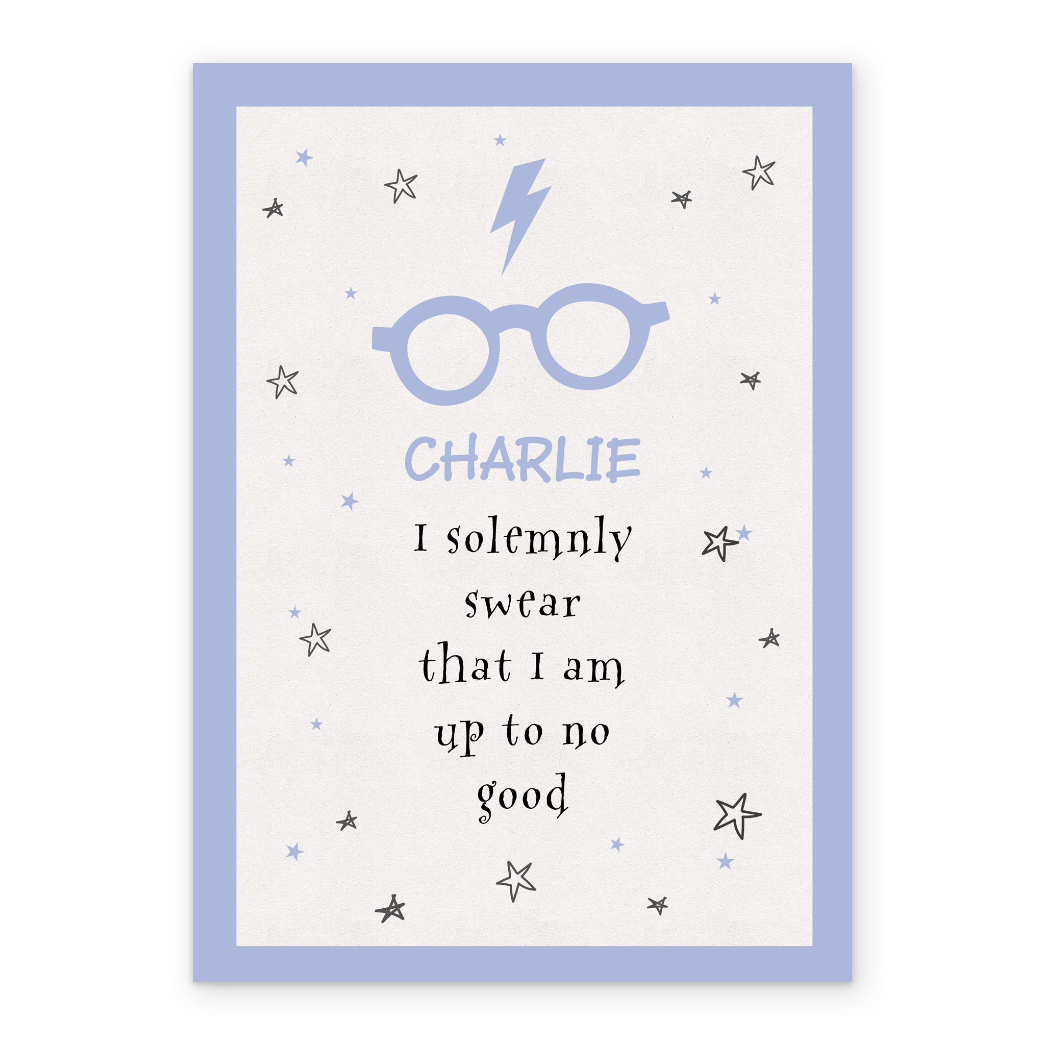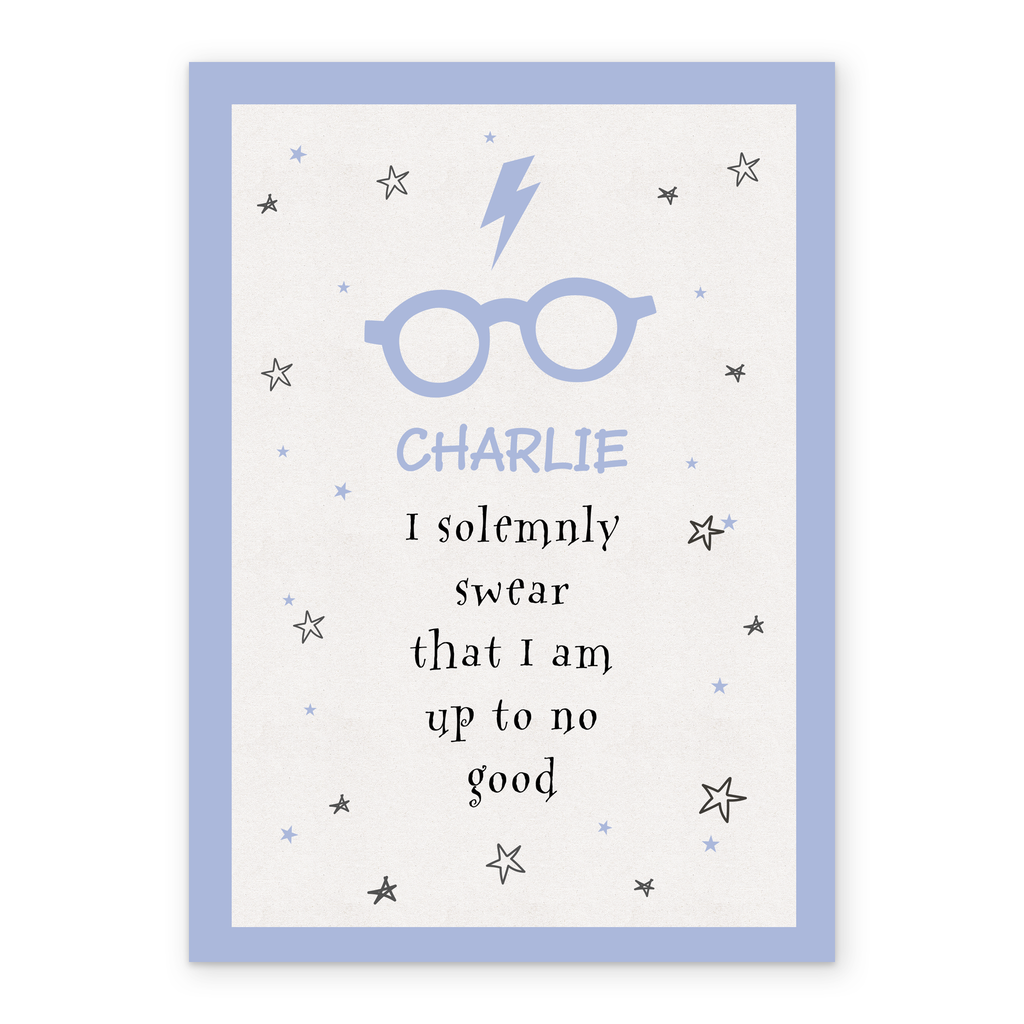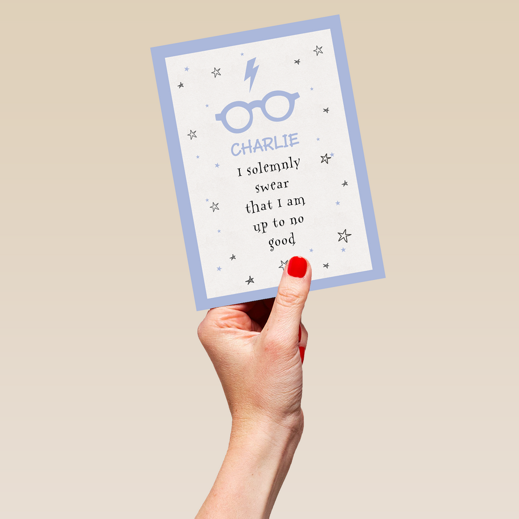 Printed on premium-quality board, this card features Harry Potter's glasses and iconic scar, on a white background adorned with stars and a light blue border, with the message 'I solemnly swear that I am up to no good', space to personalise a name, and comes complete with a co-ordinating white envelope.