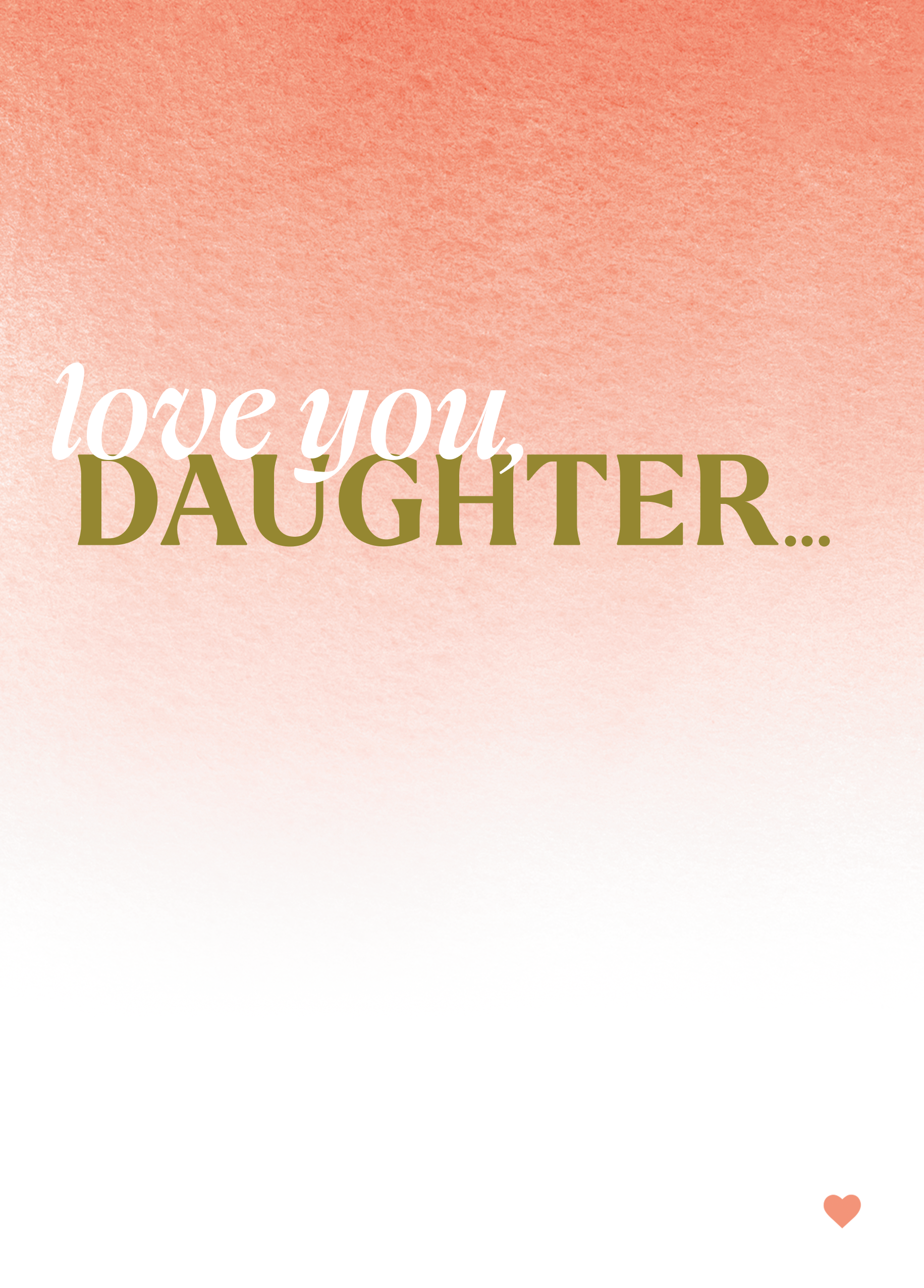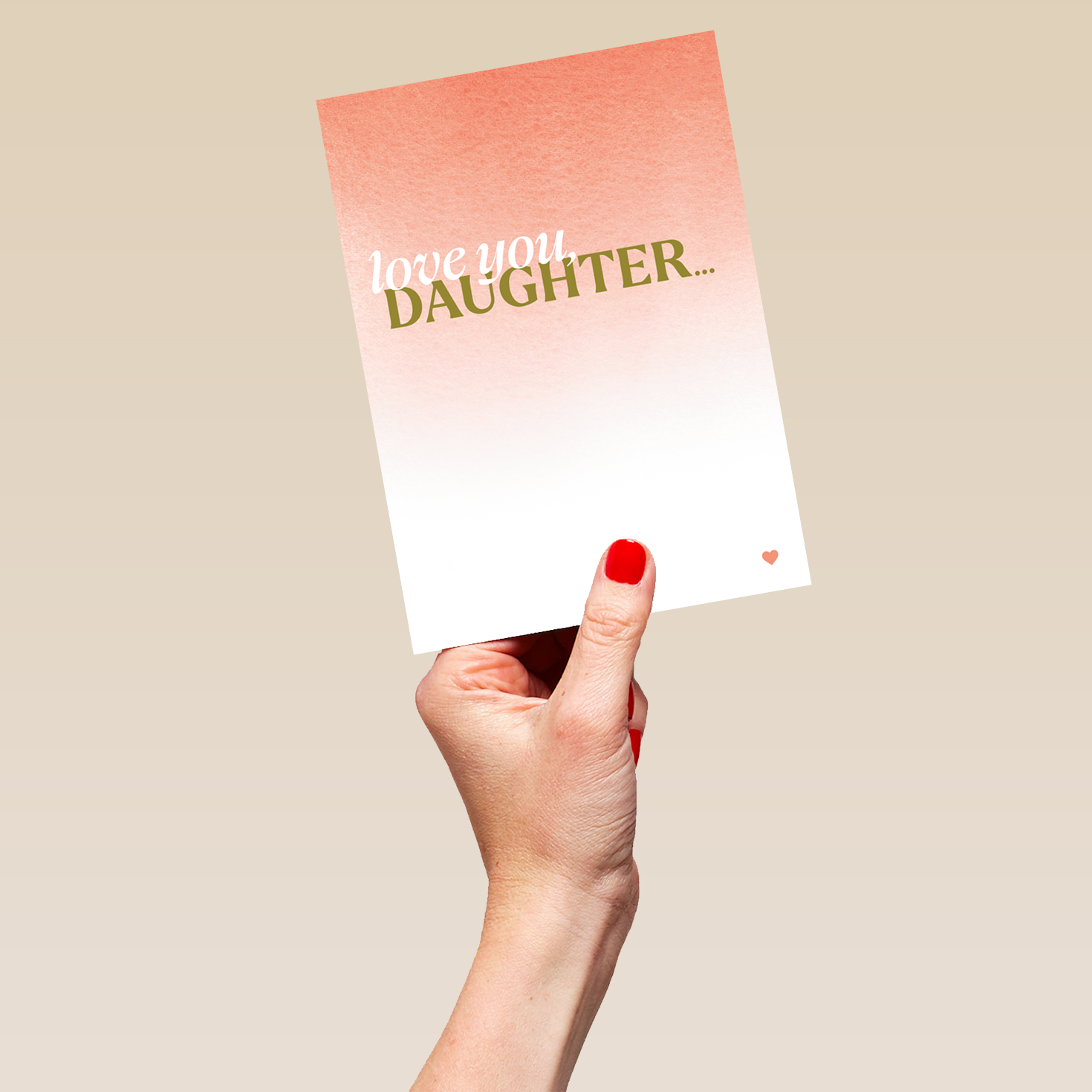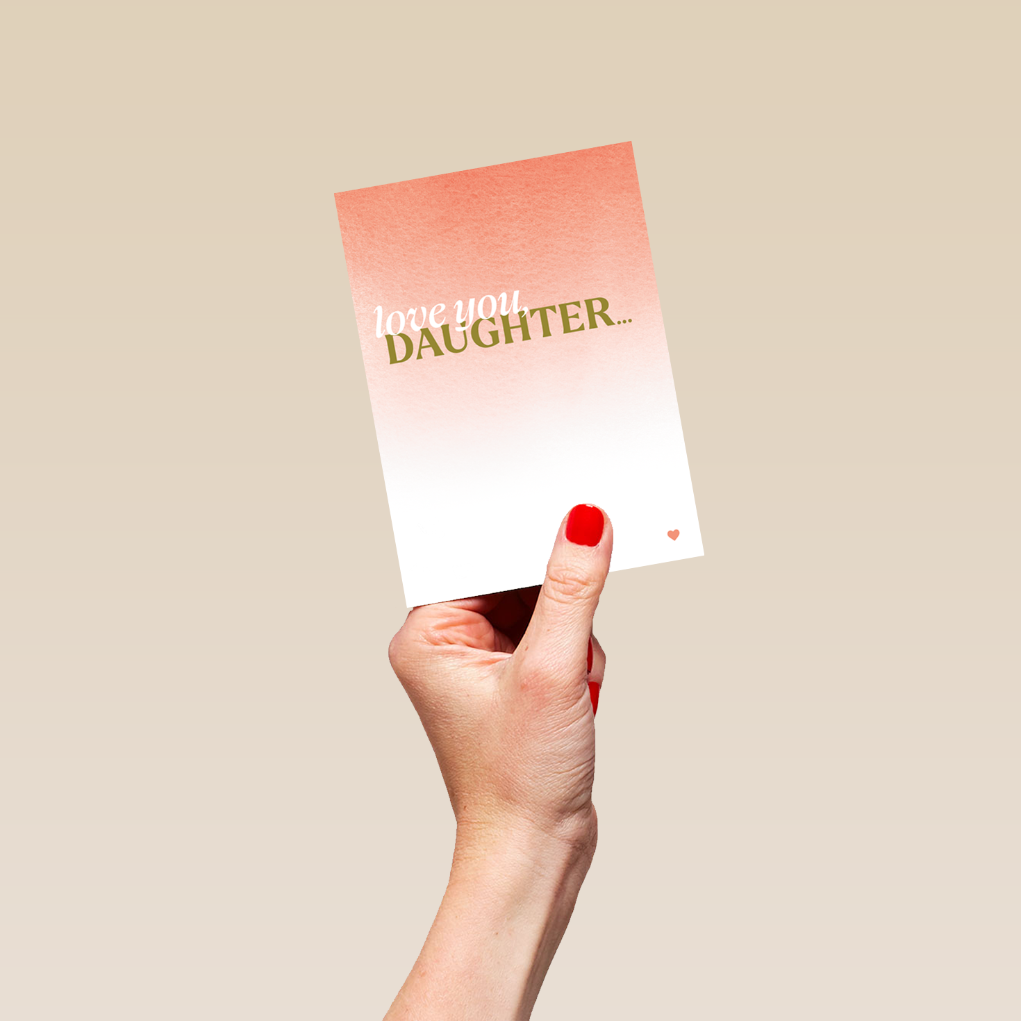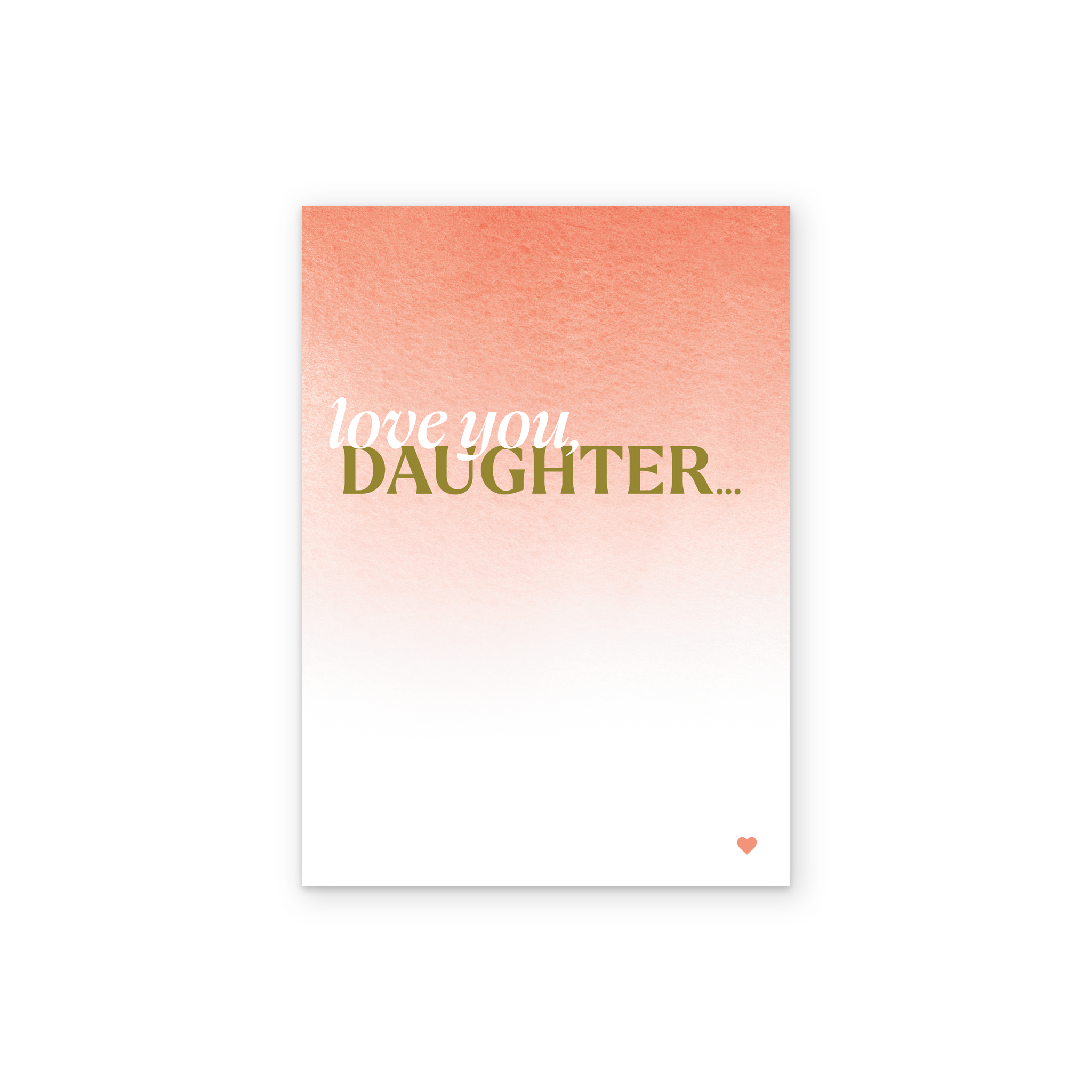 Printed on premium-quality board, this card features an ombre peach and white background with white and gold lettering, with the message 'Love you, Daughter…', and comes complete with a co-ordinating white envelope.