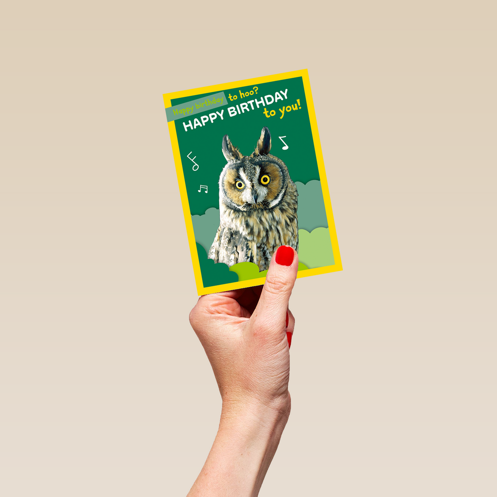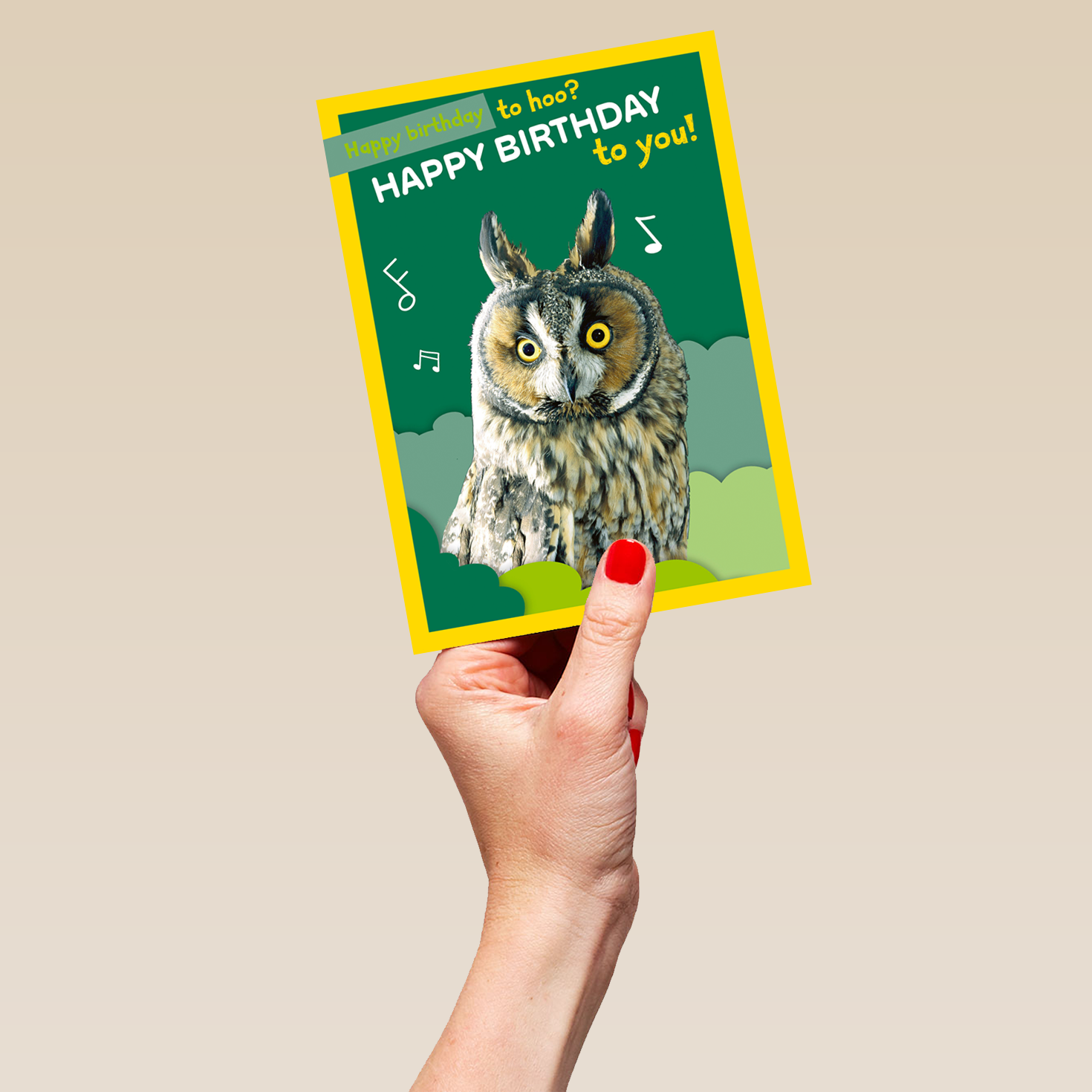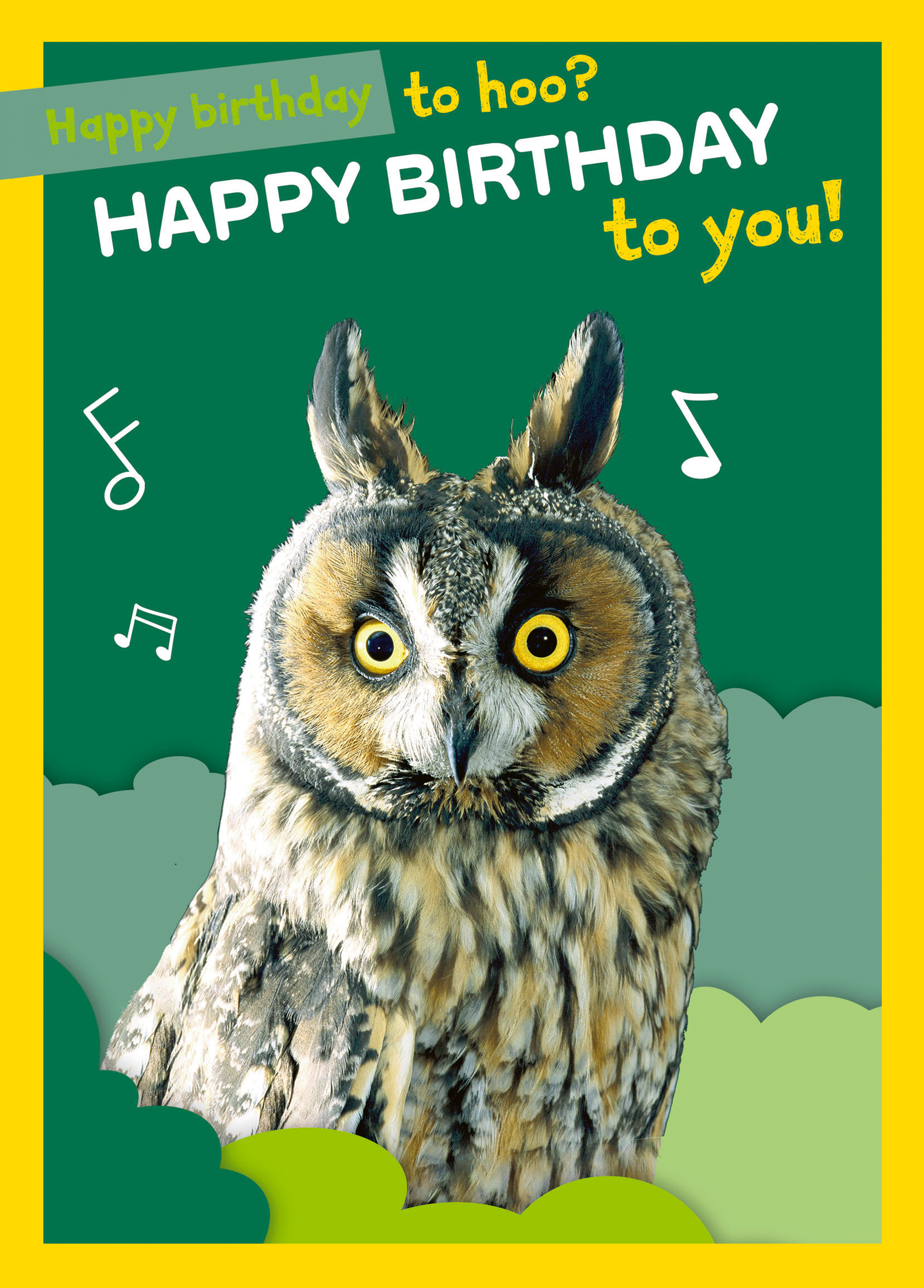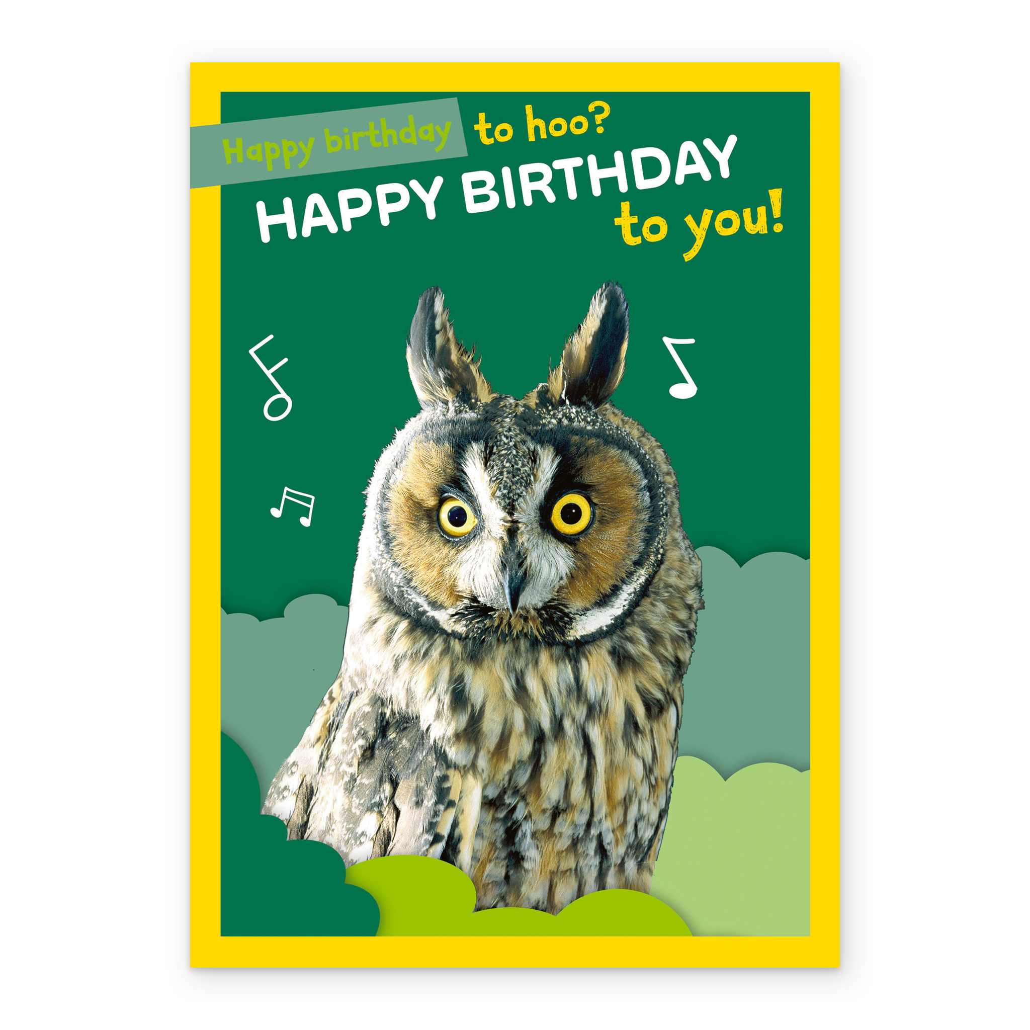 Printed on premium-quality board, this card features a great horned owl looking surprised with musical notes around it, with the message 'Happy birthday to hoo? Happy birthday to you!', and comes complete with a co-ordinating white envelope.