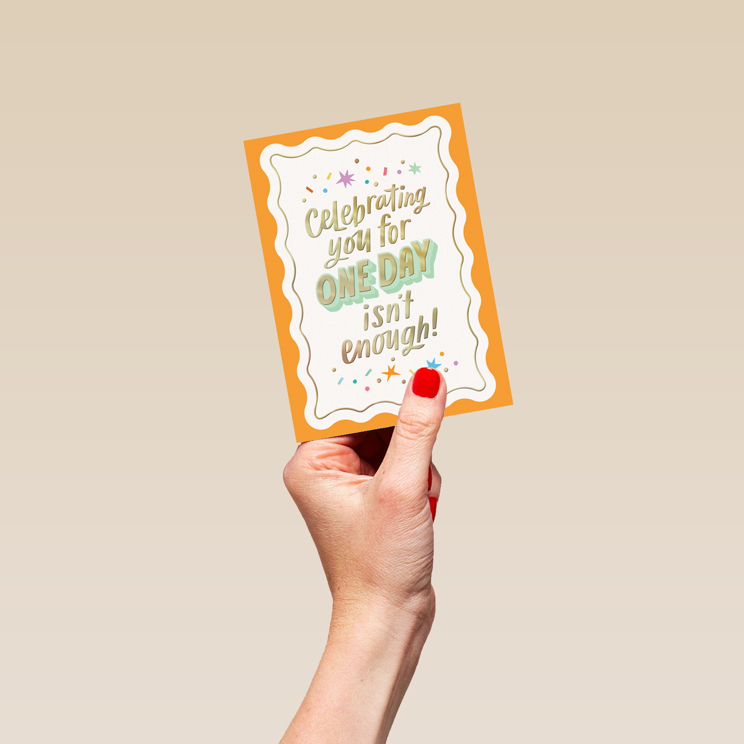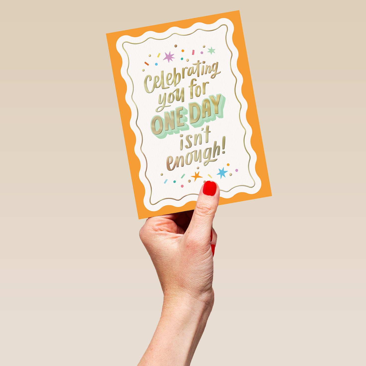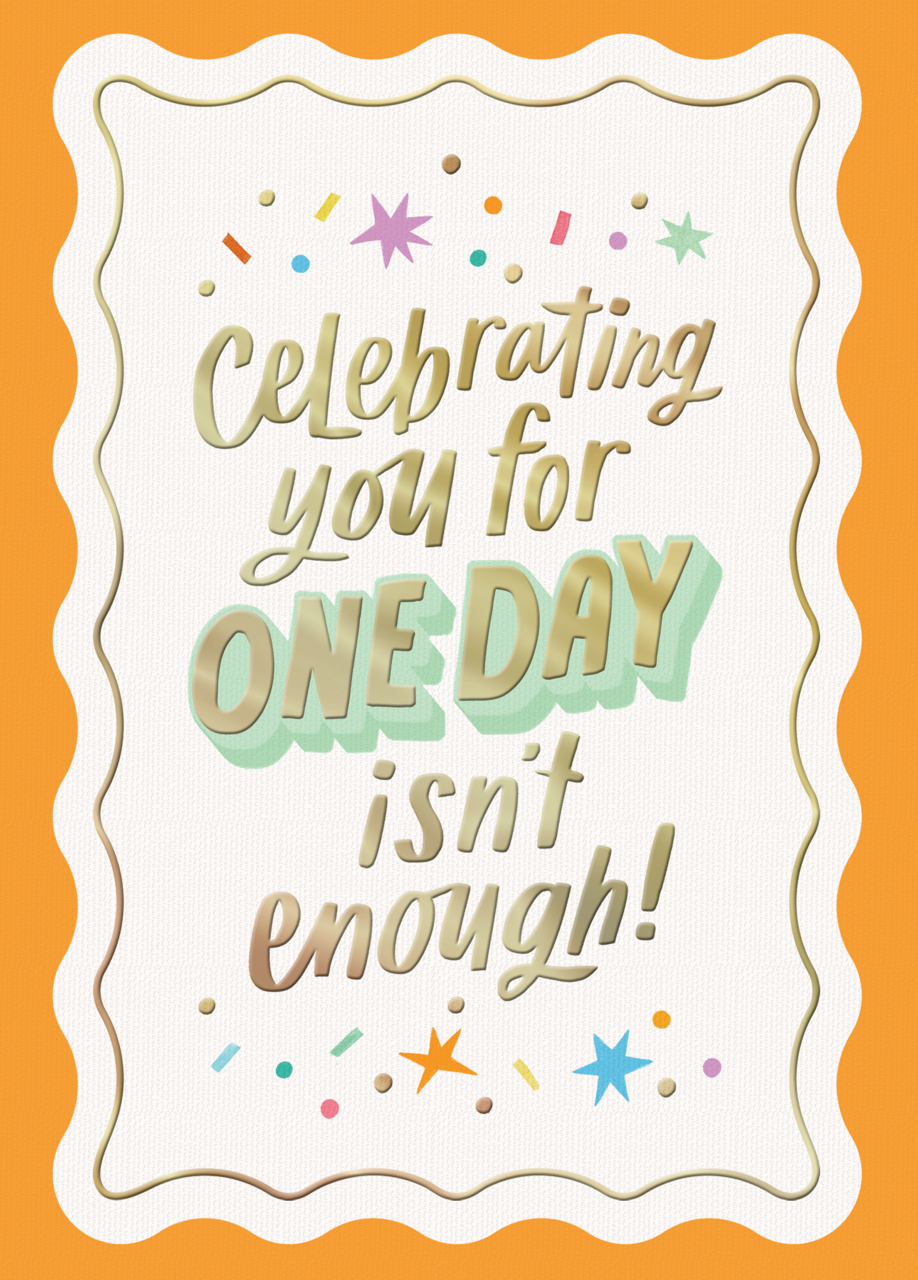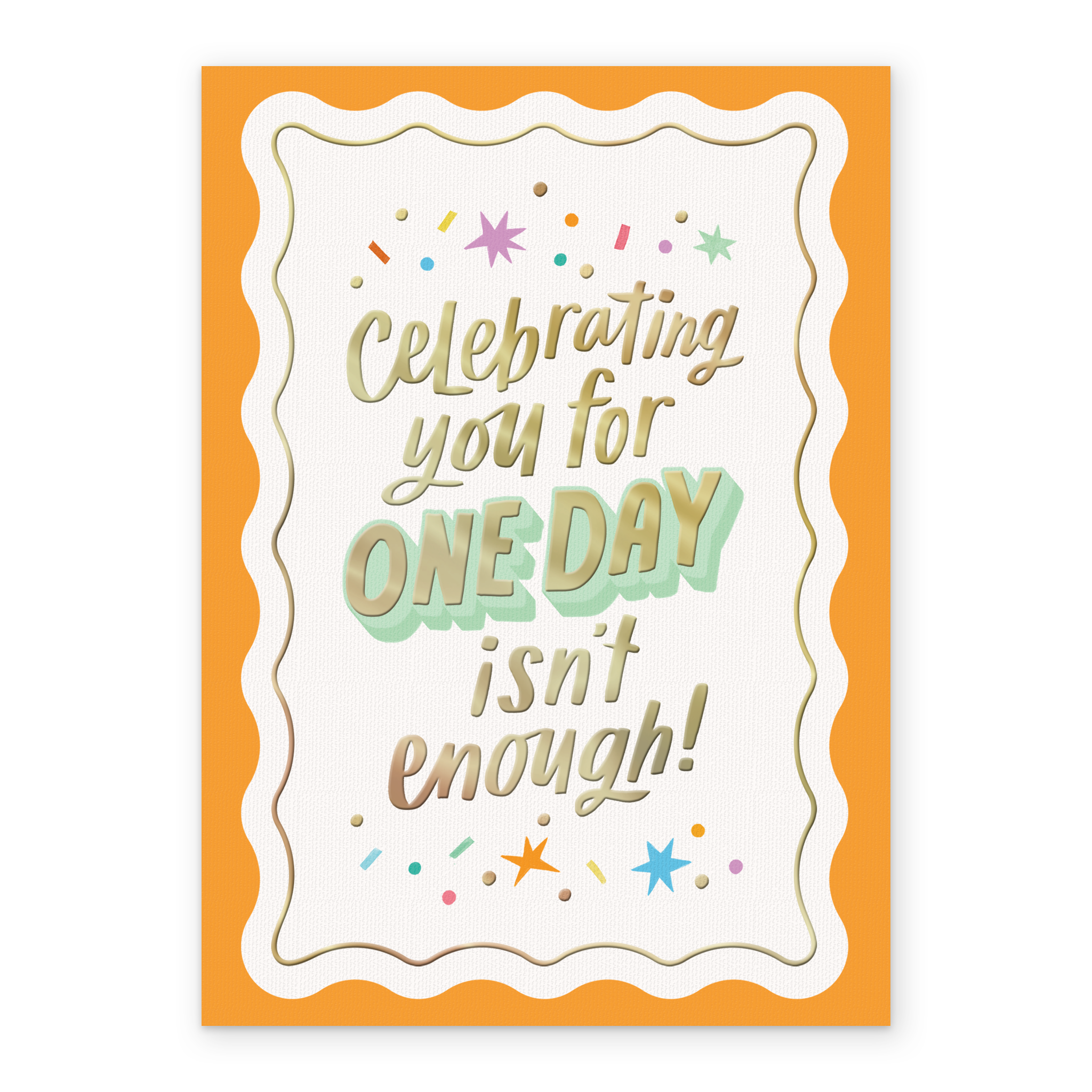 Printed on premium-quality board, this card features an orange border around an off white central panel decorated with multi-coloured stars and confetti shapes surrounding gold coloured lettering, with the message 'Celebrating you for ONE DAY isn't enough!', and comes complete with a co-ordinating white envelope.