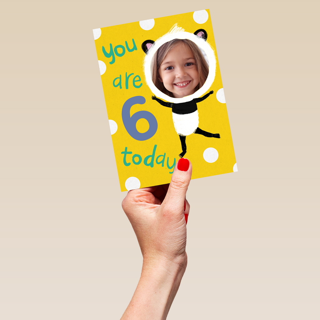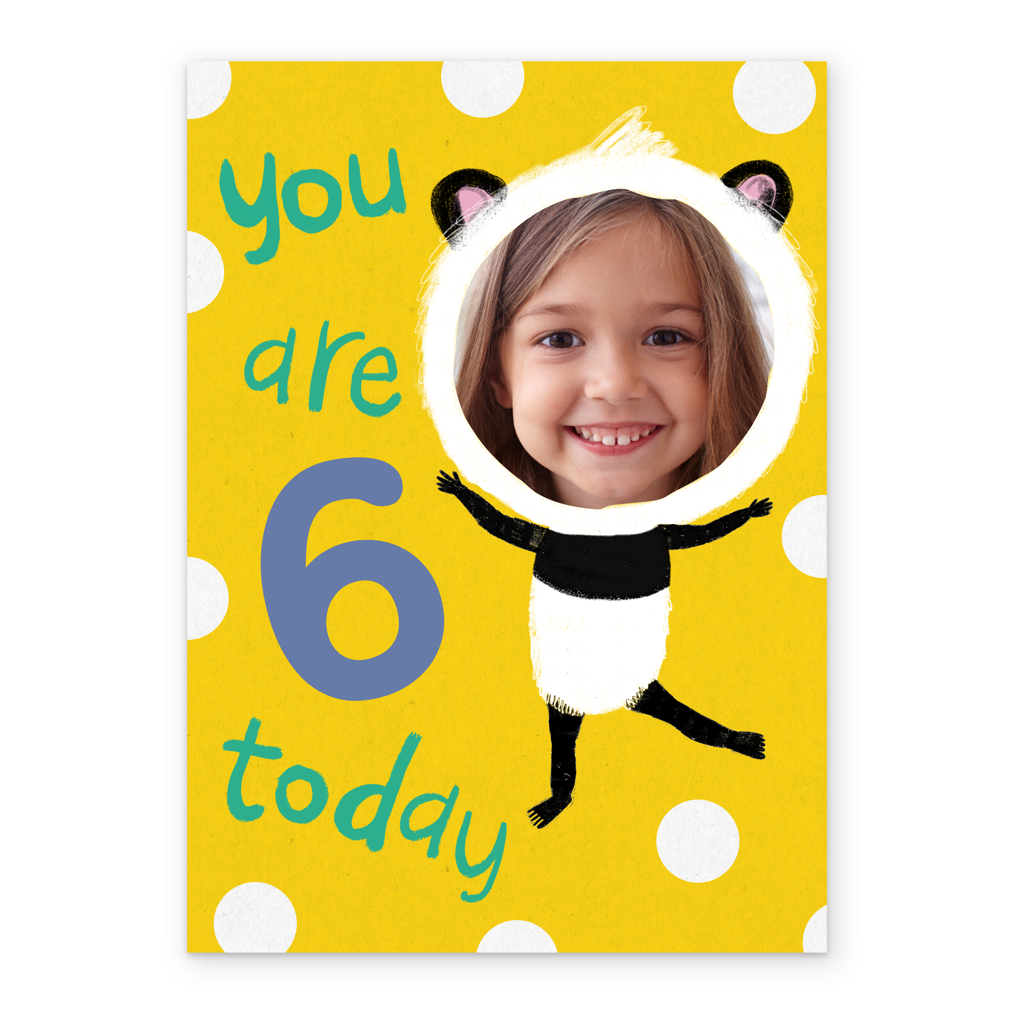 Printed on premium-quality board, this card features a cute illustrated panda and contemporary green text on a yellow and white-polka-dot background, with the message 'You Are 6 Today', space to upload a photo and personalise the age, and comes complete with a co-ordinating white envelope.