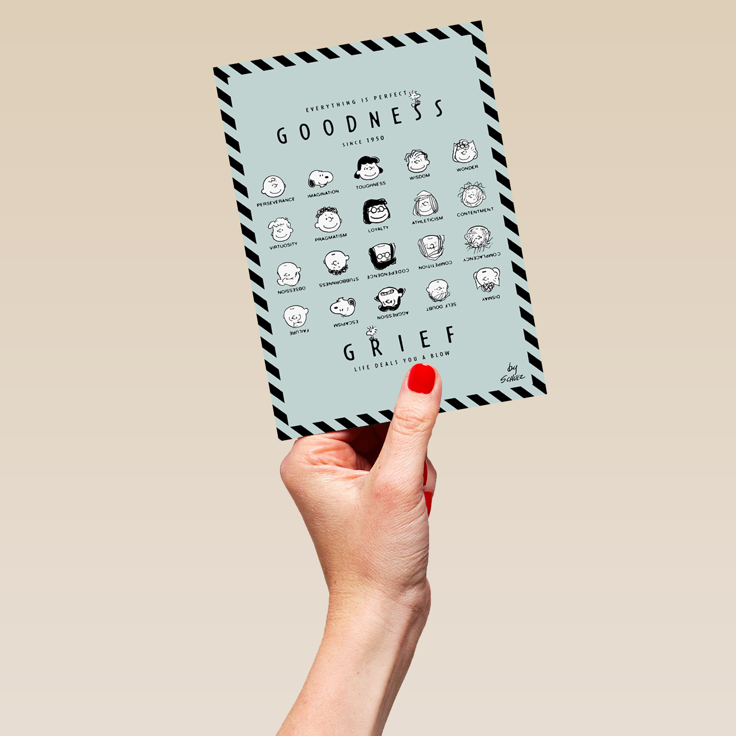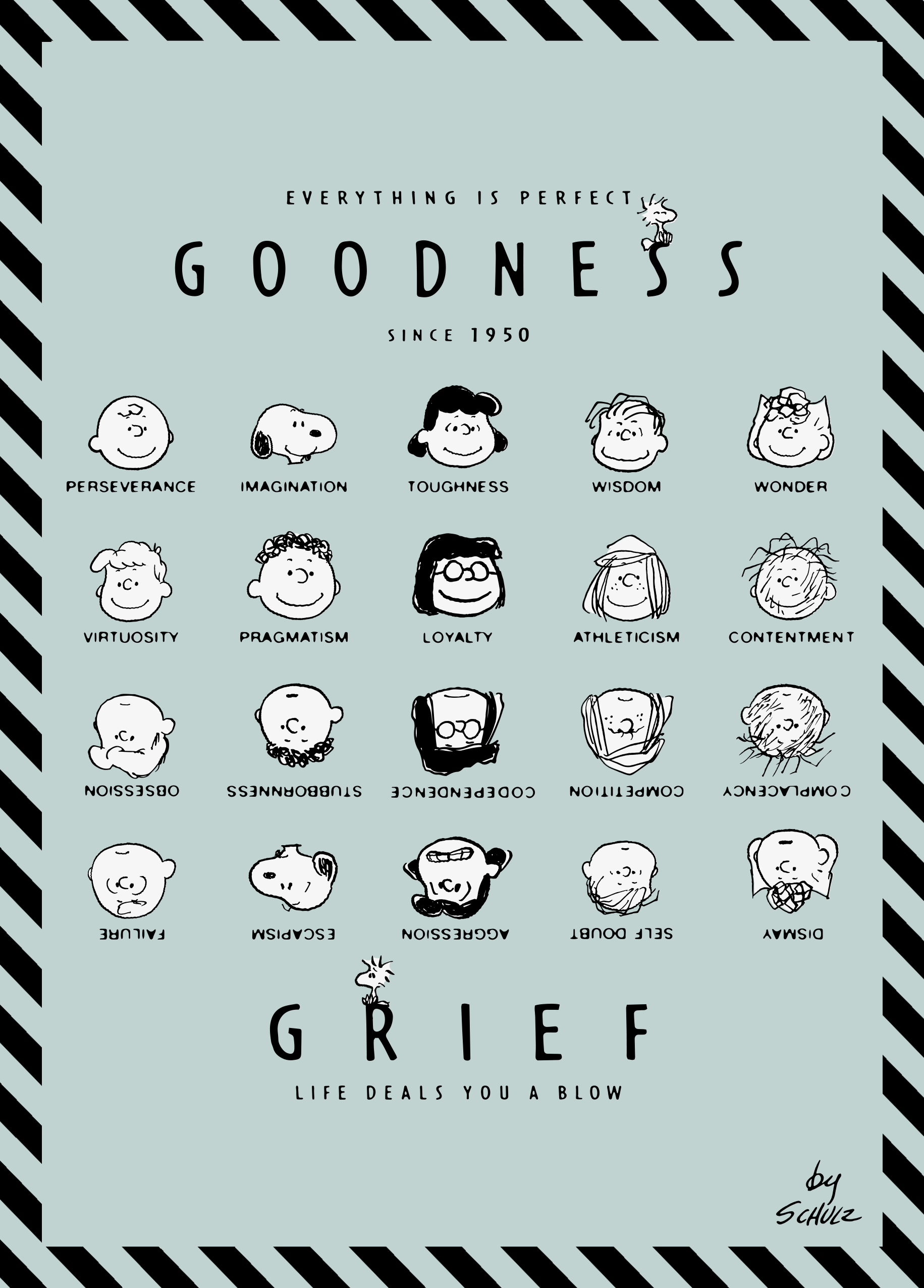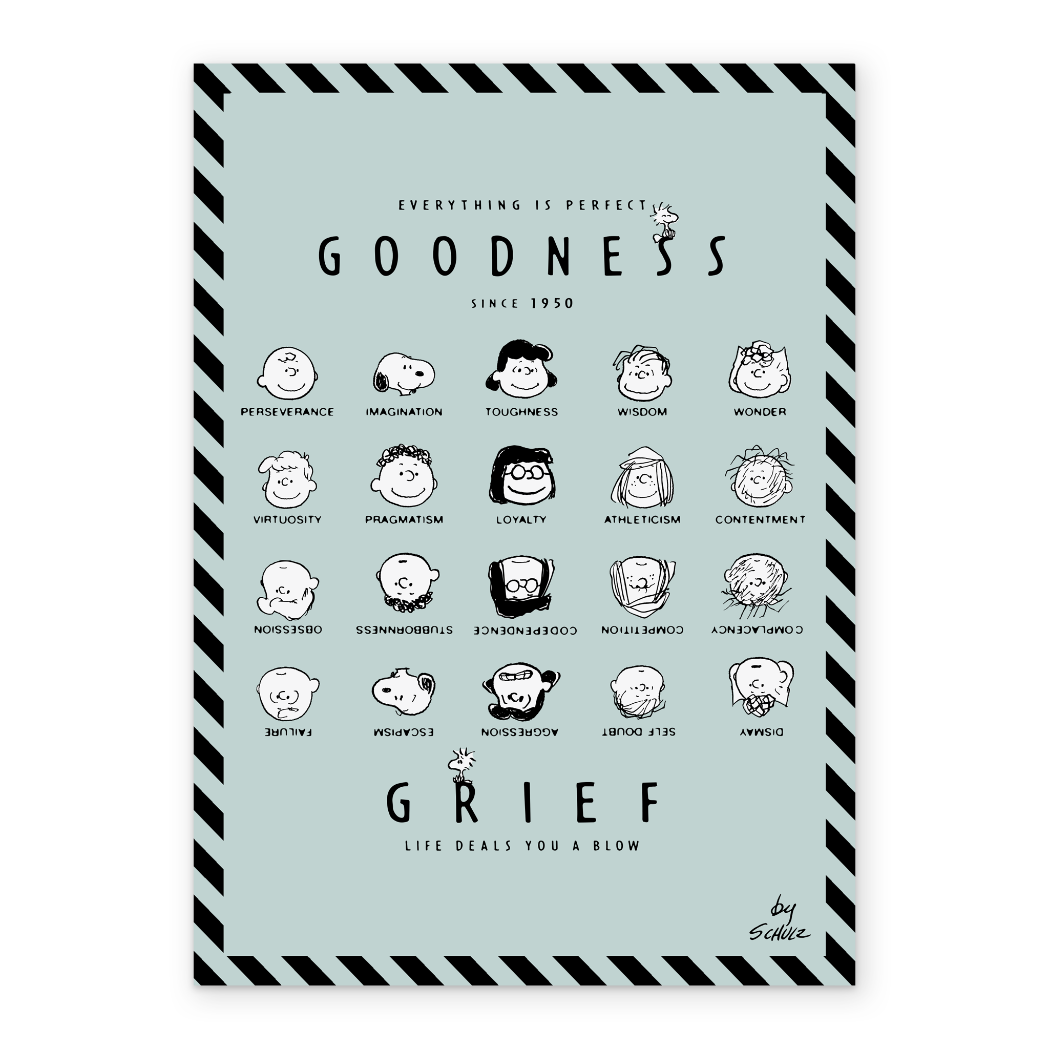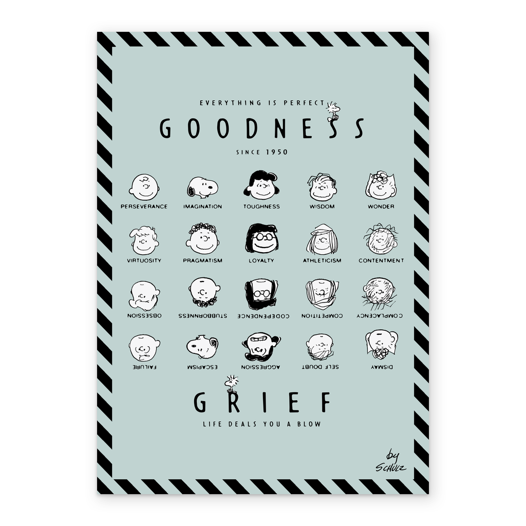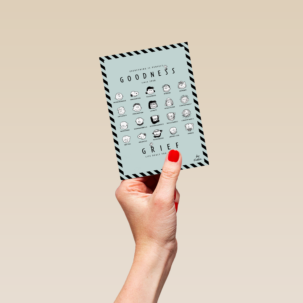 Printed on premium-quality board, this card features black line-drawn illustrations of the main PEANUTS™ characters shown against a pale blue background with a black-striped border, the characters forming four rows within the design, the top two rows shown upright and smiling and the bottom two shown upside down and with more serious expressions, above and below the illustrations is black lettering, with the message 'Everything Is Perfect. Goodness Grief Life Deals You A Blow.', and comes complete with a co-ordinating white envelope.