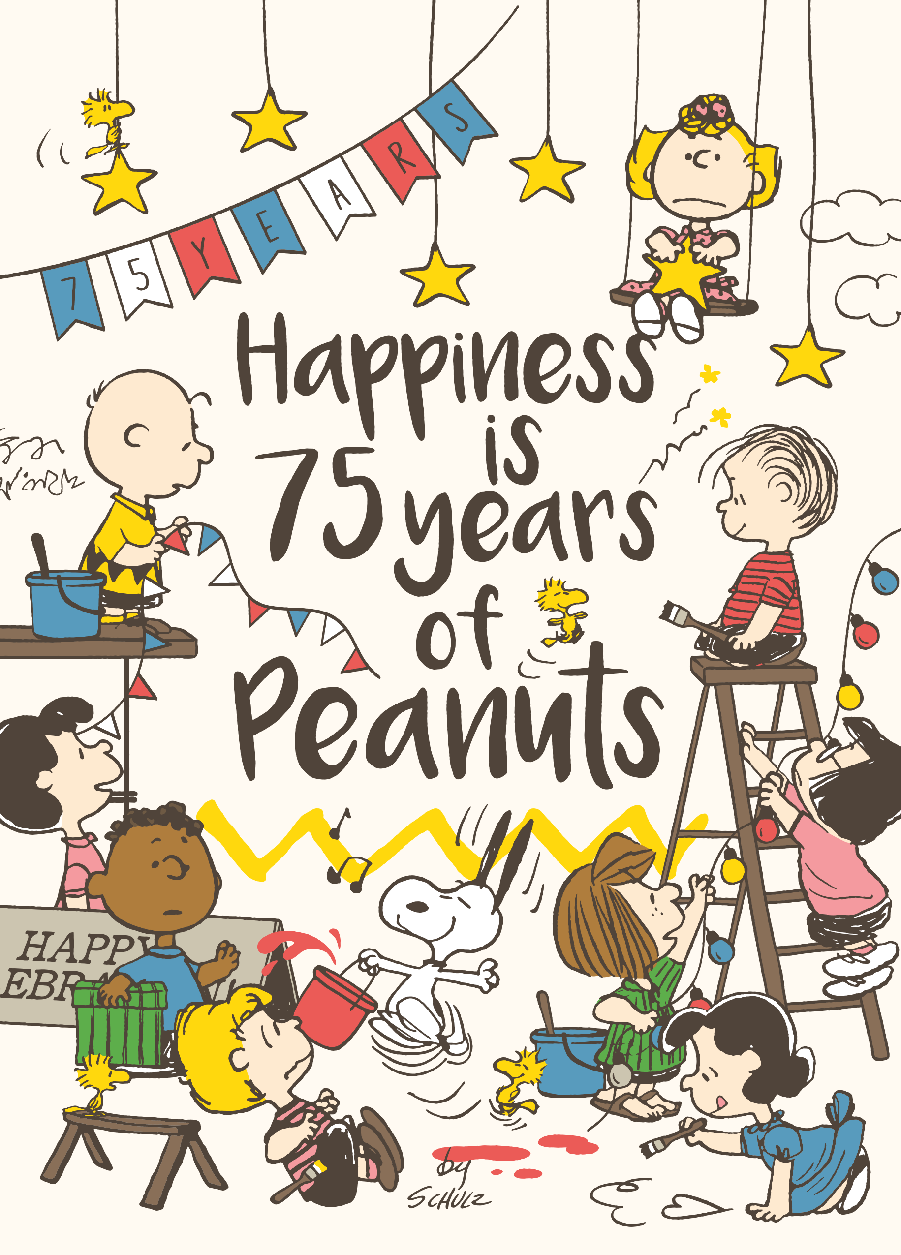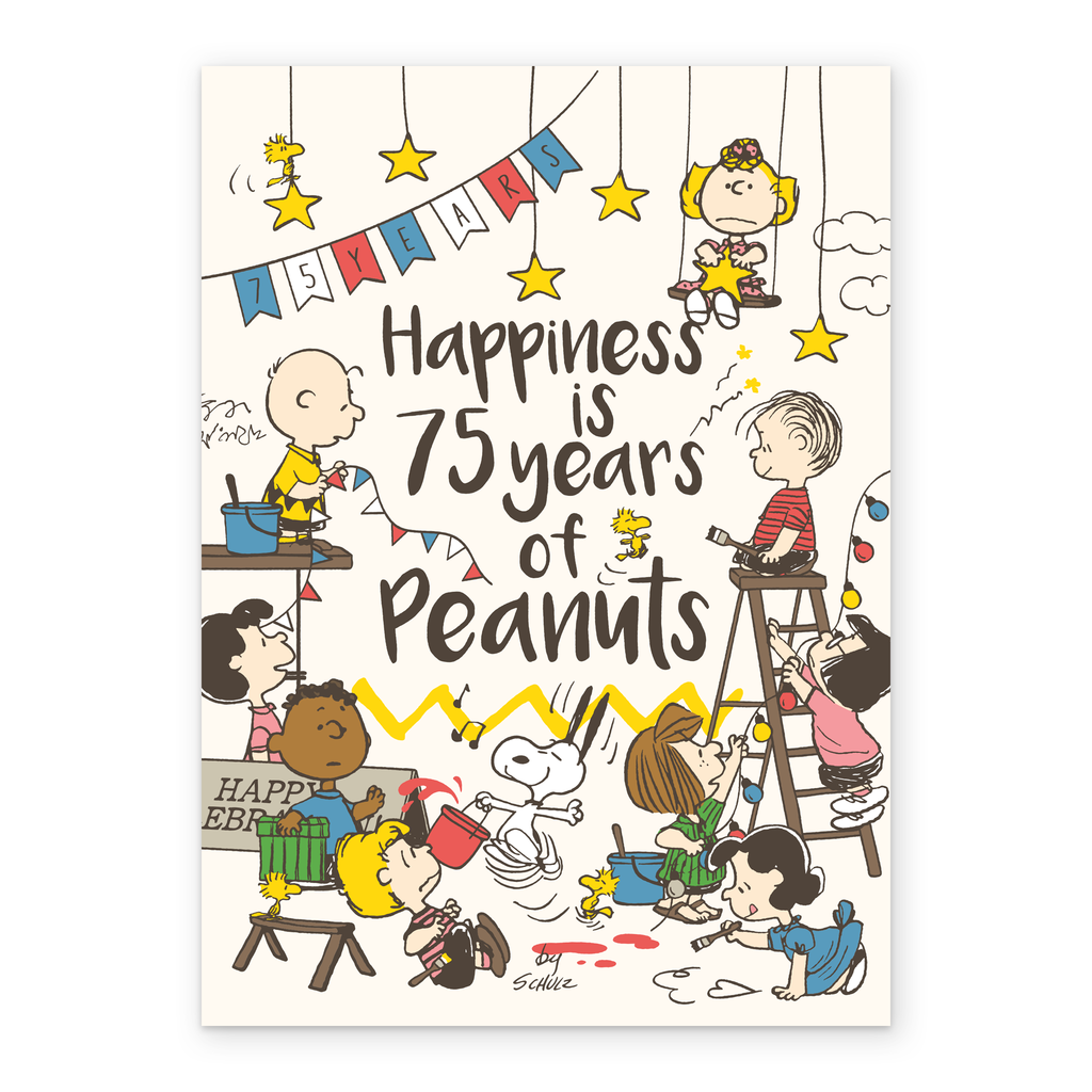 Printed on premium-quality board, this card features a colourful illustration of the PEANUTS™ gang preparing for a party to celebrate their 75th birthday shown against a white background surrounding brown lettering, with the message 'Happiness is 75 years of Peanuts', and comes complete with a co-ordinating white envelope.